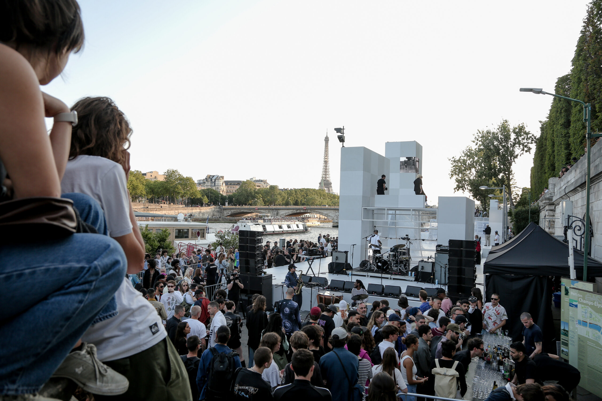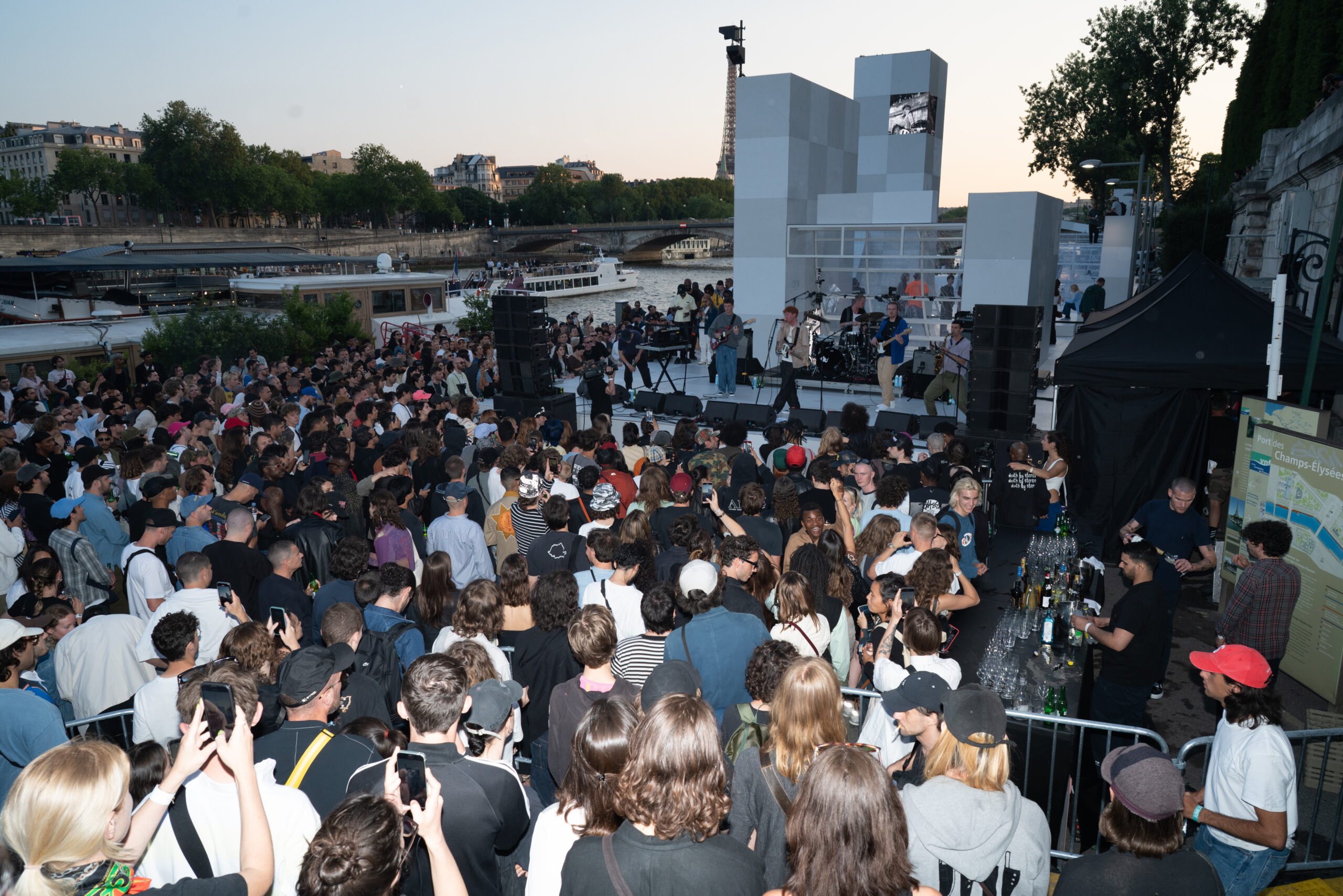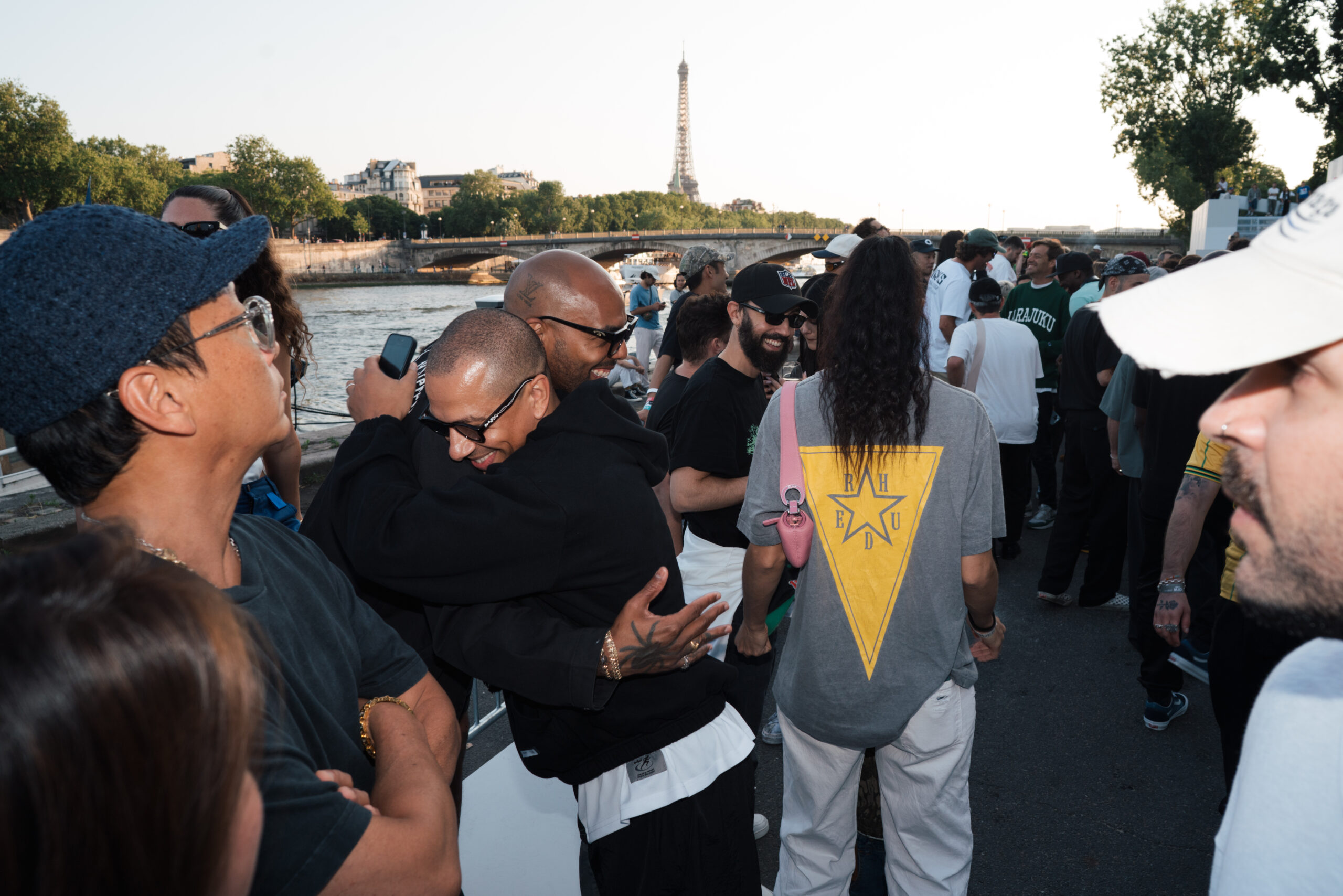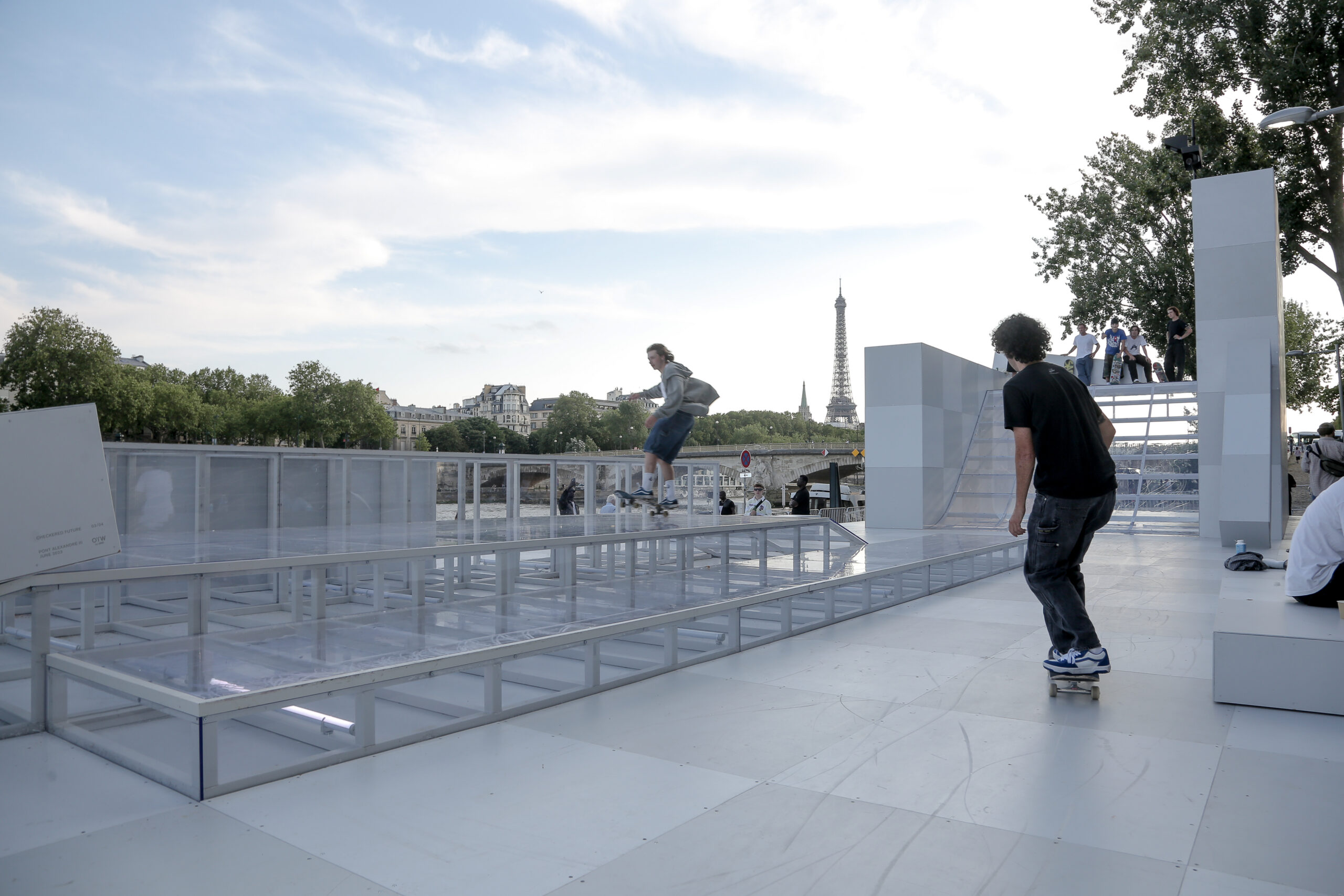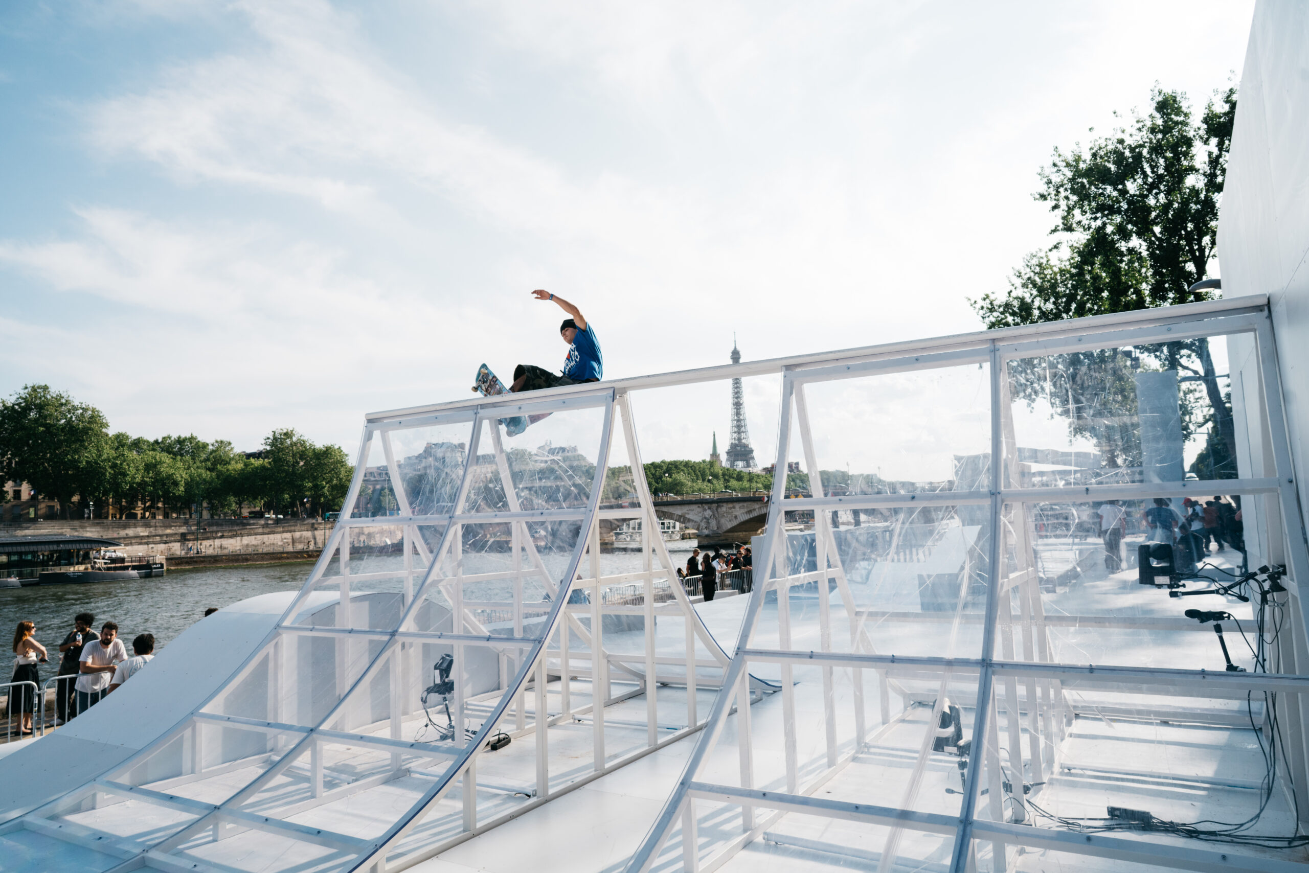 As the sun began to set, the style and skateboarding communities descended upon the banks of the Seine at Pont Alexandre III to witness a monumental skate installation—created in partnership with Unitedfront, PLAYLAB, INC., and California Skateparks—and performance by King Krule.