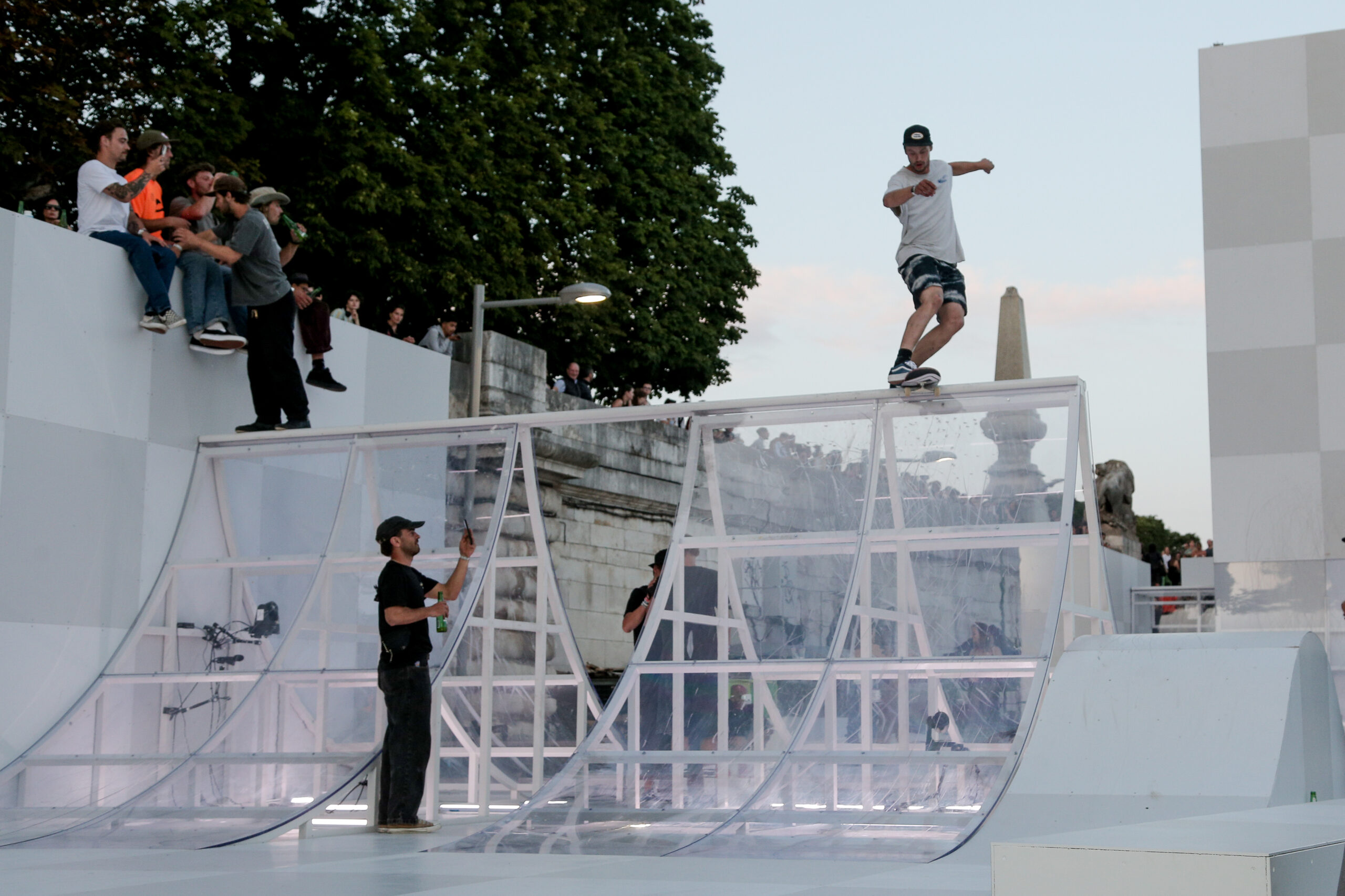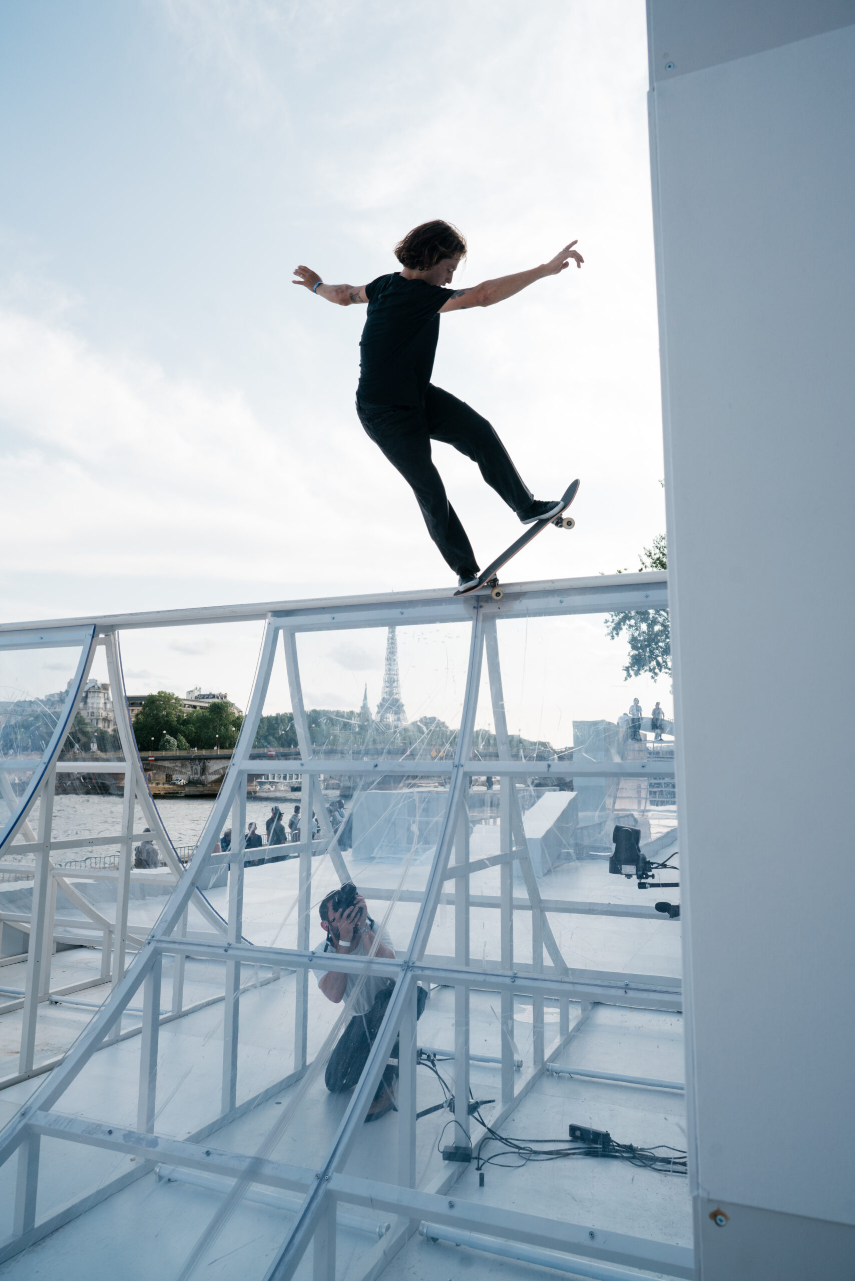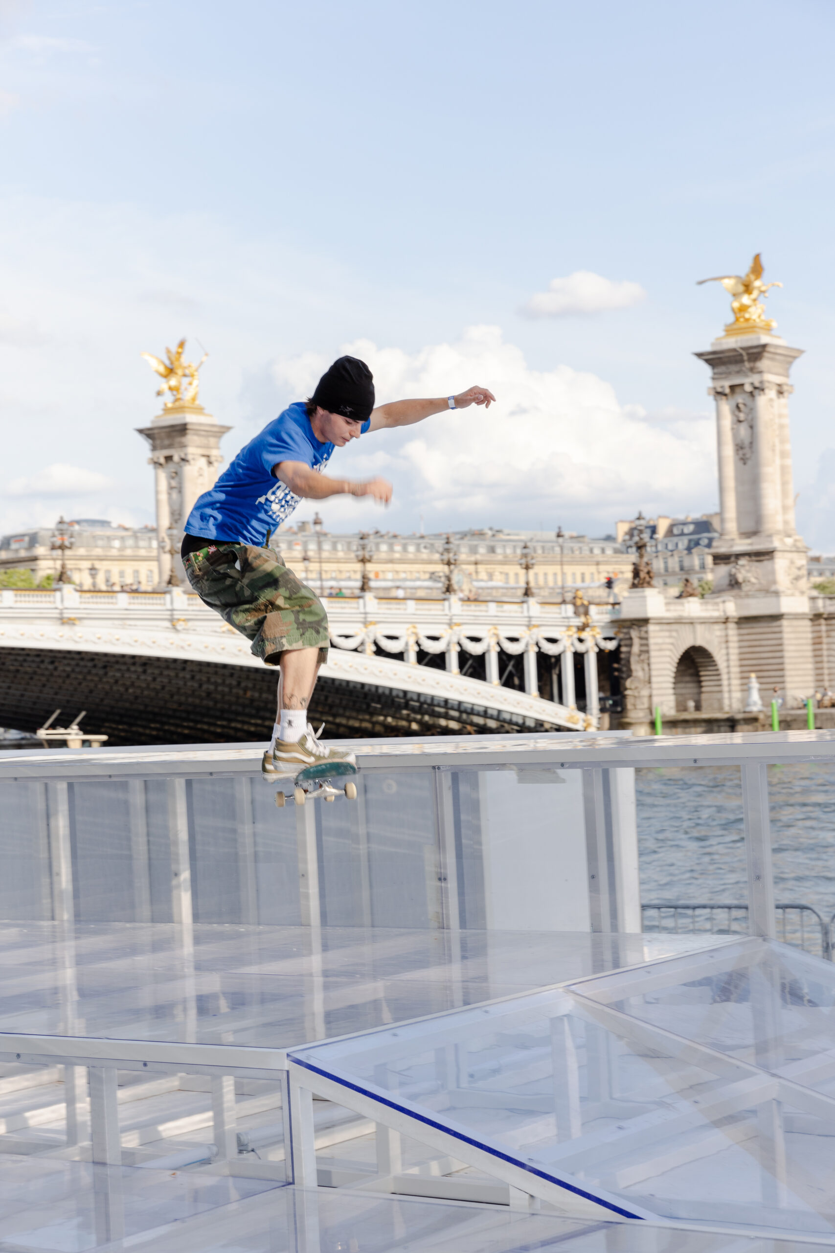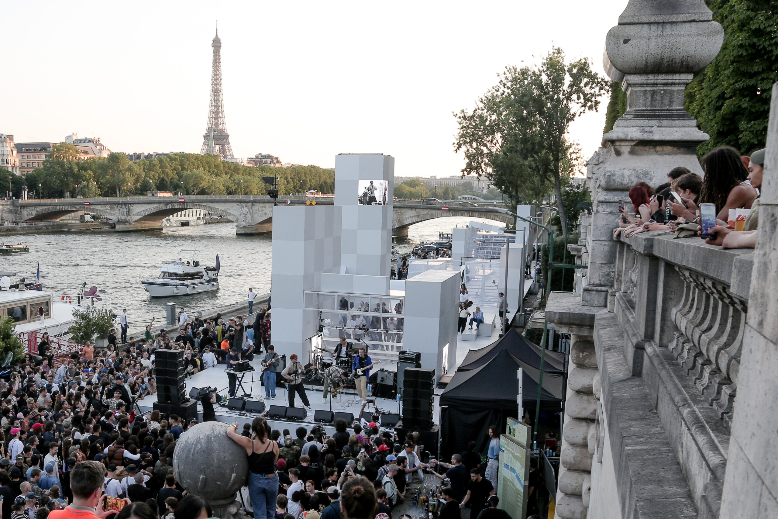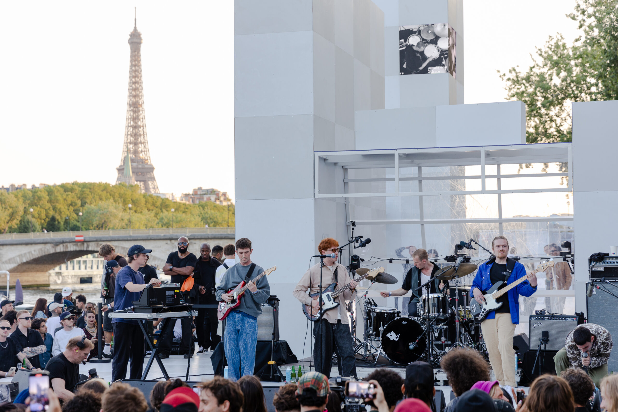 As the sun began to set, the style and skateboarding communities descended upon the banks of the Seine at Pont Alexandre III to witness a monumental skate installation—created in partnership with Unitedfront, PLAYLAB, INC., and California Skateparks—and performance by King Krule.