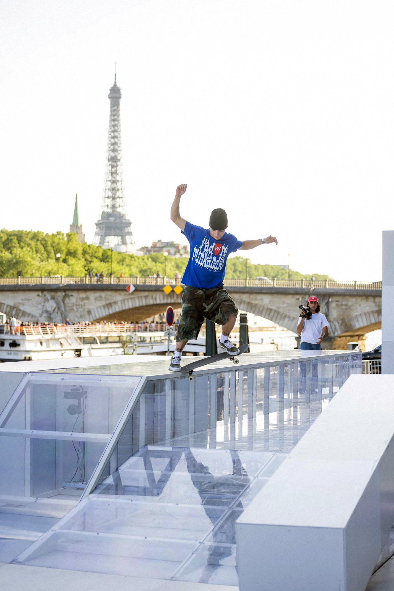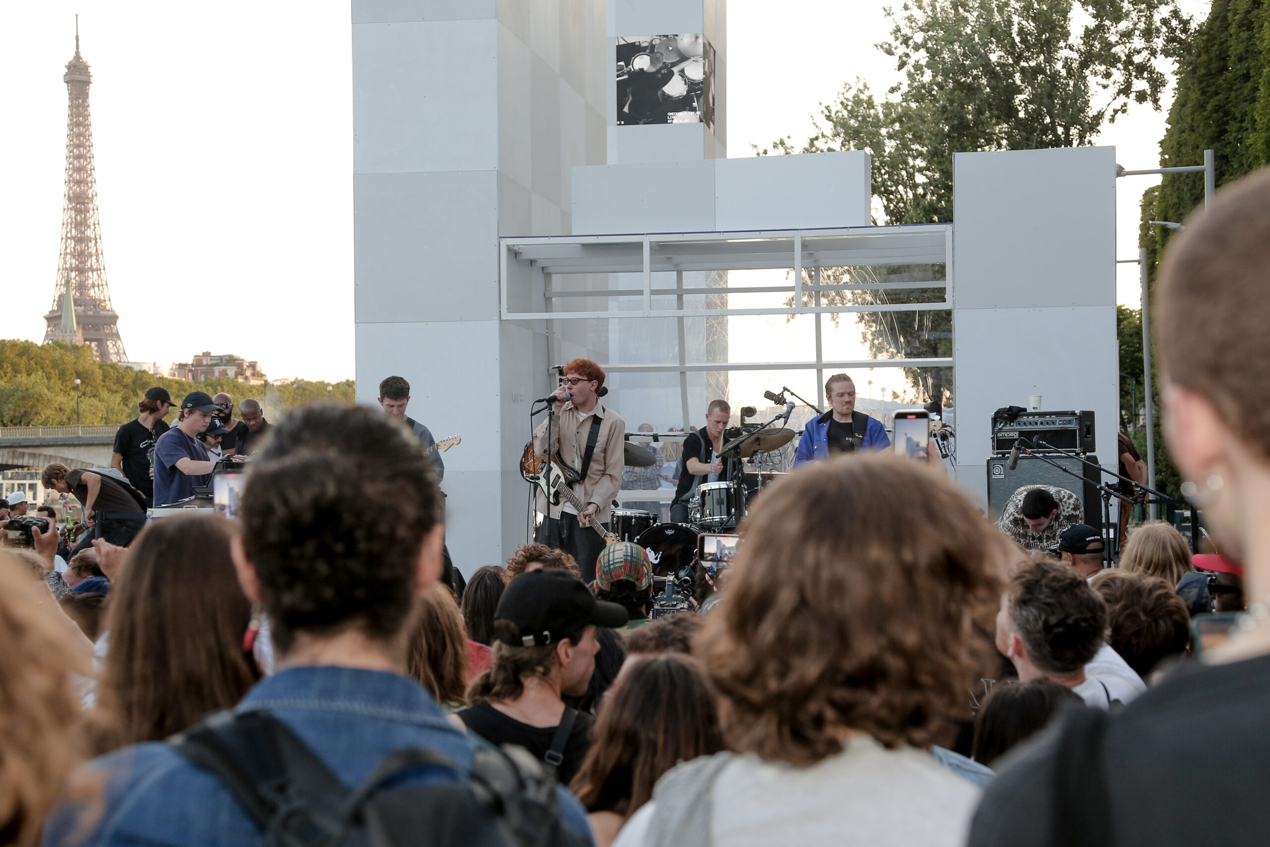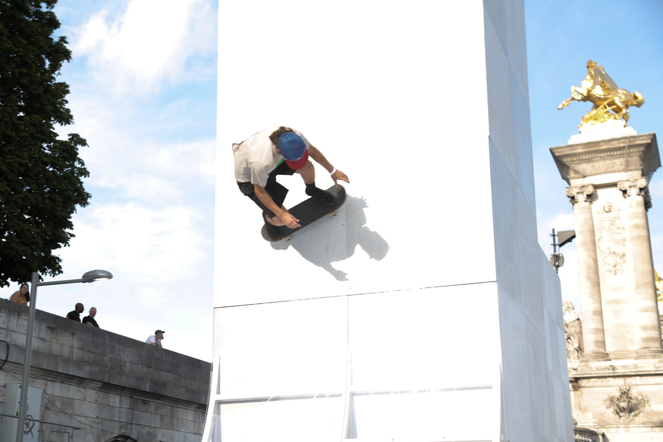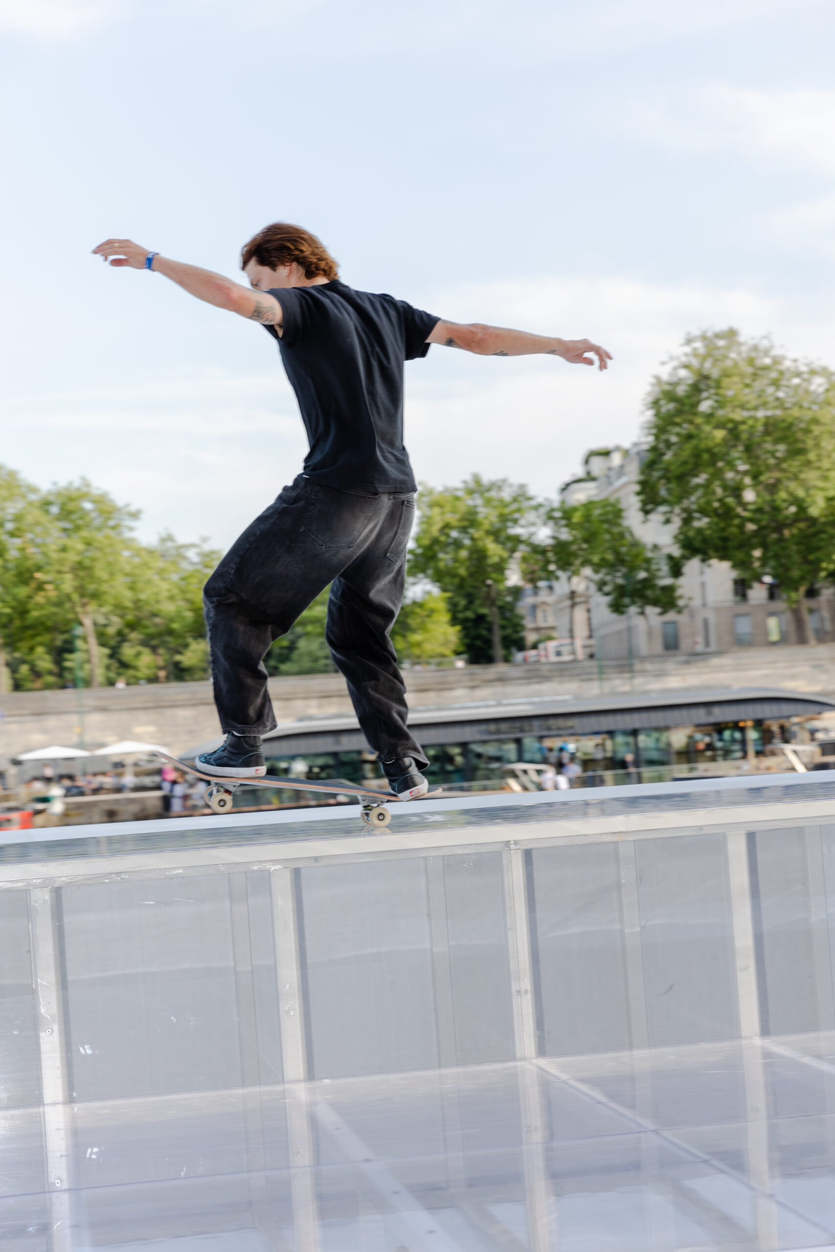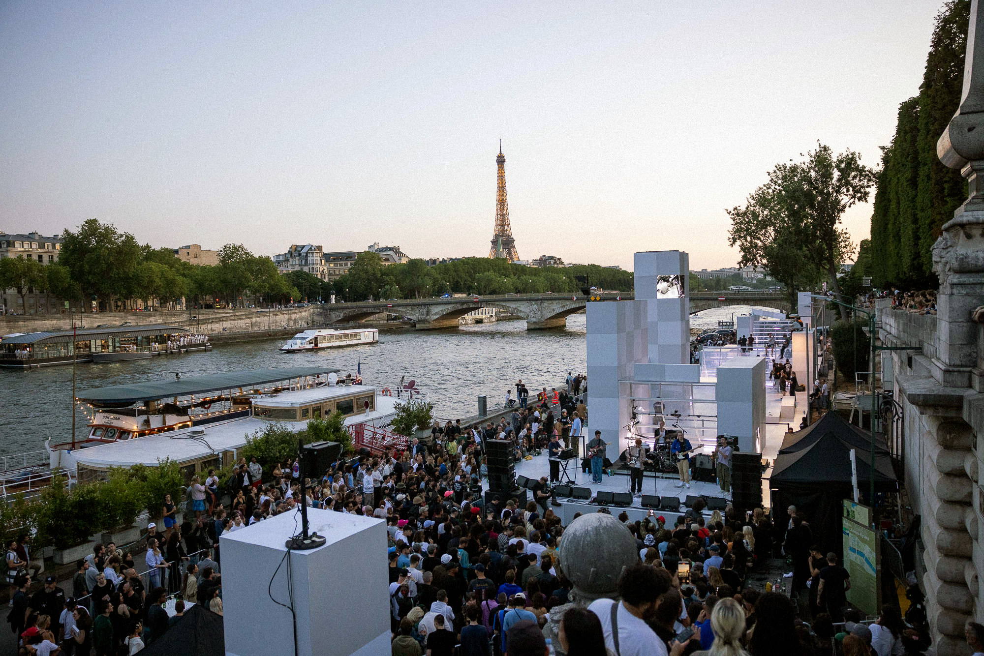 As the sun began to set, the style and skateboarding communities descended upon the banks of the Seine at Pont Alexandre III to witness a monumental skate installation—created in partnership with Unitedfront, PLAYLAB, INC., and California Skateparks—and performance by King Krule.