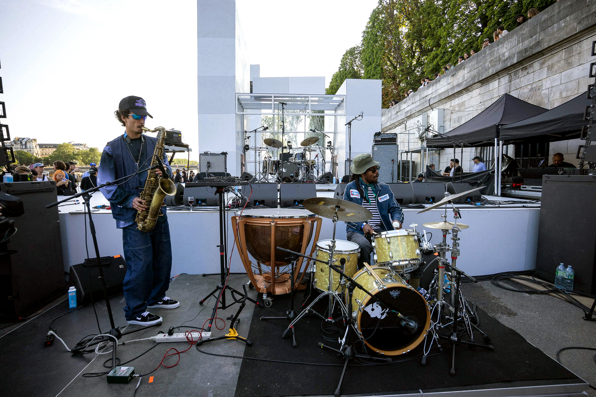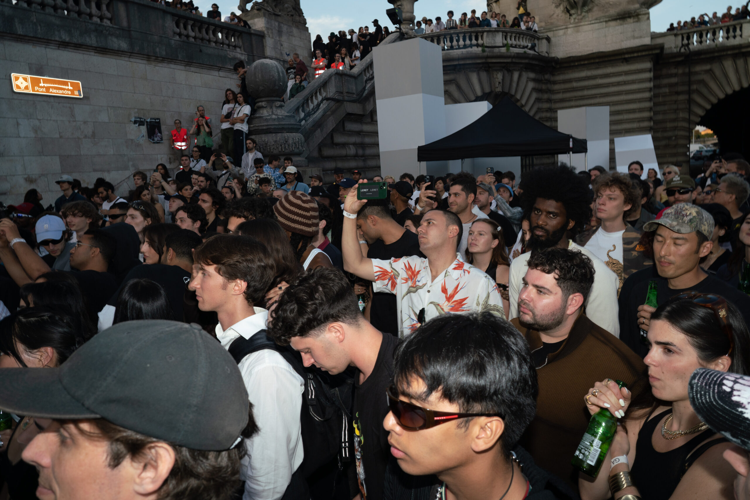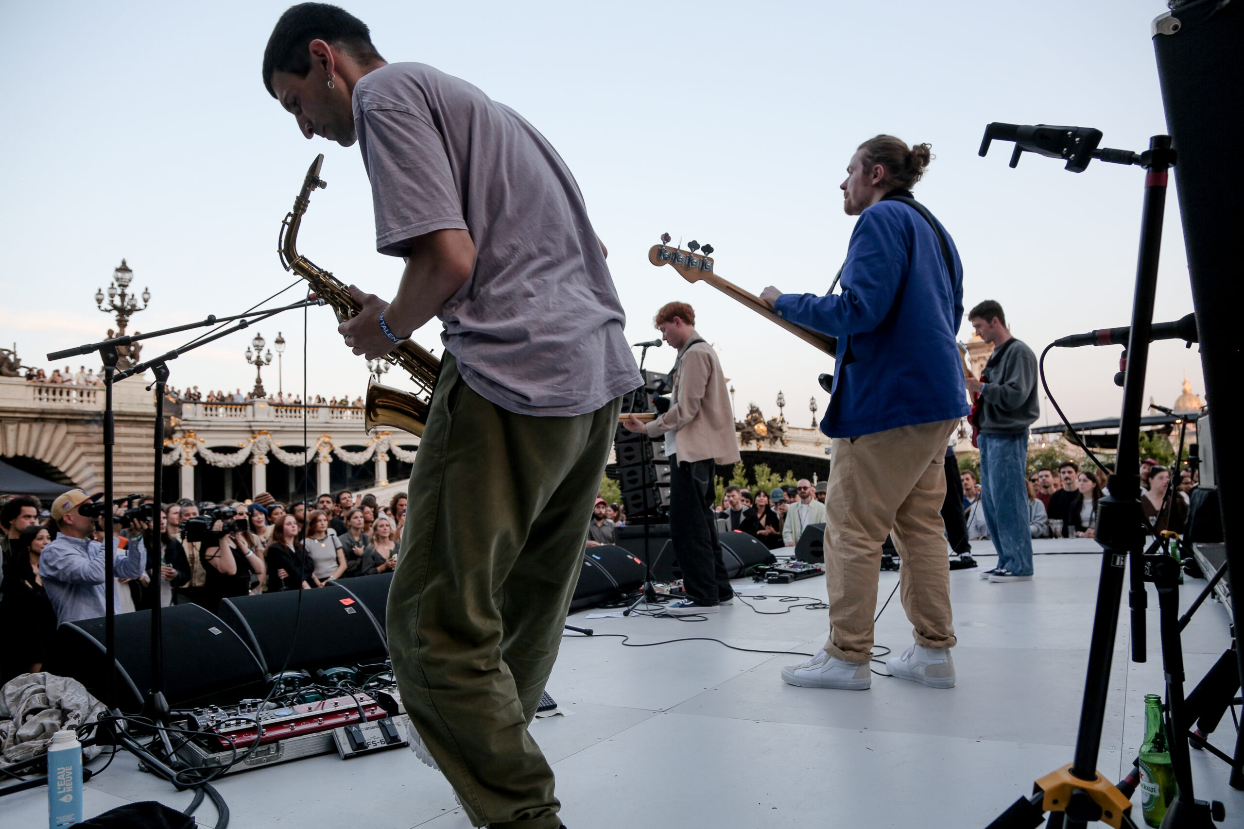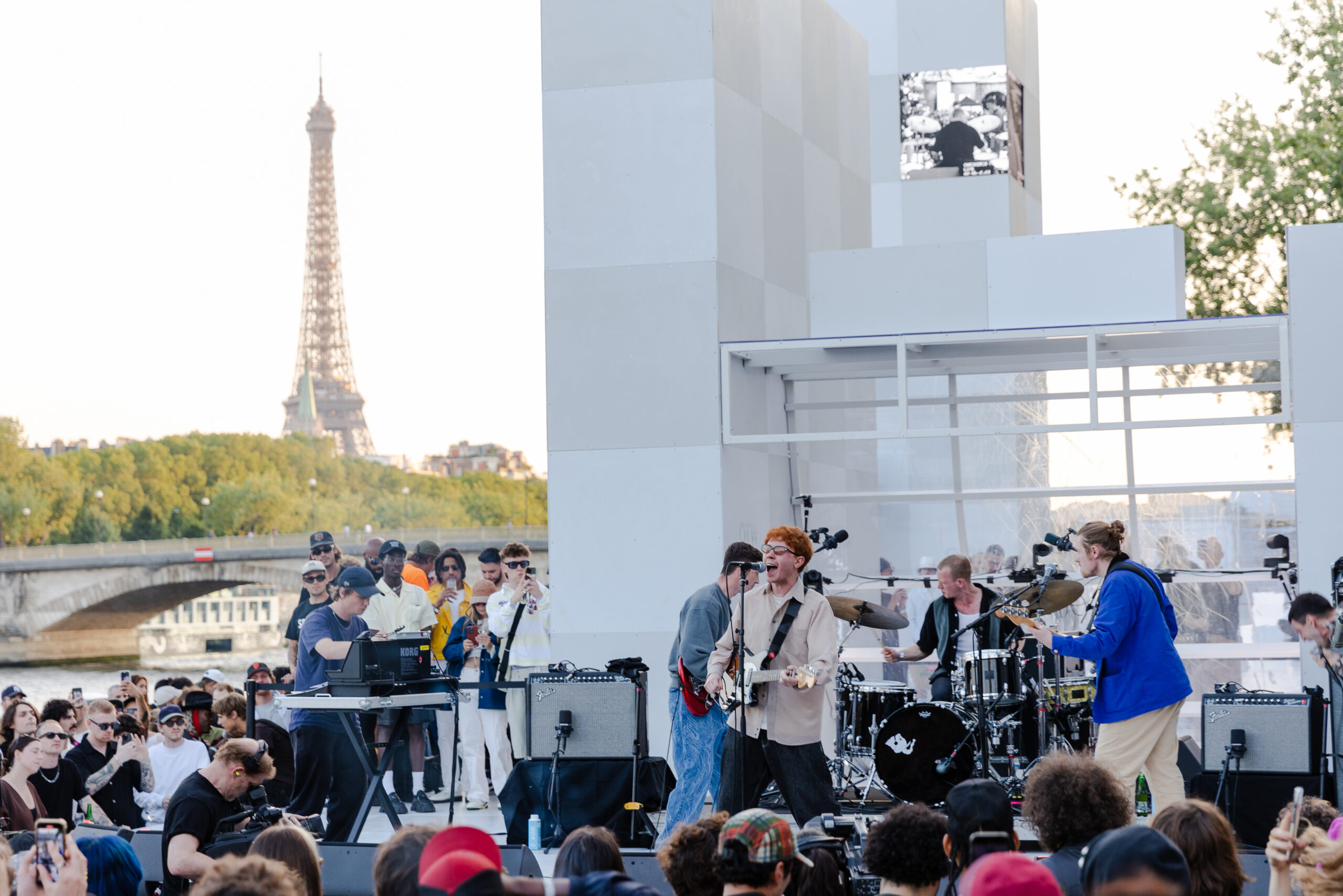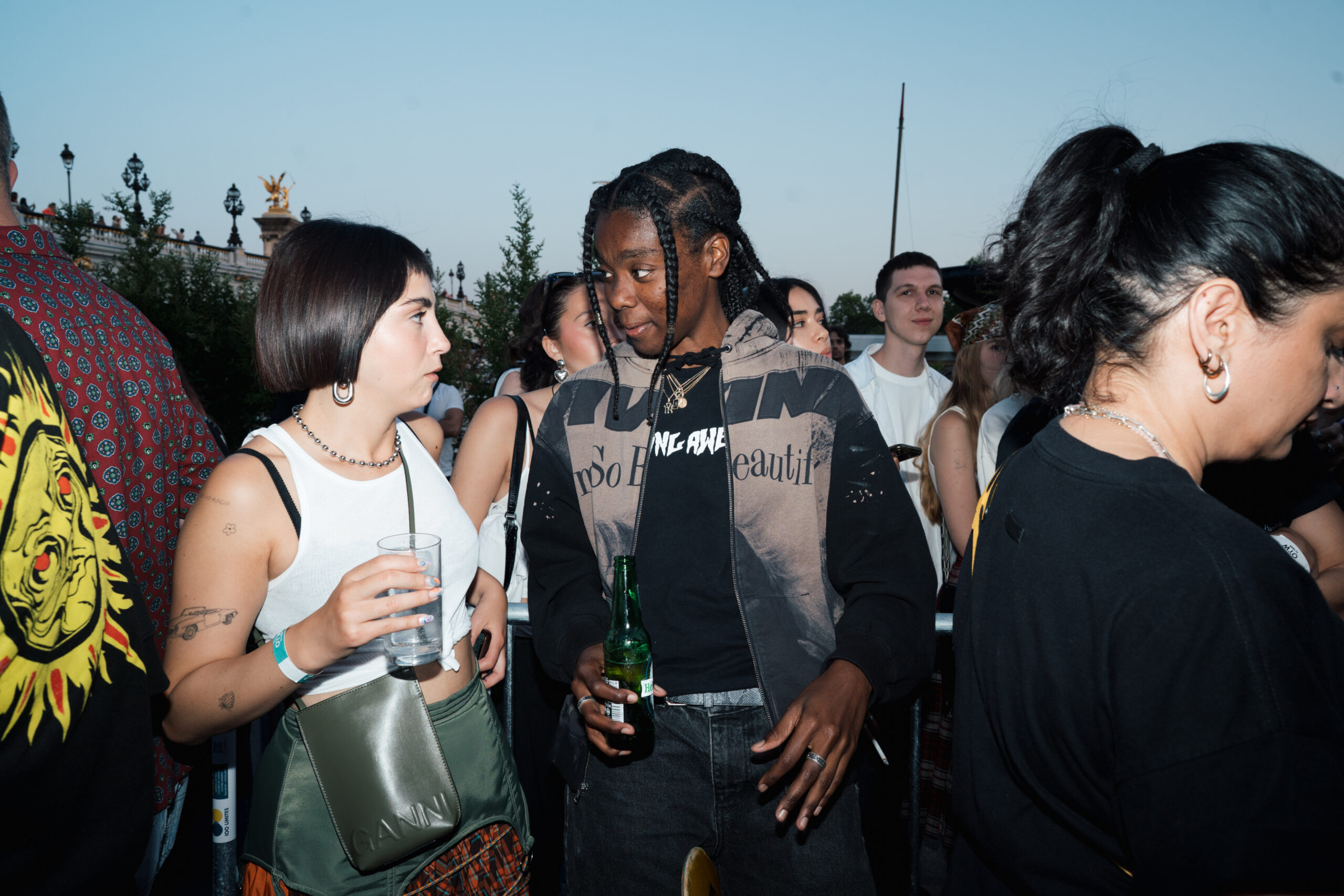 As the sun began to set, the style and skateboarding communities descended upon the banks of the Seine at Pont Alexandre III to witness a monumental skate installation—created in partnership with Unitedfront, PLAYLAB, INC., and California Skateparks—and performance by King Krule.