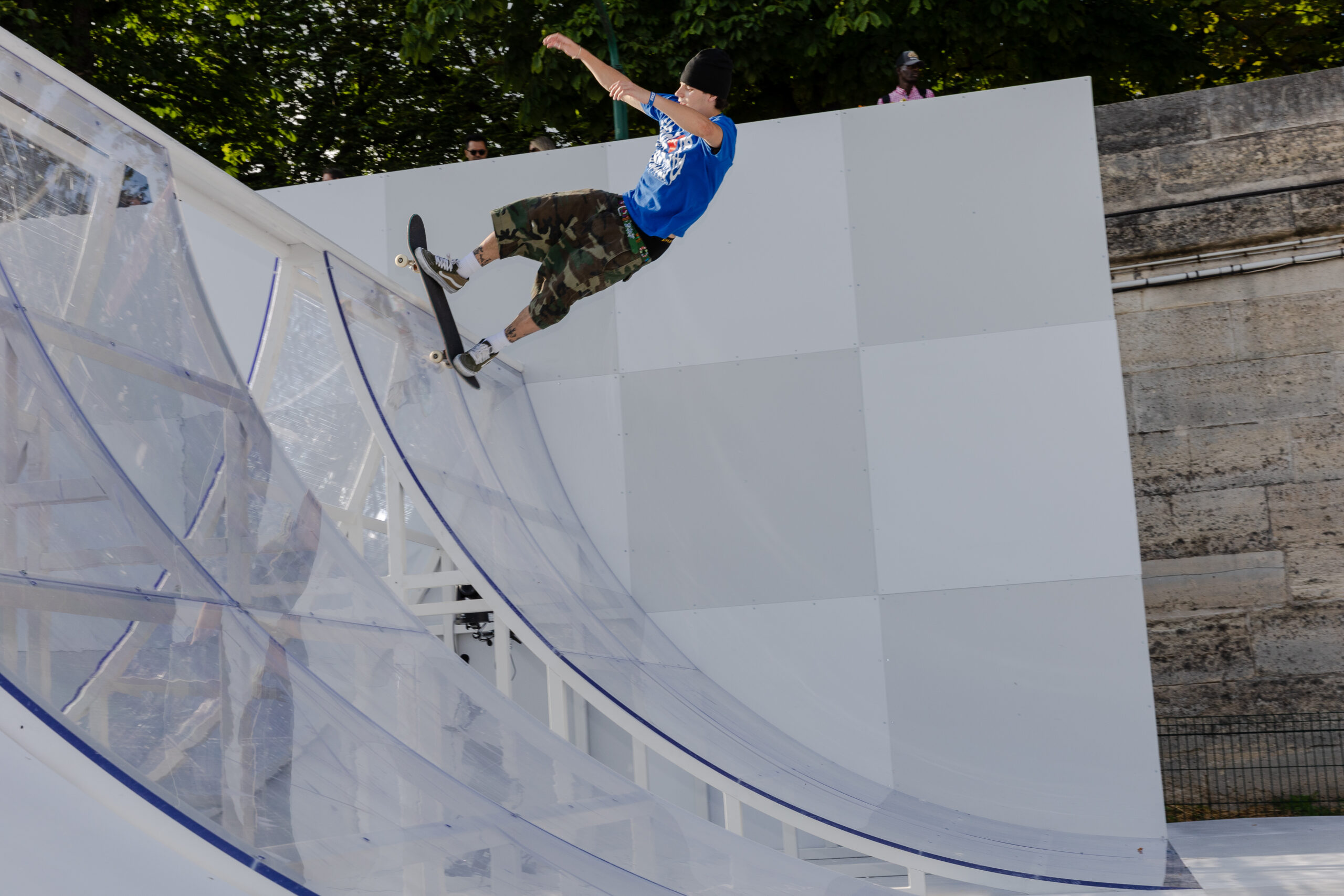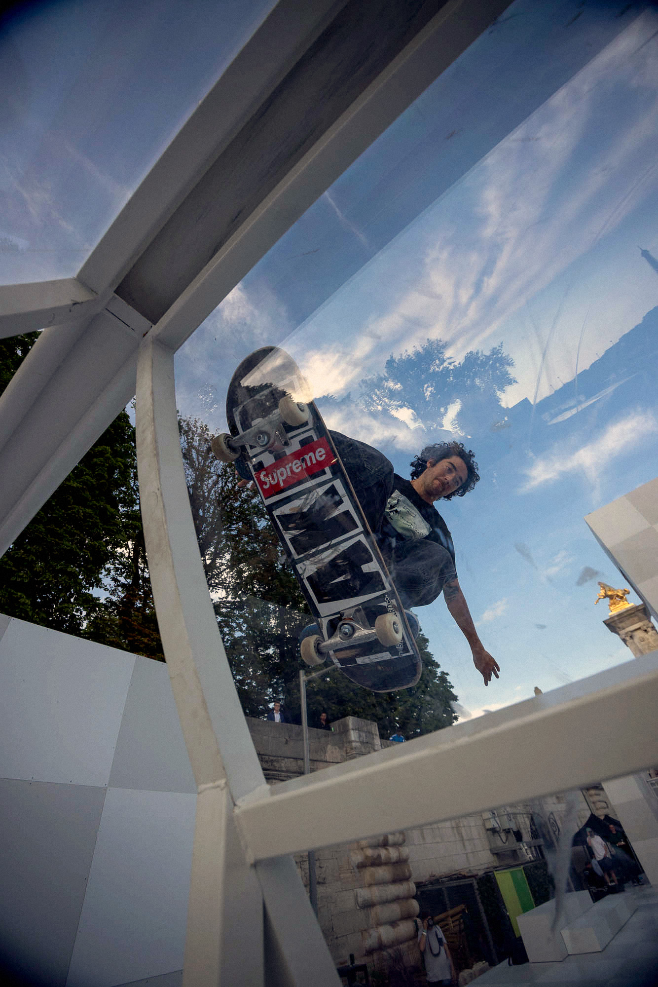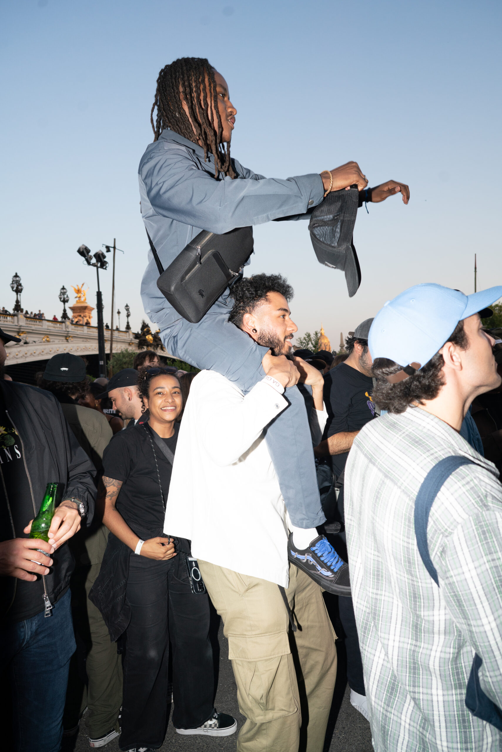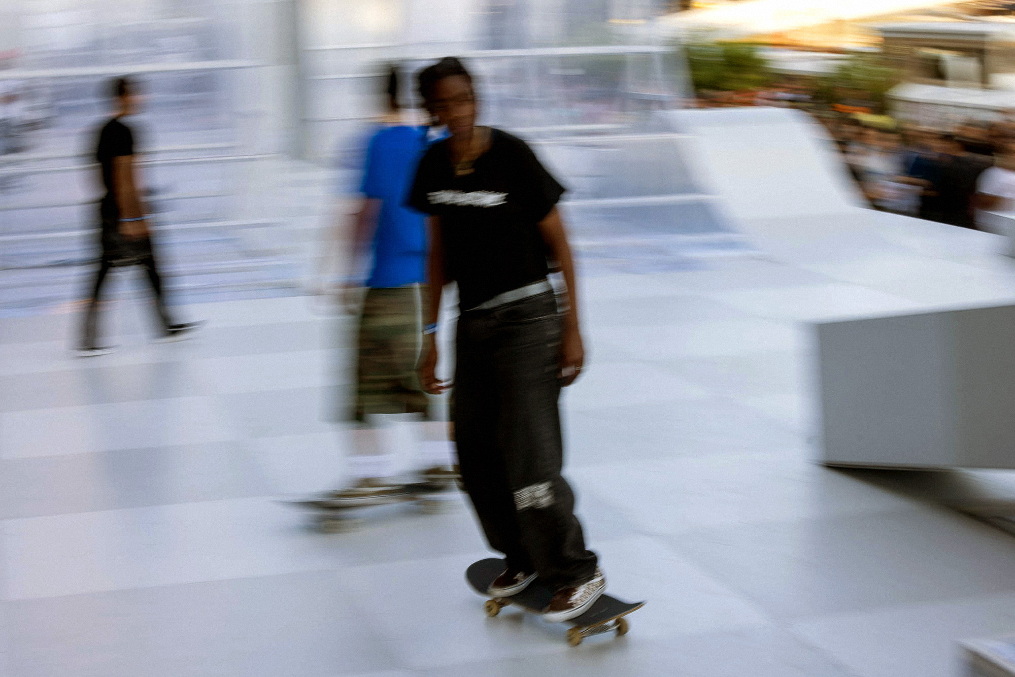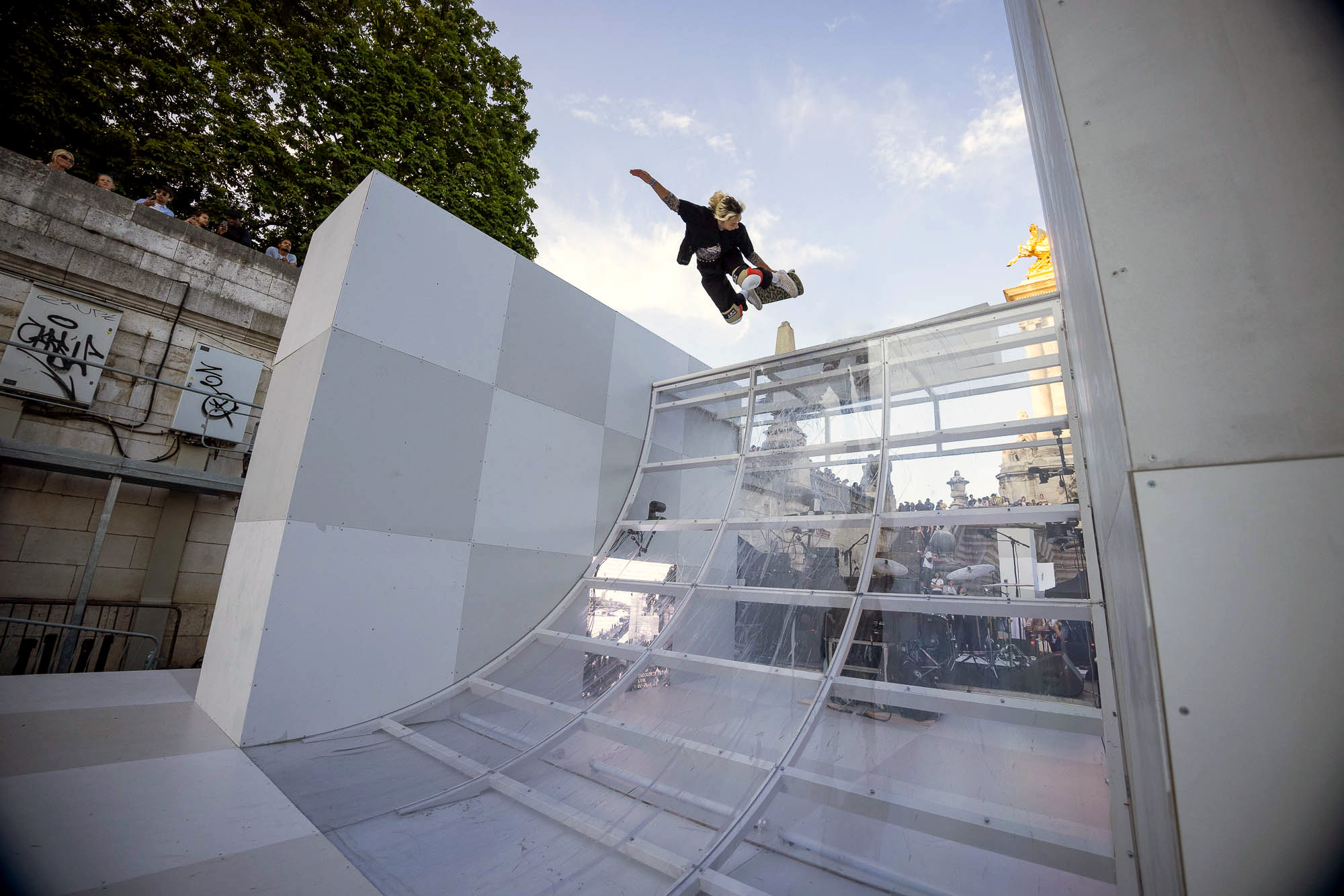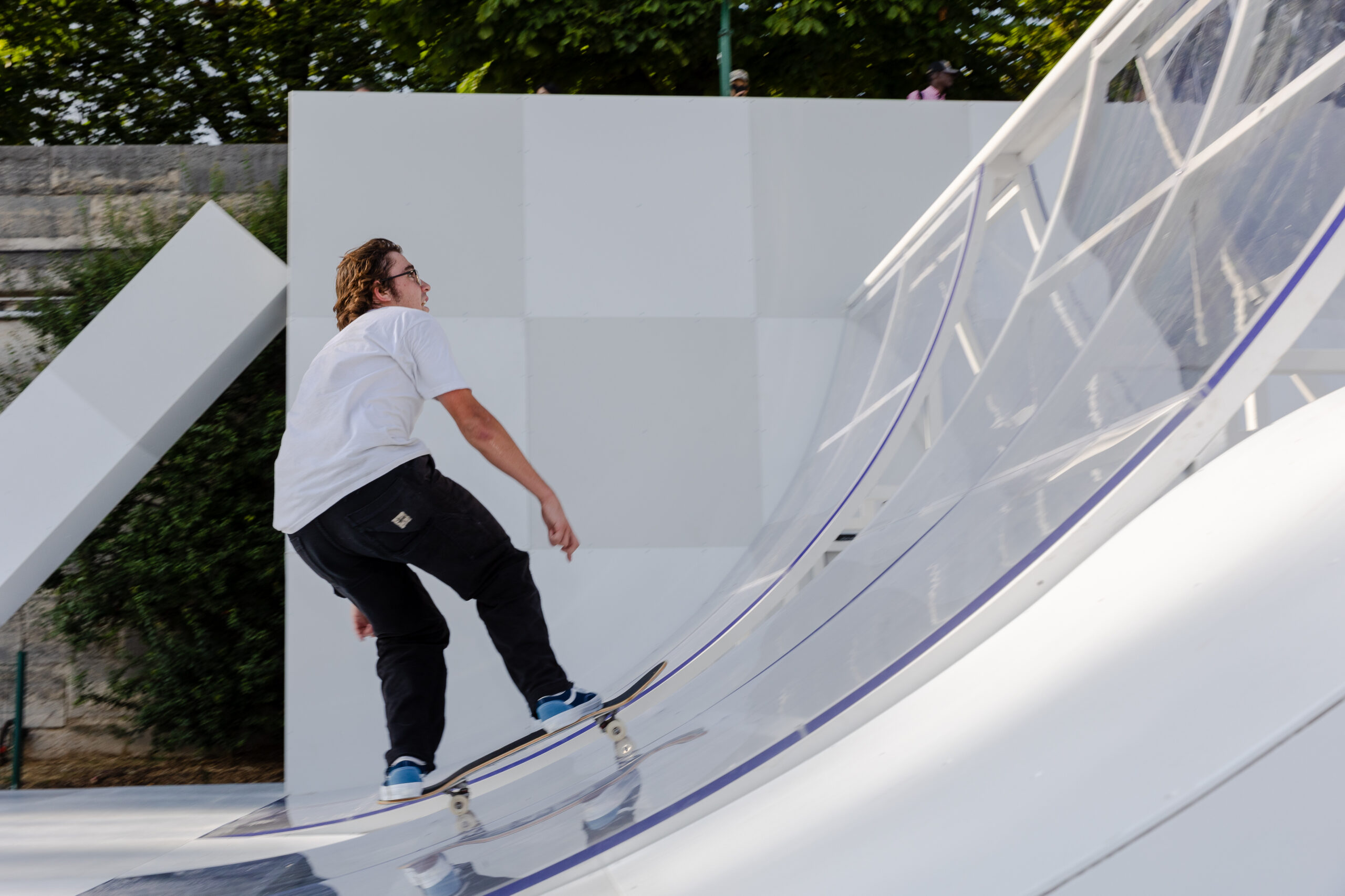 As the sun began to set, the style and skateboarding communities descended upon the banks of the Seine at Pont Alexandre III to witness a monumental skate installation—created in partnership with Unitedfront, PLAYLAB, INC., and California Skateparks—and performance by King Krule.