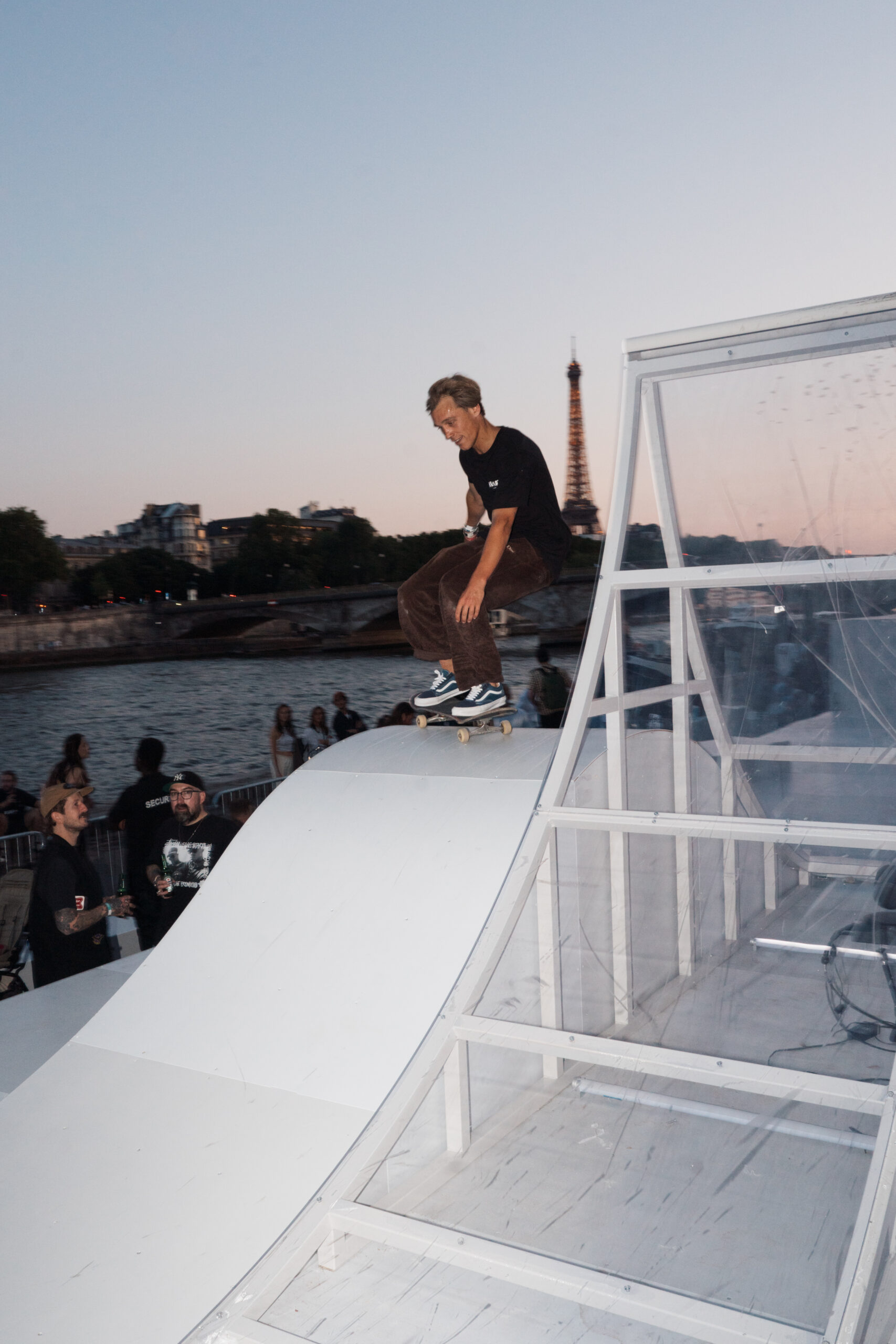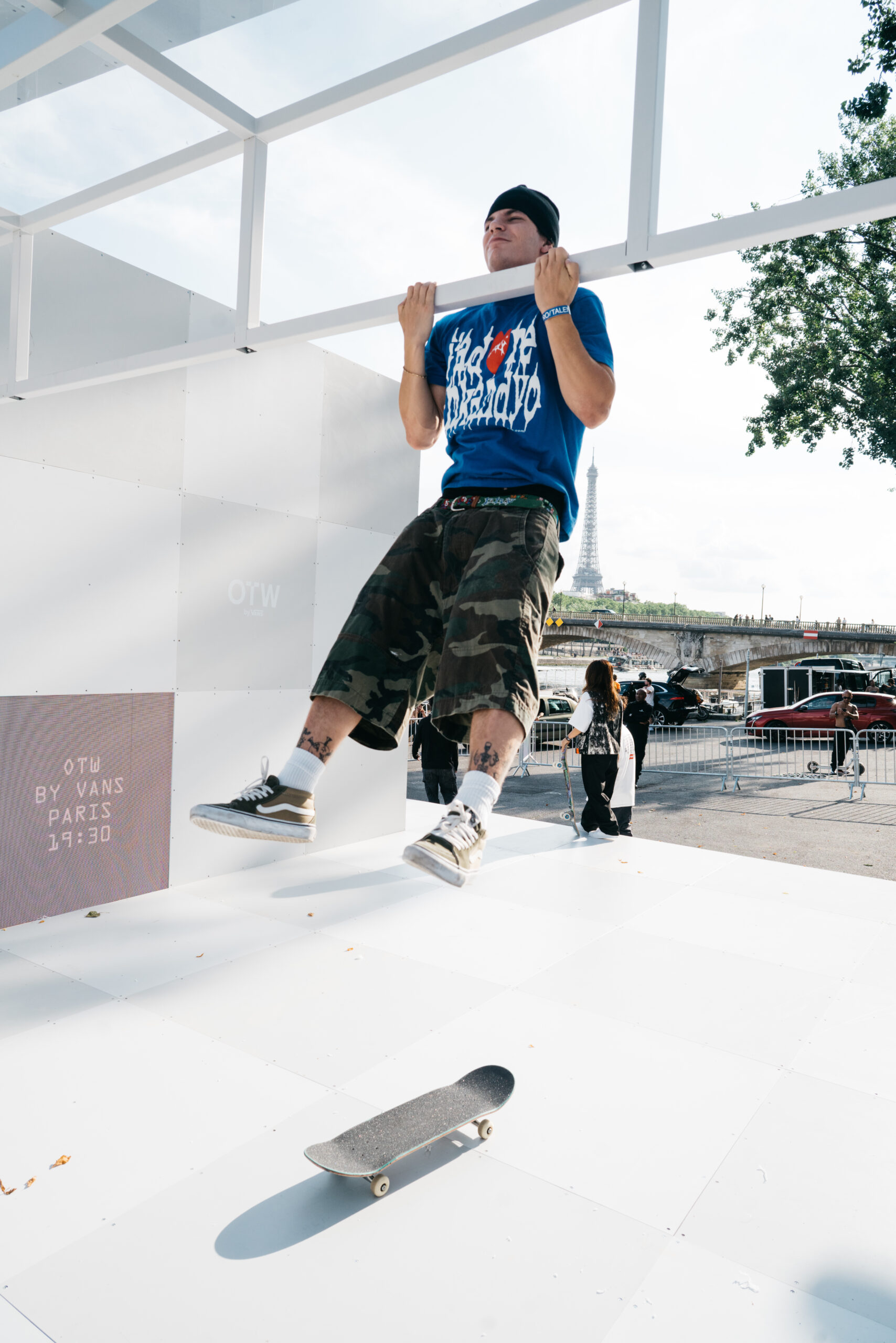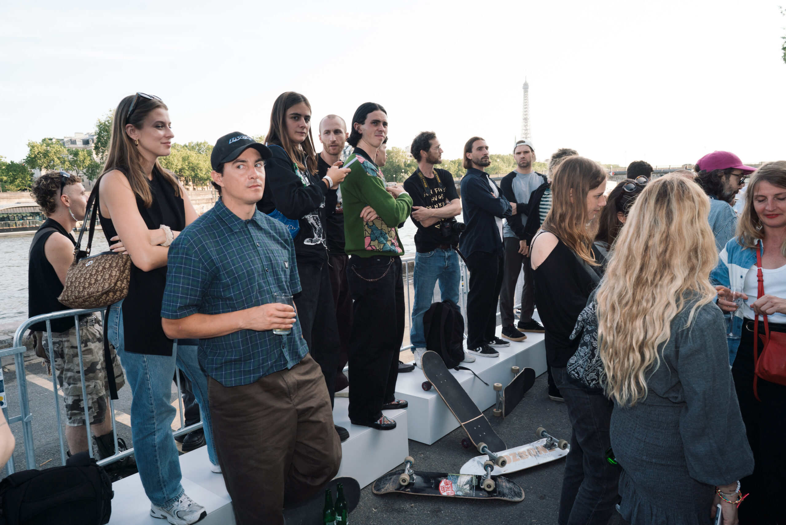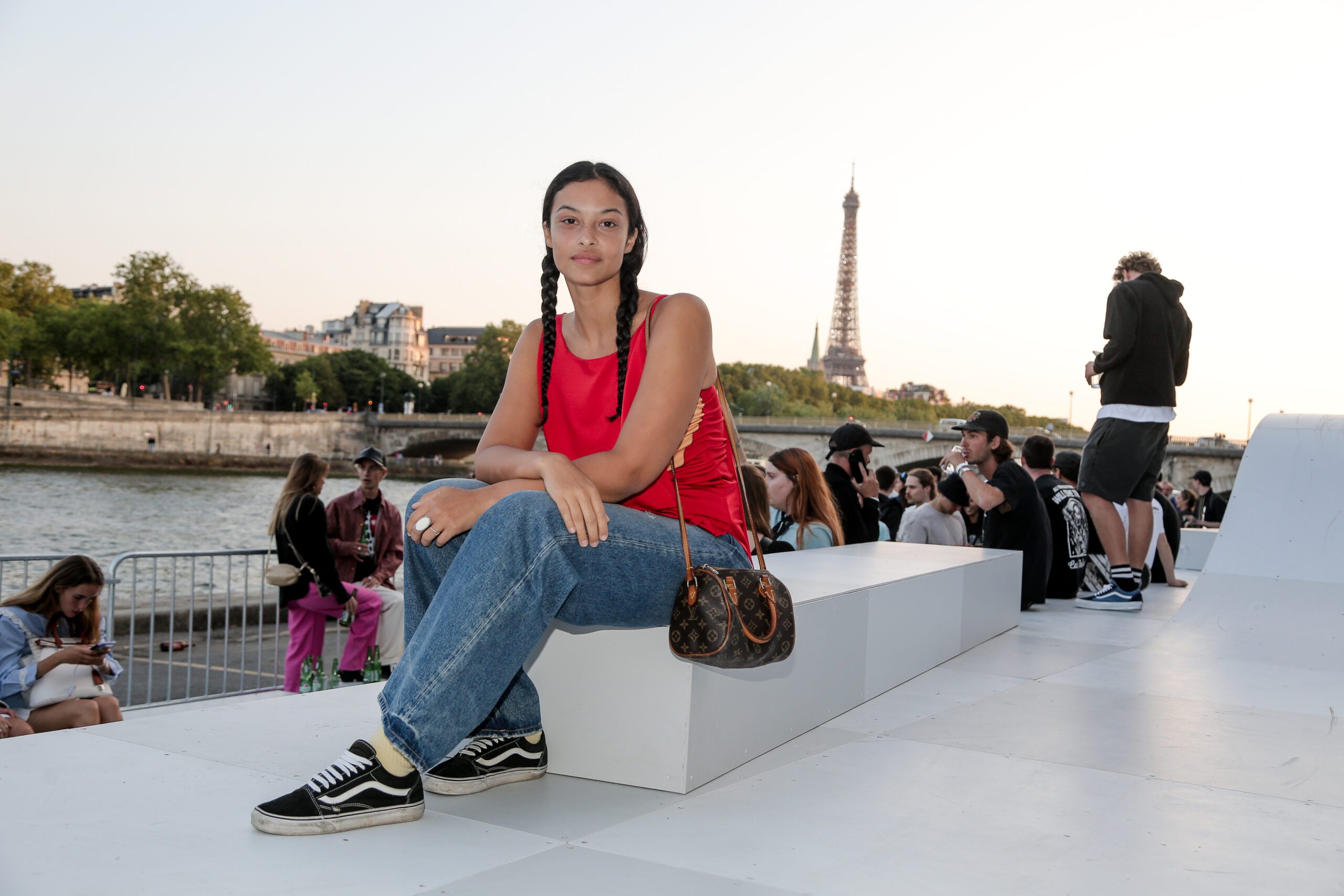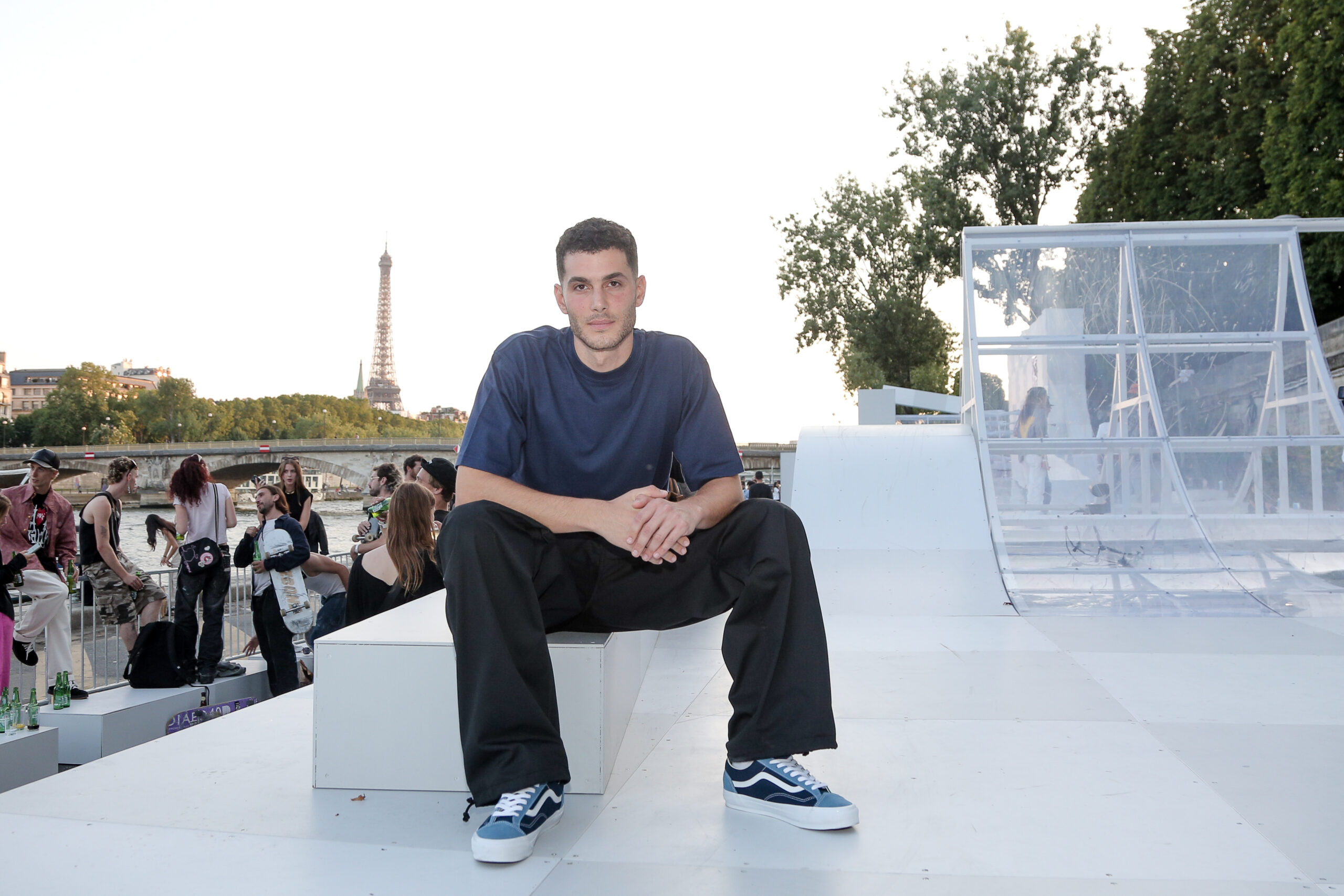 Attendees watched the Vans Skateboarding Team, including Beatrice Domond, Étienne Gagné, Rowan Zorilla, Lizzie Armanto, Mami Tezuka, Zion Wright, Diego Todd, and Axel Cruysberghs skate the OTW by Vans skate installation, set to the backdrop of the Eiffel Tower and music by Onyx Collective. Later in the evening, King Krule took to the stage and closed out the night, while Parisian passersby gathered on the bridge.
