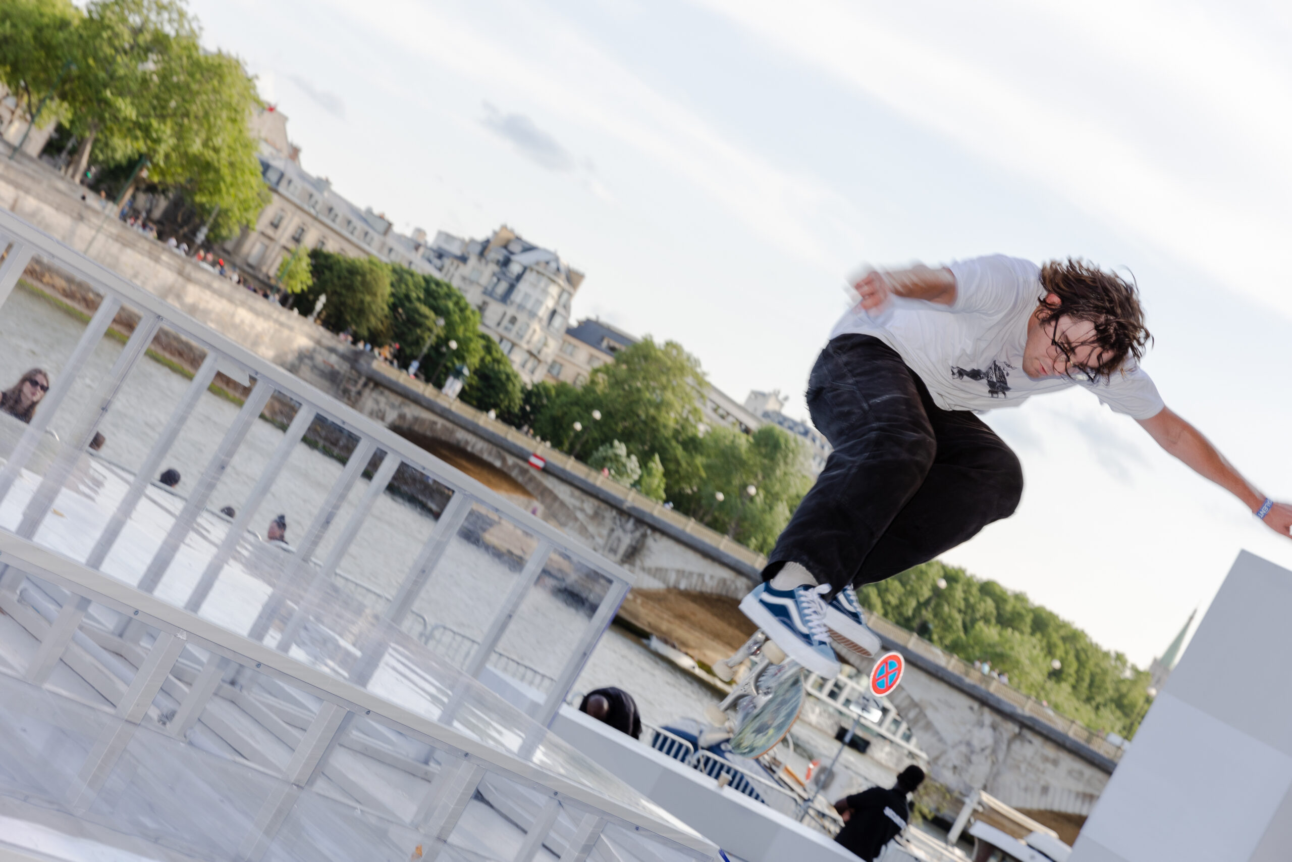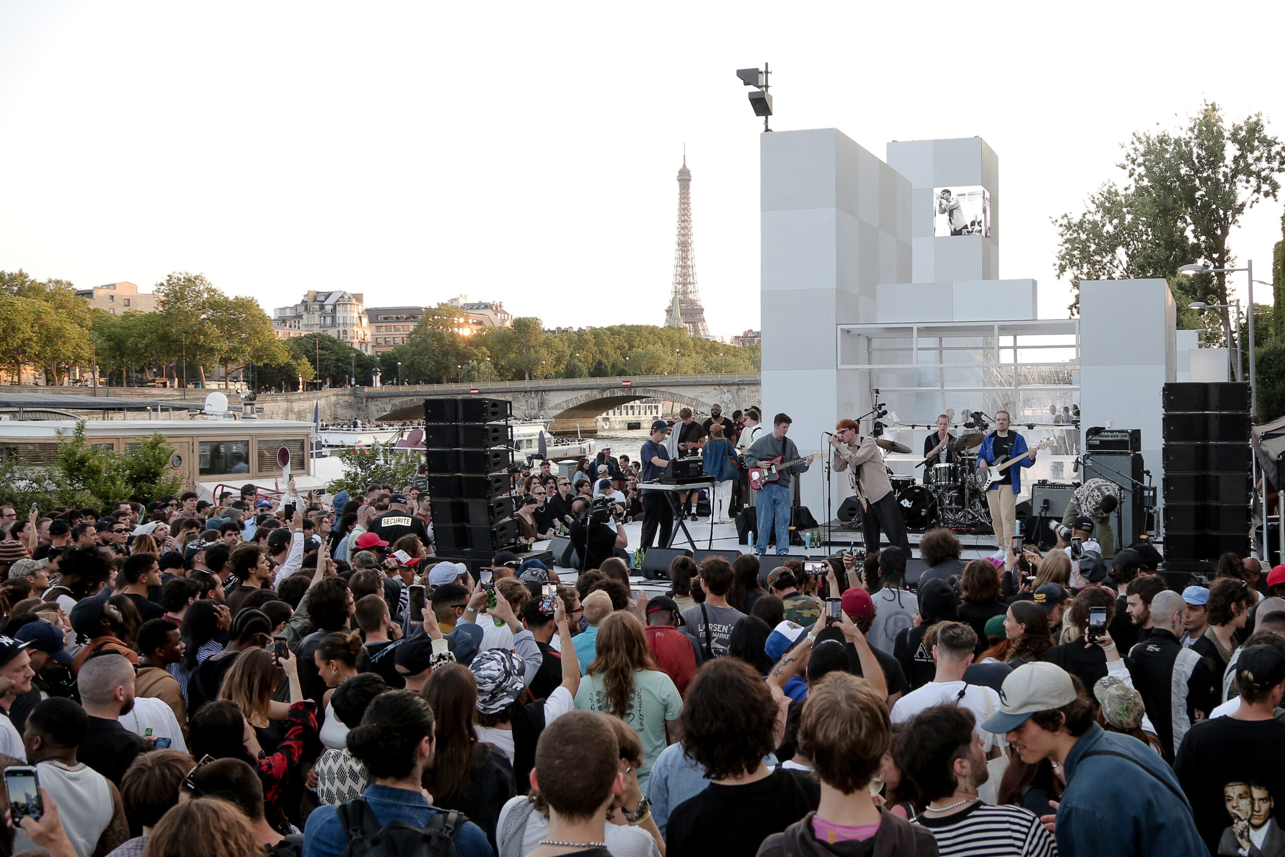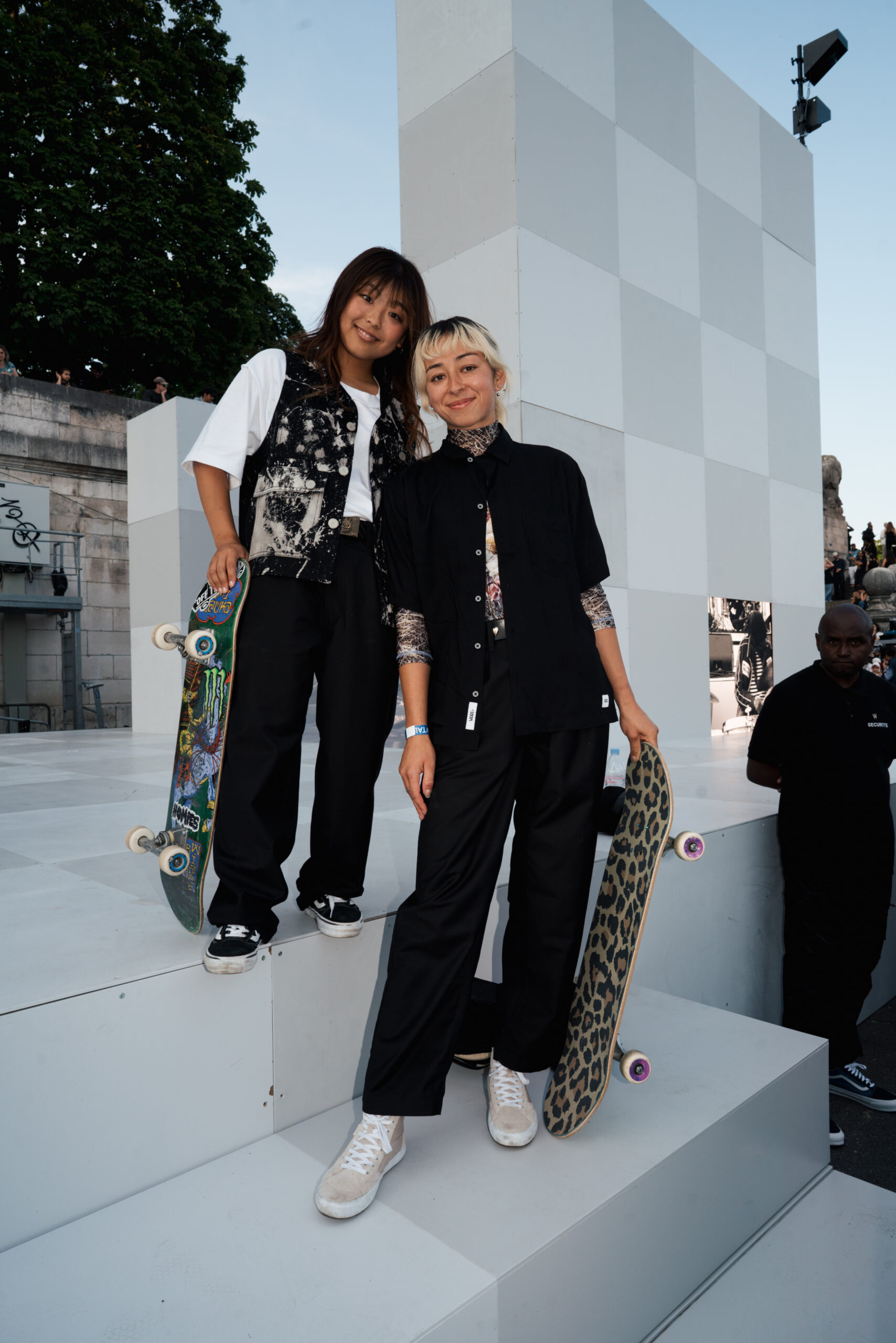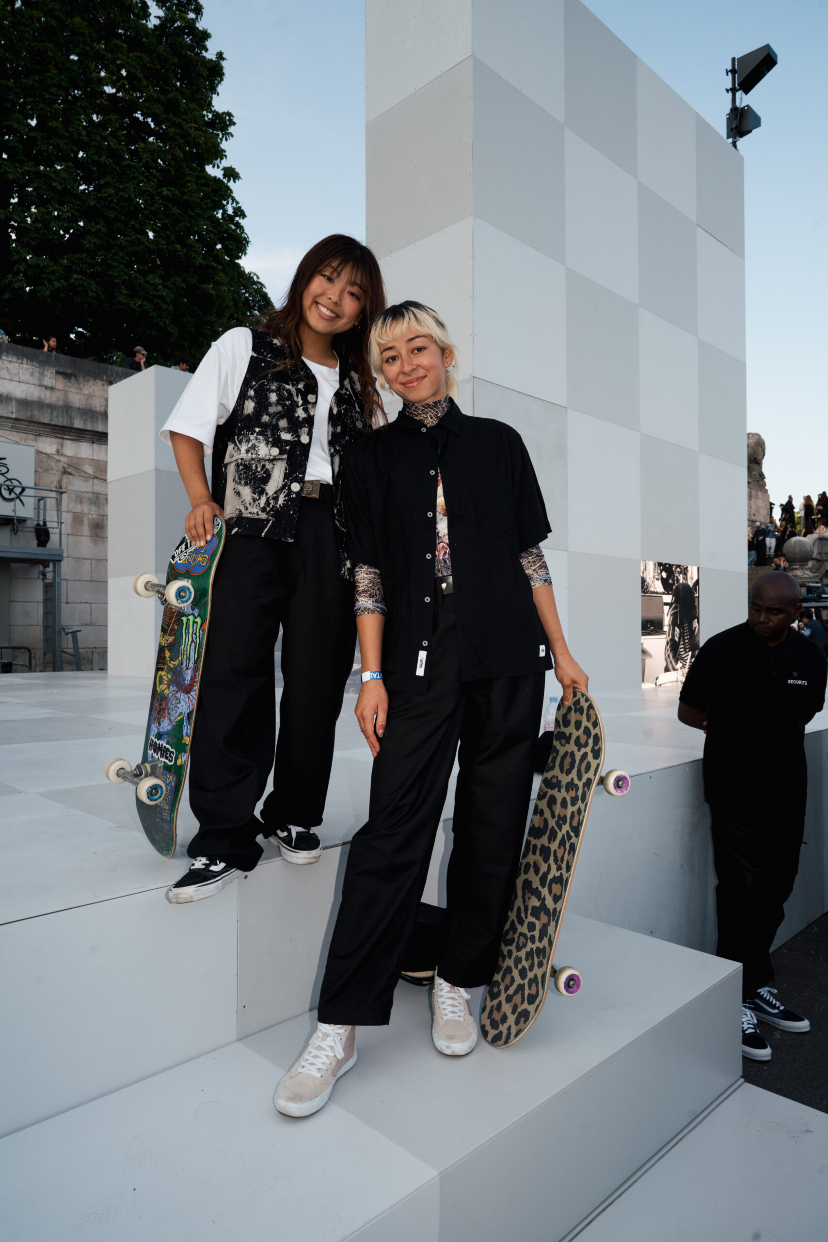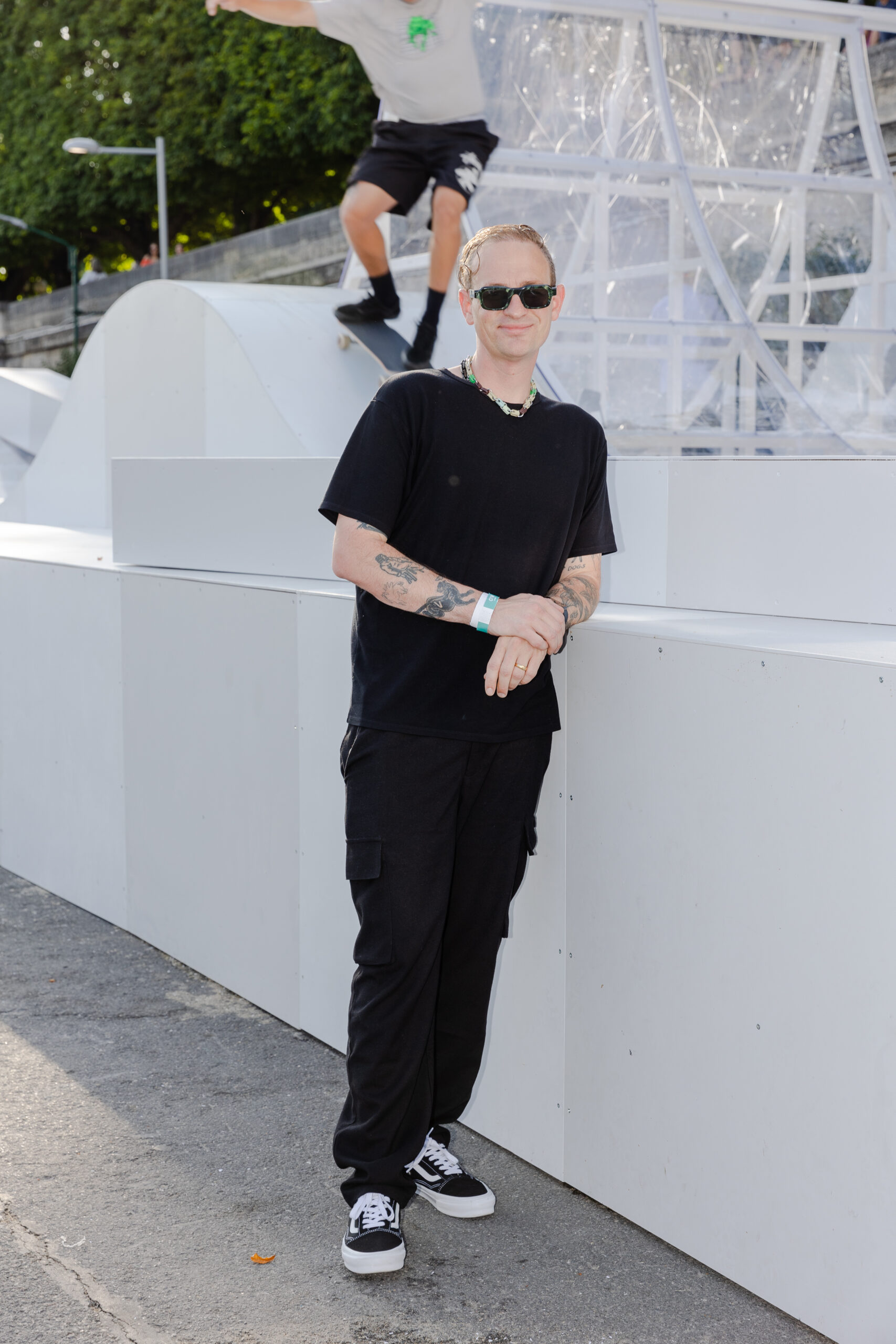 Attendees watched the Vans Skateboarding Team, including Beatrice Domond, Étienne Gagné, Rowan Zorilla, Lizzie Armanto, Mami Tezuka, Zion Wright, Diego Todd, and Axel Cruysberghs skate the OTW by Vans skate installation, set to the backdrop of the Eiffel Tower and music by Onyx Collective. Later in the evening, King Krule took to the stage and closed out the night, while Parisian passersby gathered on the bridge.