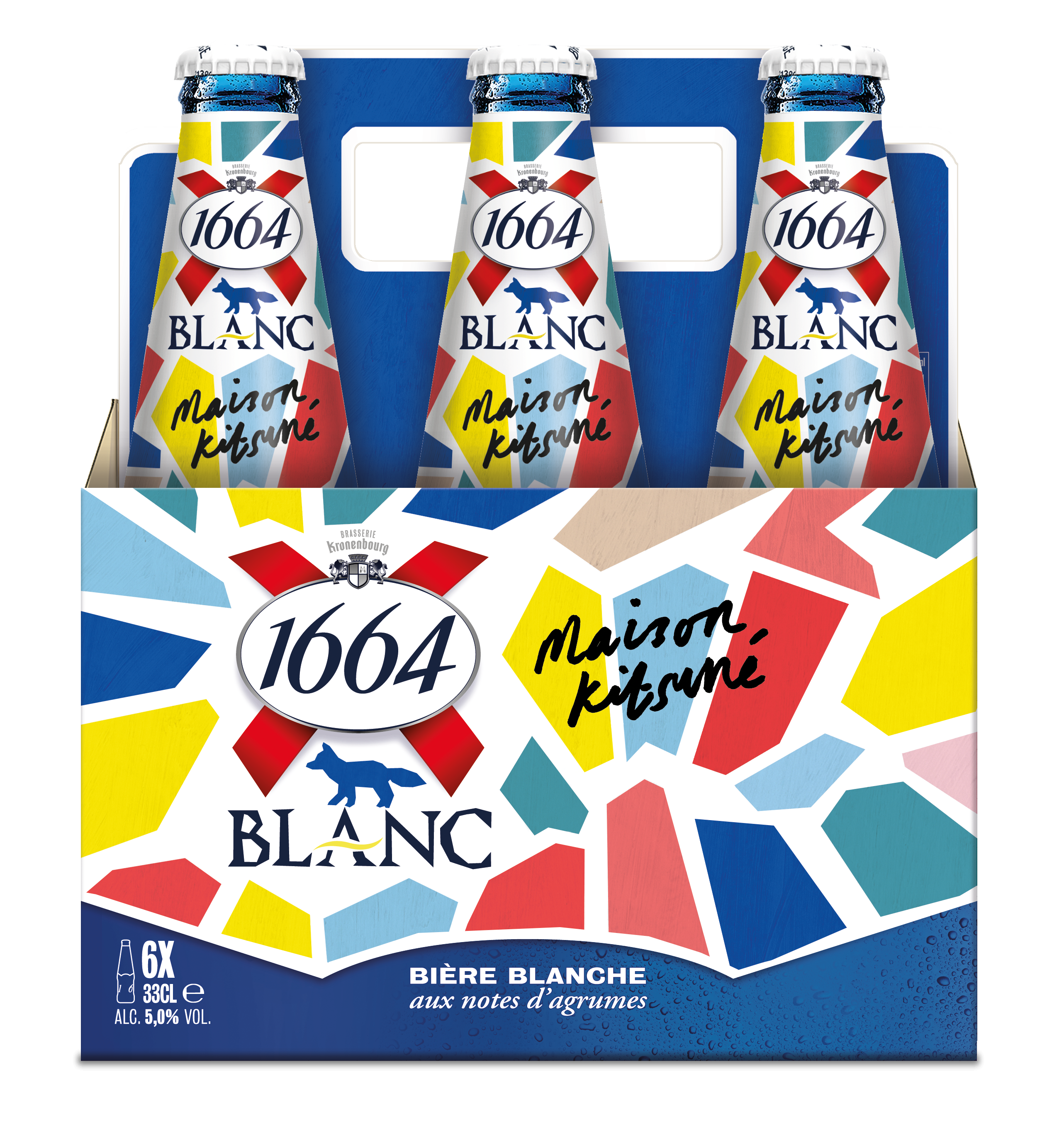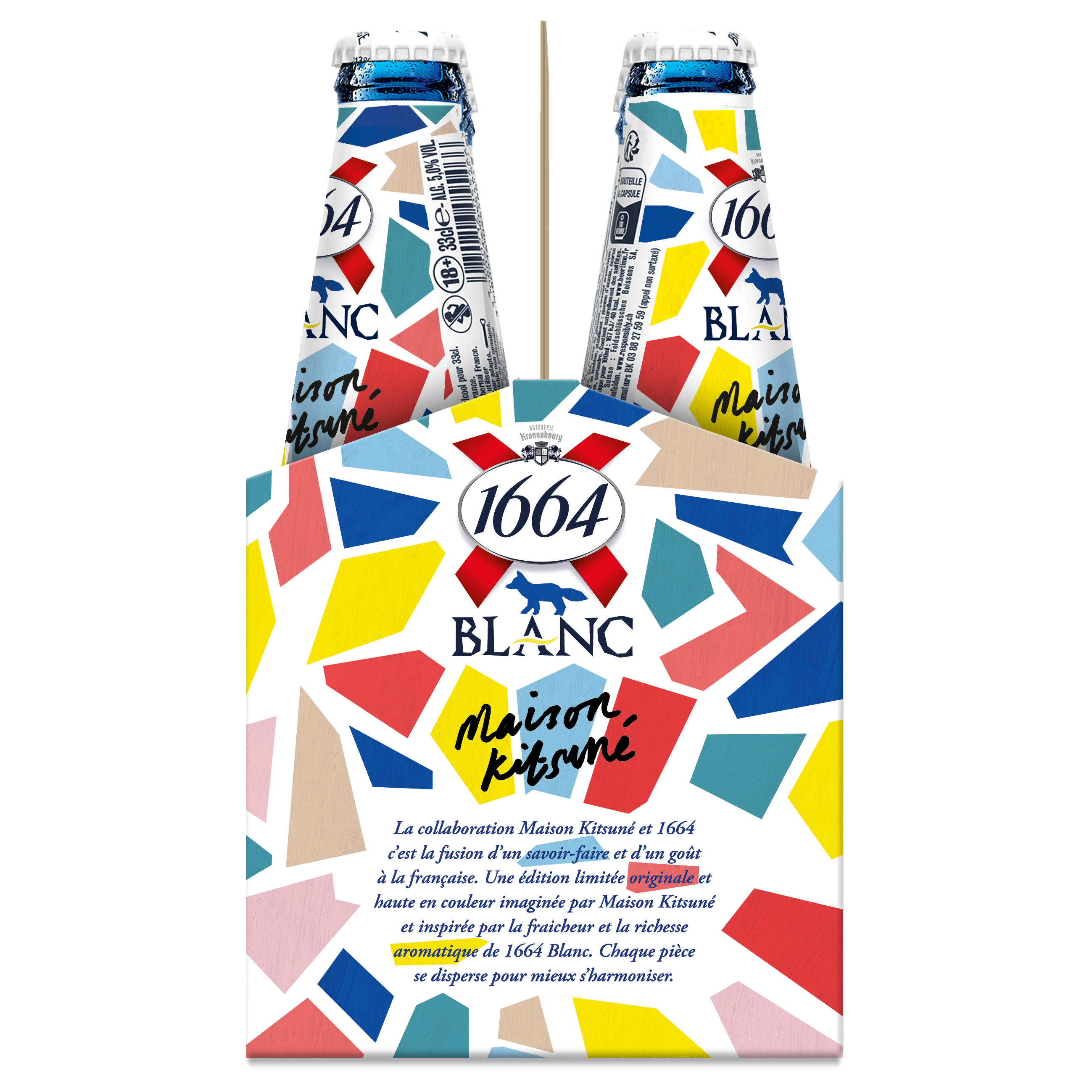 Fondée en 2002, Maison Kitsuné s’inspire de la culture française et japonaise pour développer des créations contemporaines et intemporelles. Leur approche holistique et leur concept épuré sont une parfaite complémentarité à l’image pétillante et innovante de 1664 Blanc. Le résultat de cette association est une bouteille en édition limitée, dotée d’un design coloré et graphique qui exprime parfaitement l’âme et le caractère de ces deux marques.
