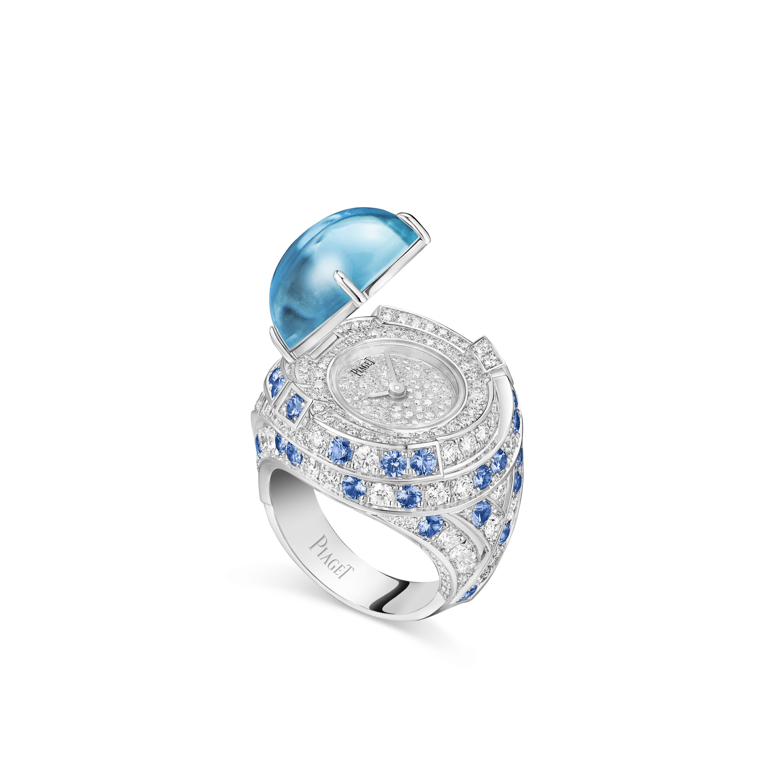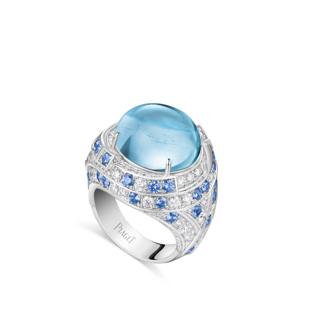 La collection Metaphoria ne se limite pas aux bijoux, elle propose également des montres d’exception. La bague Adrivea, par exemple, est une montre-bijou qui donne l’heure sous un cabochon d’aigue-marine de 10,88 carats. Le cadran étincelant de diamants se reflète dans les vagues de brillants et de saphirs bleus qui ornent la monture de cette pièce au volume généreux.