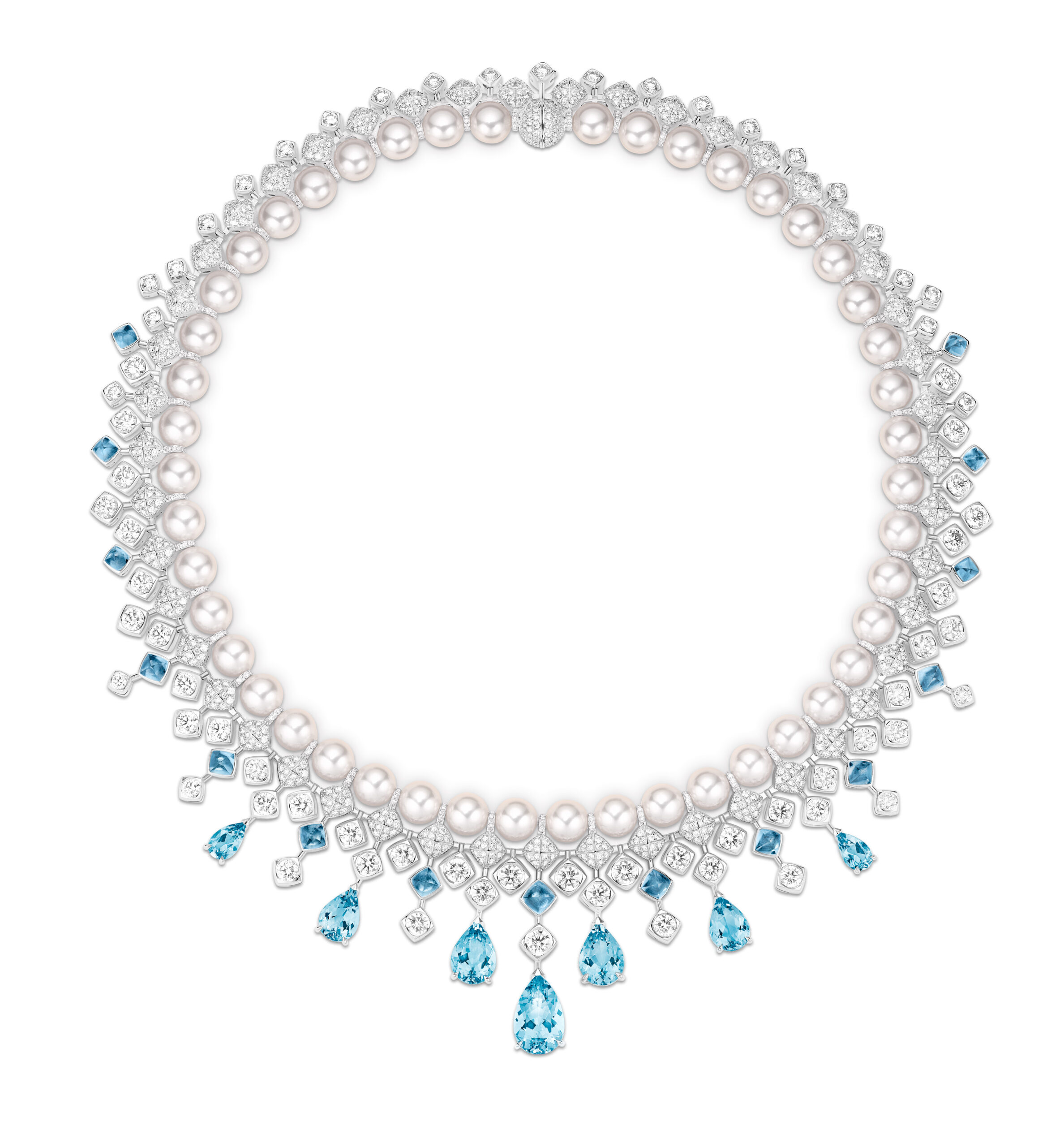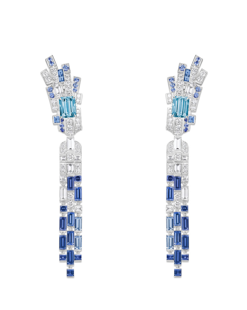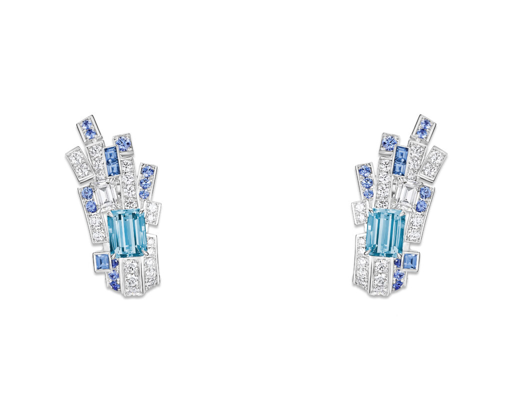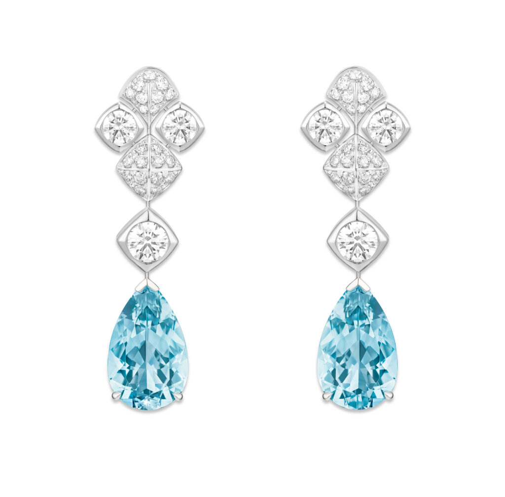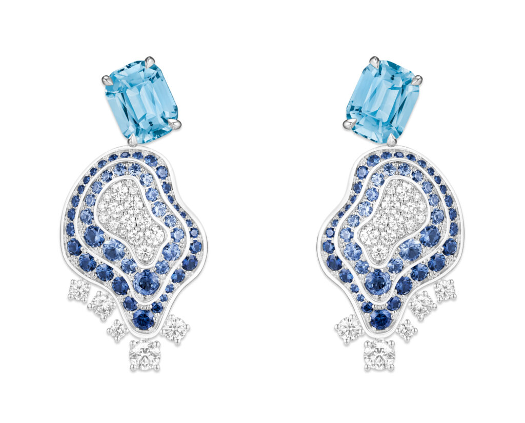 Aqua Summa, quant à lui, est un ensemble d’une élégance remarquable, évoquant la beauté du givre et de la glace. Le collier en collerette, entièrement articulé et doté d’un fermoir invisible, présente des aigues-marines taille poire d’un bleu céruléen, soulignant la finesse du design. Ce collier peut être coordonné avec des boucles d’oreilles et une bague cocktail exquise, créant ainsi une harmonie parfaite de couleurs et de textures.