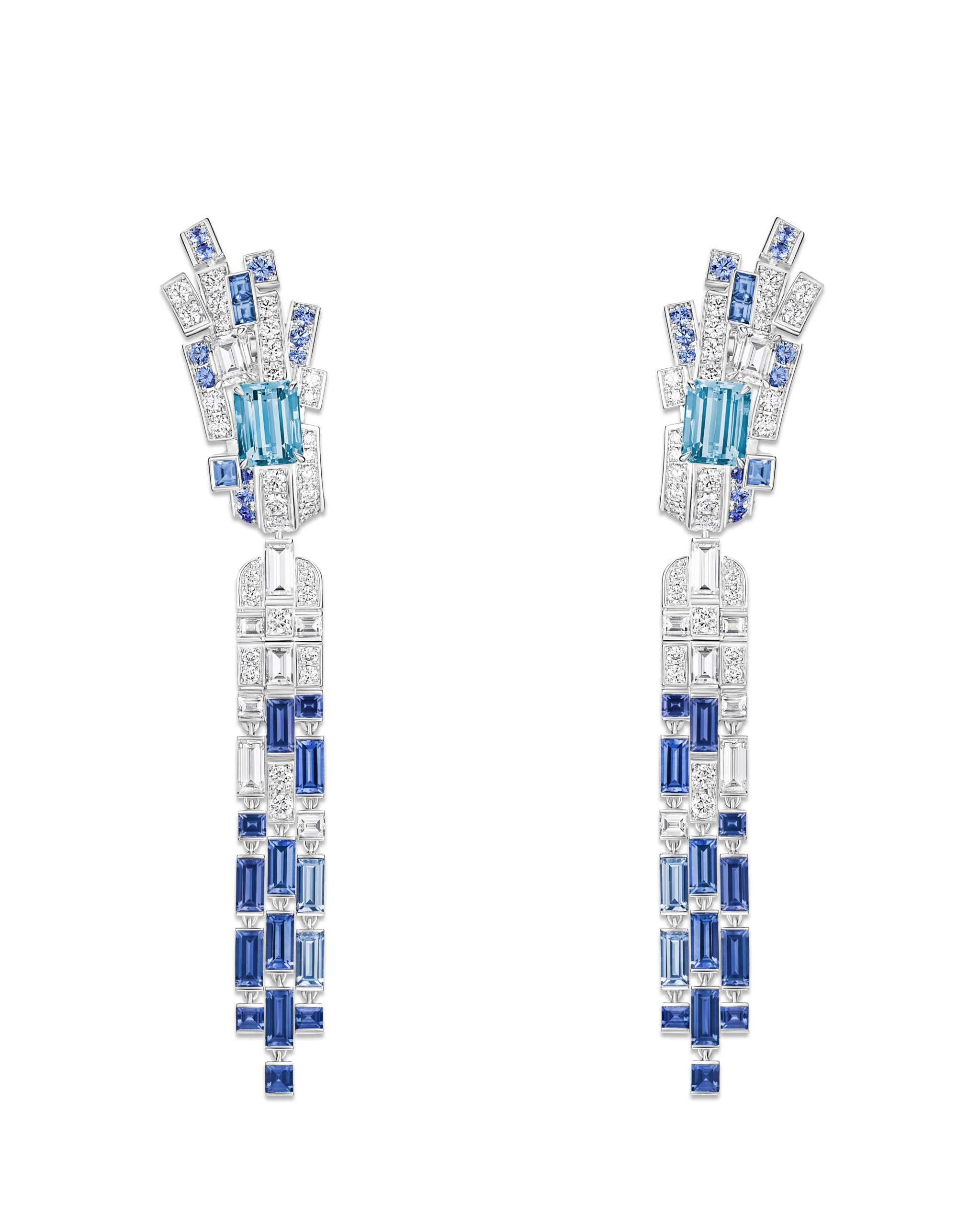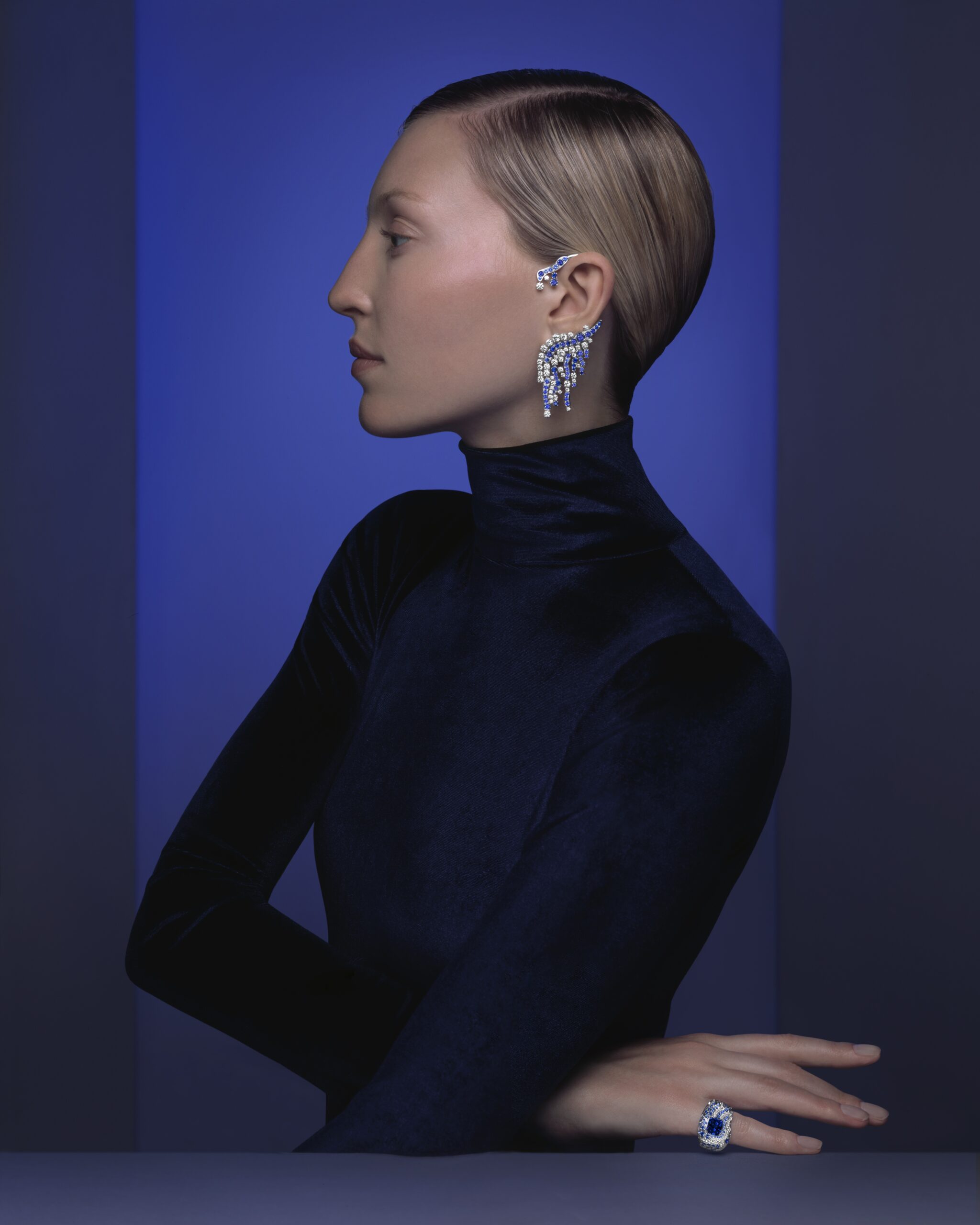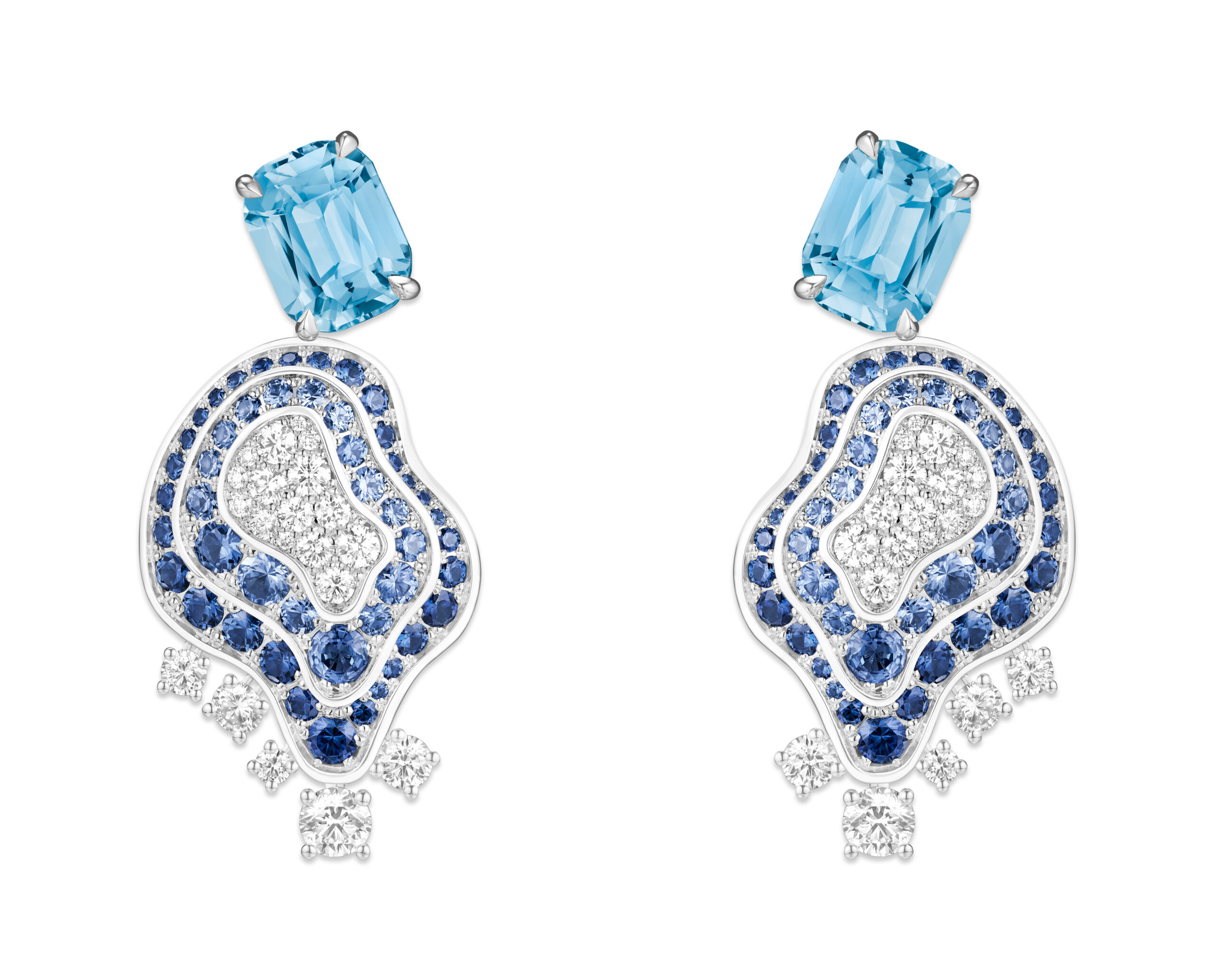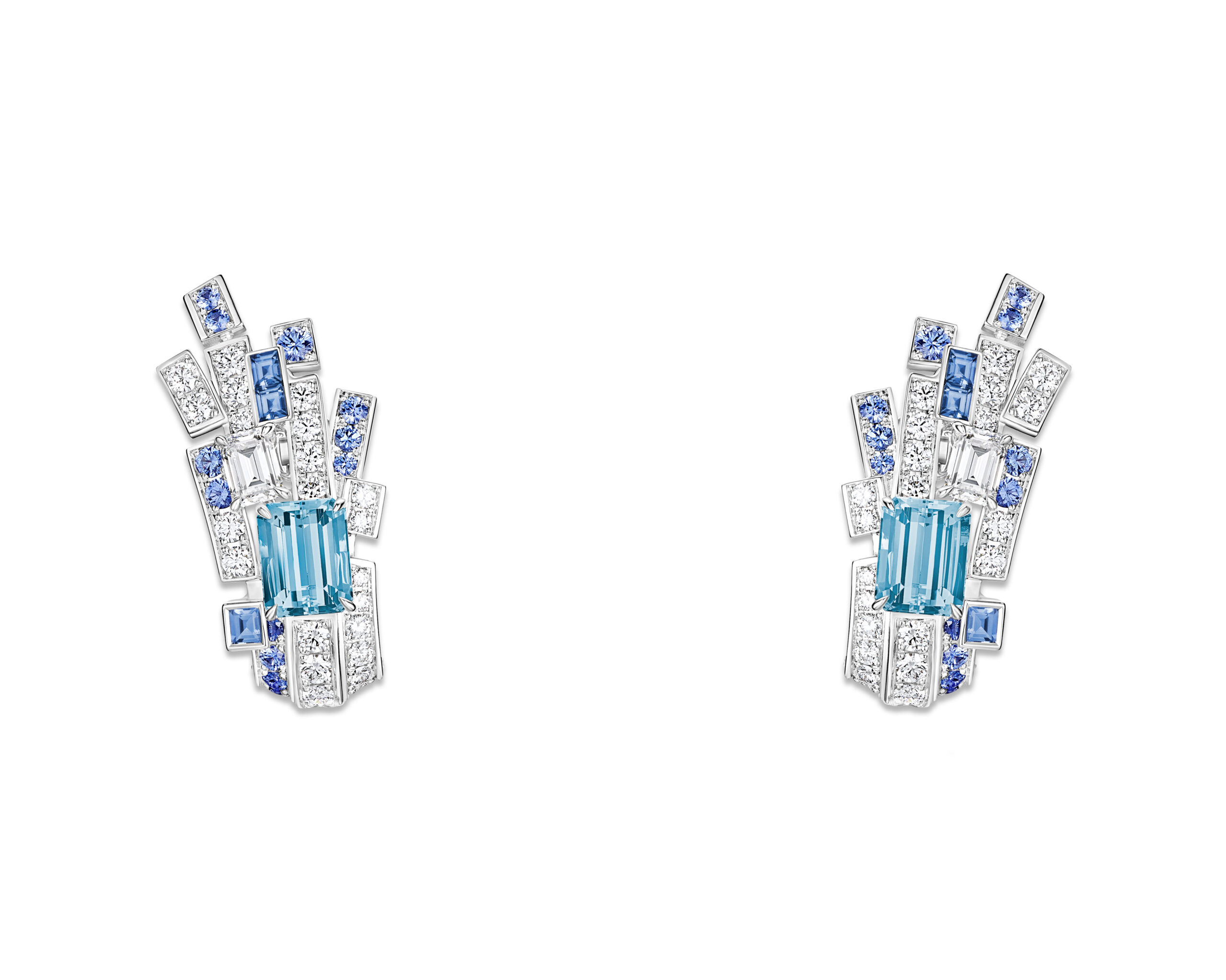 Aqua Summa, quant à lui, est un ensemble d’une élégance remarquable, évoquant la beauté du givre et de la glace. Le collier en collerette, entièrement articulé et doté d’un fermoir invisible, présente des aigues-marines taille poire d’un bleu céruléen, soulignant la finesse du design. Ce collier peut être coordonné avec des boucles d’oreilles et une bague cocktail exquise, créant ainsi une harmonie parfaite de couleurs et de textures.