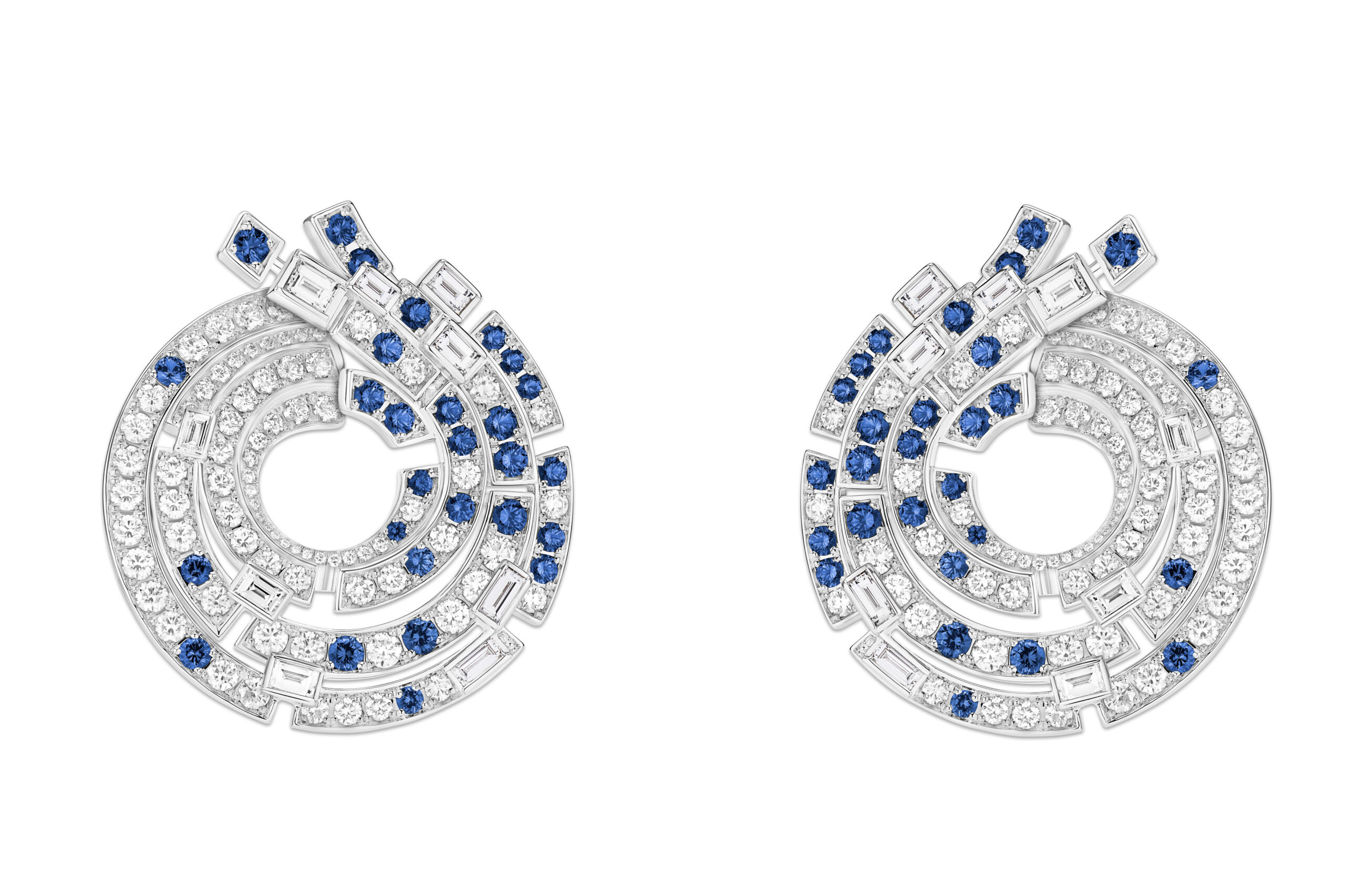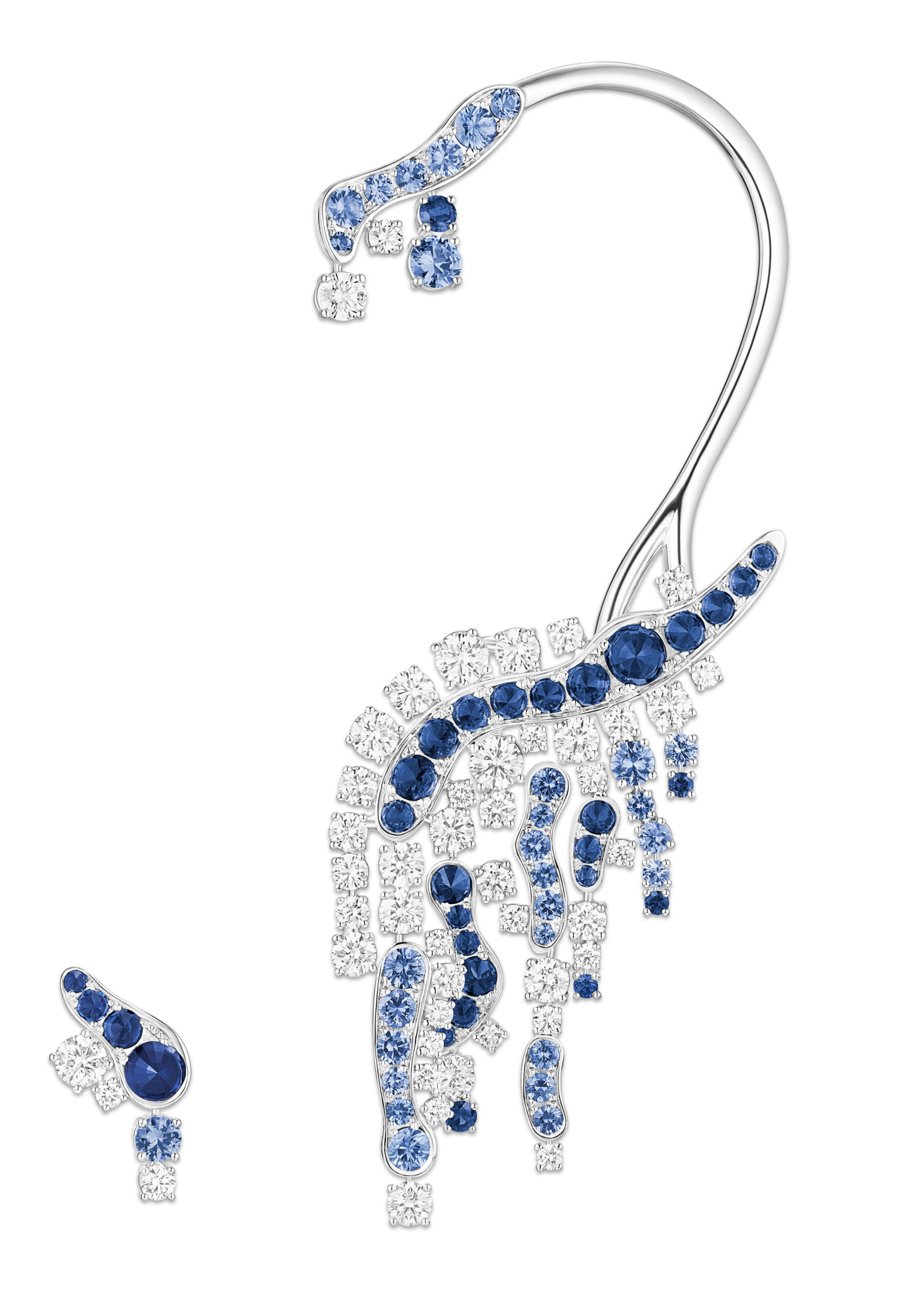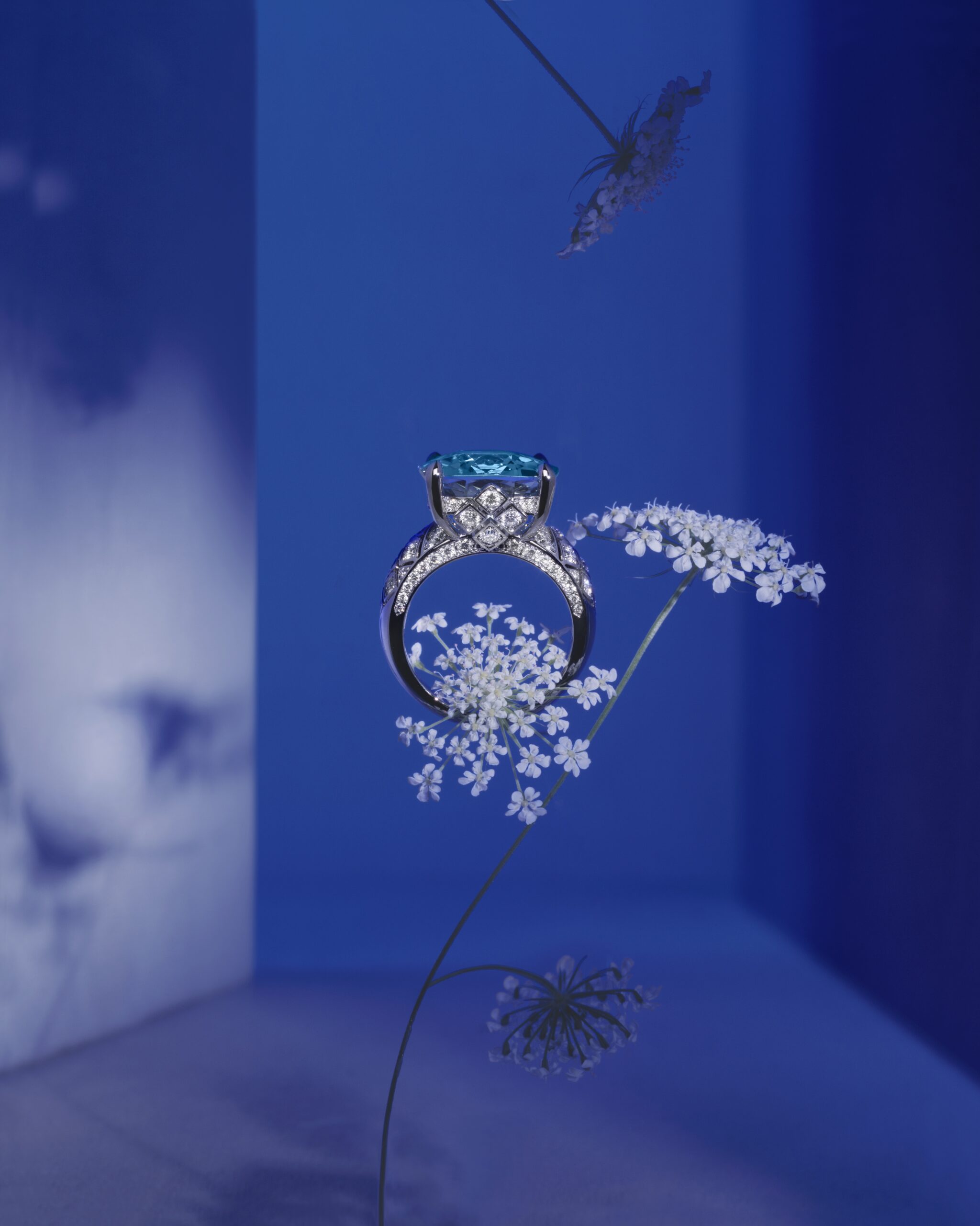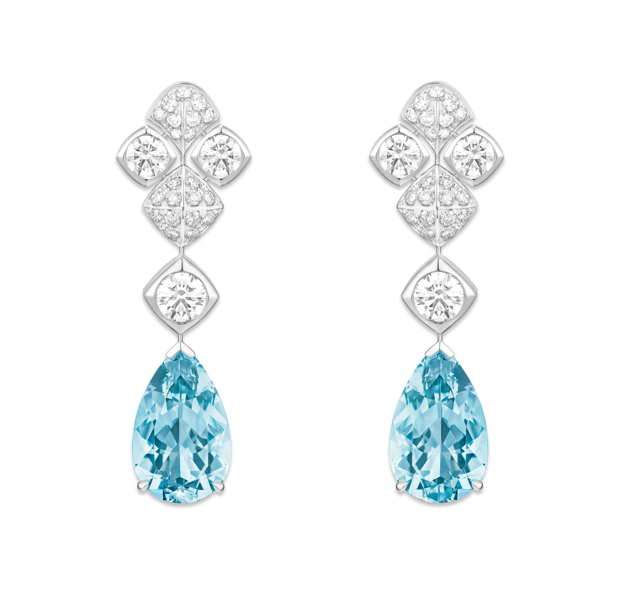 Aqua Summa, quant à lui, est un ensemble d’une élégance remarquable, évoquant la beauté du givre et de la glace. Le collier en collerette, entièrement articulé et doté d’un fermoir invisible, présente des aigues-marines taille poire d’un bleu céruléen, soulignant la finesse du design. Ce collier peut être coordonné avec des boucles d’oreilles et une bague cocktail exquise, créant ainsi une harmonie parfaite de couleurs et de textures.