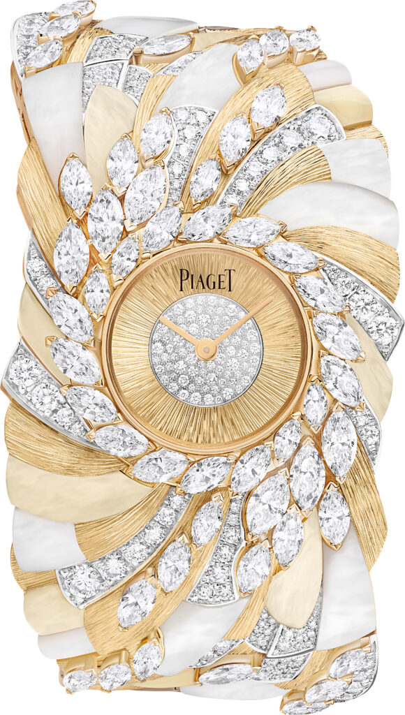 Loin de se limiter à une nature figurative, élément rare chez Piaget, la Maison a choisi les éléments les plus révélateurs de cette énergie qui fait vibrer océans, montagnes et forêts. « Notre objectif était de mettre l’accent sur des détails qui puissent évoquer des phénomènes naturels comme le ruissellement d’une cascade, le rayonnement du soleil tout en suscitant une émotion particulière, explique Stéphanie Sivrière, directrice artistique de Piaget. Les matériaux employés, des élytres d’insectes aux bois précieux, ont été sélectionnés pour ce qu’ils peuvent apporter d’étonnant, de vivant à une pièce de haute joaillerie du XXIème siècle. »