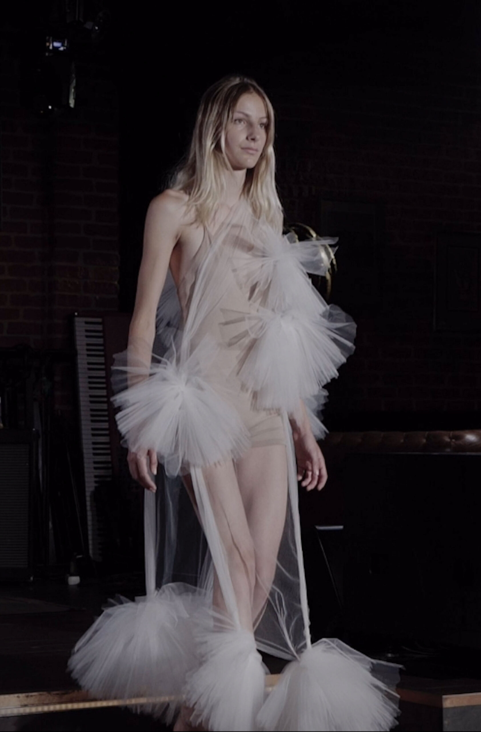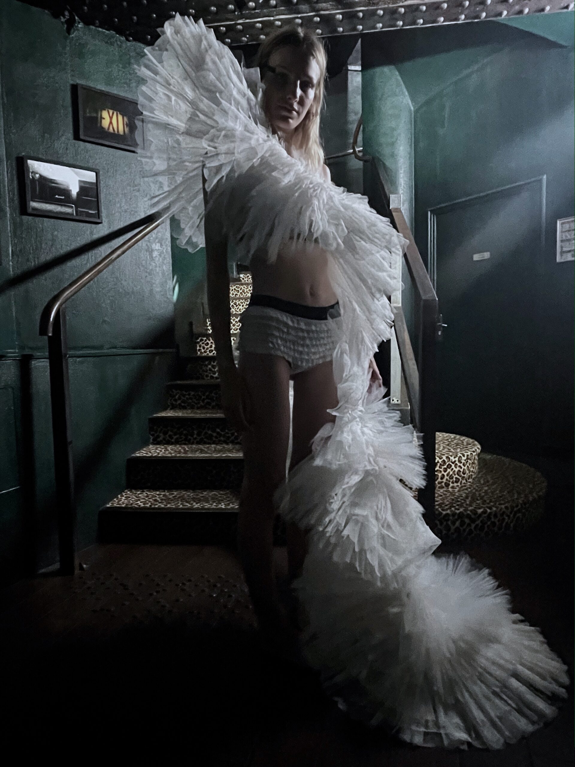 L’élégance intemporelle du ballet devient ainsi une source d’inspiration pour AELIS. La silhouette classique du tutu, semblable à la fleur de pissenlit, est transformée en une création upcycling sculpturale et éphémère, qui préserve l’histoire et l’expérience qui habitaient ces formes.