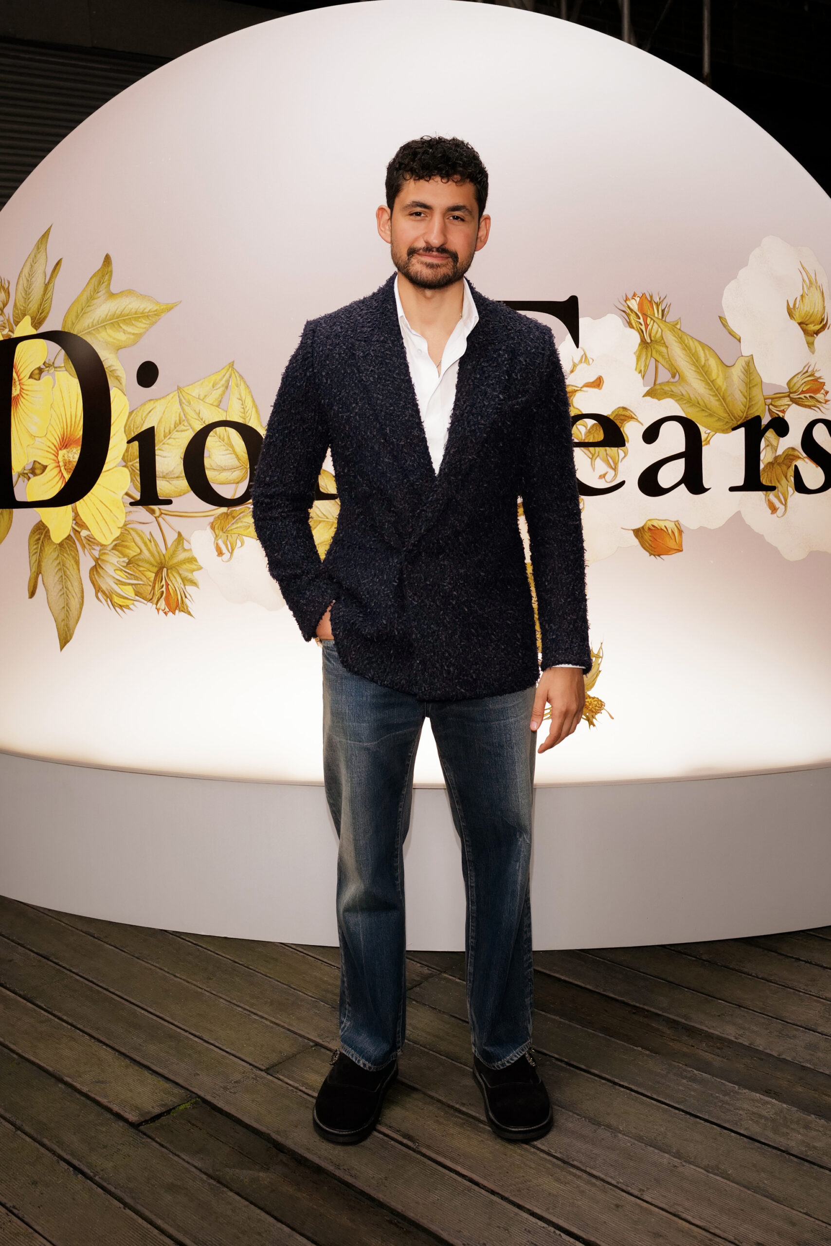 L’acteur britannique Amir El-Masry a opté pour une veste double boutonnage en tweed bleu de la collection Dior Tears, un pantalon en denim, une chemise en coton blanc et des mules Dior Aqua noires.