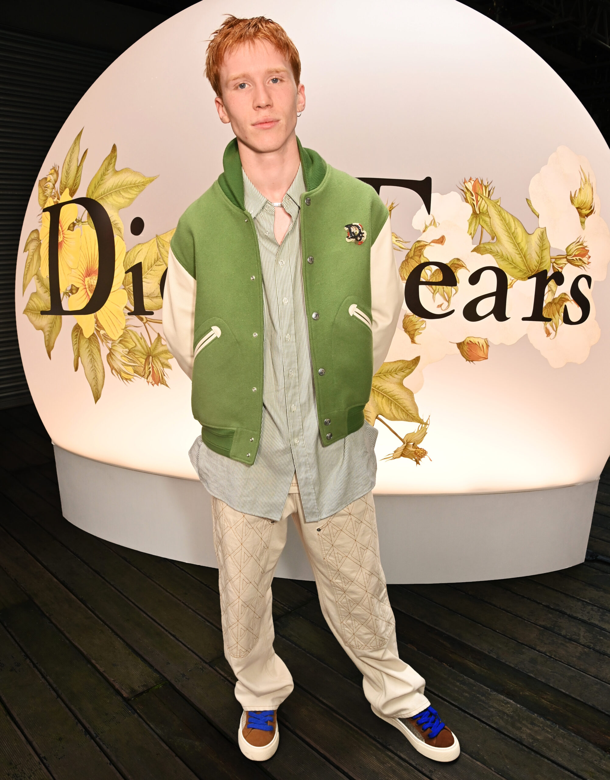Patrick Gibson, acteur irlandais, a fait son apparition dans un pull en coton brun de la collection Dior Tears, un sweatshirt en coton beige, un denim blanc cassé avec un tablier amovible Dior Tears, des chaussettes en coton brun et une paire de baskets B33.