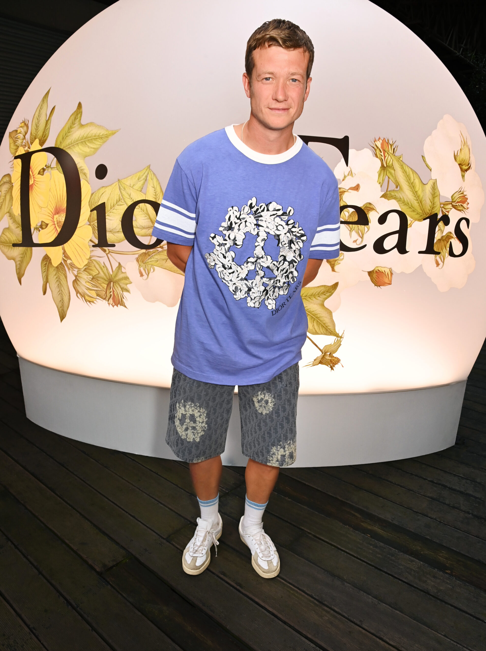Ed Speleers, l’acteur britannique, a choisi un t-shirt en coton violet de la collection Dior Tears, des shorts en denim de coton bleu avec un imprimé Dior Oblique et Dior Tears Peace Sign.