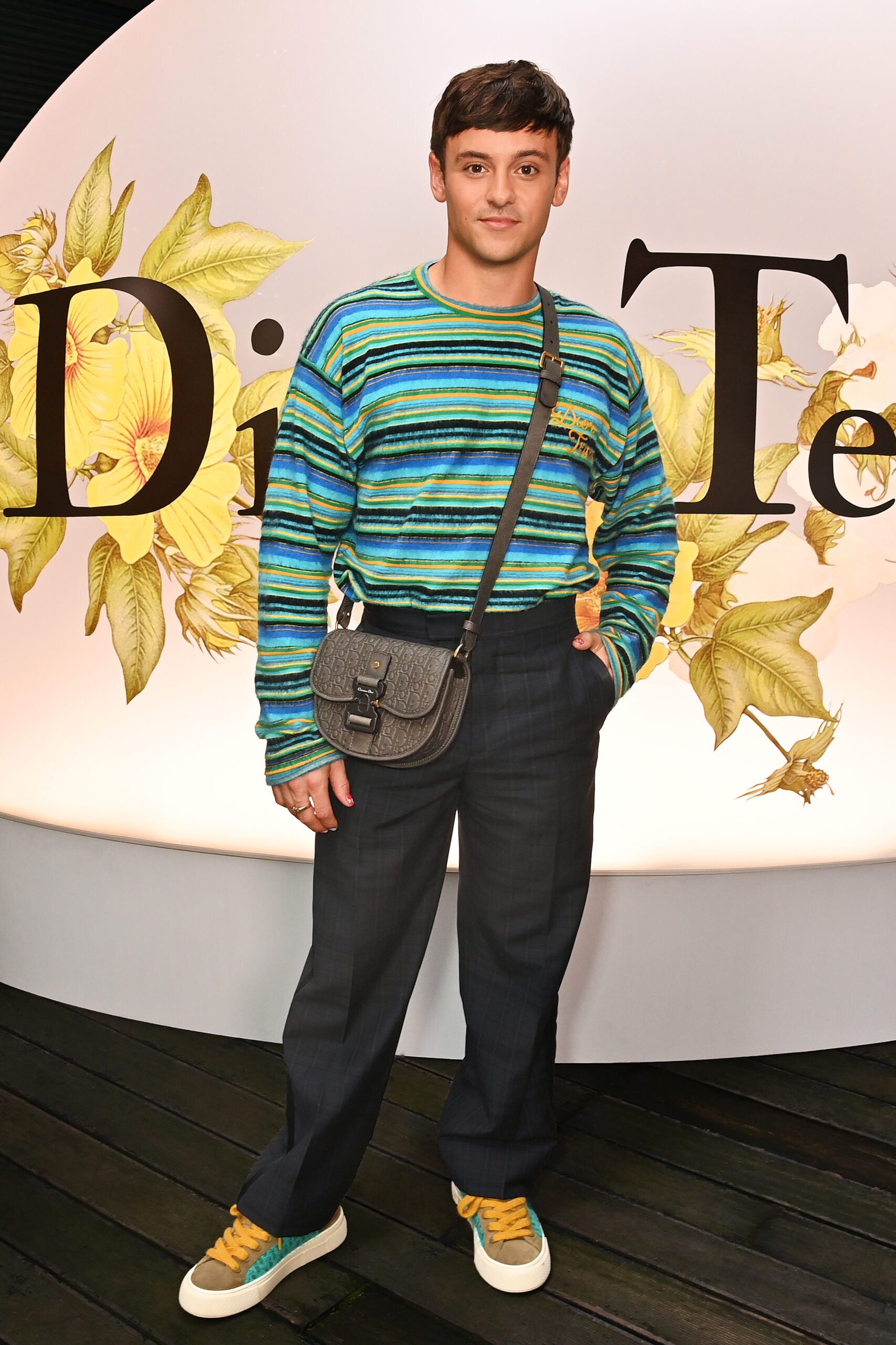L’athlète olympique britannique Tom Daley a illuminé l’événement avec un pull à rayures multicolores en alpaga de la collection Dior Tears, assorti d’un pantalon de laine gris foncé, un sac Mini Gallop en cuir brun et une paire de baskets B33.