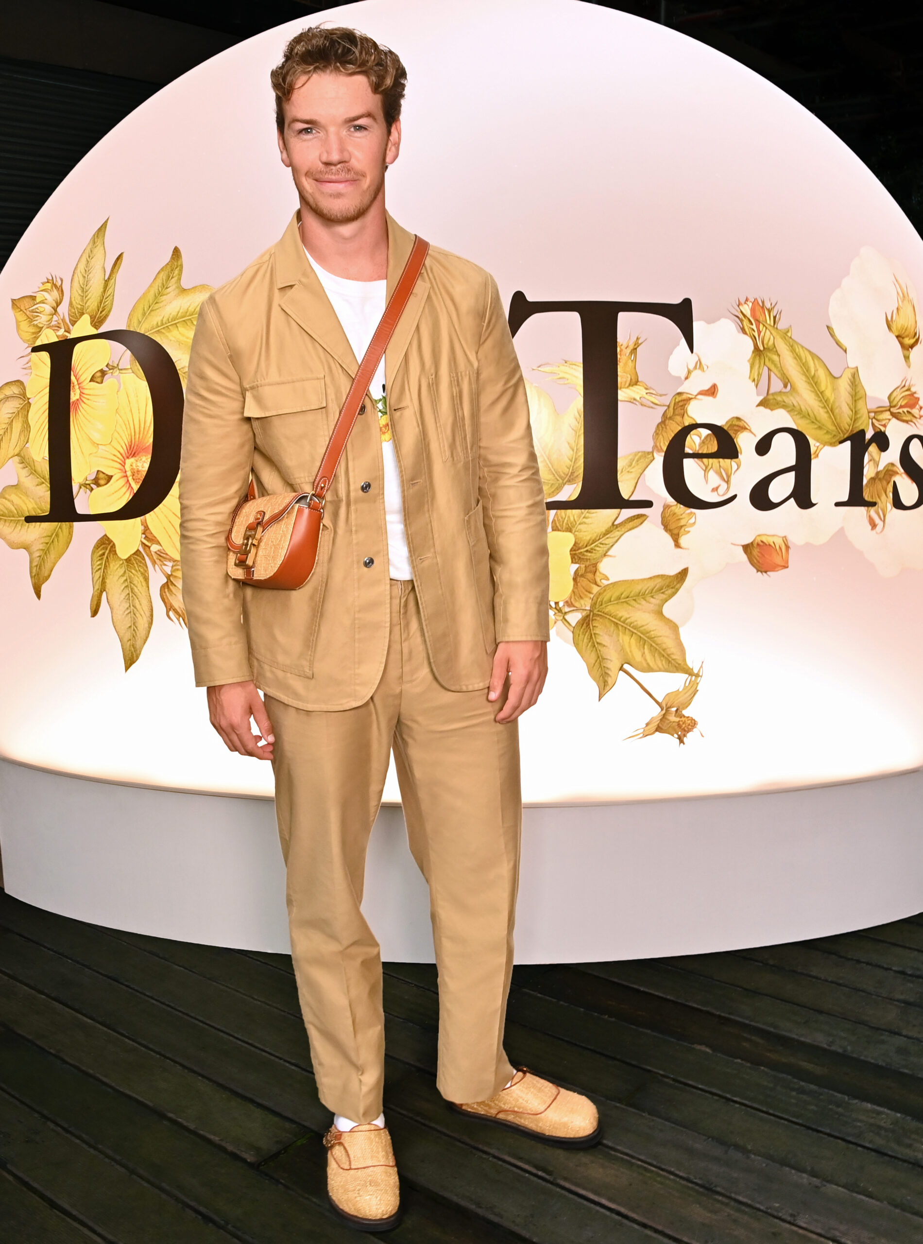 Will Poulter, acteur britannique, est apparu dans un ensemble de travail beige en coton de la collection Dior Tears, un t-shirt en coton blanc, un sac Mini Gallop en raphia et une paire de mules Dior Aqua en raphia.