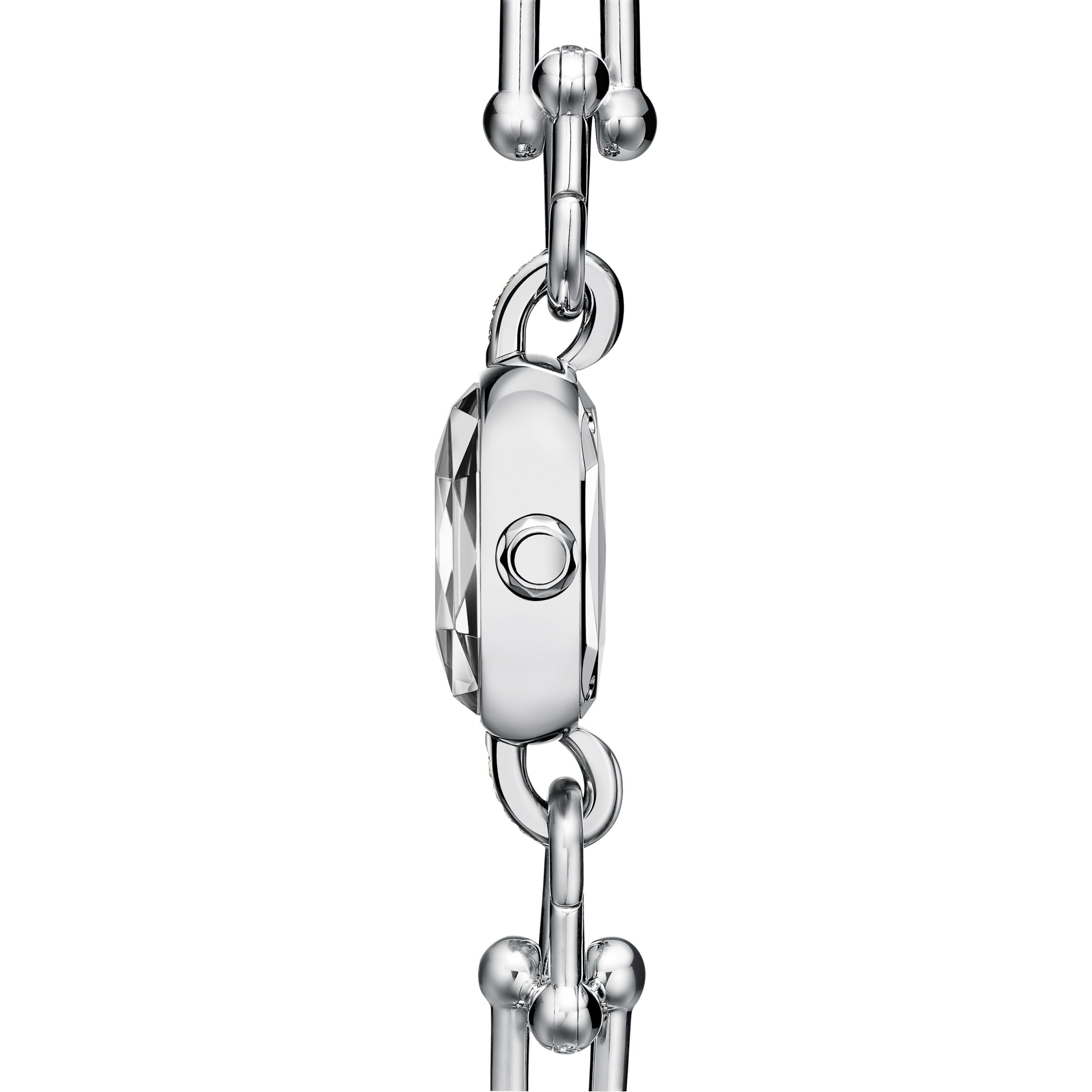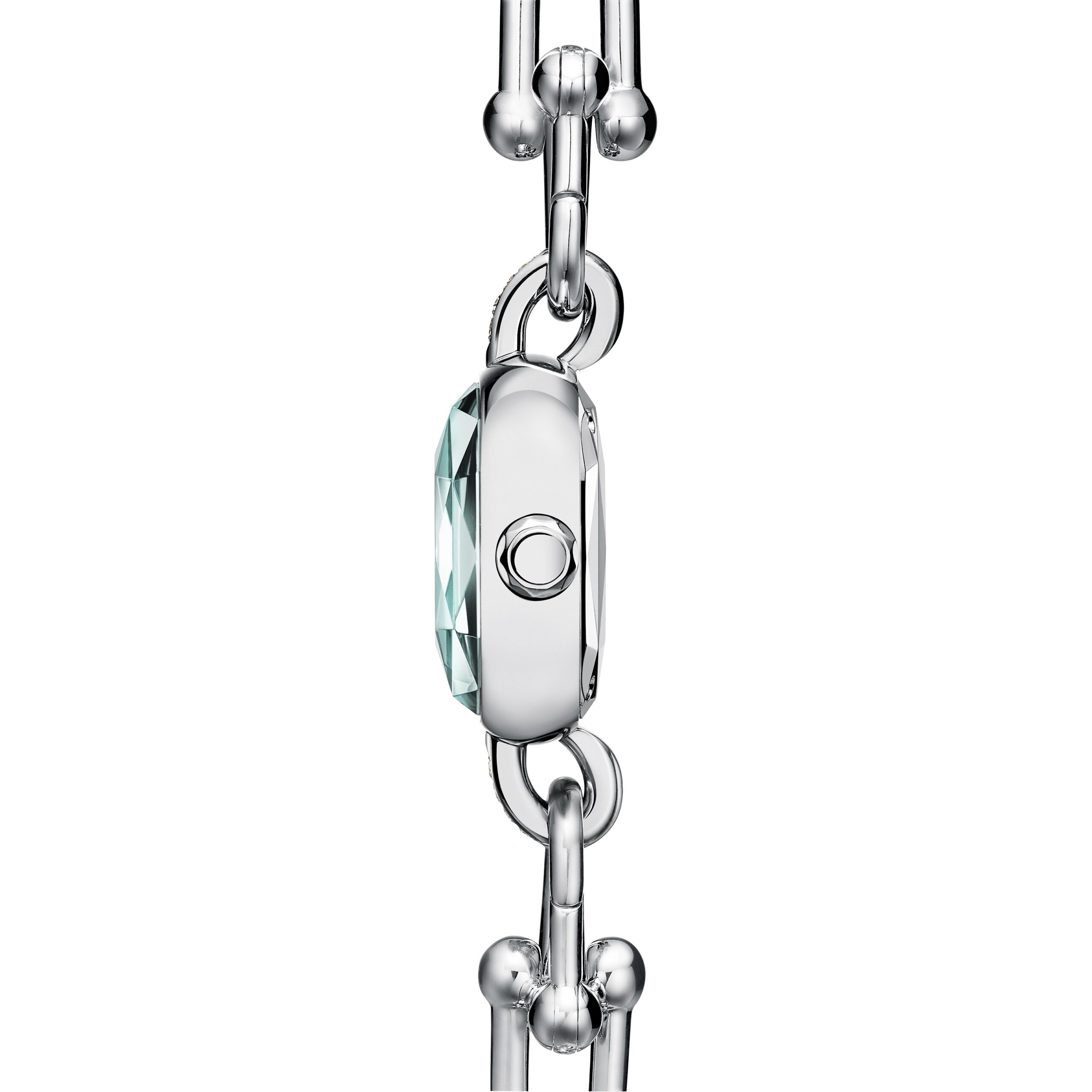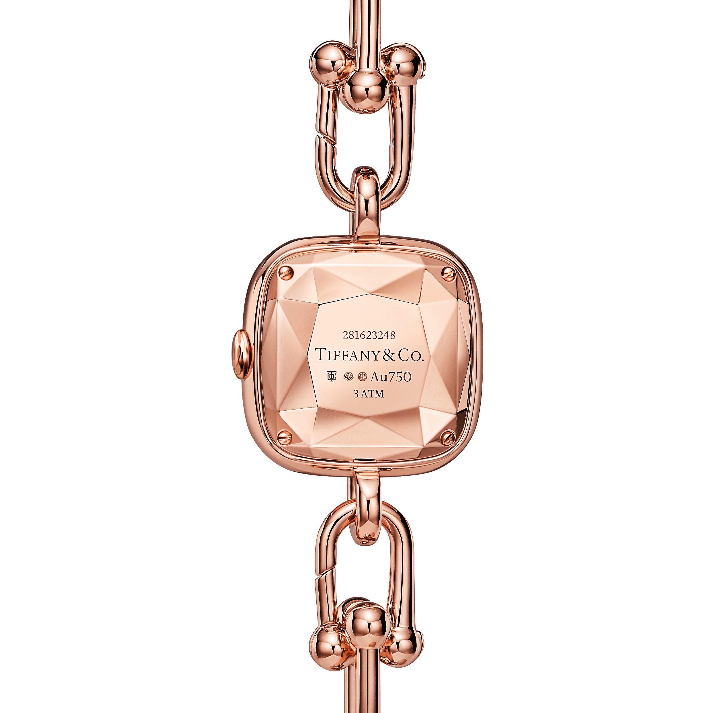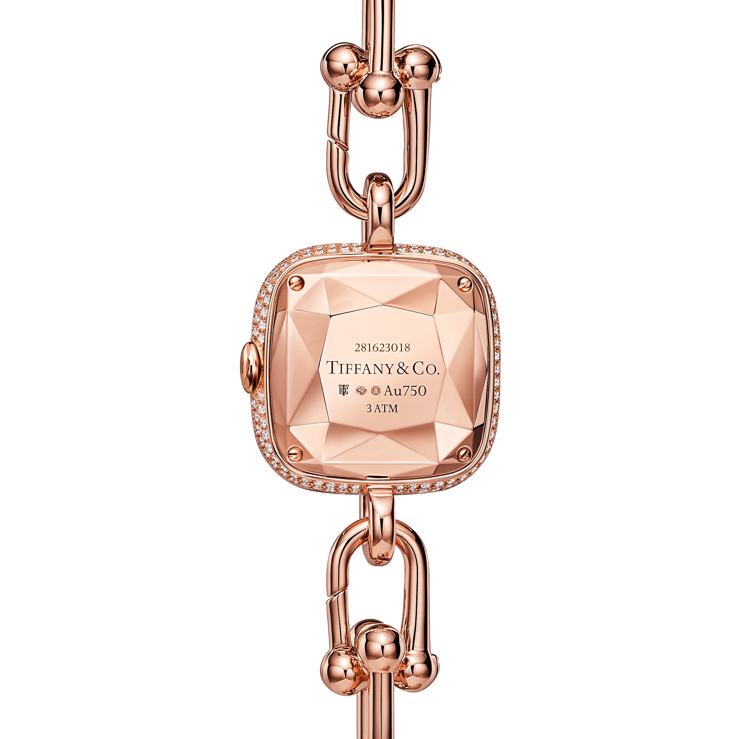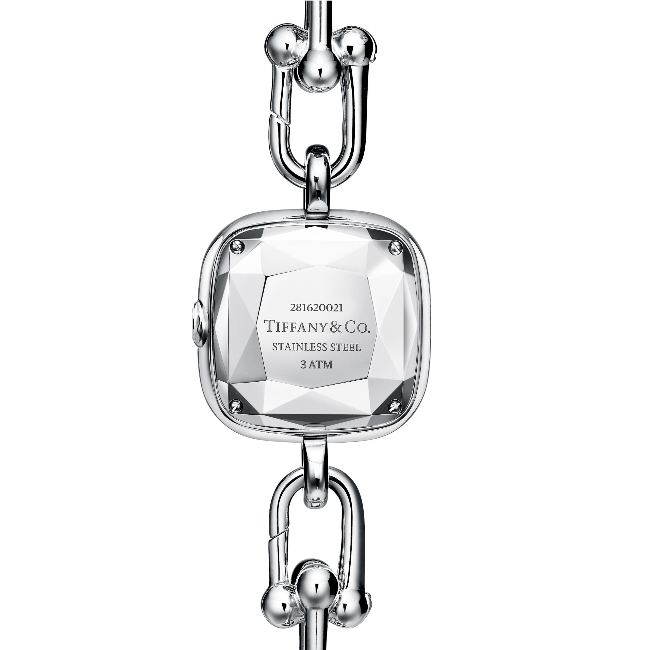Chaque montre est composée de 10 maillons. Le boîtier en forme de coussin et le verre saphir du design célèbrent le légendaire diamant Tiffany, reflétant les facettes extérieures de la pierre.