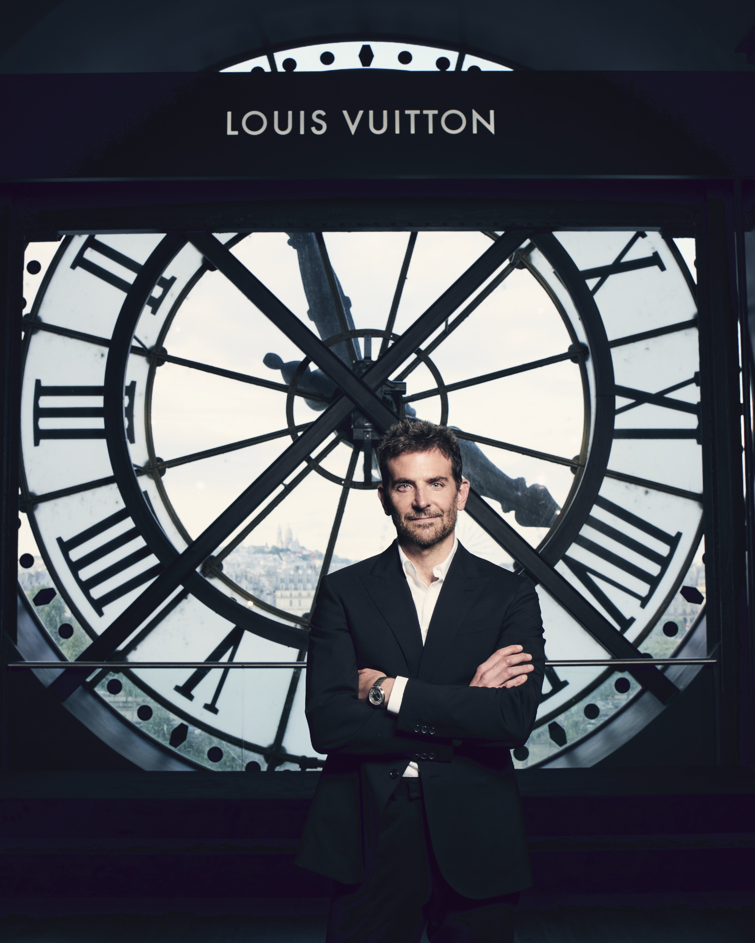 Bradley Cooper portait un costume simple boutonnage marine avec des bottes en cuir noir et la nouvelle montre Tambour avec cadran gris argent.