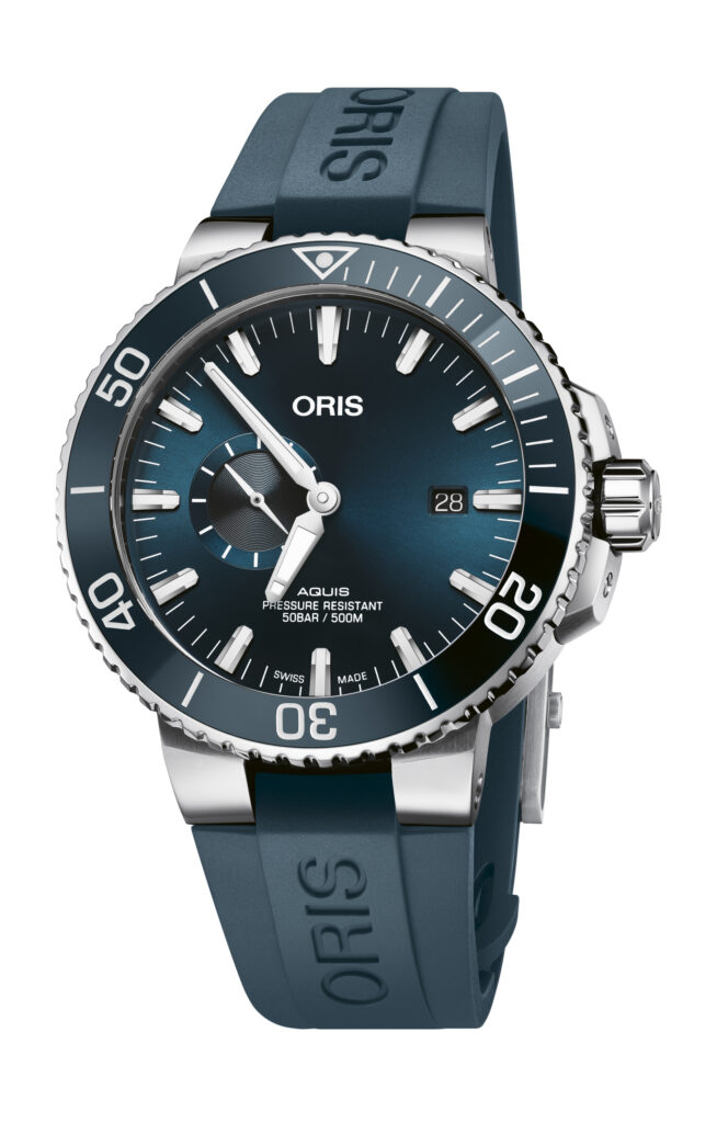 Pour le reste, l’Aquis Small Second Date 45,5 mm présente les mêmes caractéristiques fiables que les plongeurs attendent d’une Aquis Date : une couronne vissée avec protection, une lunette tournante unidirectionnelle avec un insert en céramique et un bracelet en acier inoxydable ou en caoutchouc équipé de la boucle déployante de sécurité avec une extension brevetée par Oris. Le cadran, la lunette et le bracelet en caoutchouc sont d’un bleu profond, inspiré des profondeurs de l’océan.