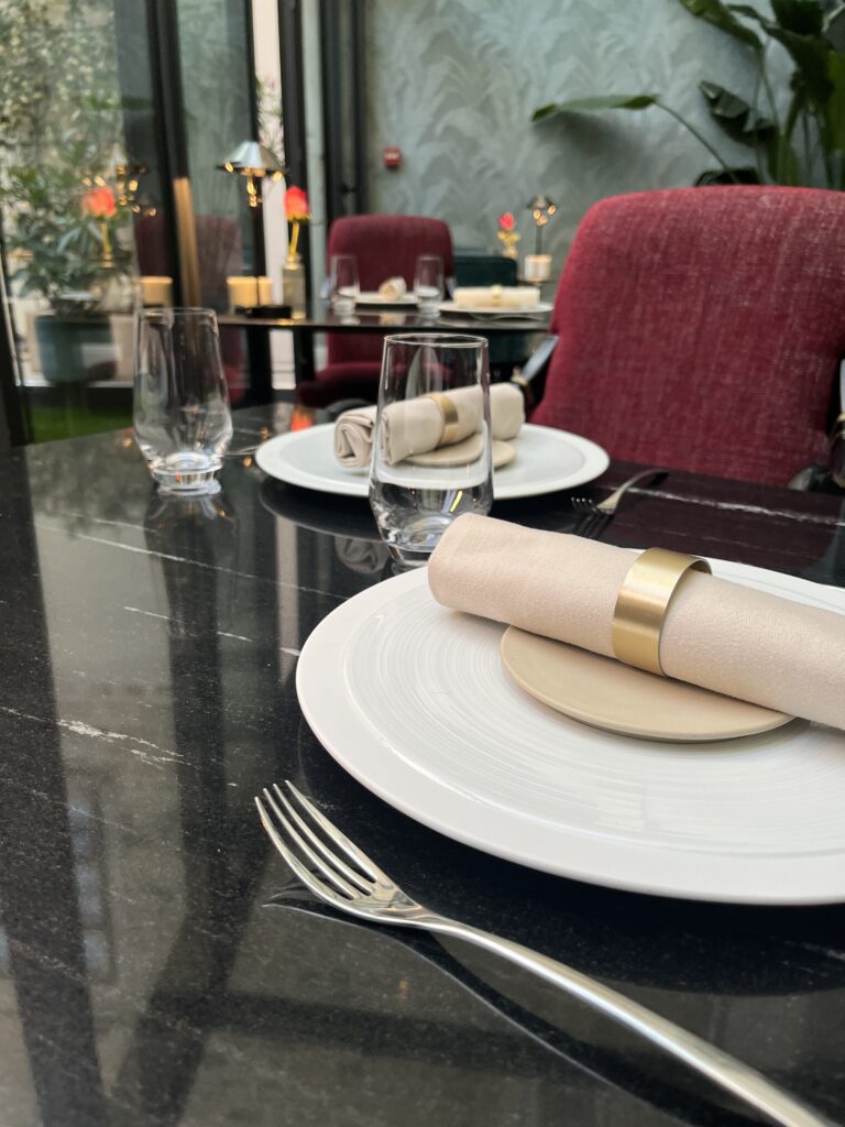 Le restaurant offre une expérience sensorielle atypique dans un décor feutré, orné de marbre et de velours. Un chef passionné, Nader Hassan, met en valeur des produits frais et de saison, provenant de sources locales et durables, dans les menus « Émotion » en 5 temps et « Séduction » en 7 temps.