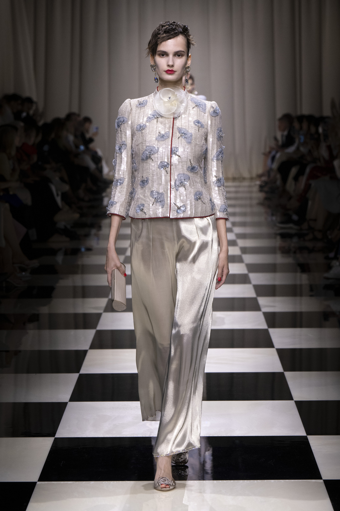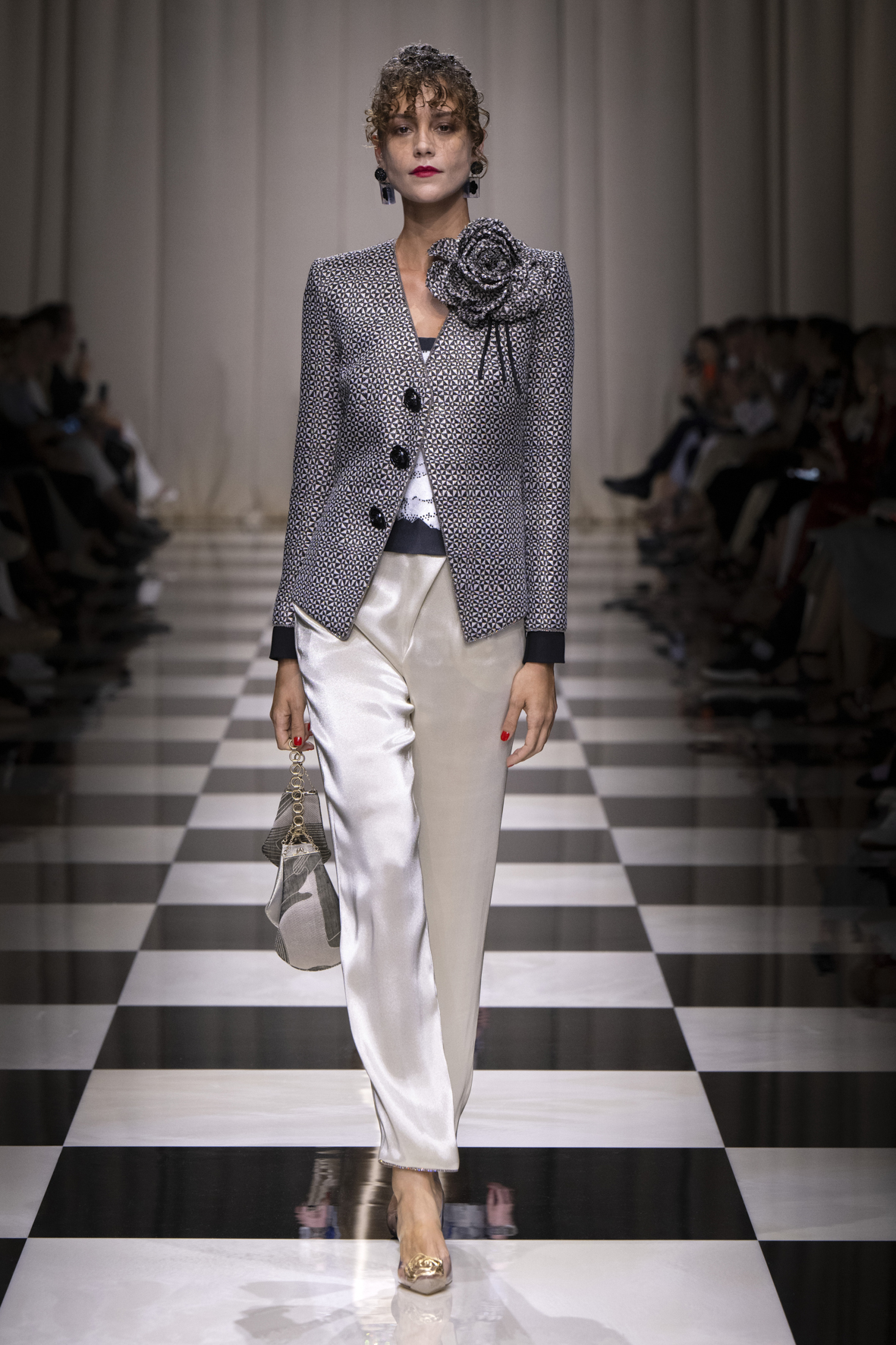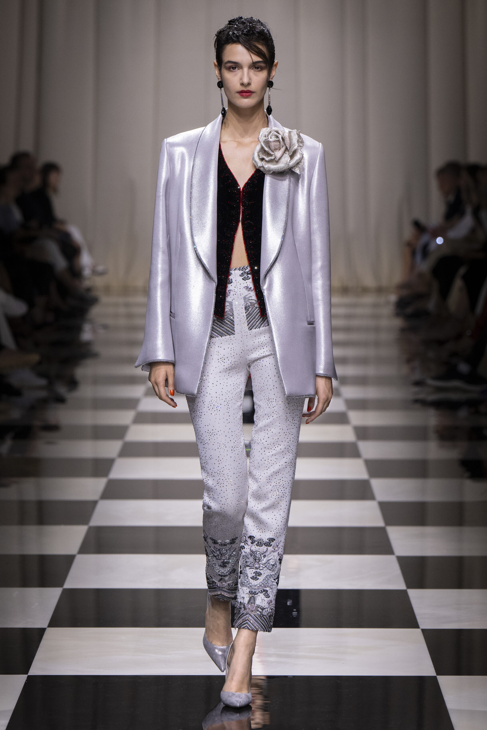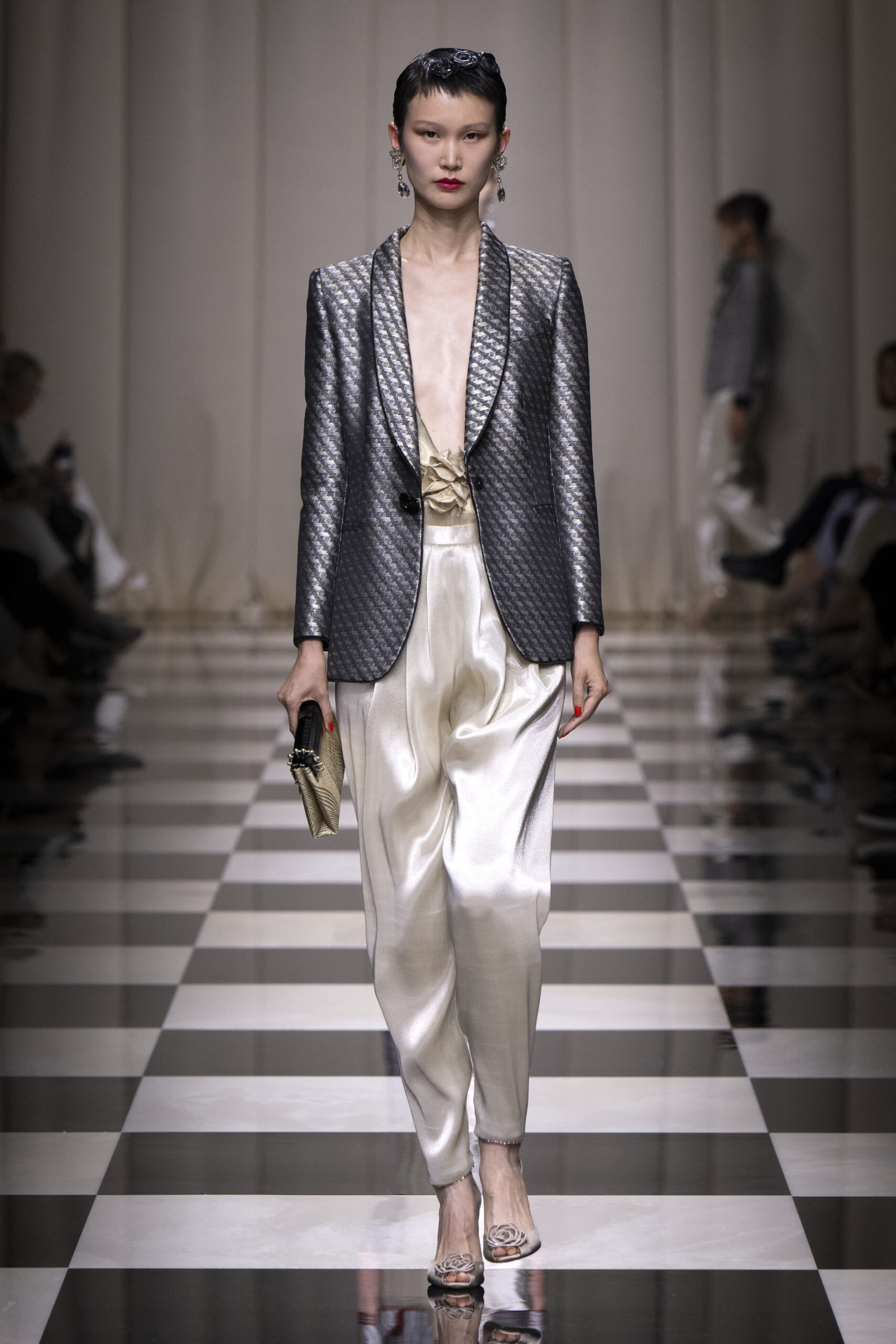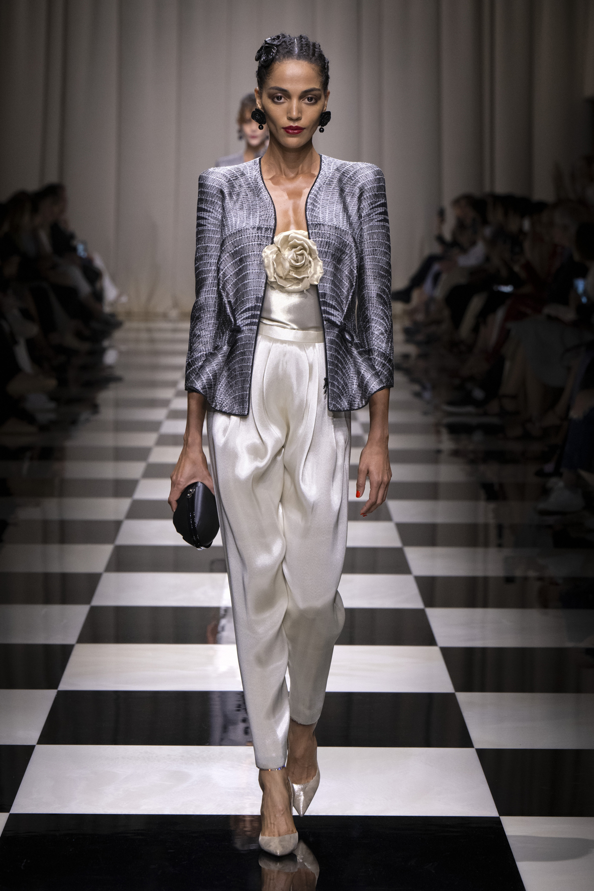 La rose, si liée à l’imaginaire féminin et à l’univers de la couture, est vue ici à travers la sensibilité et le sens de la précision du créateur. Les coupes sont épurées, fluides. Petites vestes, jupes longues, pantalons fluides, fourreaux sculptant la silhouette et talons toujours fins, élancés. Pétales et boutons se mêlent à des géométries rythmées, à des lignes de lumière, à des évocations d’autres mondes et cultures, donnant naissance à une création composite dont la protagoniste est une femme qui séduit, avec une grande lucidité.