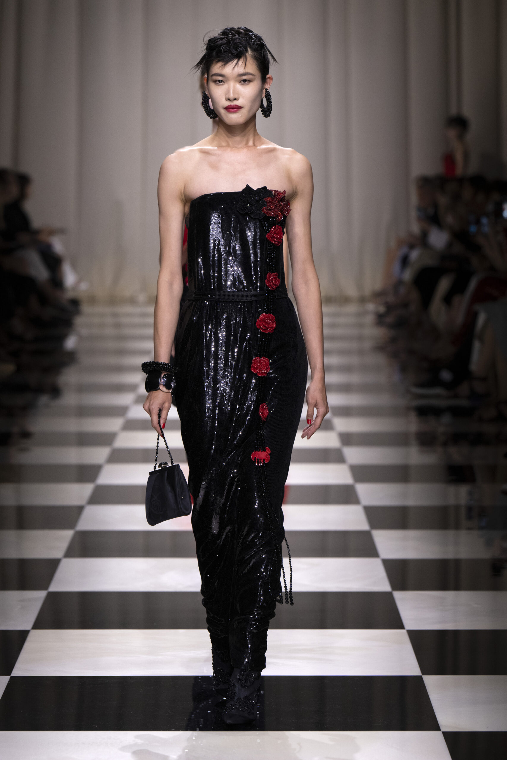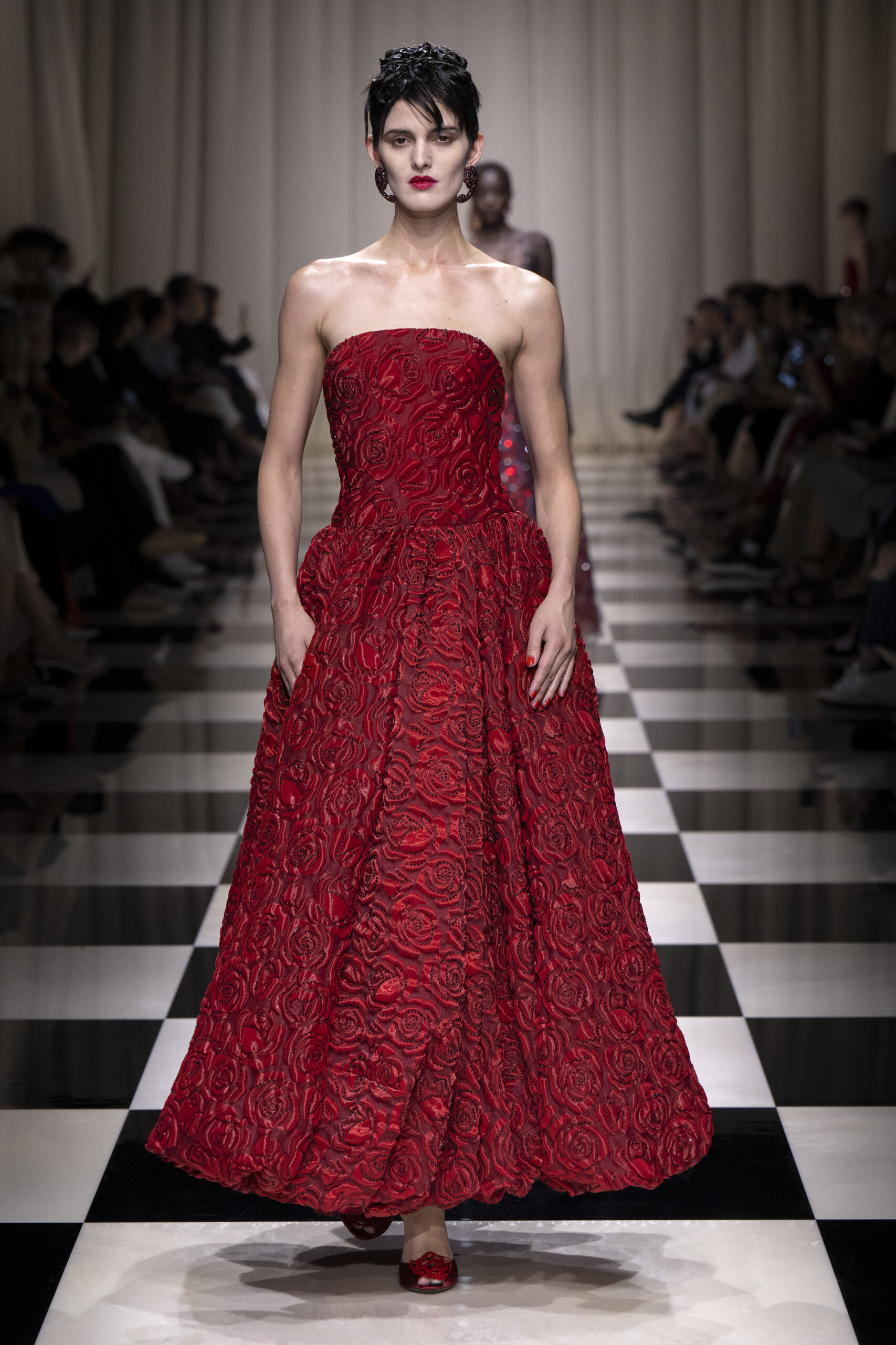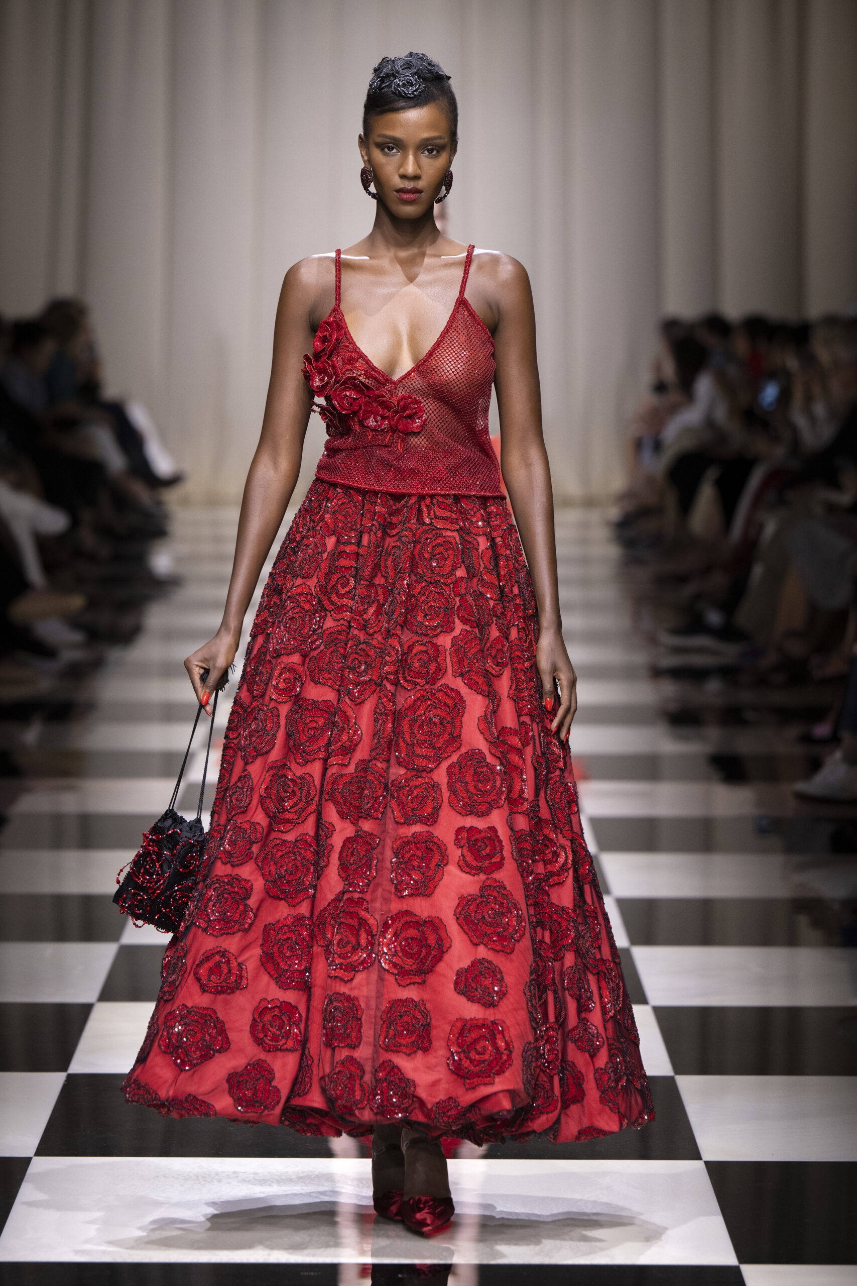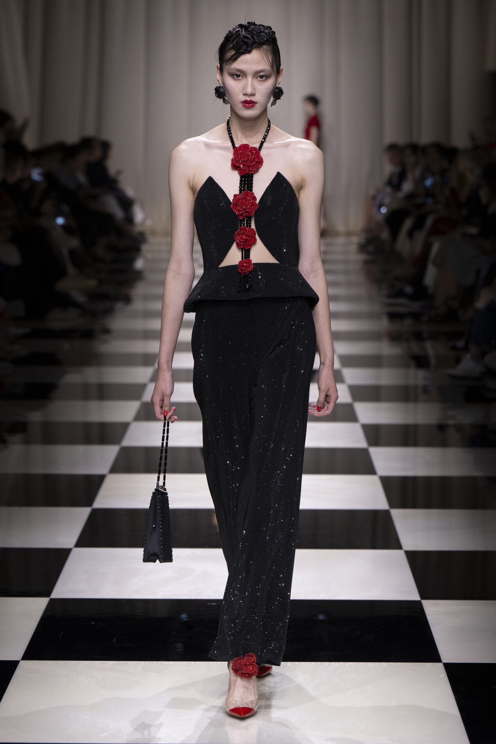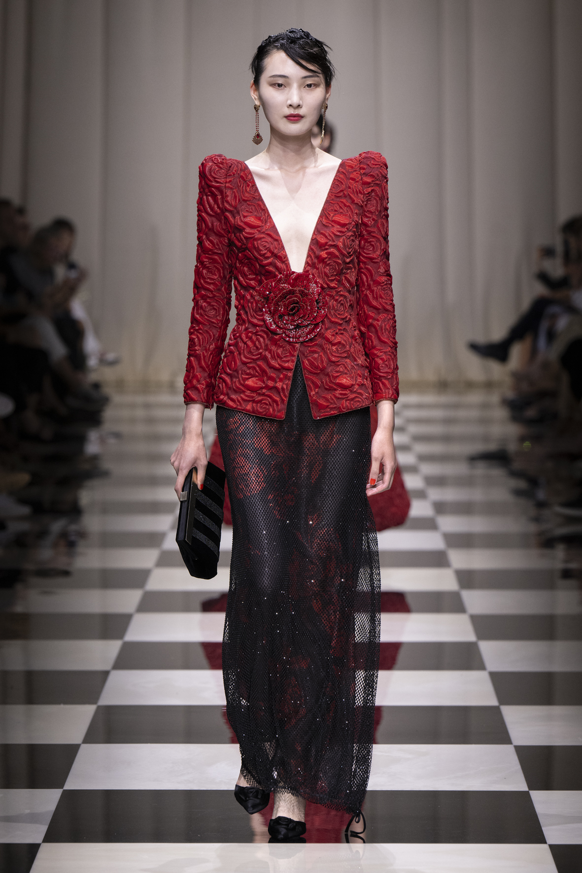 Une charnelle, séduisante et mystérieuse éclosion de roses rouges. Des roses laquées, brillantes, embossées d’un motif graphique noir aux accents dorés brillants. Un voyage de l’occident à l’orient à travers des silhouettes allongées, pour une collection revisitant, sans cliché romantique, la fleur la plus emblématique qui soit.