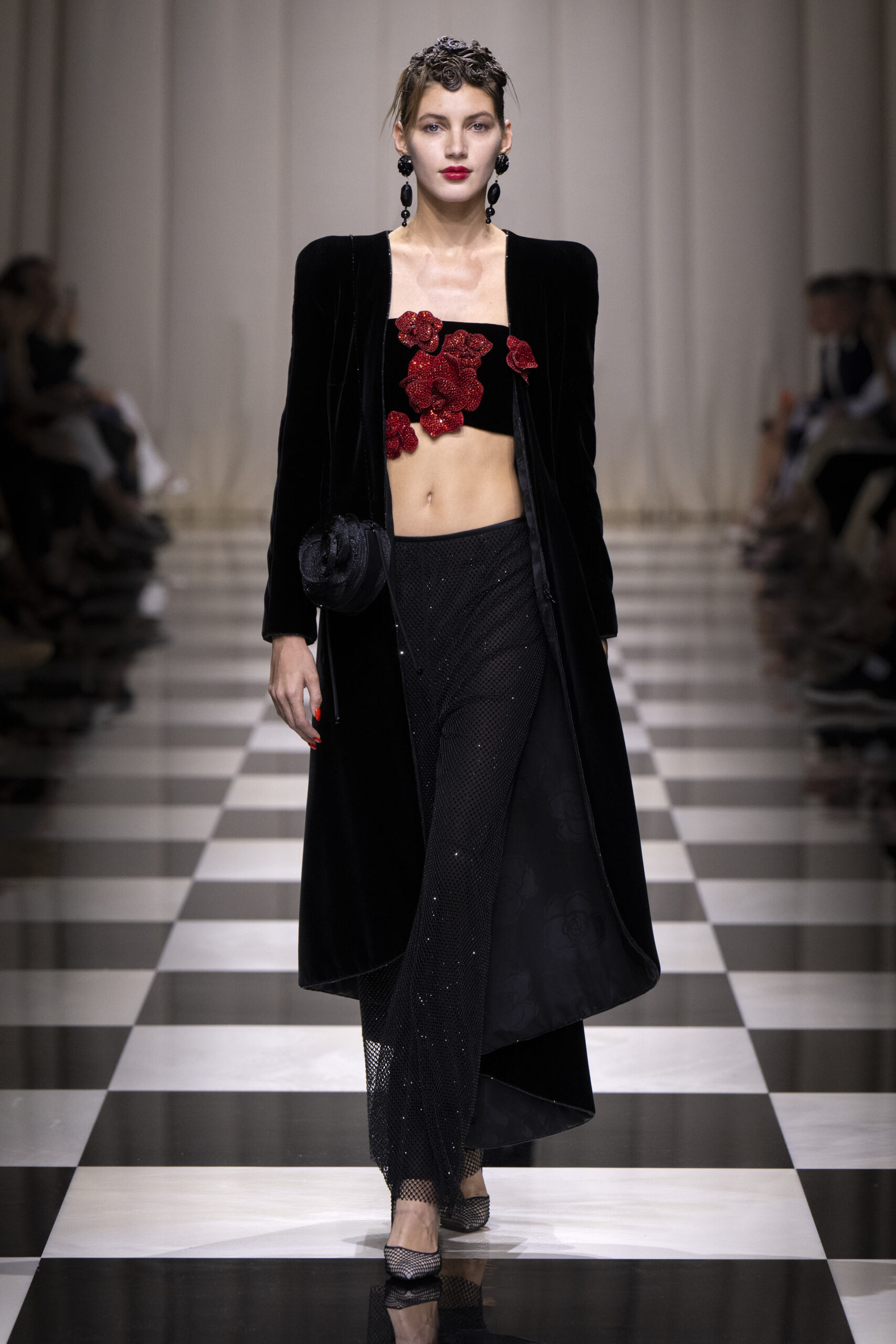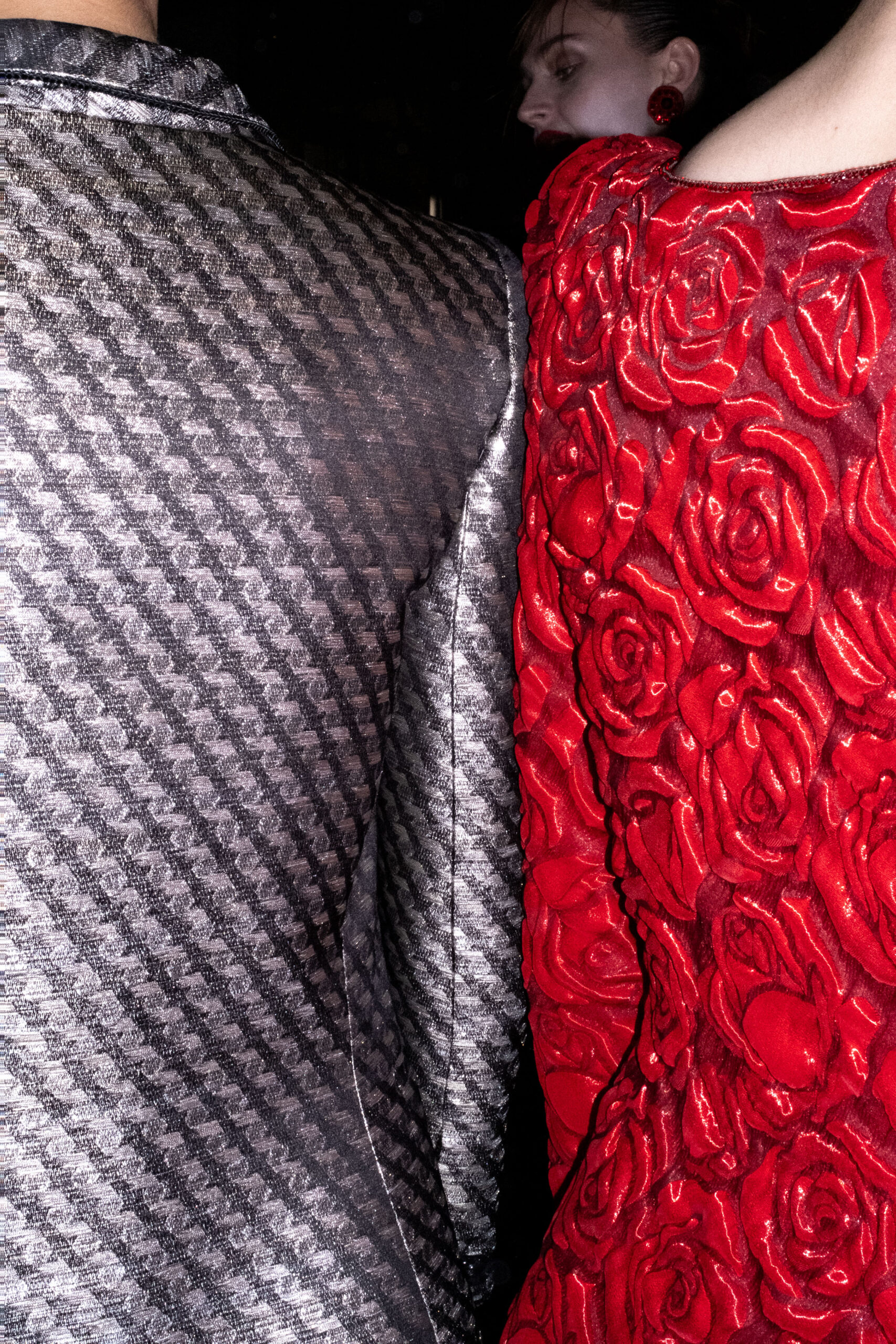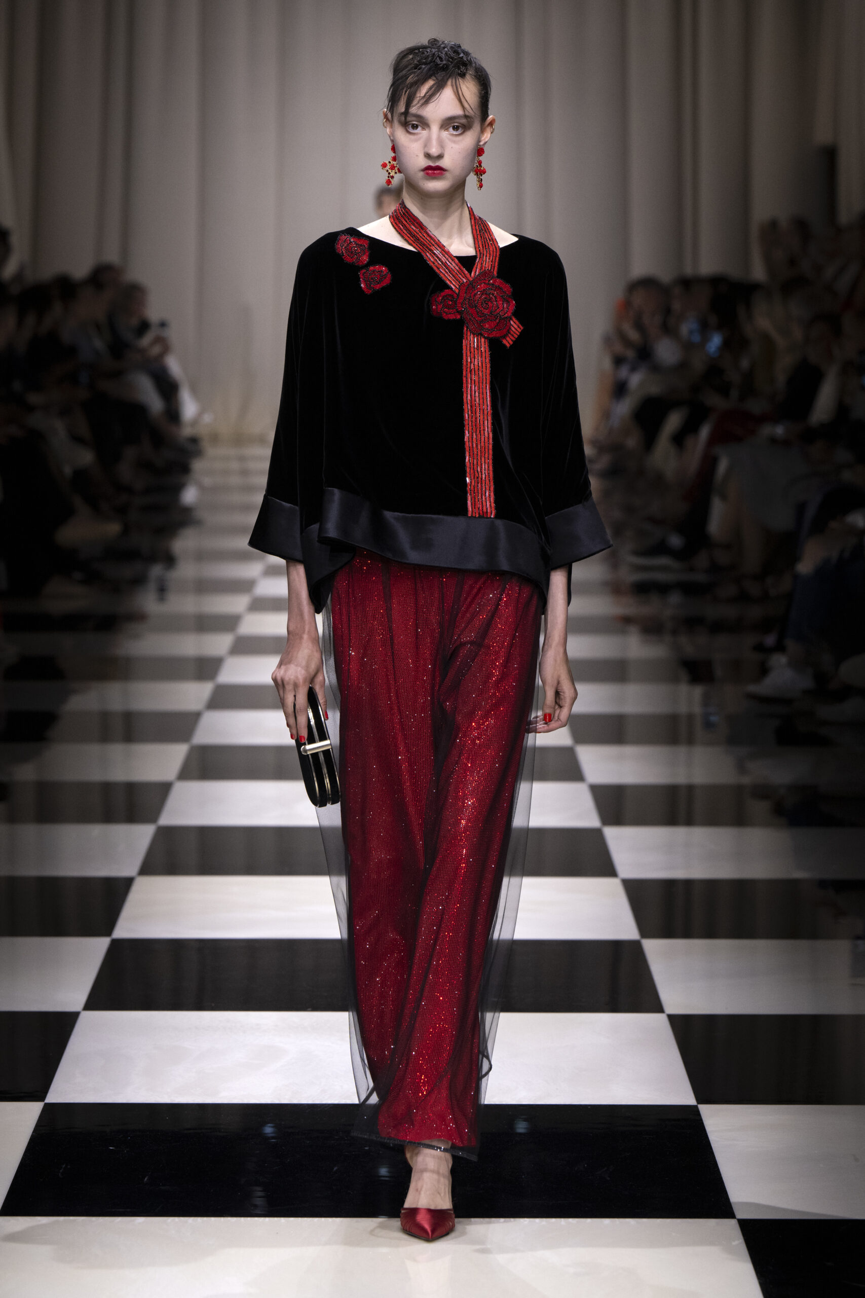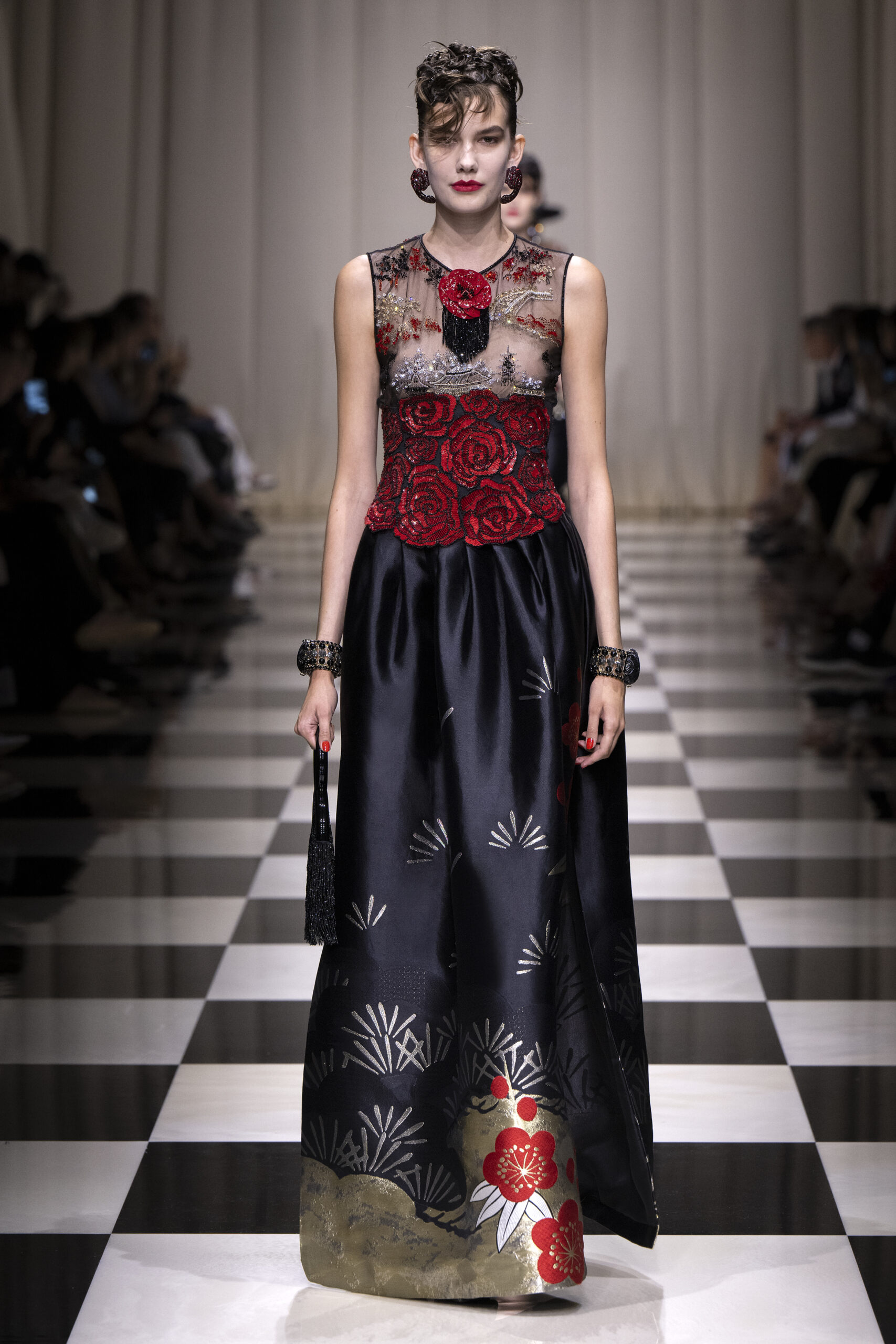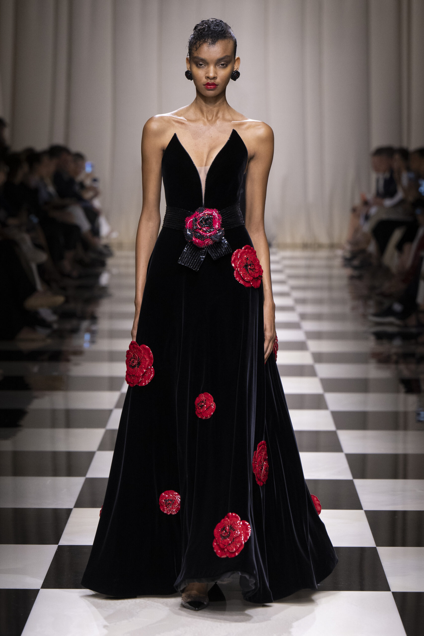 Une charnelle, séduisante et mystérieuse éclosion de roses rouges. Des roses laquées, brillantes, embossées d’un motif graphique noir aux accents dorés brillants. Un voyage de l’occident à l’orient à travers des silhouettes allongées, pour une collection revisitant, sans cliché romantique, la fleur la plus emblématique qui soit.