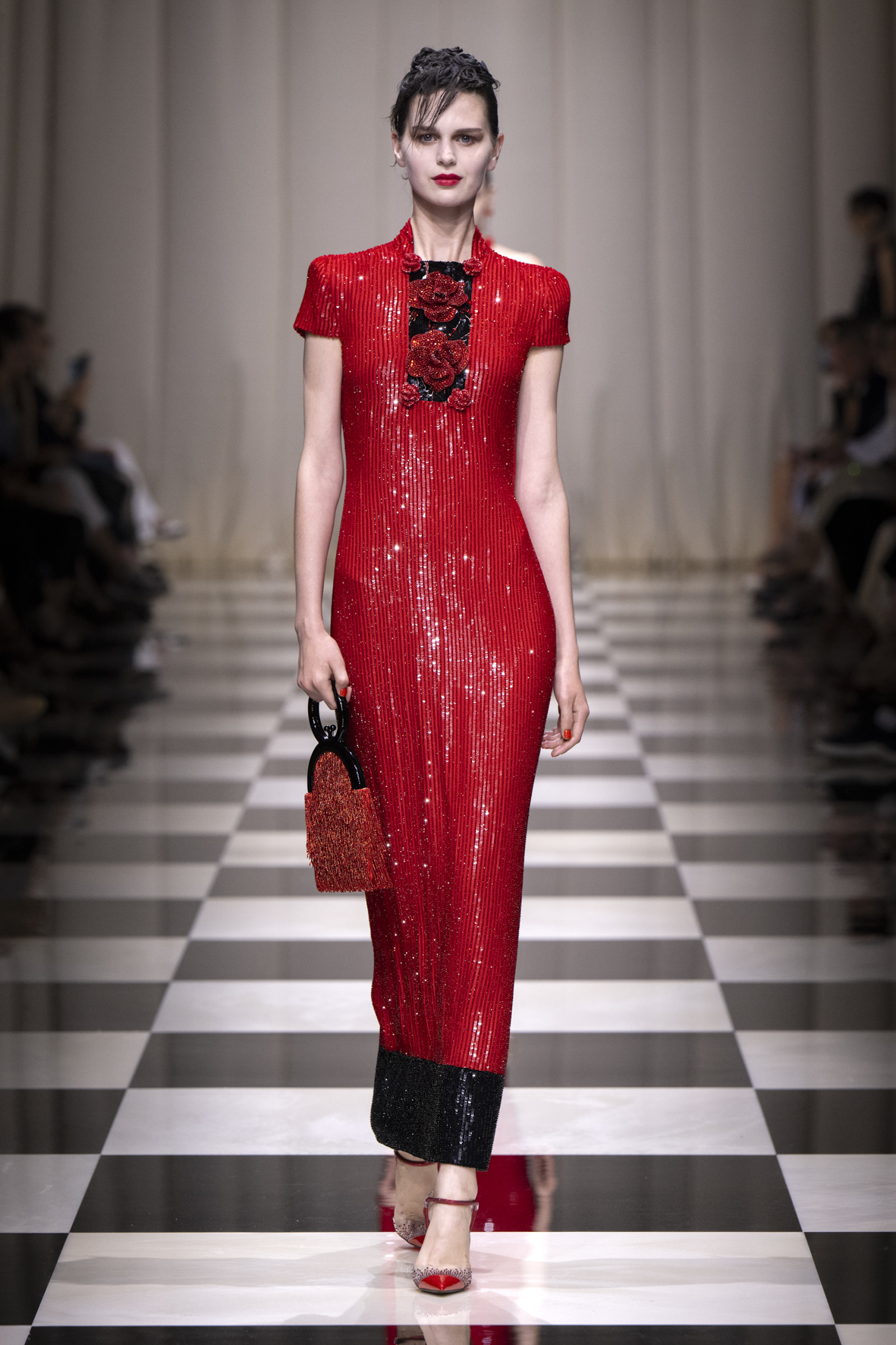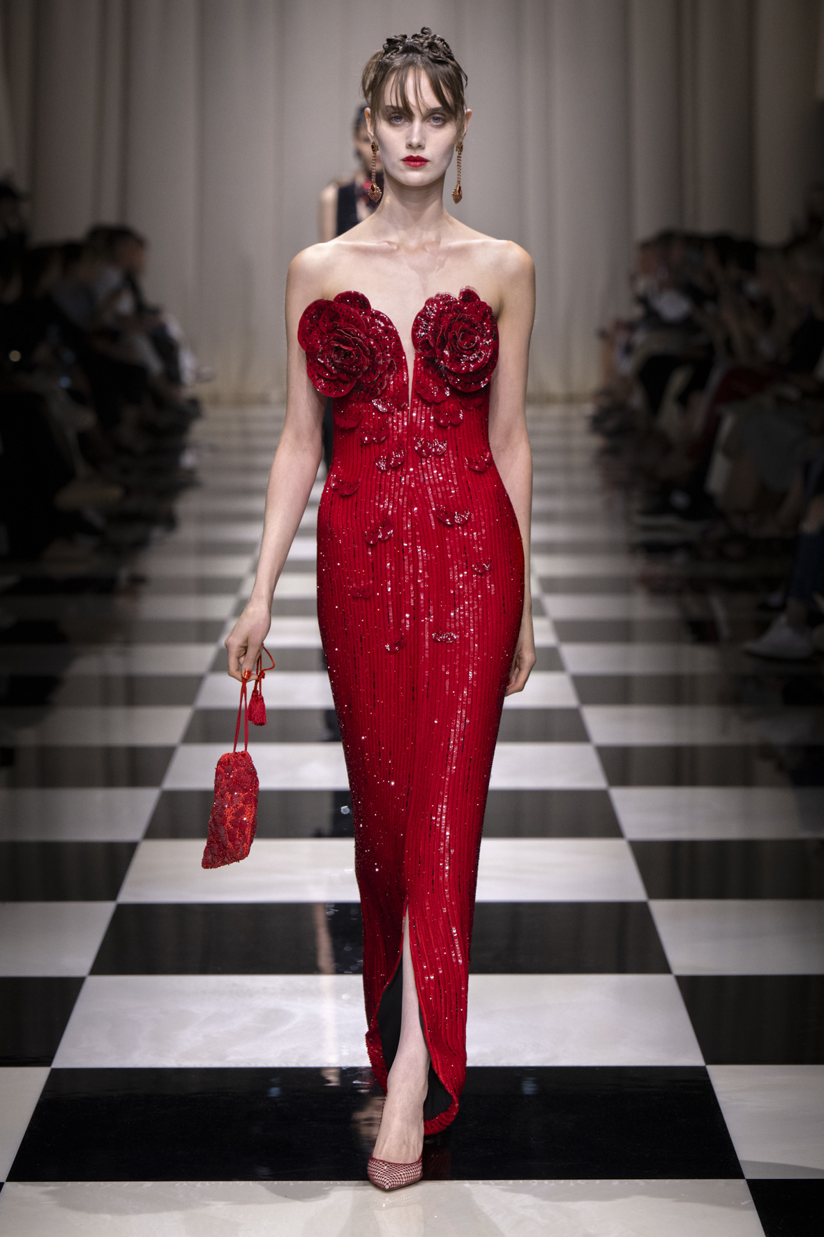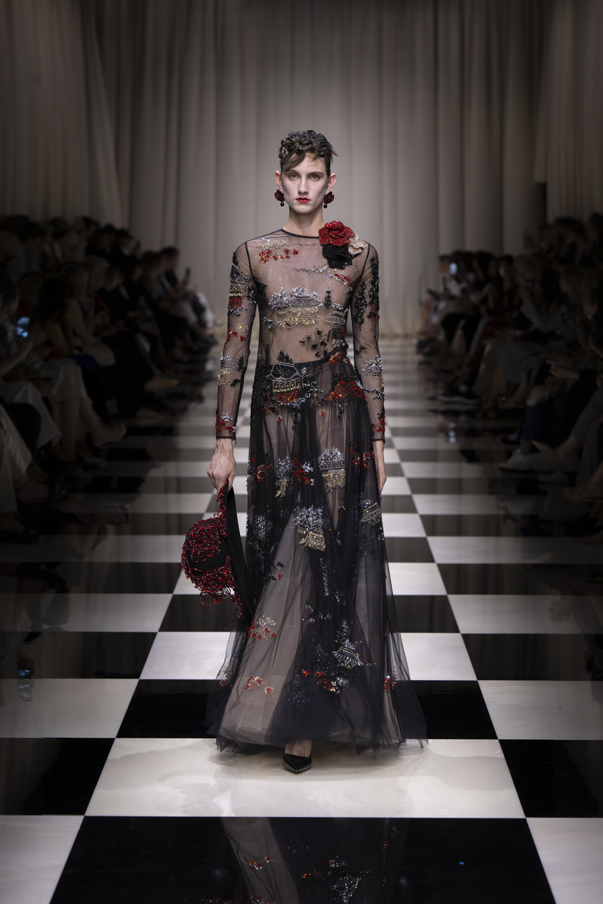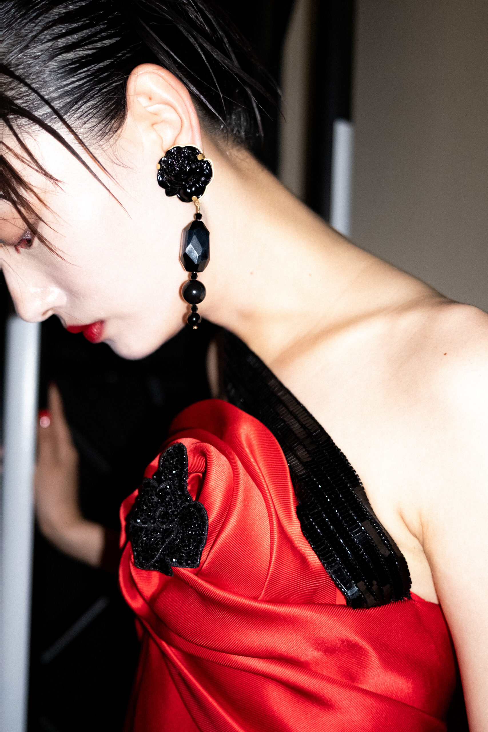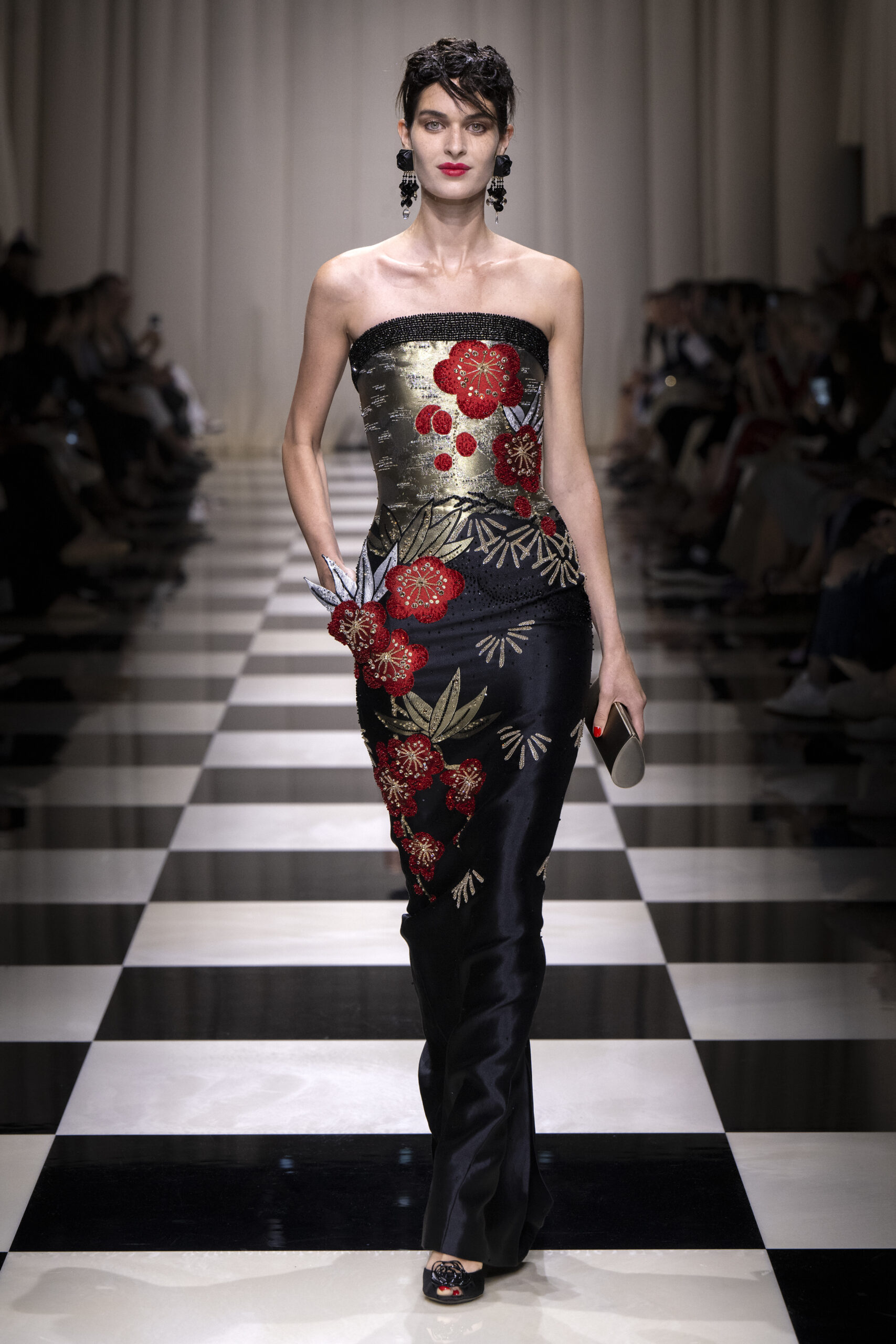 Une charnelle, séduisante et mystérieuse éclosion de roses rouges. Des roses laquées, brillantes, embossées d’un motif graphique noir aux accents dorés brillants. Un voyage de l’occident à l’orient à travers des silhouettes allongées, pour une collection revisitant, sans cliché romantique, la fleur la plus emblématique qui soit.