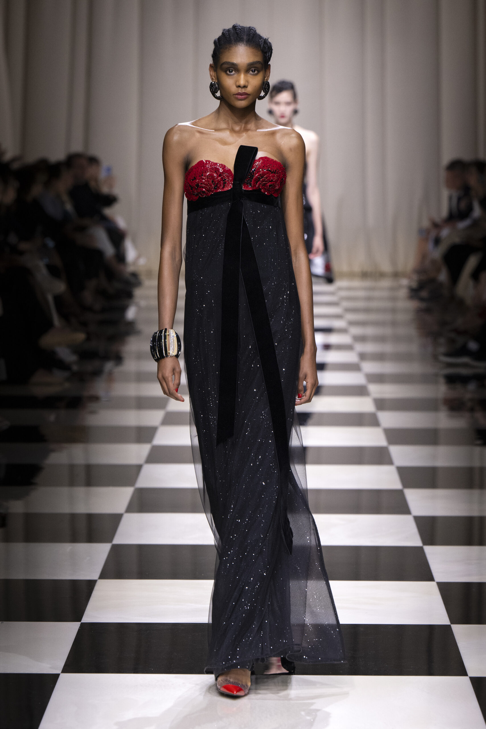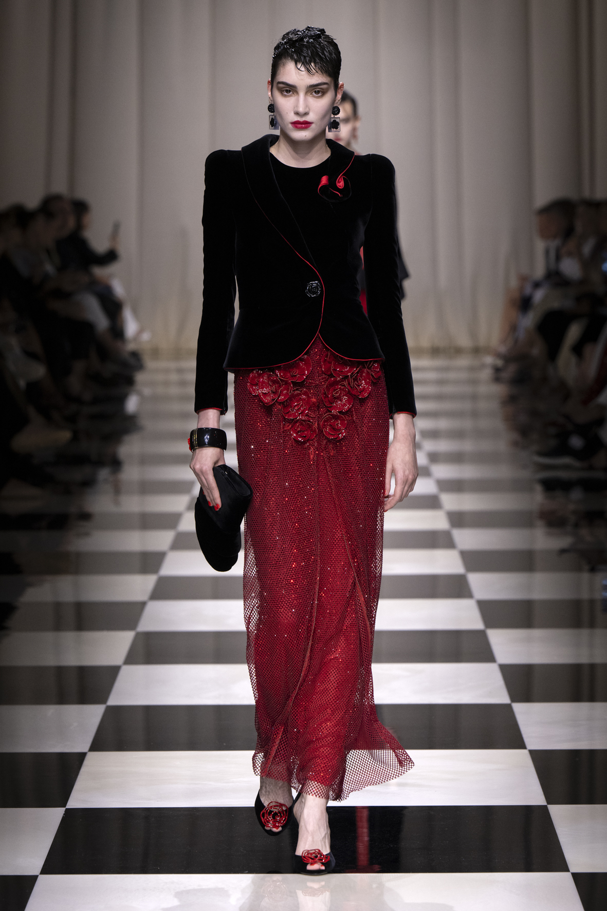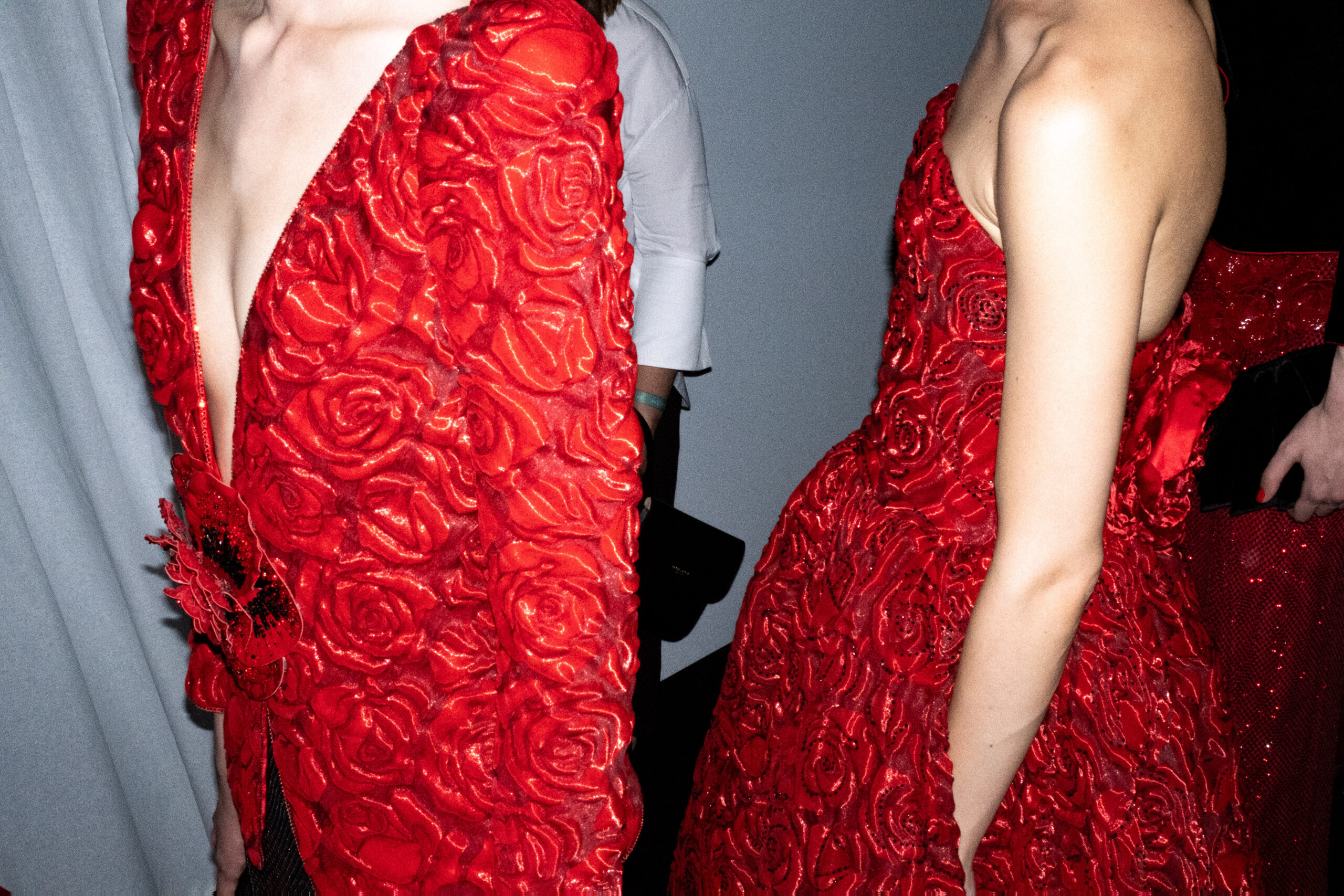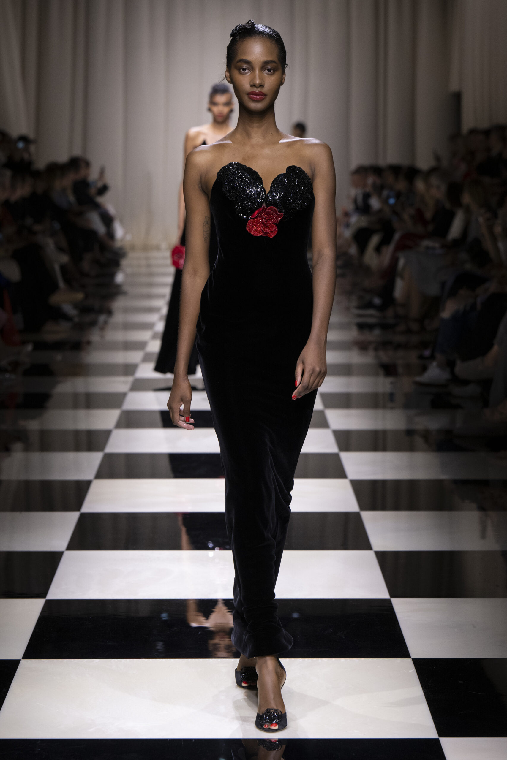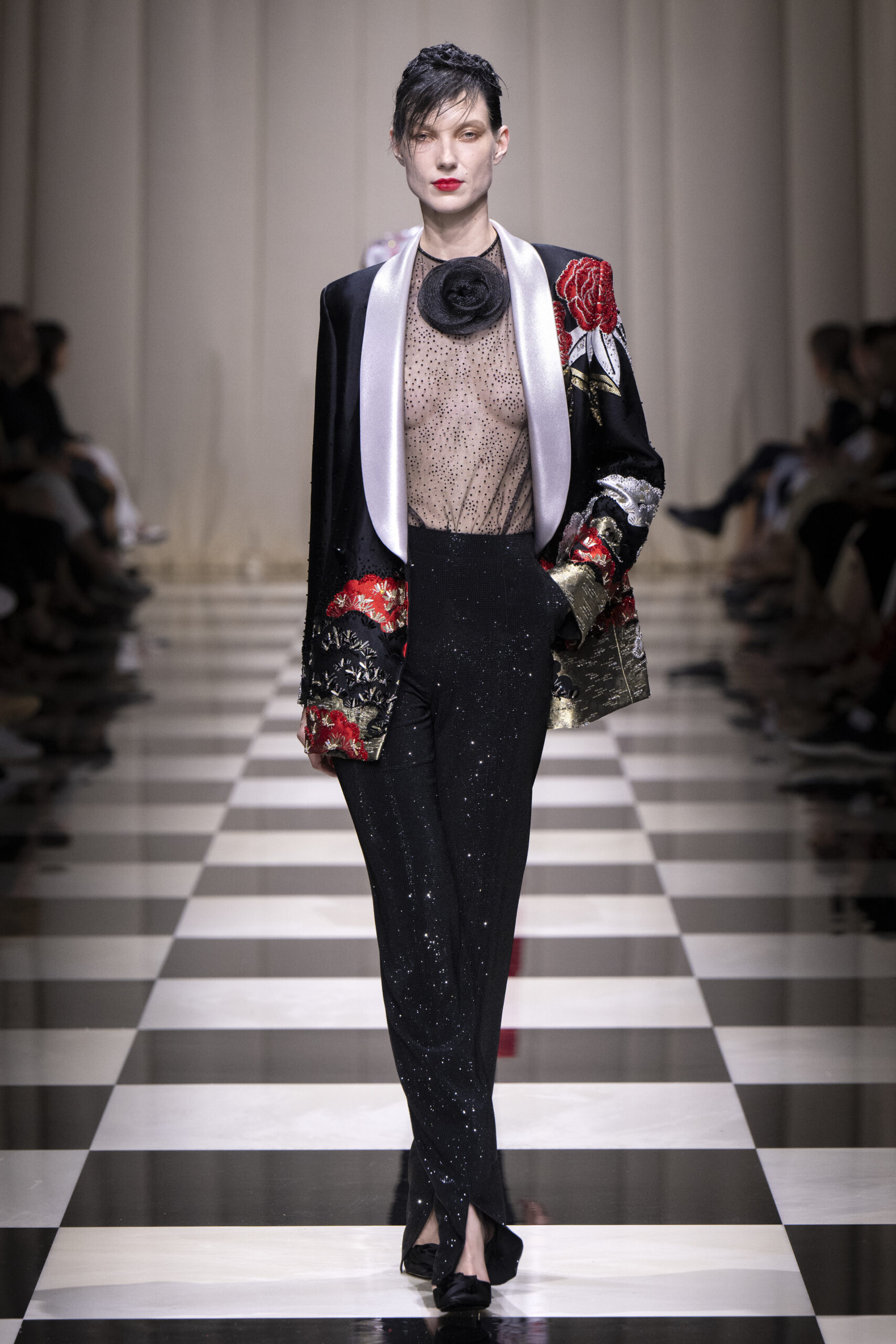 Une charnelle, séduisante et mystérieuse éclosion de roses rouges. Des roses laquées, brillantes, embossées d’un motif graphique noir aux accents dorés brillants. Un voyage de l’occident à l’orient à travers des silhouettes allongées, pour une collection revisitant, sans cliché romantique, la fleur la plus emblématique qui soit.