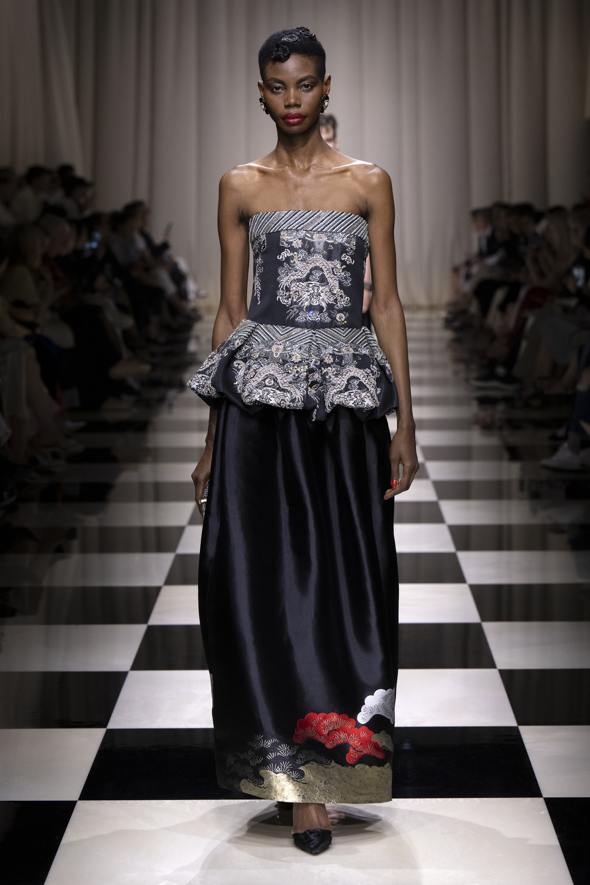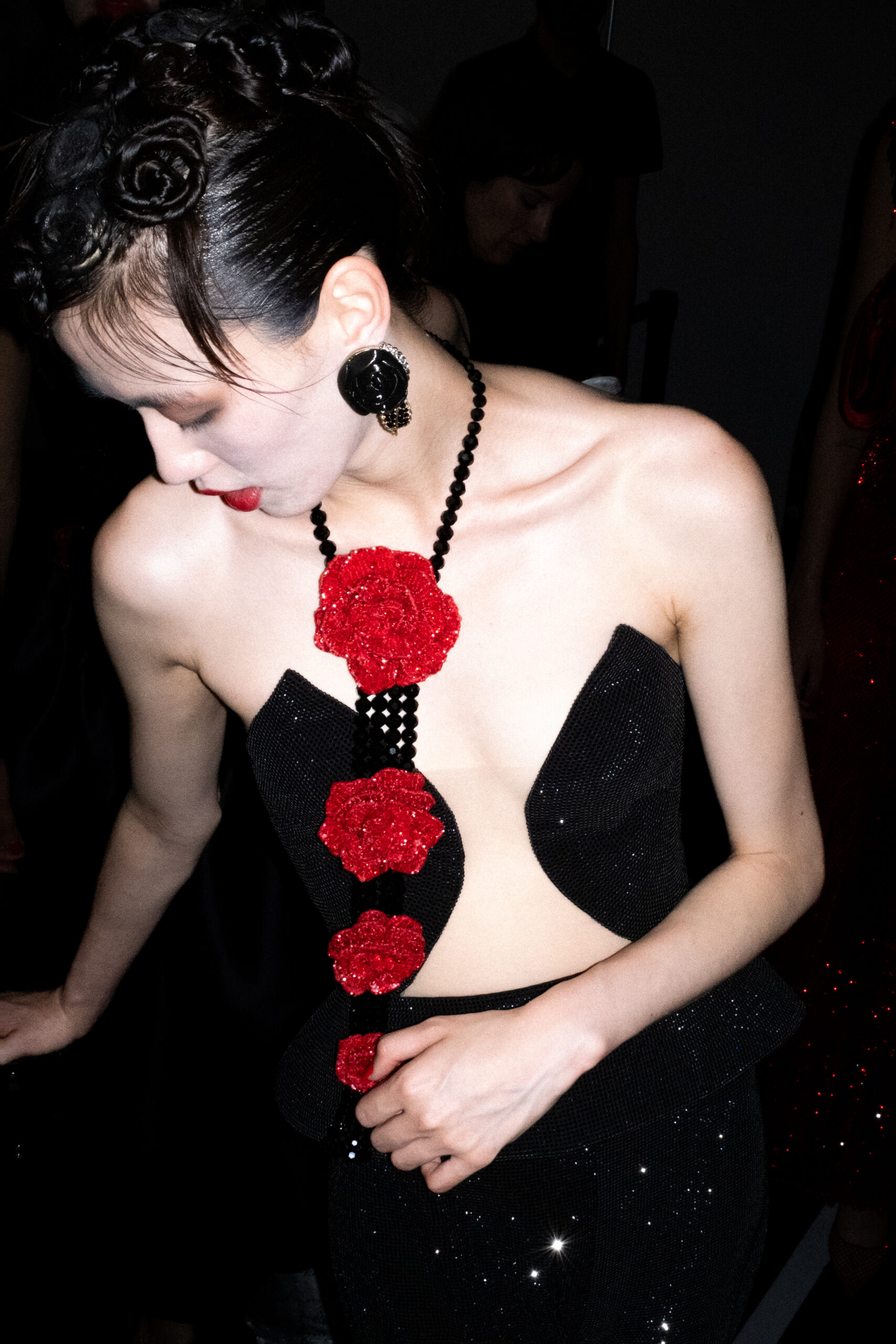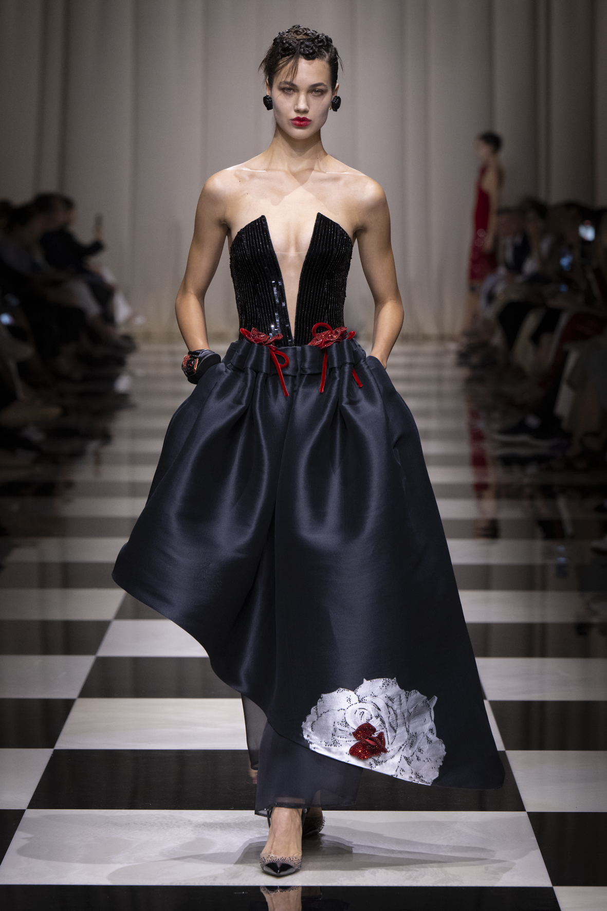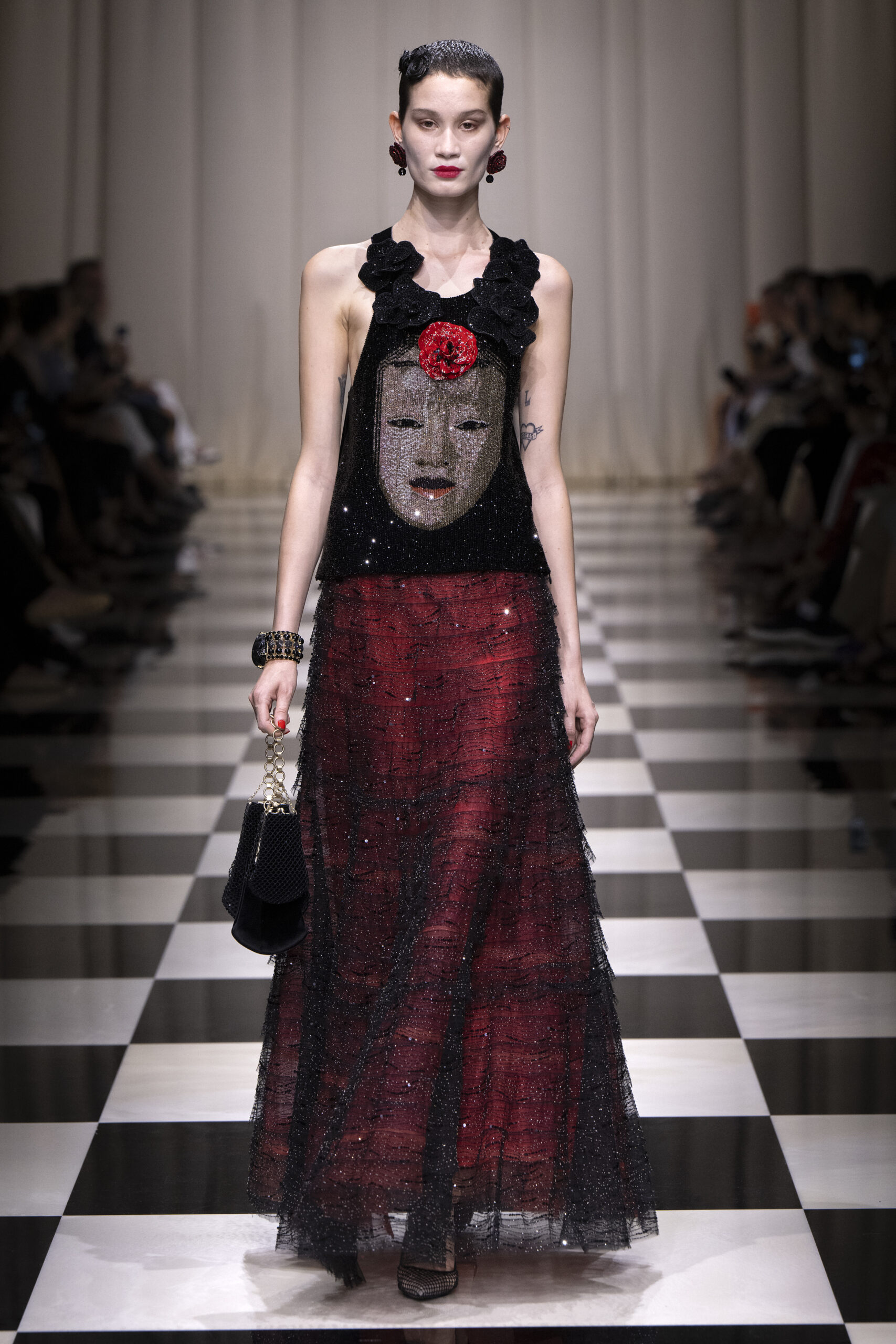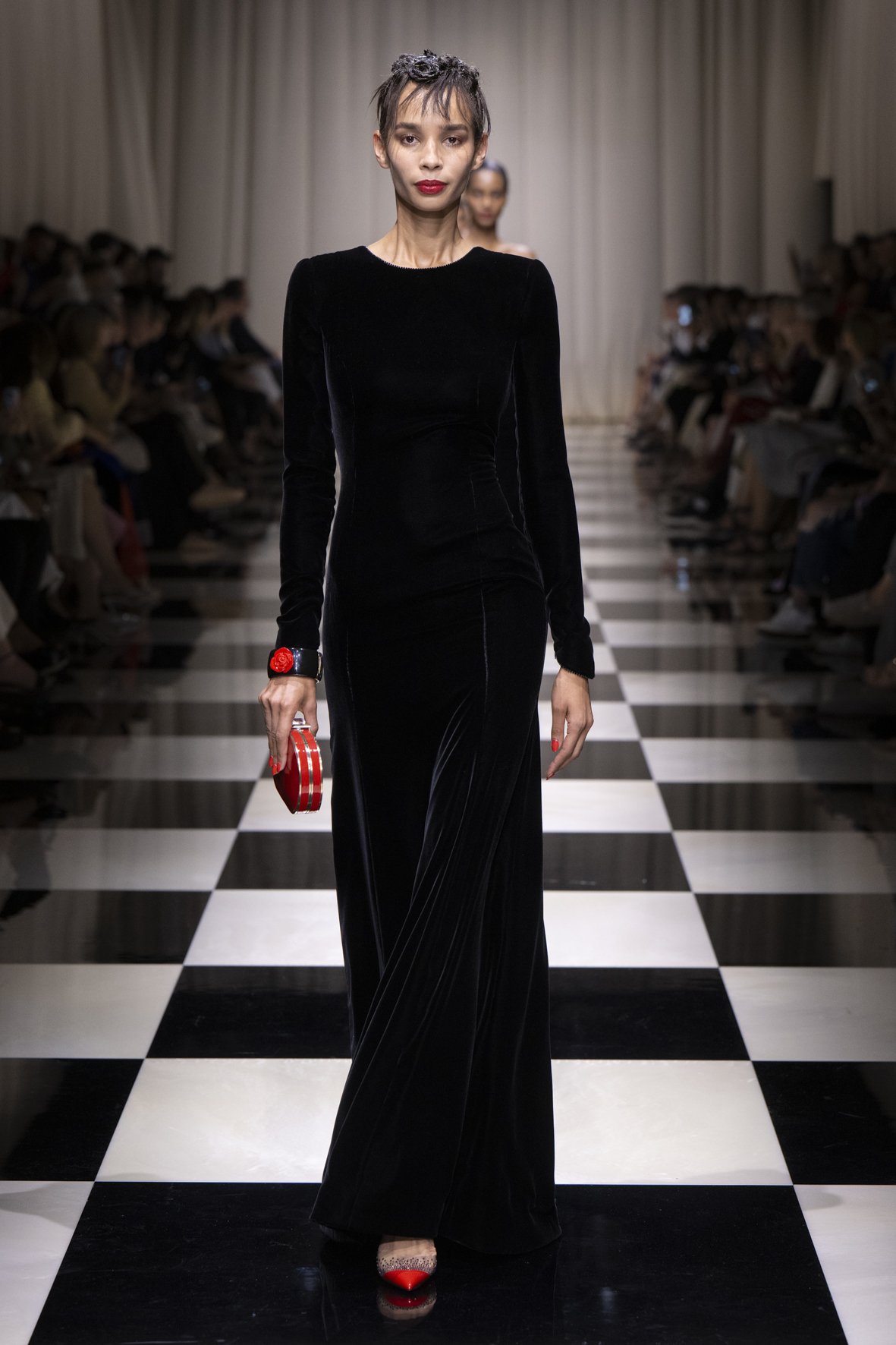 Une charnelle, séduisante et mystérieuse éclosion de roses rouges. Des roses laquées, brillantes, embossées d’un motif graphique noir aux accents dorés brillants. Un voyage de l’occident à l’orient à travers des silhouettes allongées, pour une collection revisitant, sans cliché romantique, la fleur la plus emblématique qui soit.