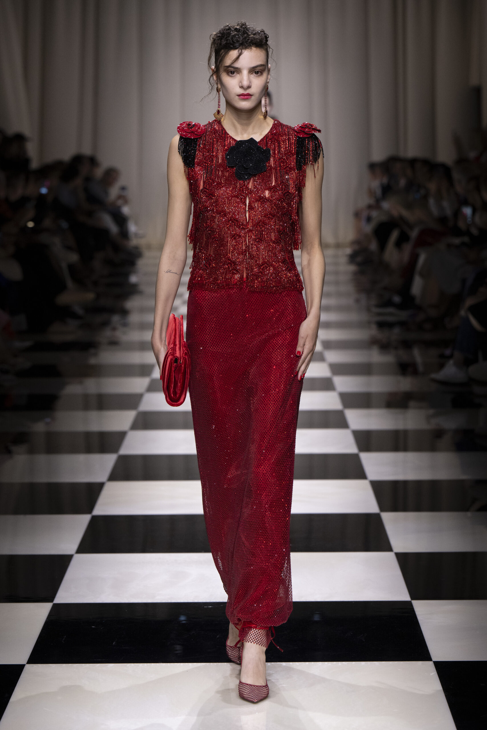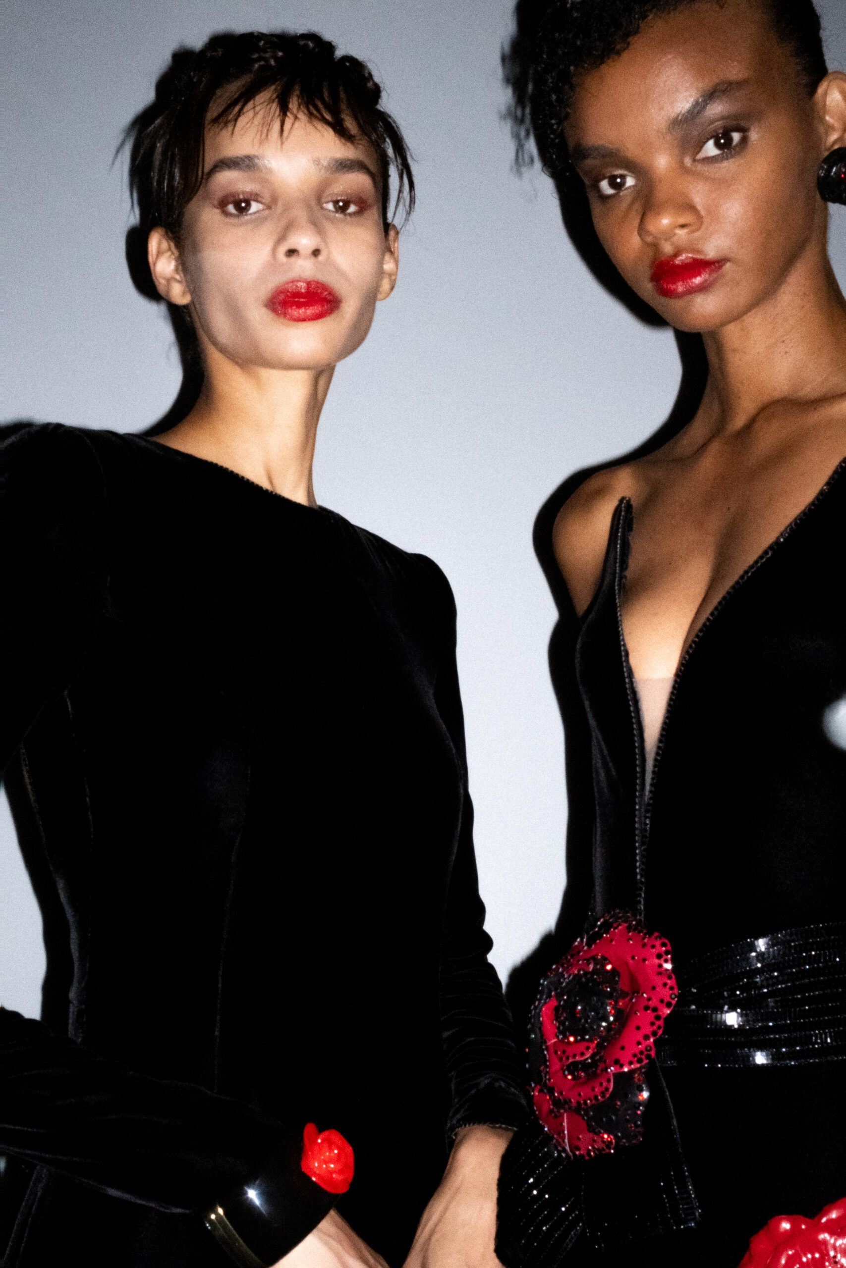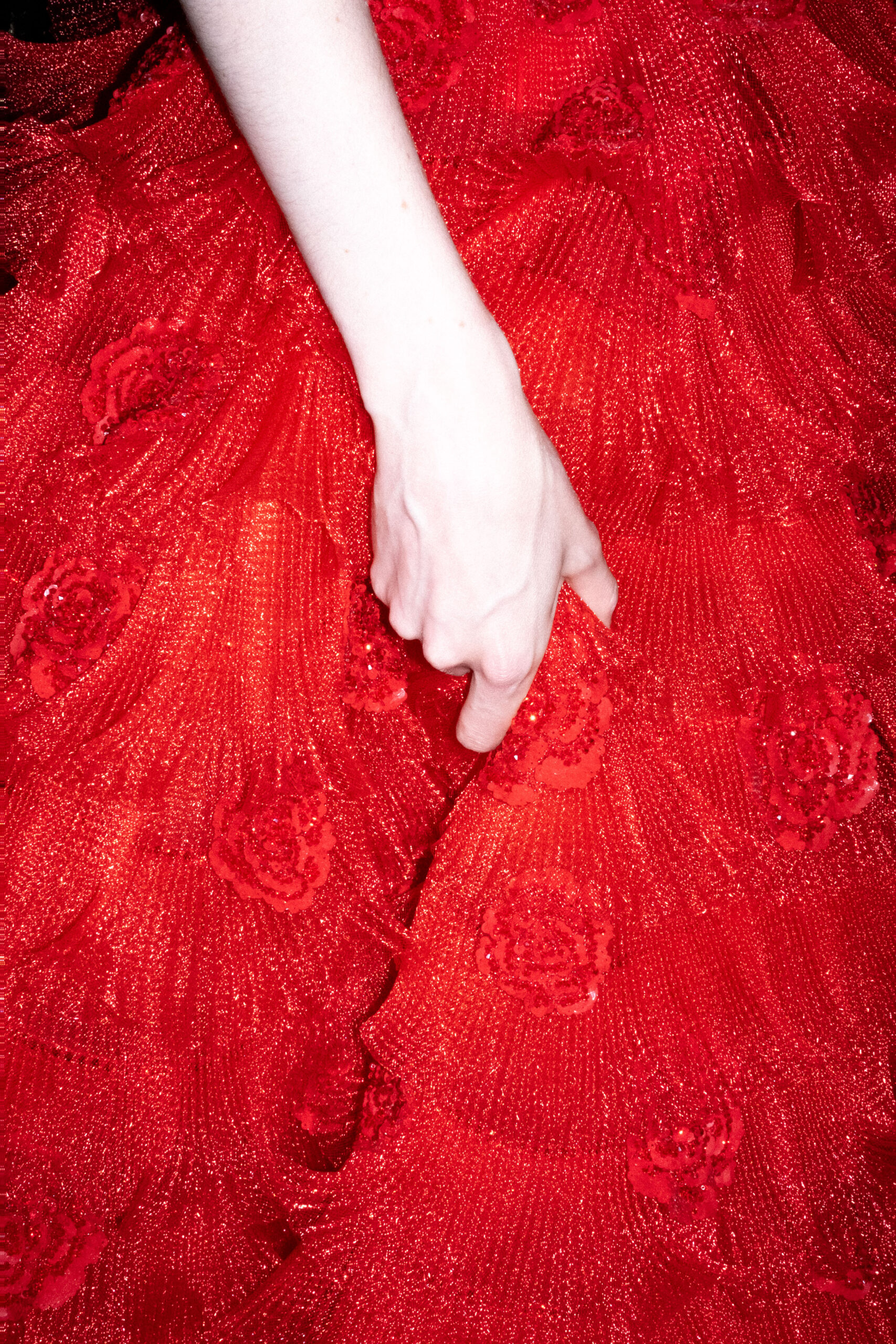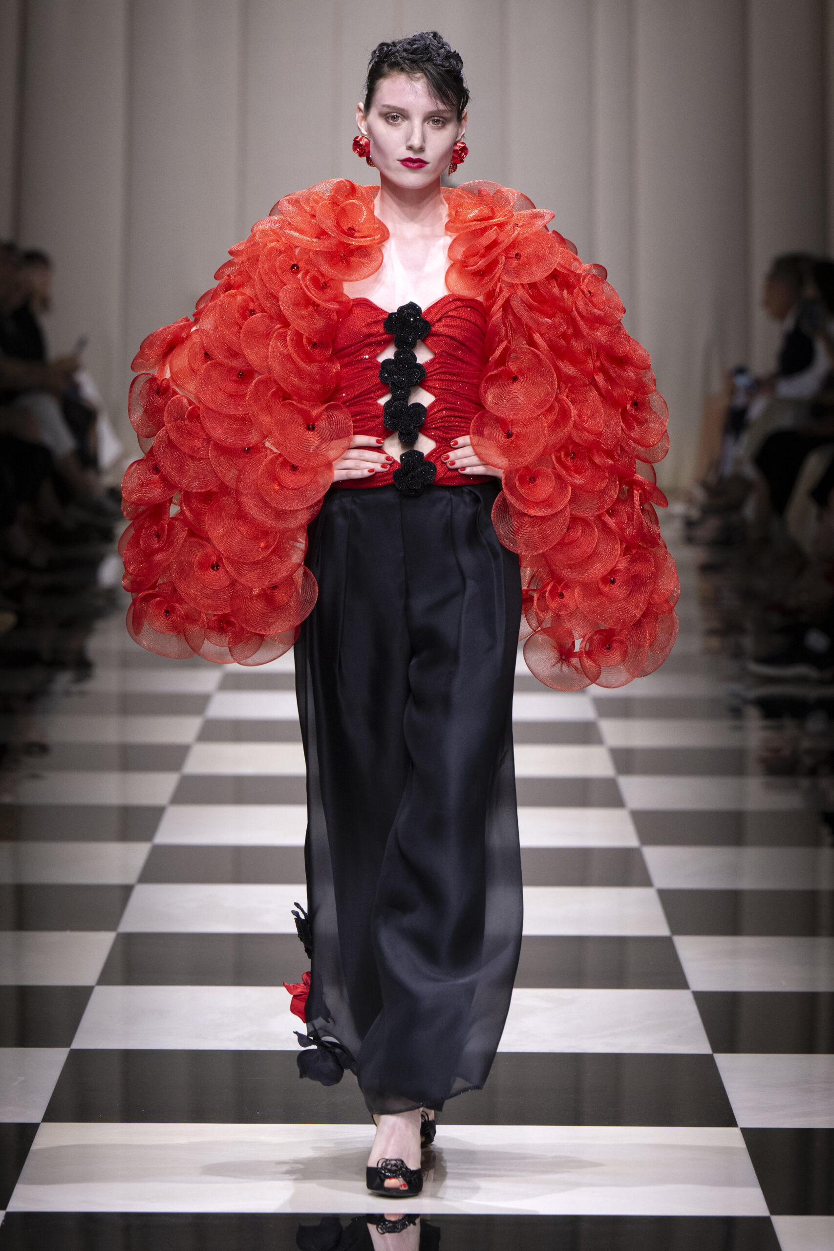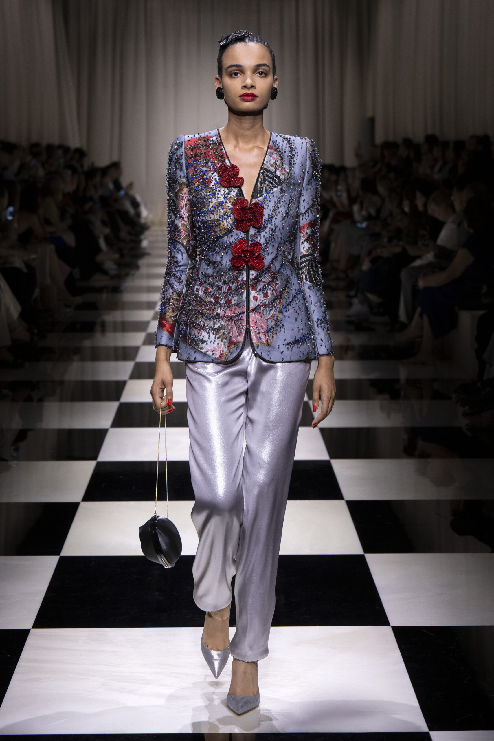 Une charnelle, séduisante et mystérieuse éclosion de roses rouges. Des roses laquées, brillantes, embossées d’un motif graphique noir aux accents dorés brillants. Un voyage de l’occident à l’orient à travers des silhouettes allongées, pour une collection revisitant, sans cliché romantique, la fleur la plus emblématique qui soit.