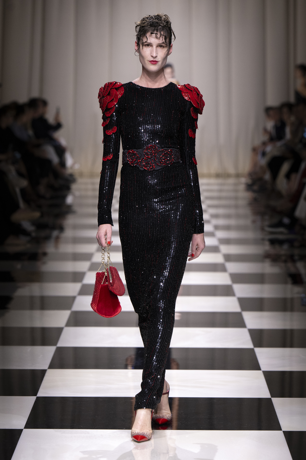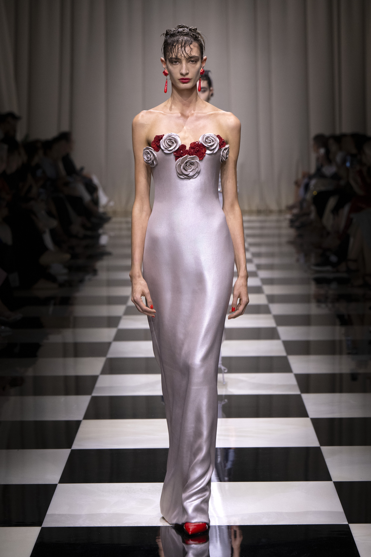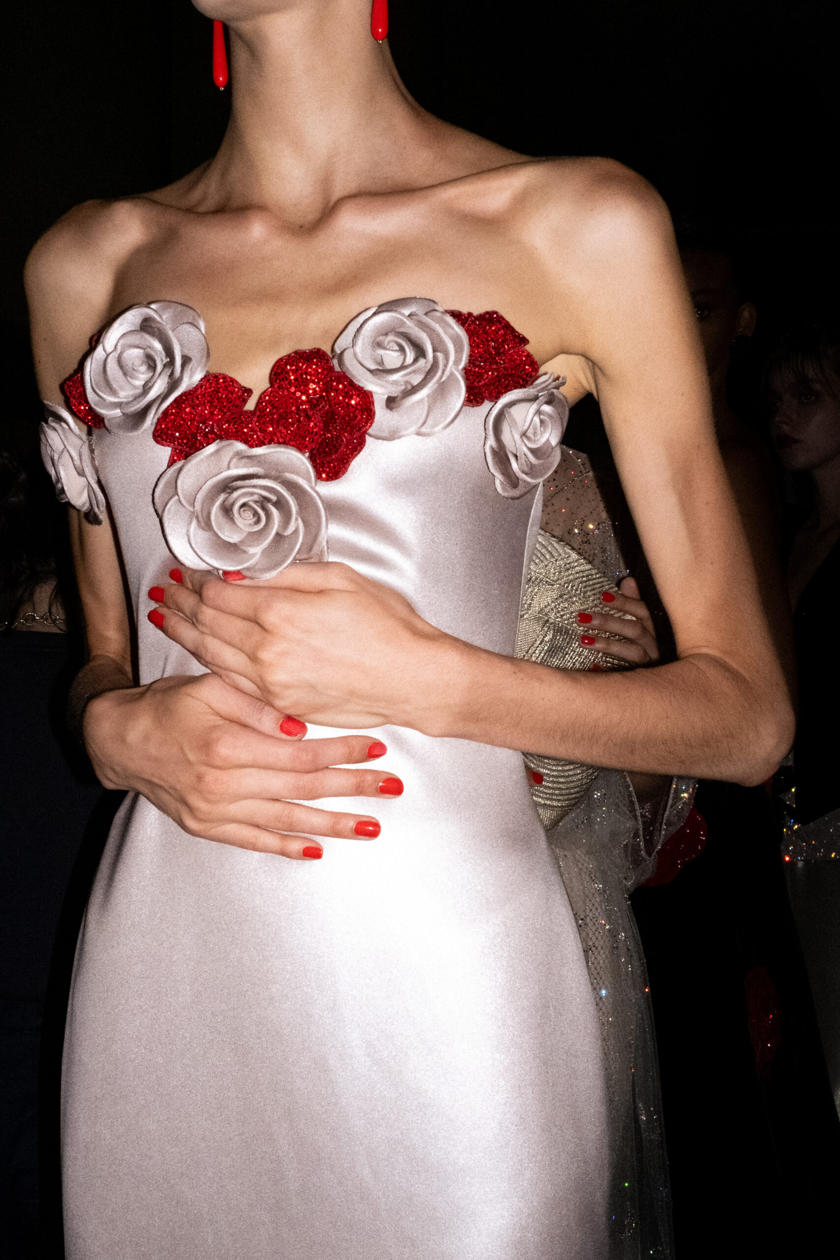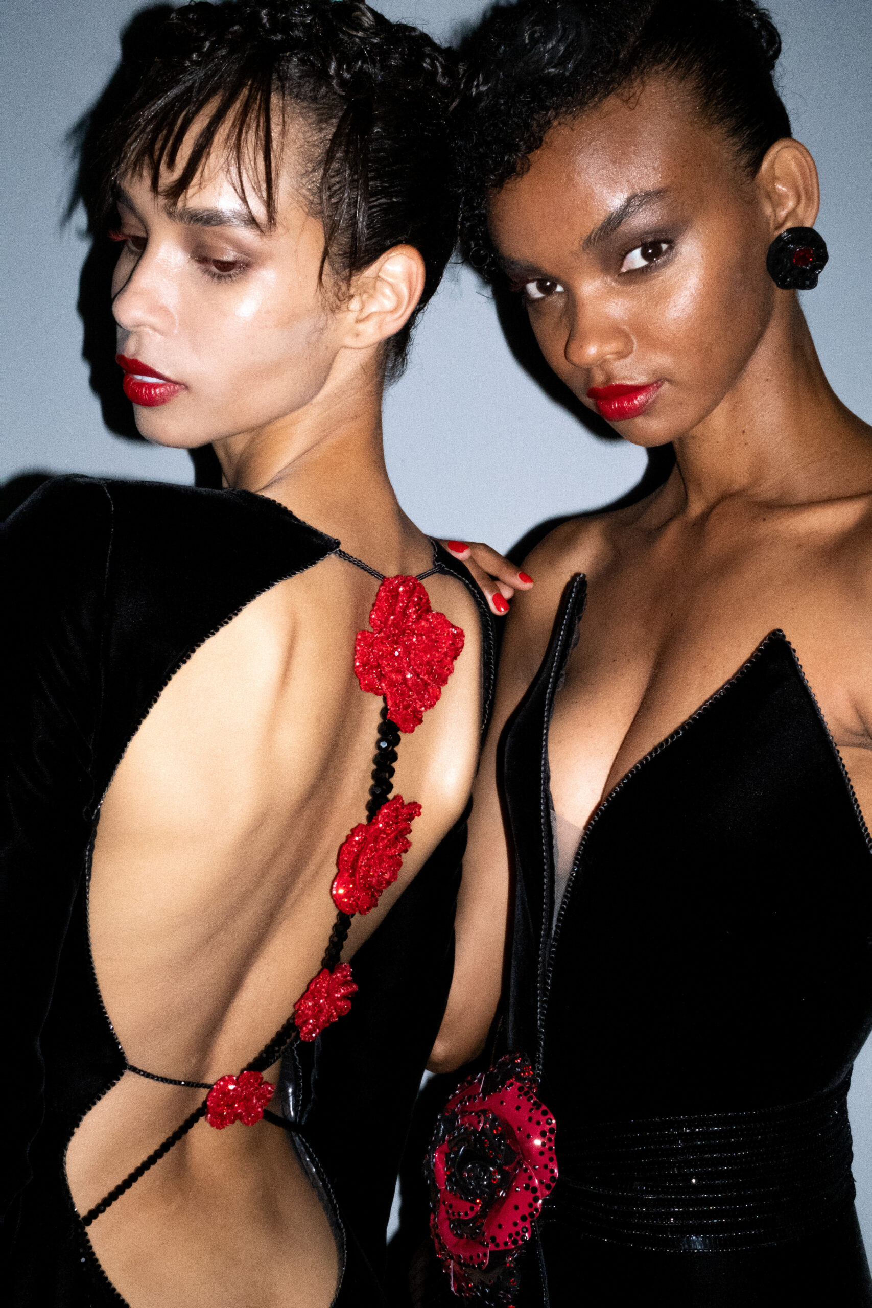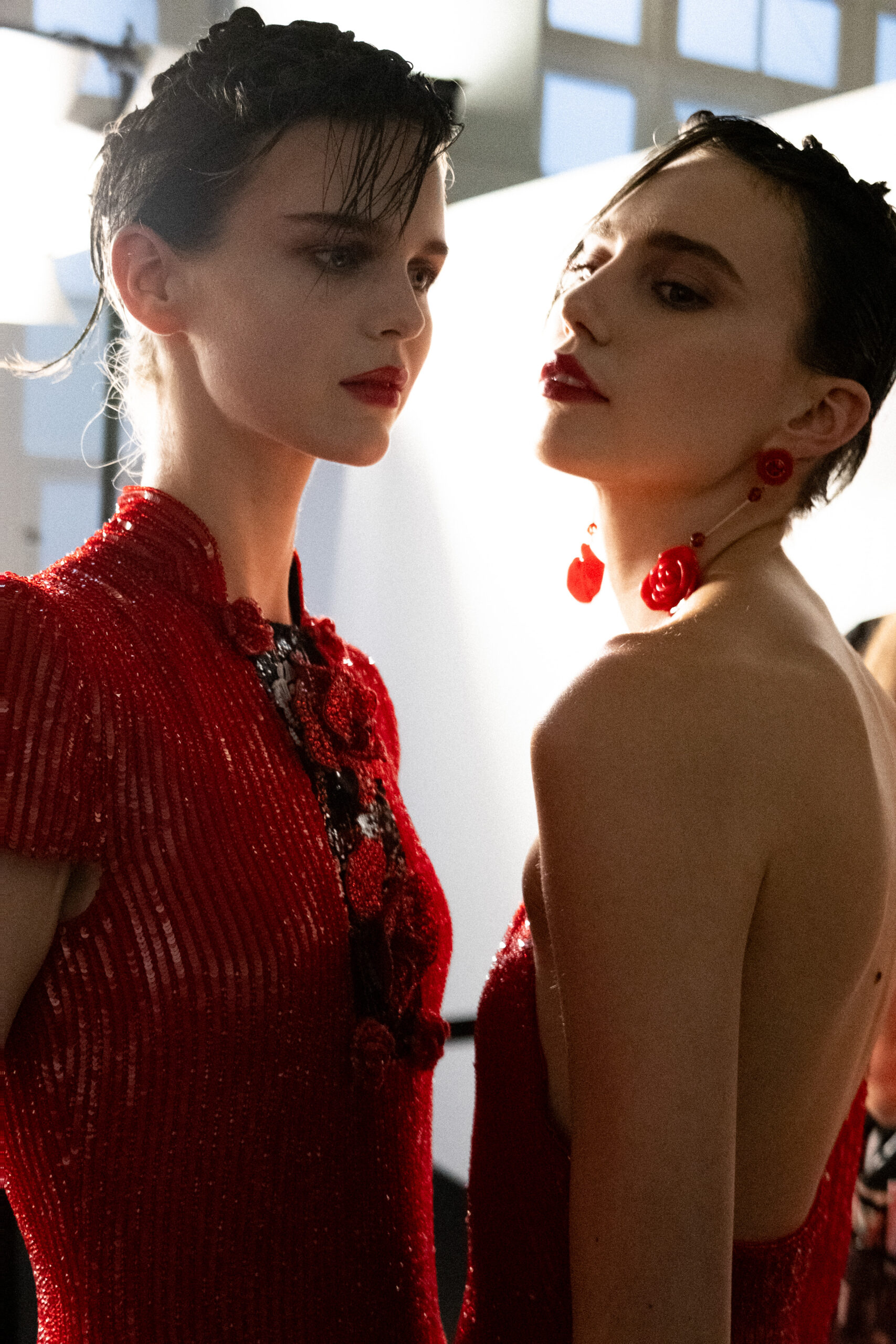 Une charnelle, séduisante et mystérieuse éclosion de roses rouges. Des roses laquées, brillantes, embossées d’un motif graphique noir aux accents dorés brillants. Un voyage de l’occident à l’orient à travers des silhouettes allongées, pour une collection revisitant, sans cliché romantique, la fleur la plus emblématique qui soit.