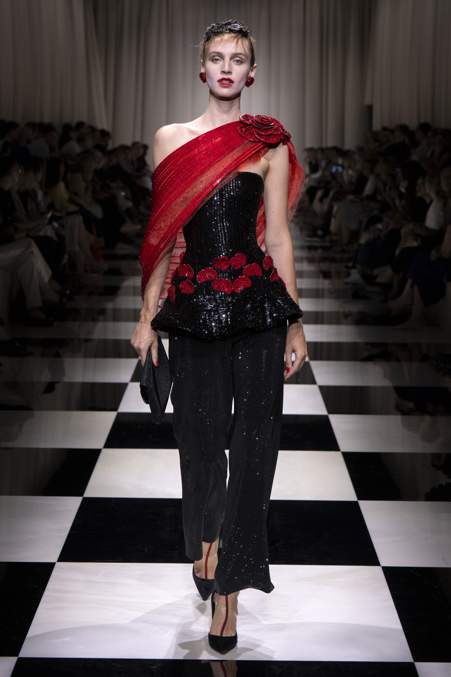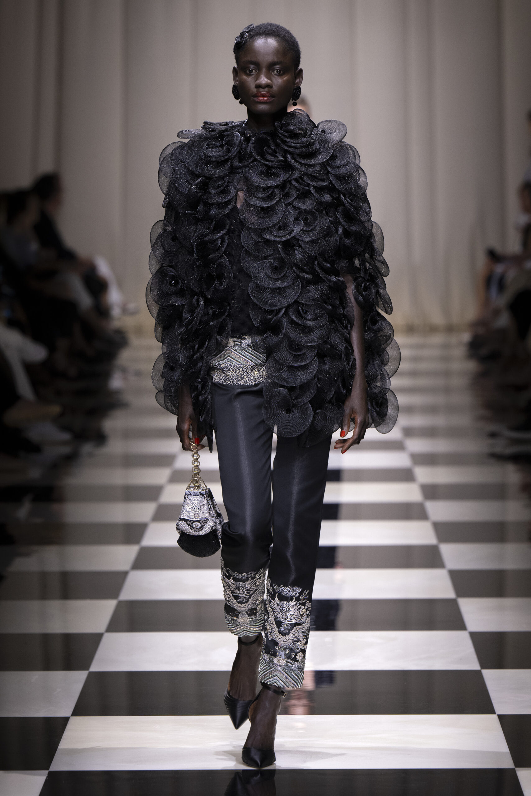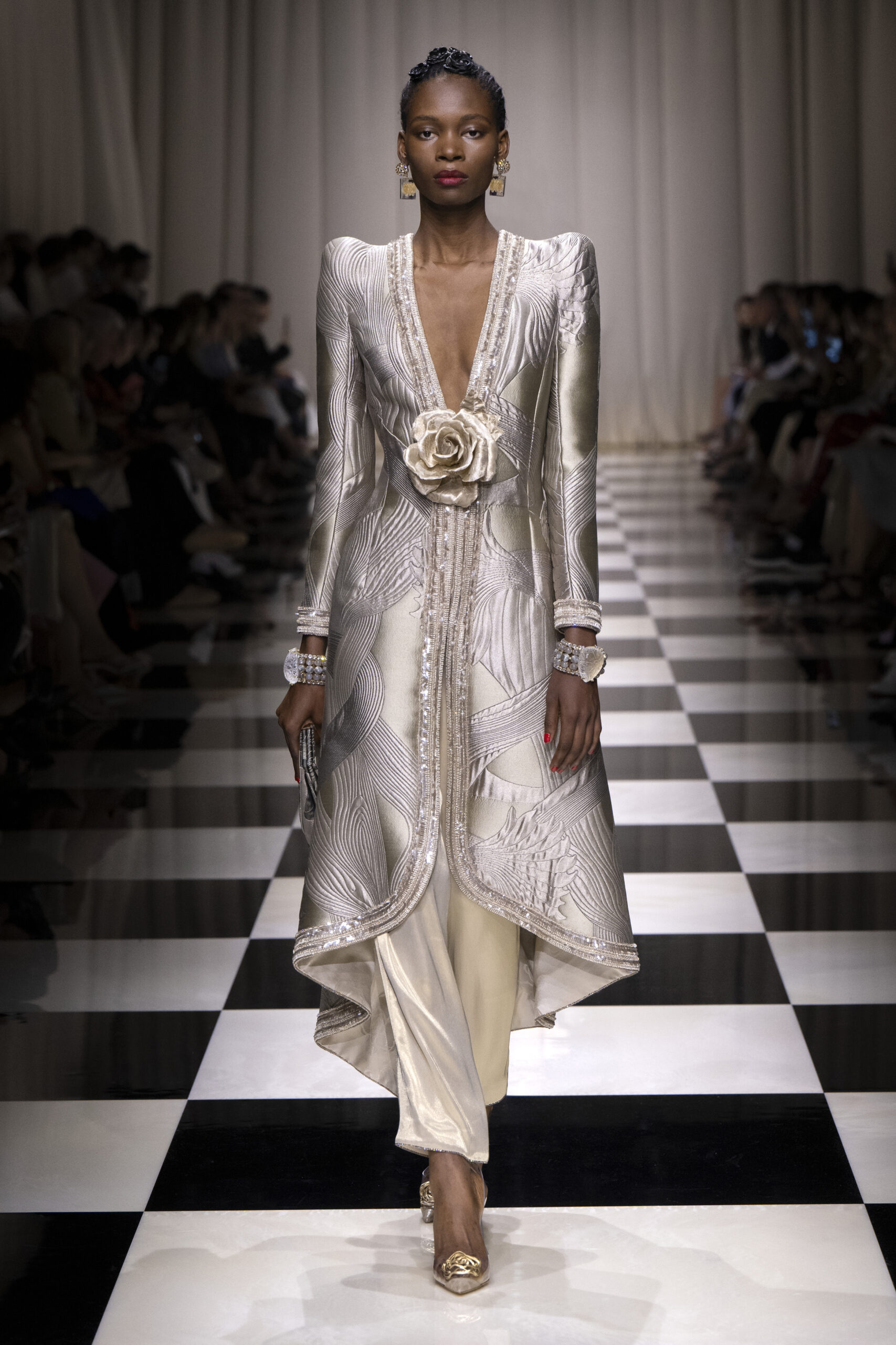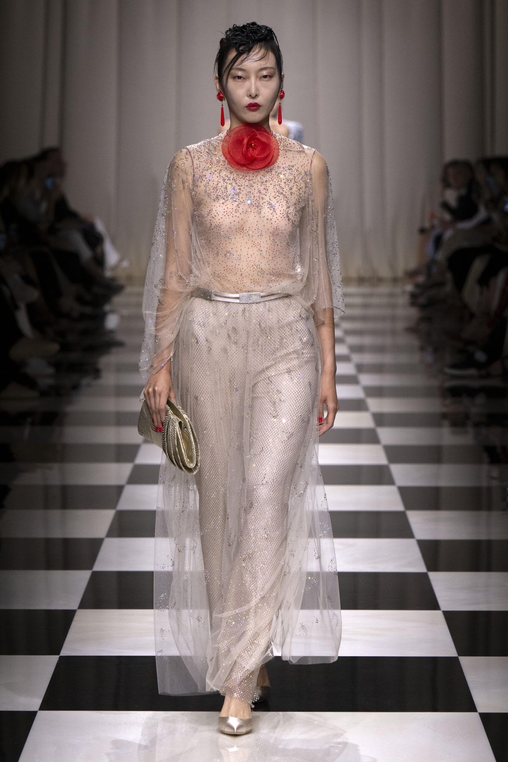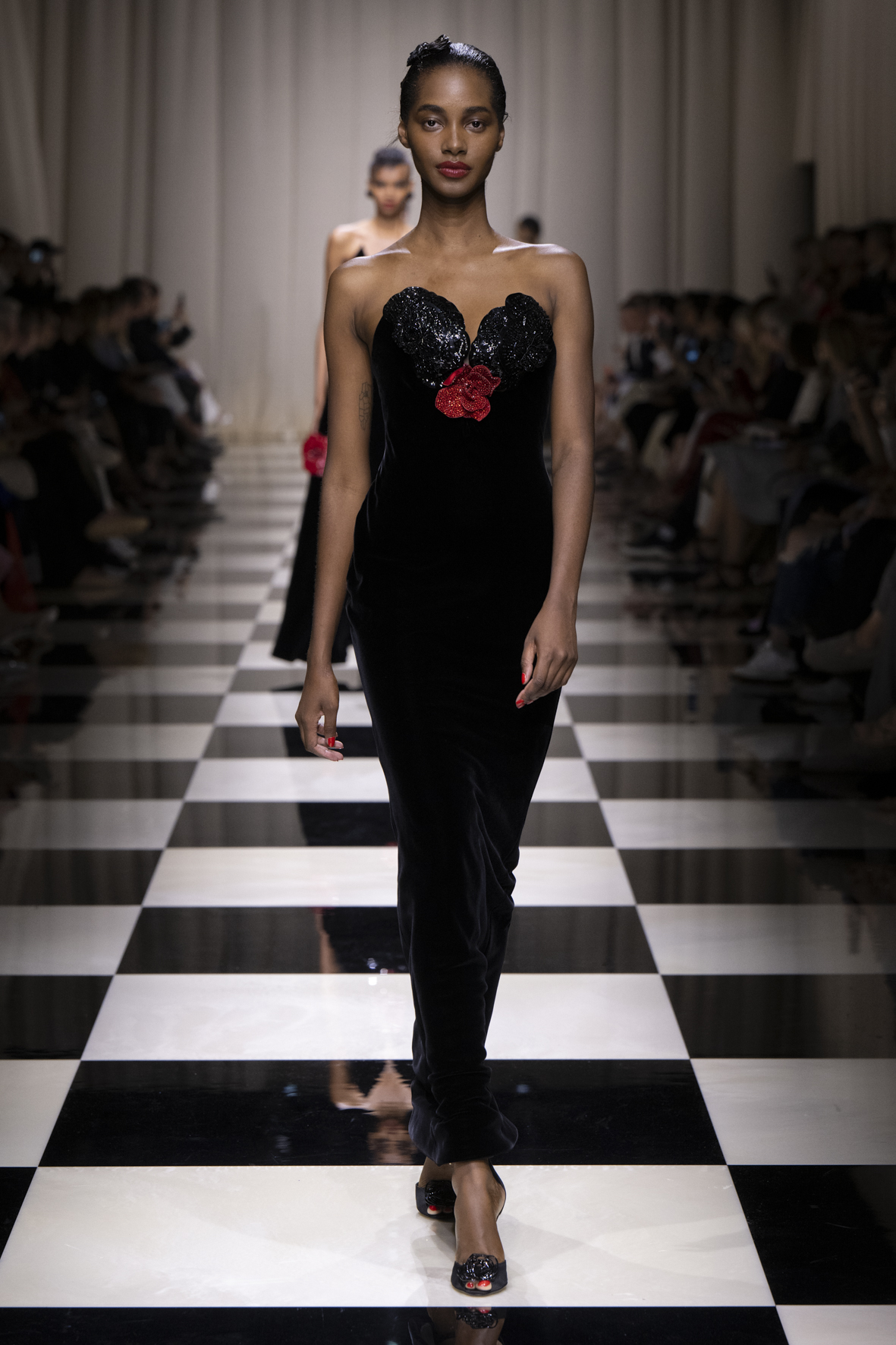 Une charnelle, séduisante et mystérieuse éclosion de roses rouges. Des roses laquées, brillantes, embossées d’un motif graphique noir aux accents dorés brillants. Un voyage de l’occident à l’orient à travers des silhouettes allongées, pour une collection revisitant, sans cliché romantique, la fleur la plus emblématique qui soit.