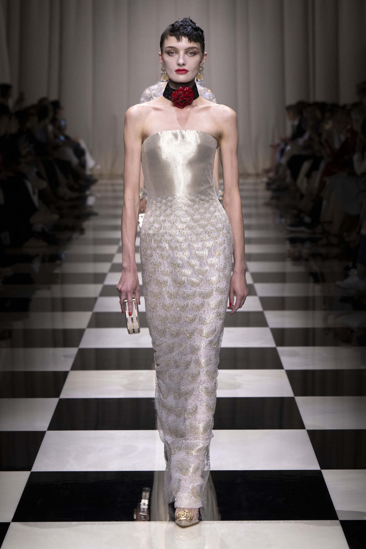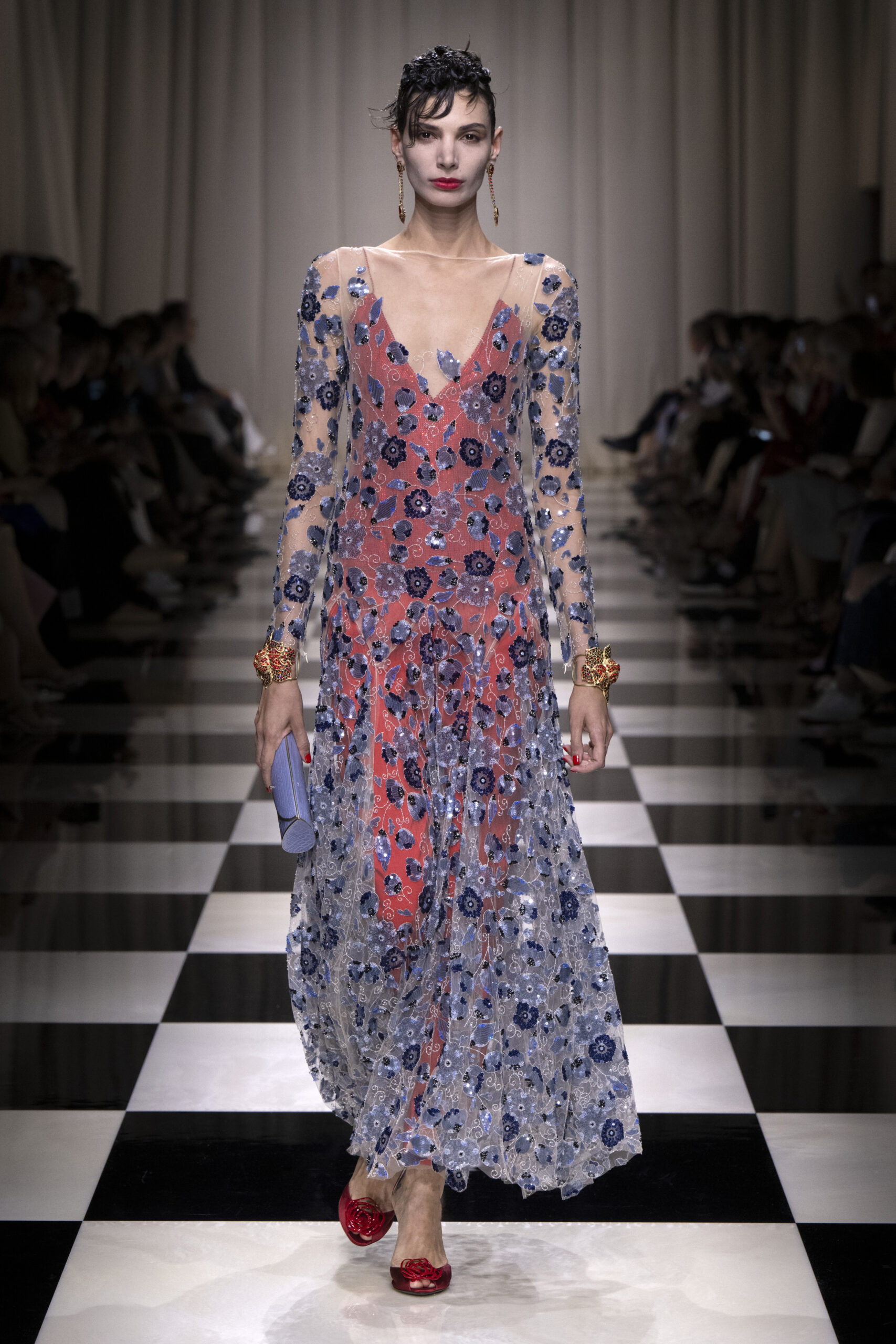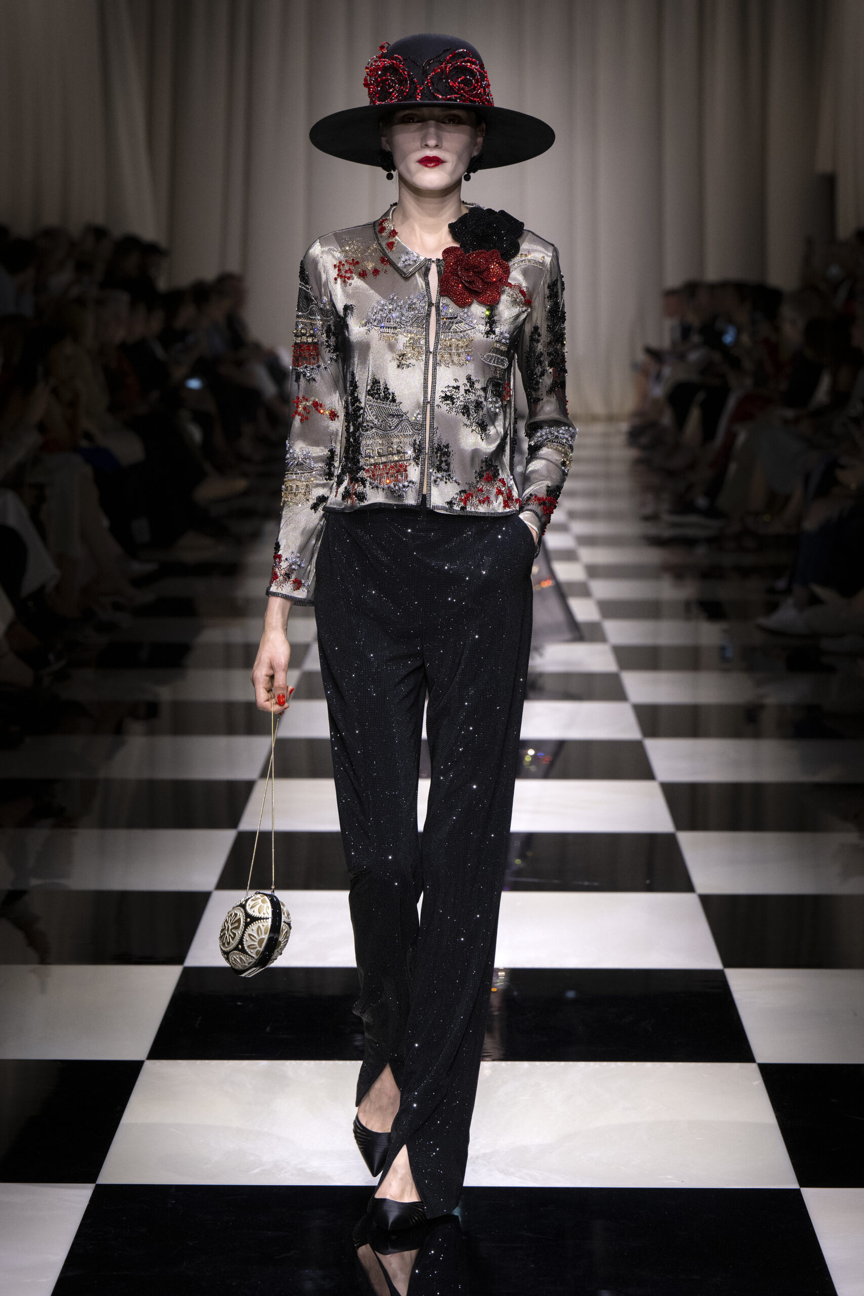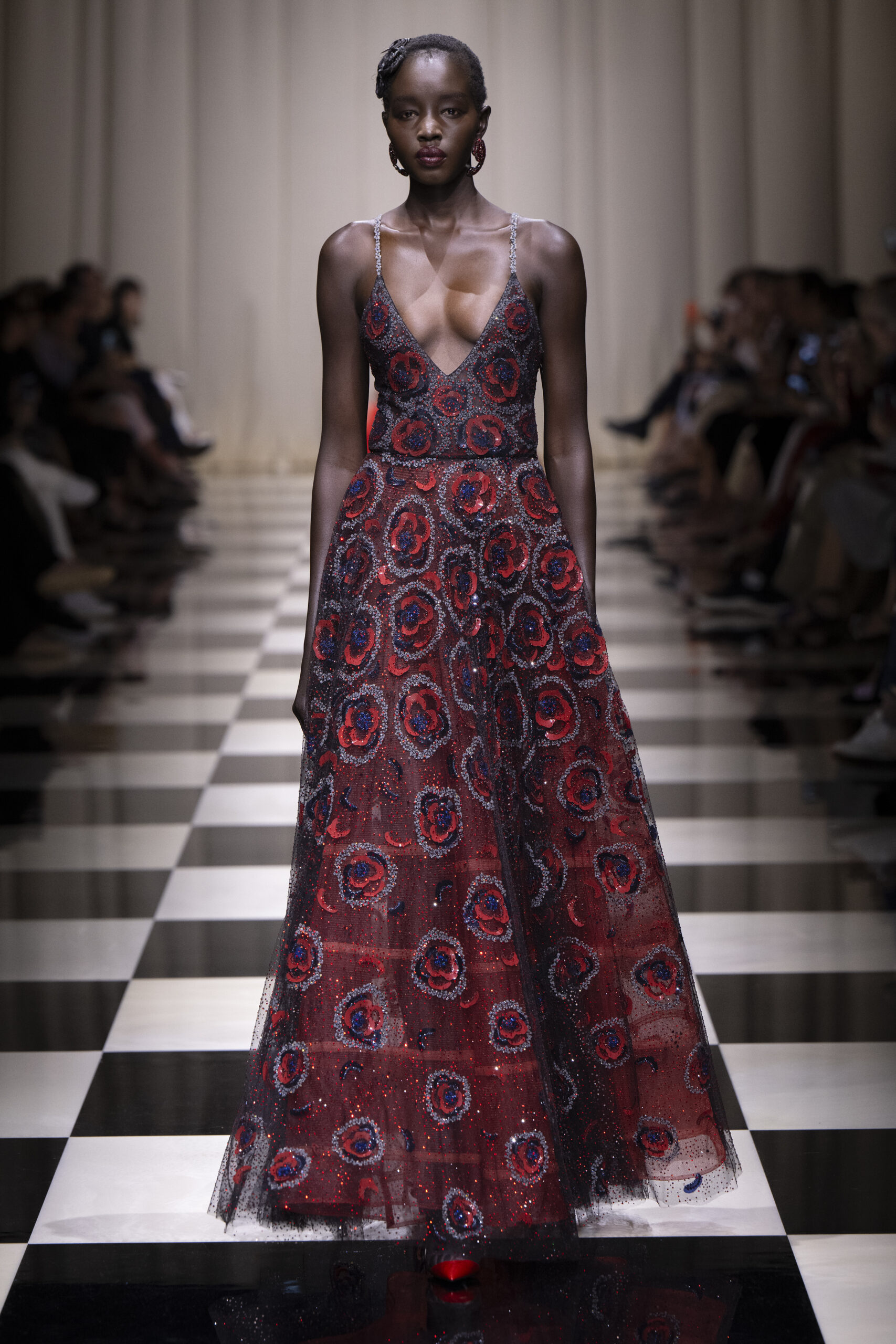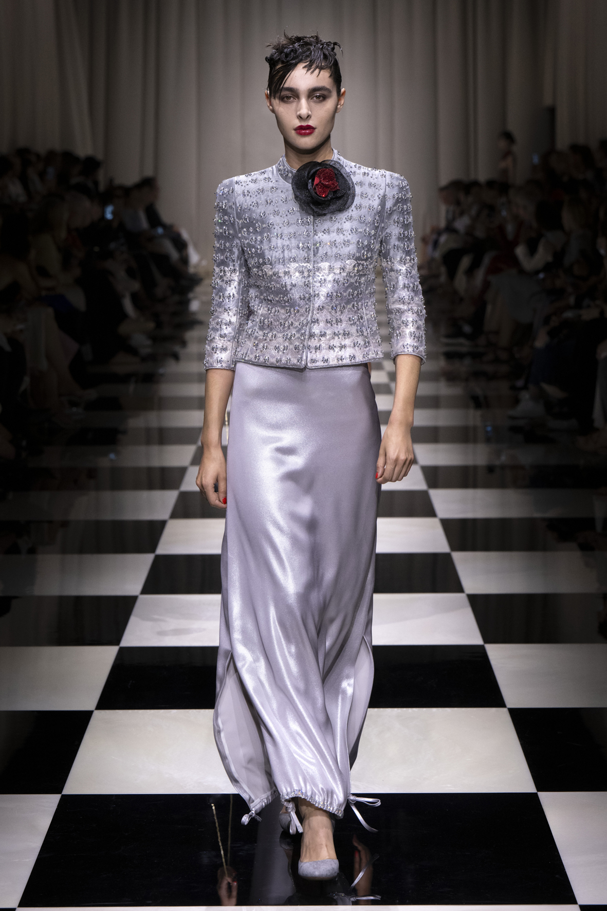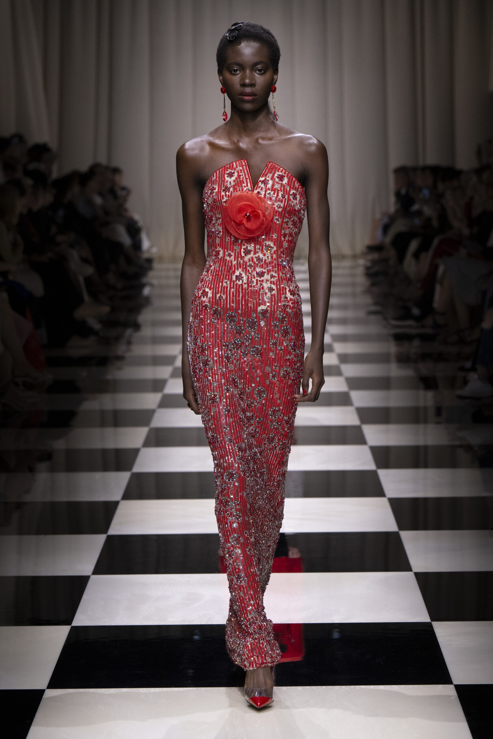 Une charnelle, séduisante et mystérieuse éclosion de roses rouges. Des roses laquées, brillantes, embossées d’un motif graphique noir aux accents dorés brillants. Un voyage de l’occident à l’orient à travers des silhouettes allongées, pour une collection revisitant, sans cliché romantique, la fleur la plus emblématique qui soit.