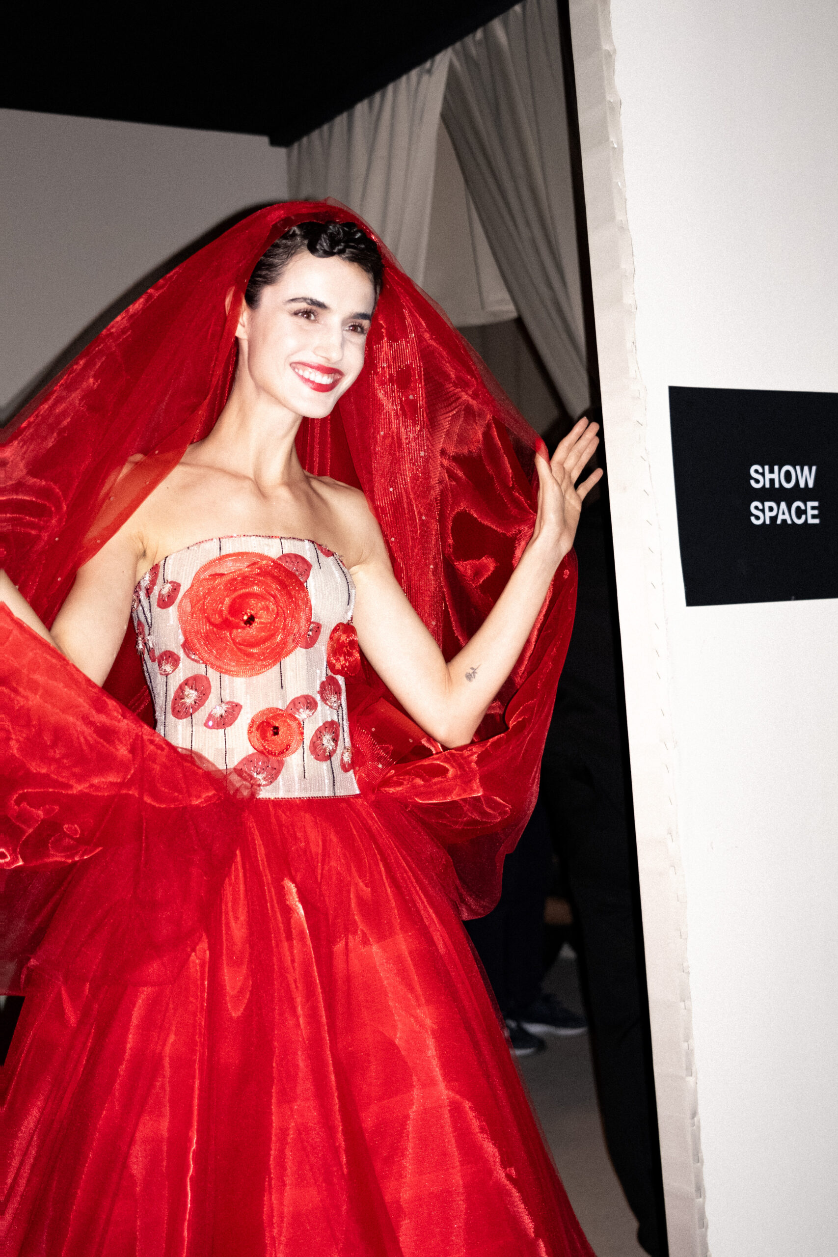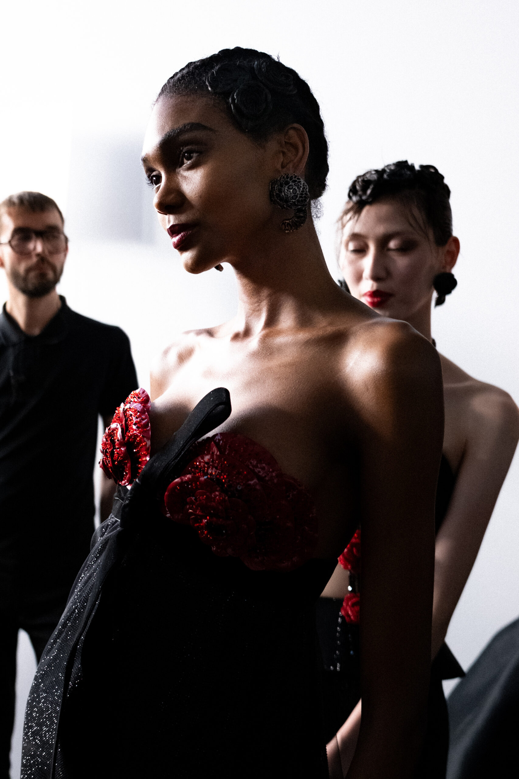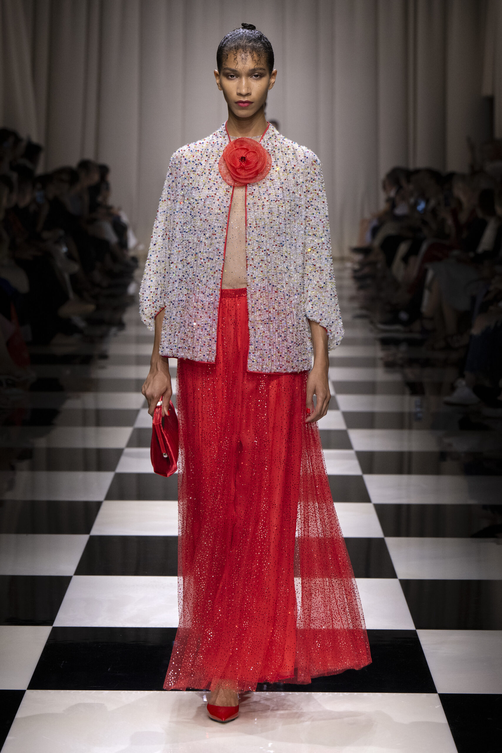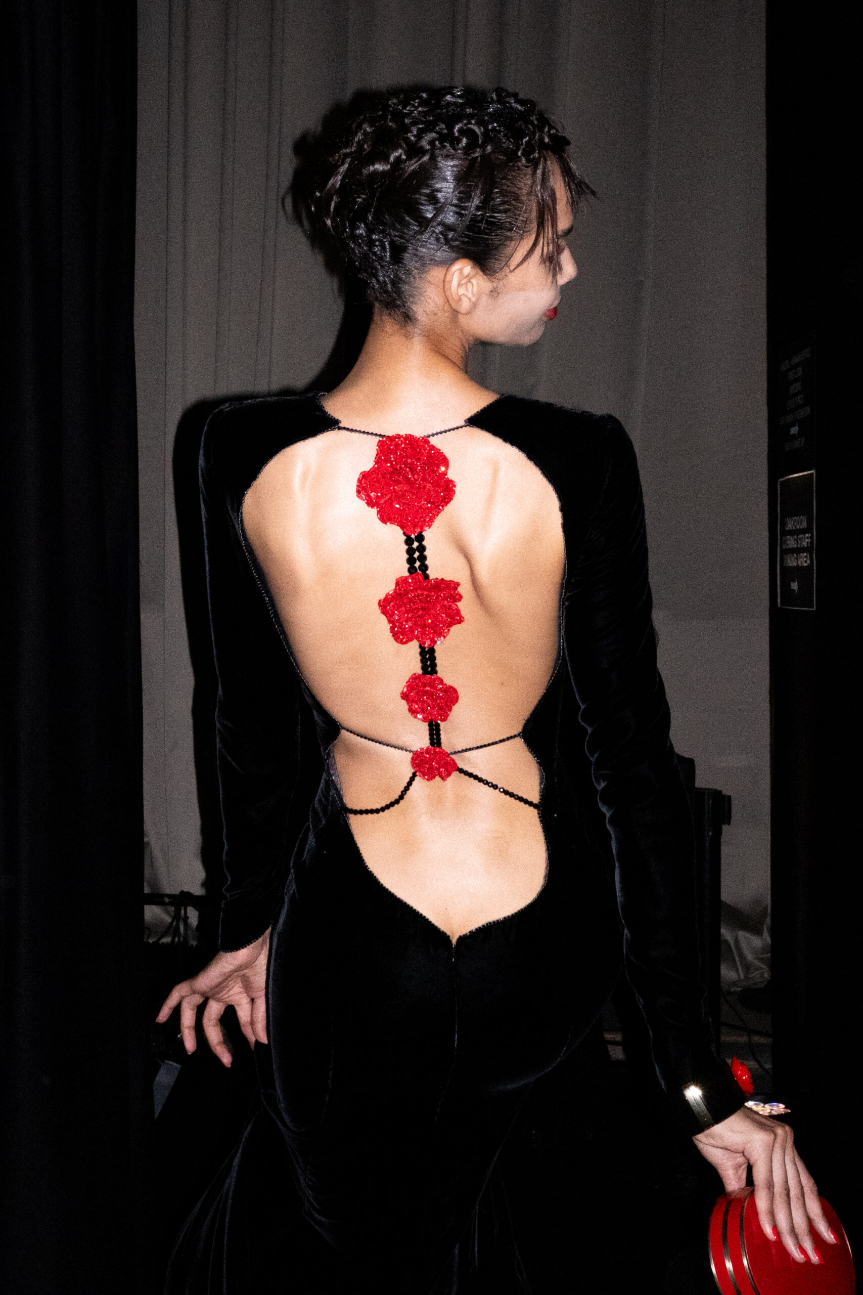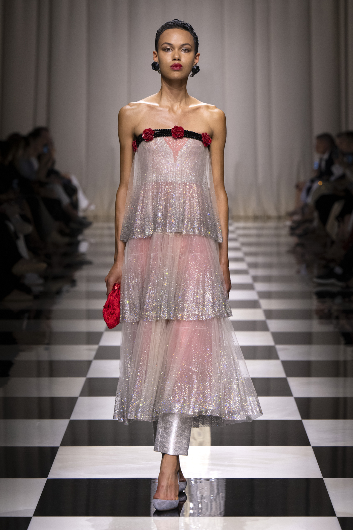 Une charnelle, séduisante et mystérieuse éclosion de roses rouges. Des roses laquées, brillantes, embossées d’un motif graphique noir aux accents dorés brillants. Un voyage de l’occident à l’orient à travers des silhouettes allongées, pour une collection revisitant, sans cliché romantique, la fleur la plus emblématique qui soit.
