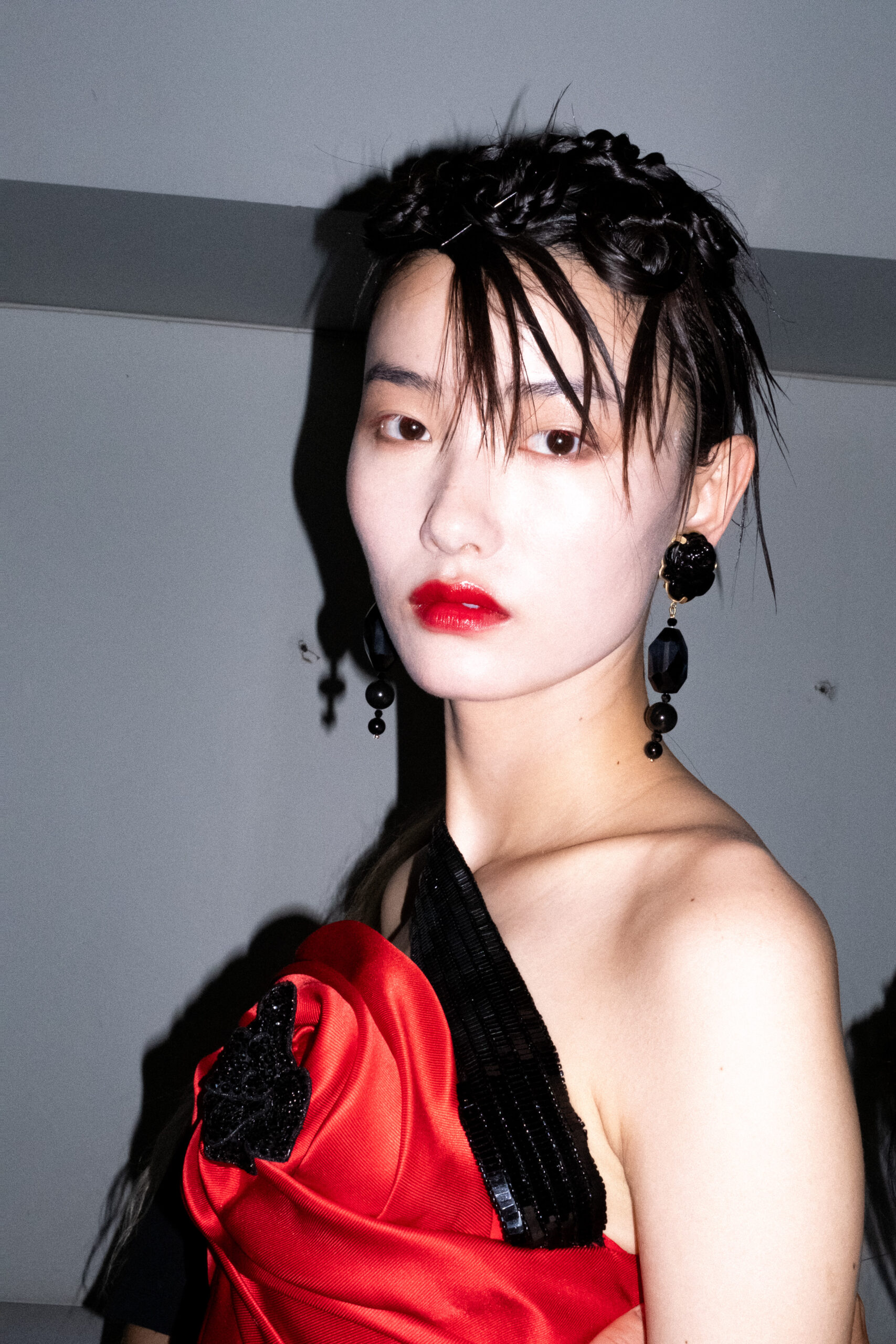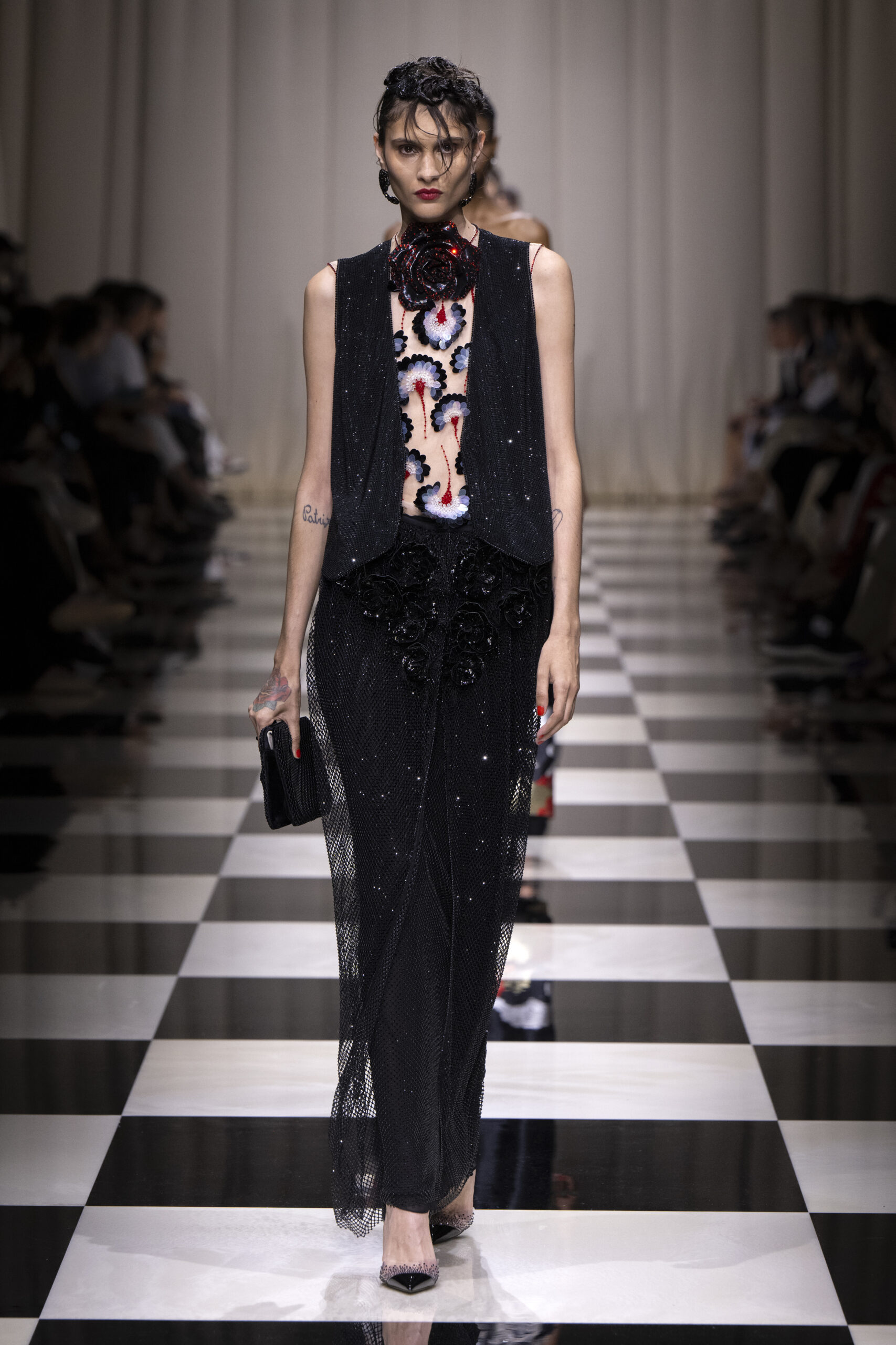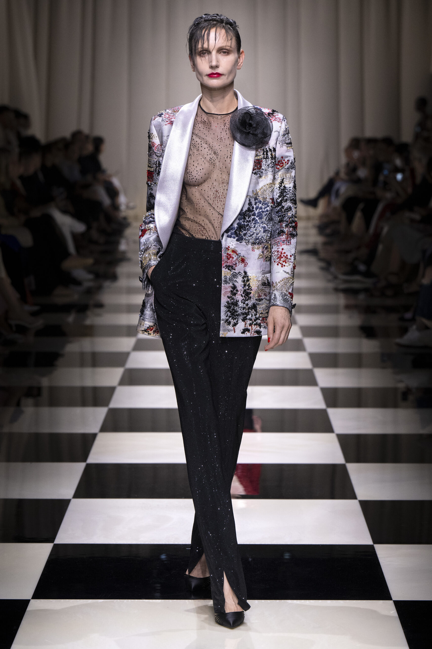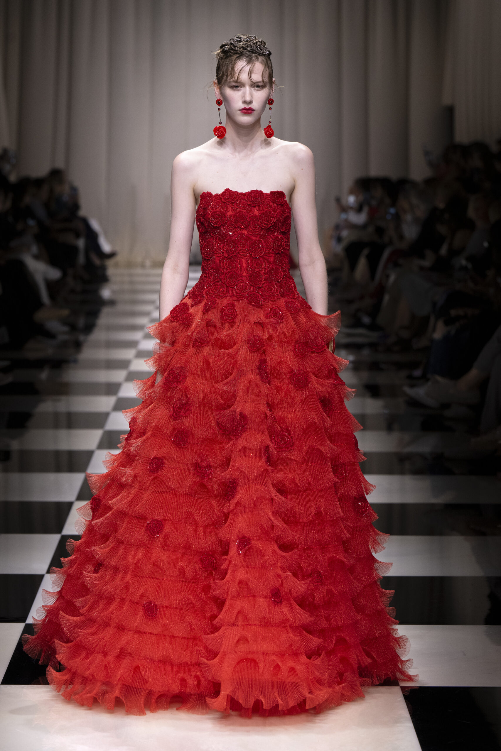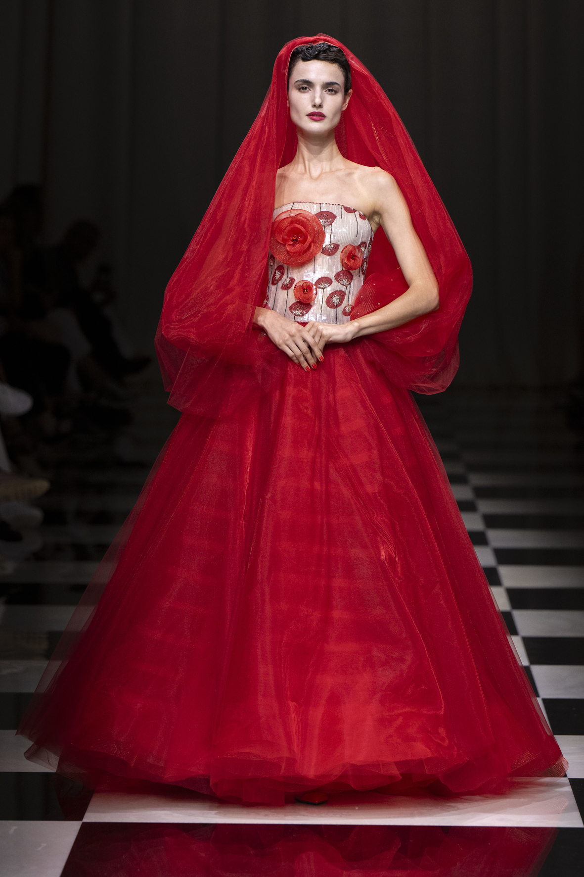 Une charnelle, séduisante et mystérieuse éclosion de roses rouges. Des roses laquées, brillantes, embossées d’un motif graphique noir aux accents dorés brillants. Un voyage de l’occident à l’orient à travers des silhouettes allongées, pour une collection revisitant, sans cliché romantique, la fleur la plus emblématique qui soit.