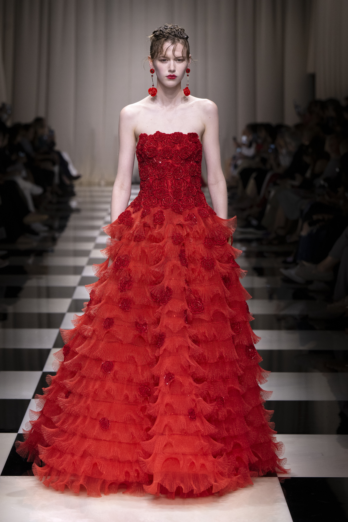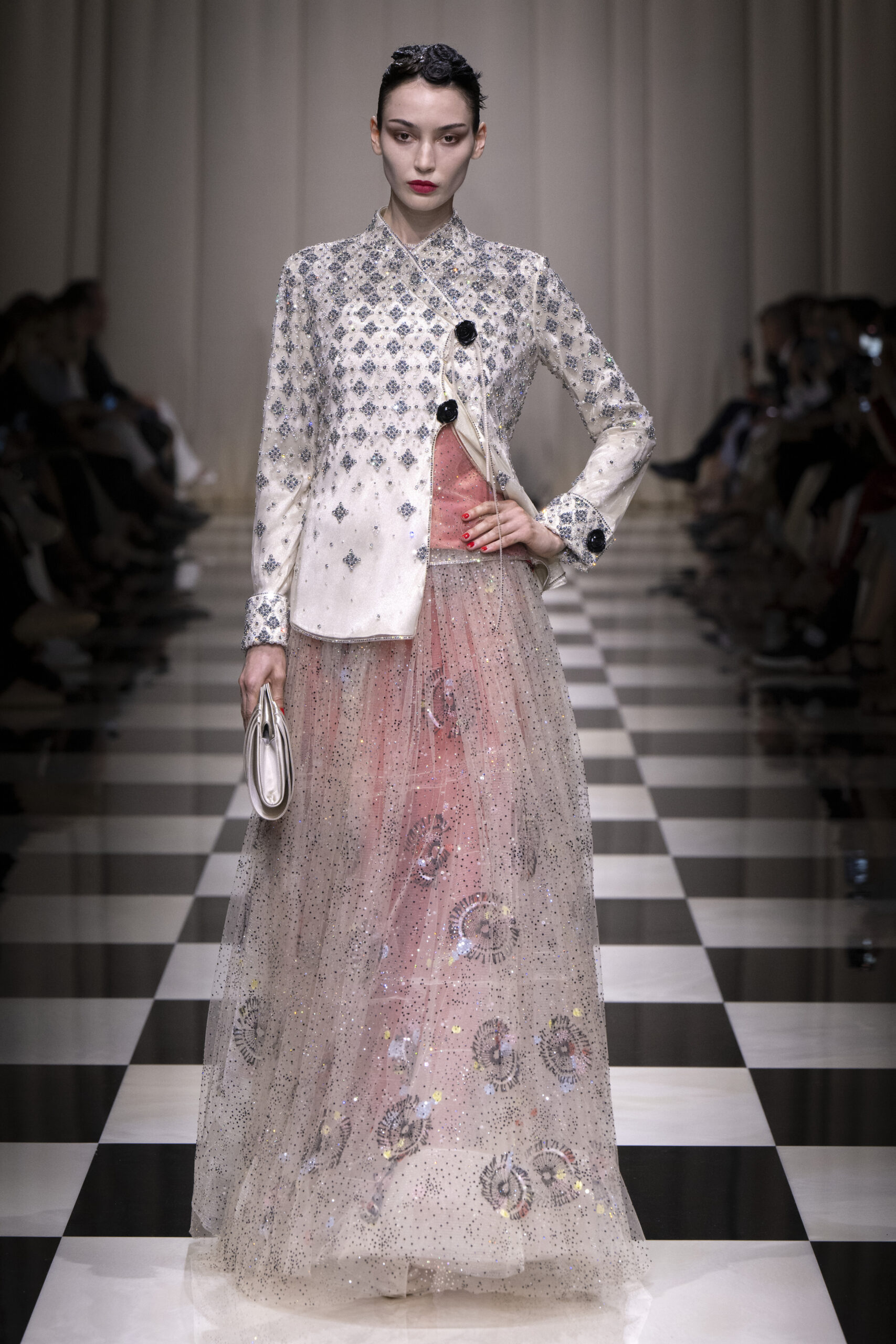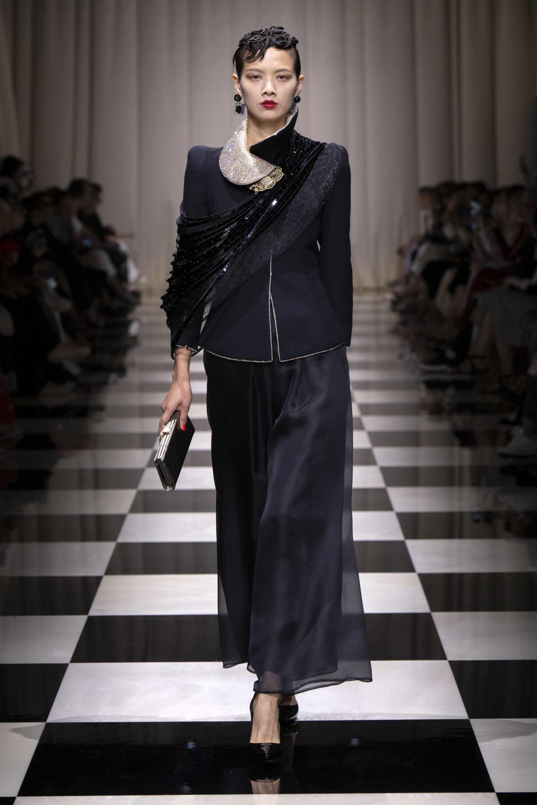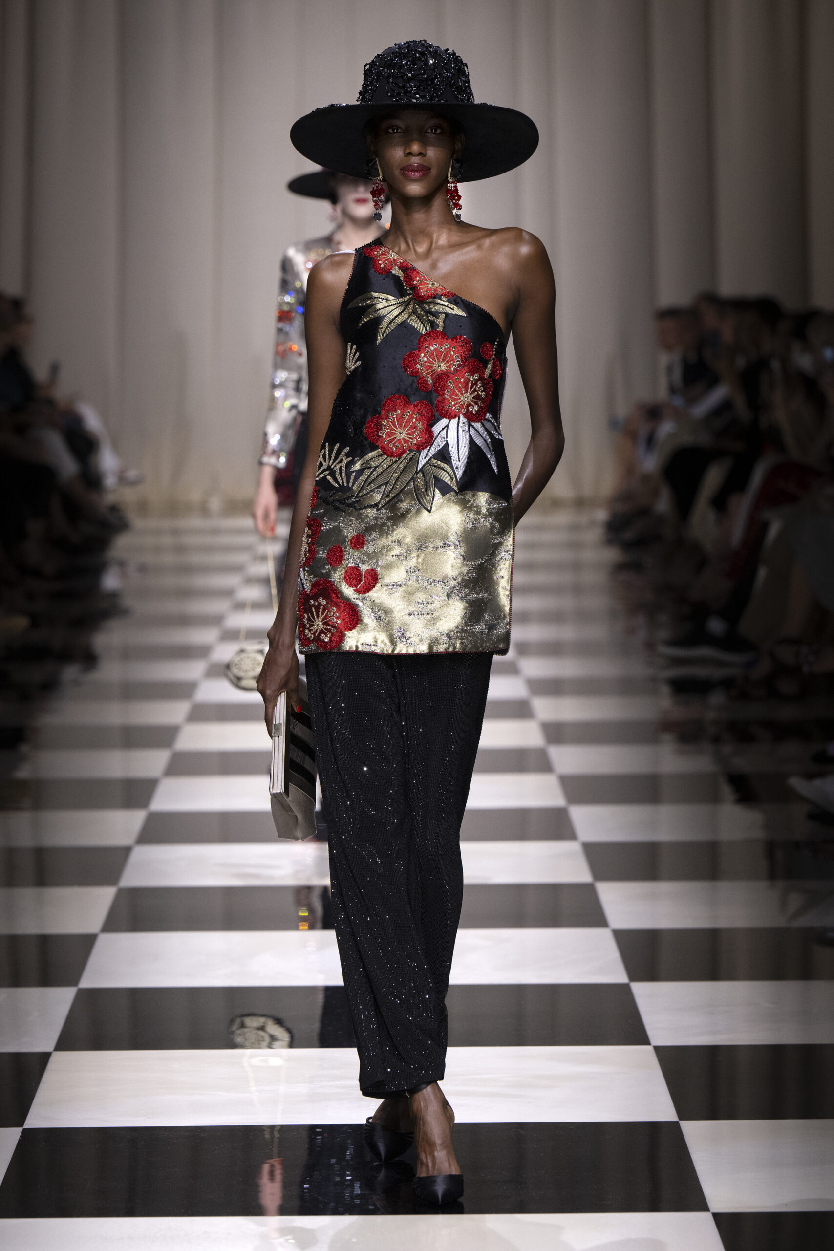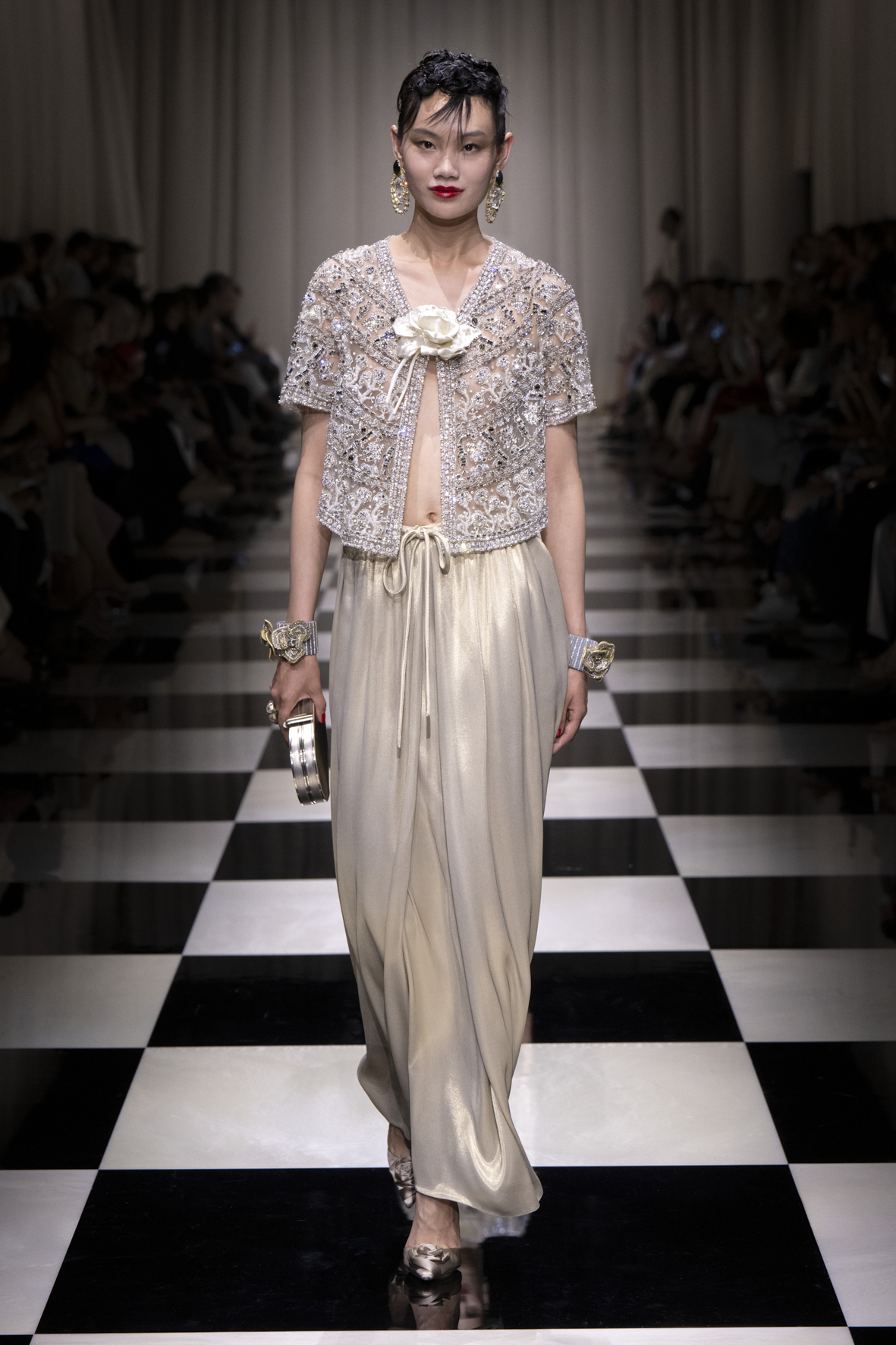 Une charnelle, séduisante et mystérieuse éclosion de roses rouges. Des roses laquées, brillantes, embossées d’un motif graphique noir aux accents dorés brillants. Un voyage de l’occident à l’orient à travers des silhouettes allongées, pour une collection revisitant, sans cliché romantique, la fleur la plus emblématique qui soit.