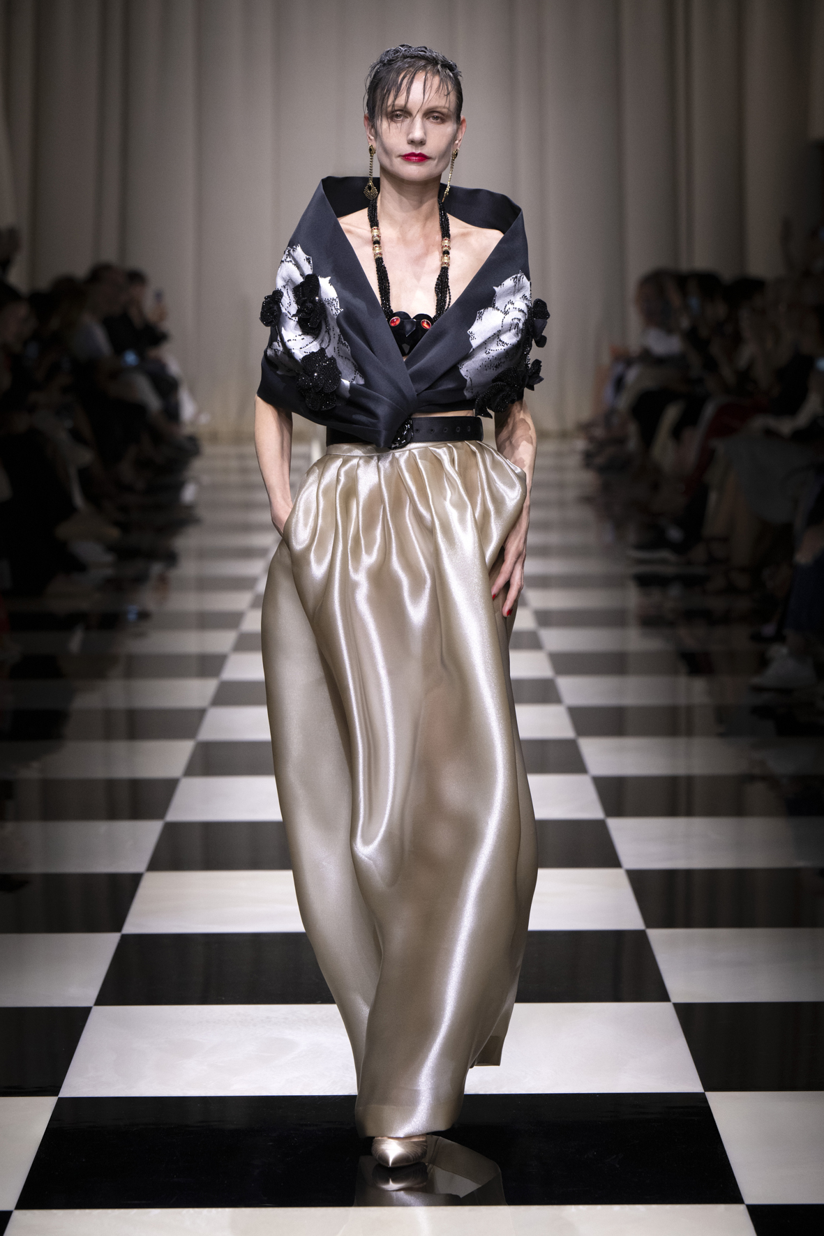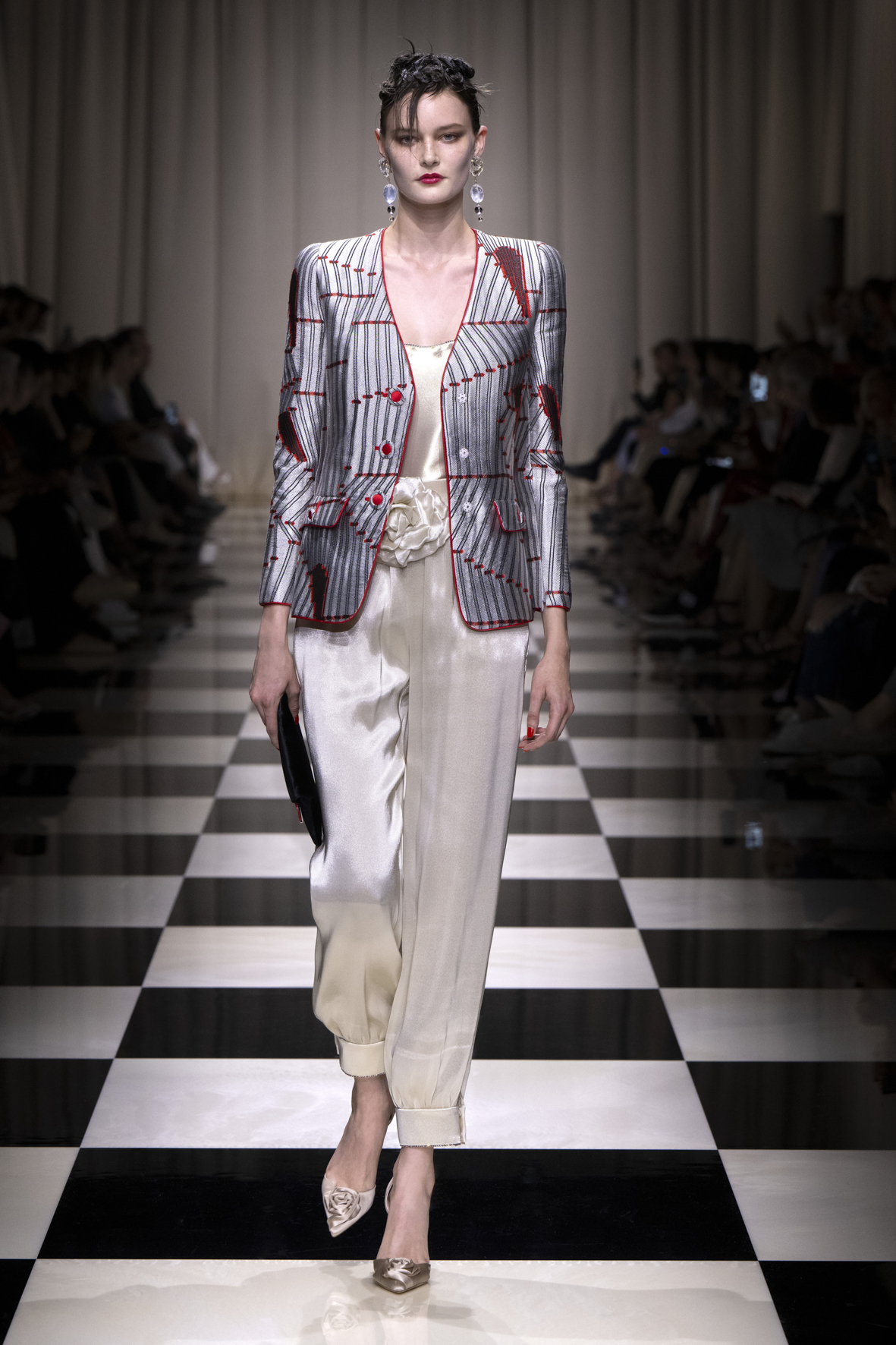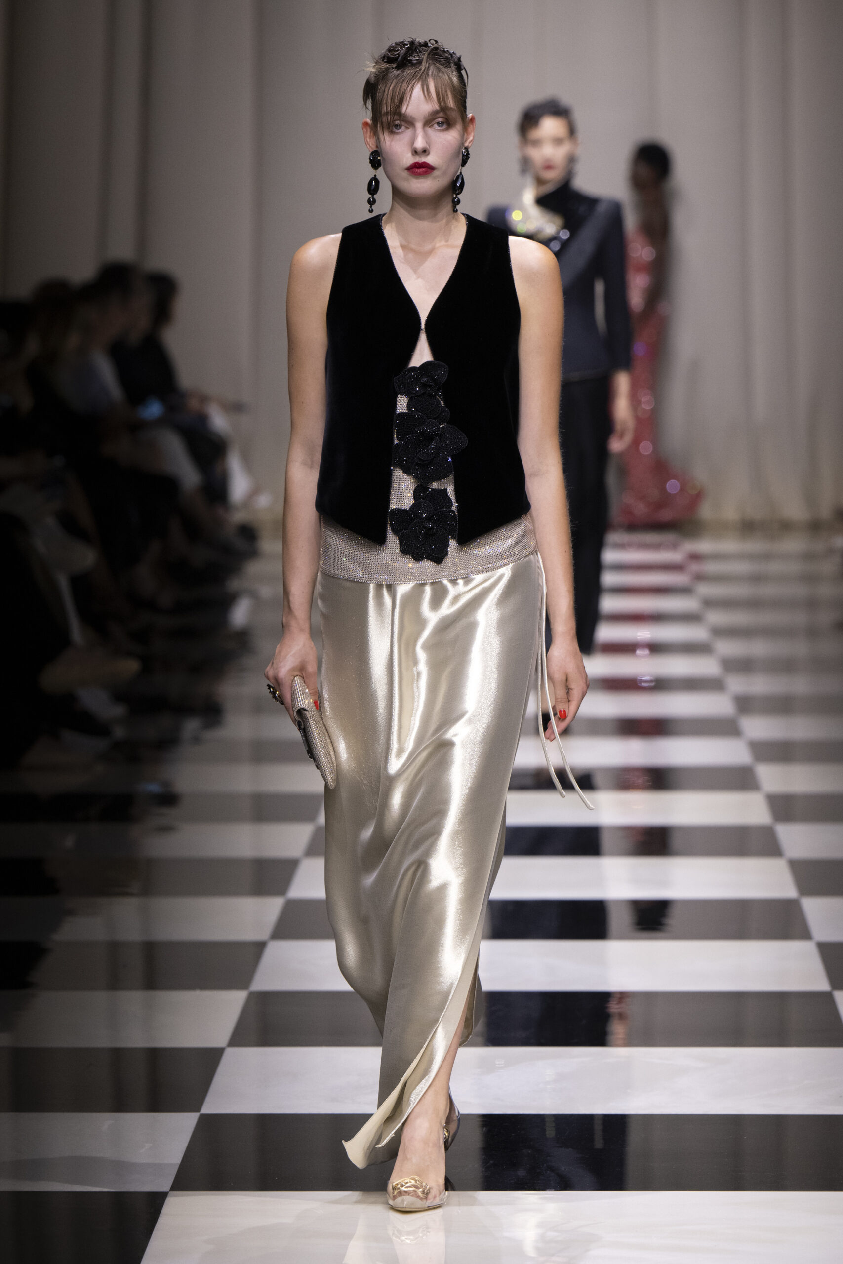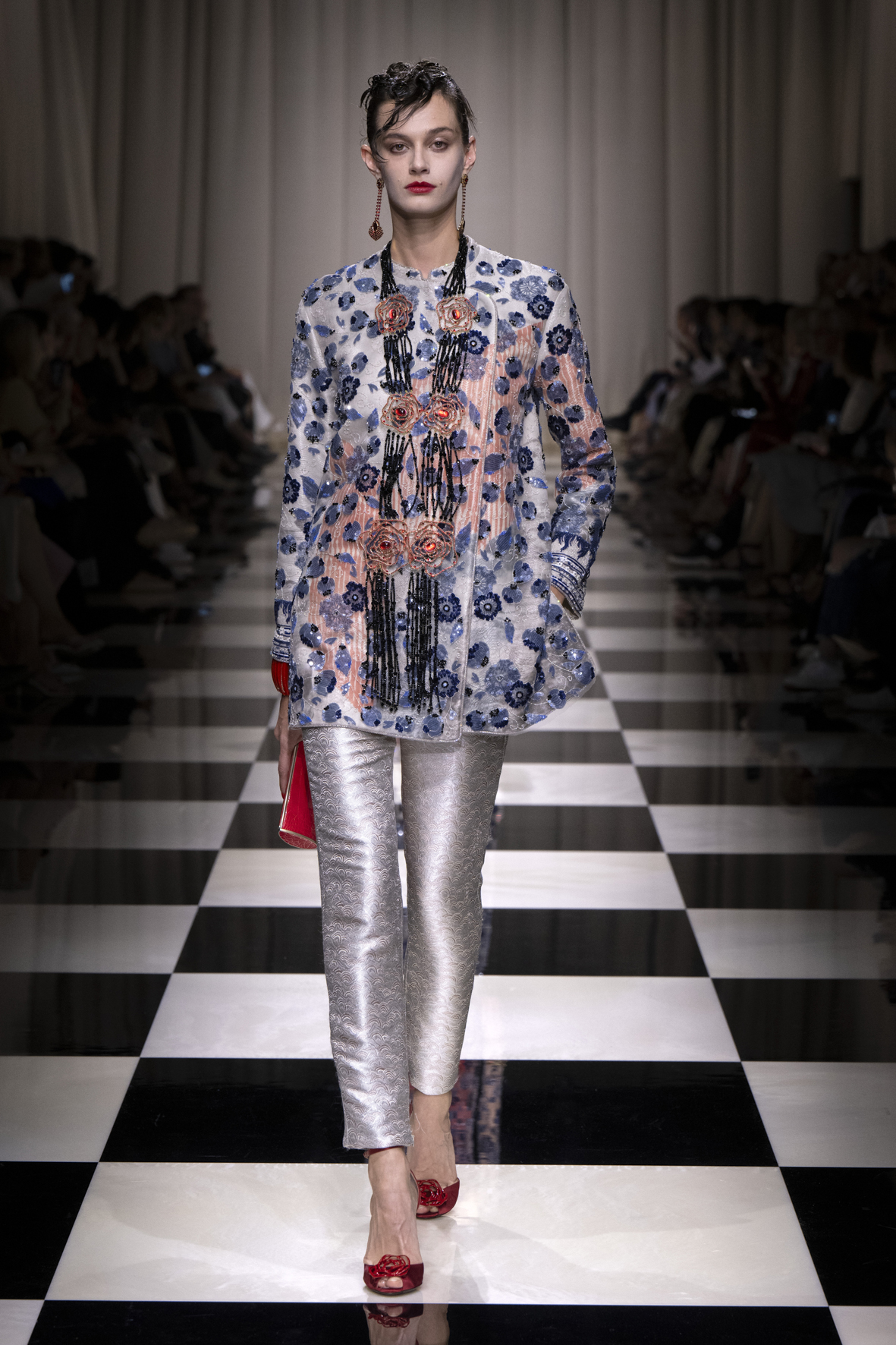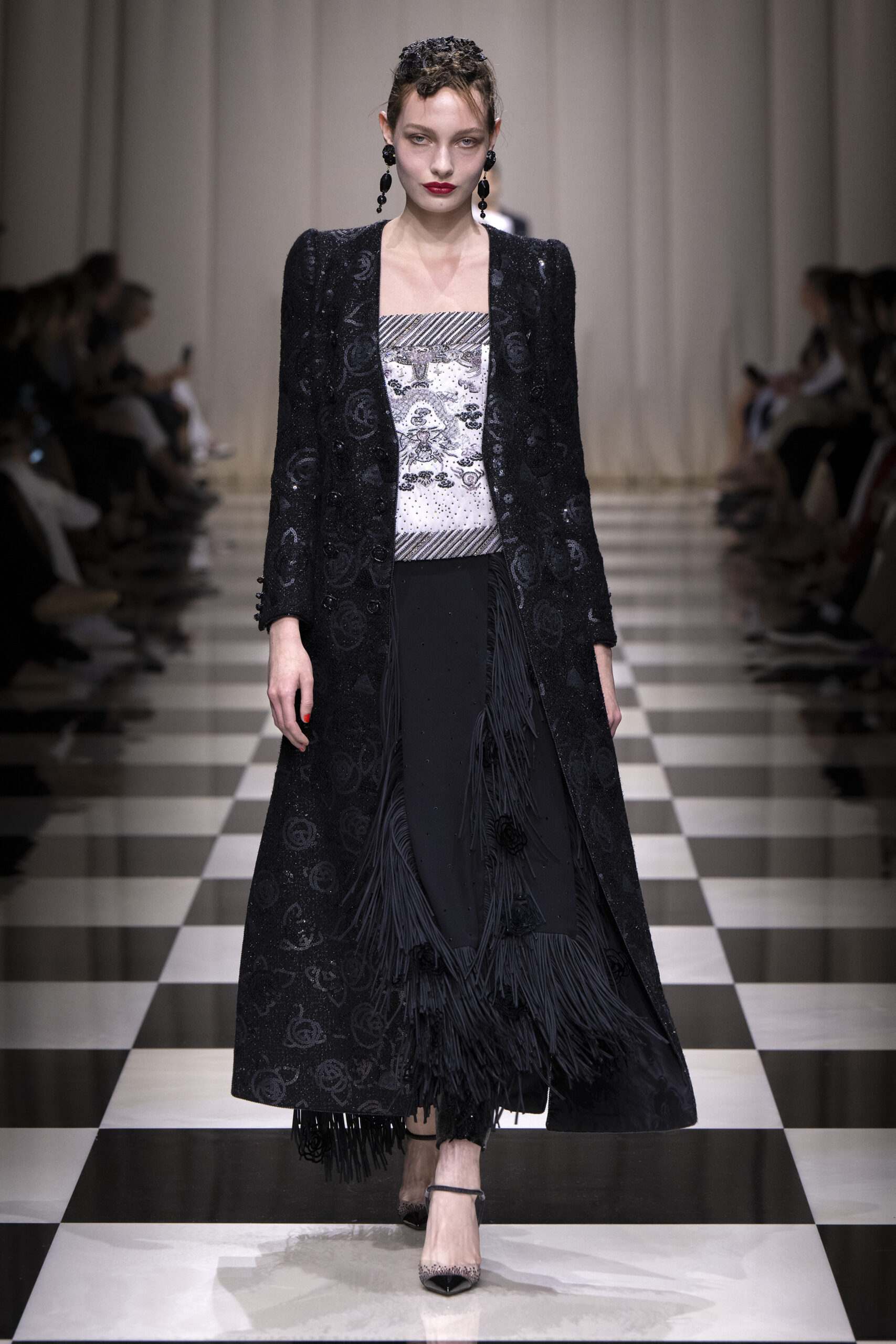 Une charnelle, séduisante et mystérieuse éclosion de roses rouges. Des roses laquées, brillantes, embossées d’un motif graphique noir aux accents dorés brillants. Un voyage de l’occident à l’orient à travers des silhouettes allongées, pour une collection revisitant, sans cliché romantique, la fleur la plus emblématique qui soit.