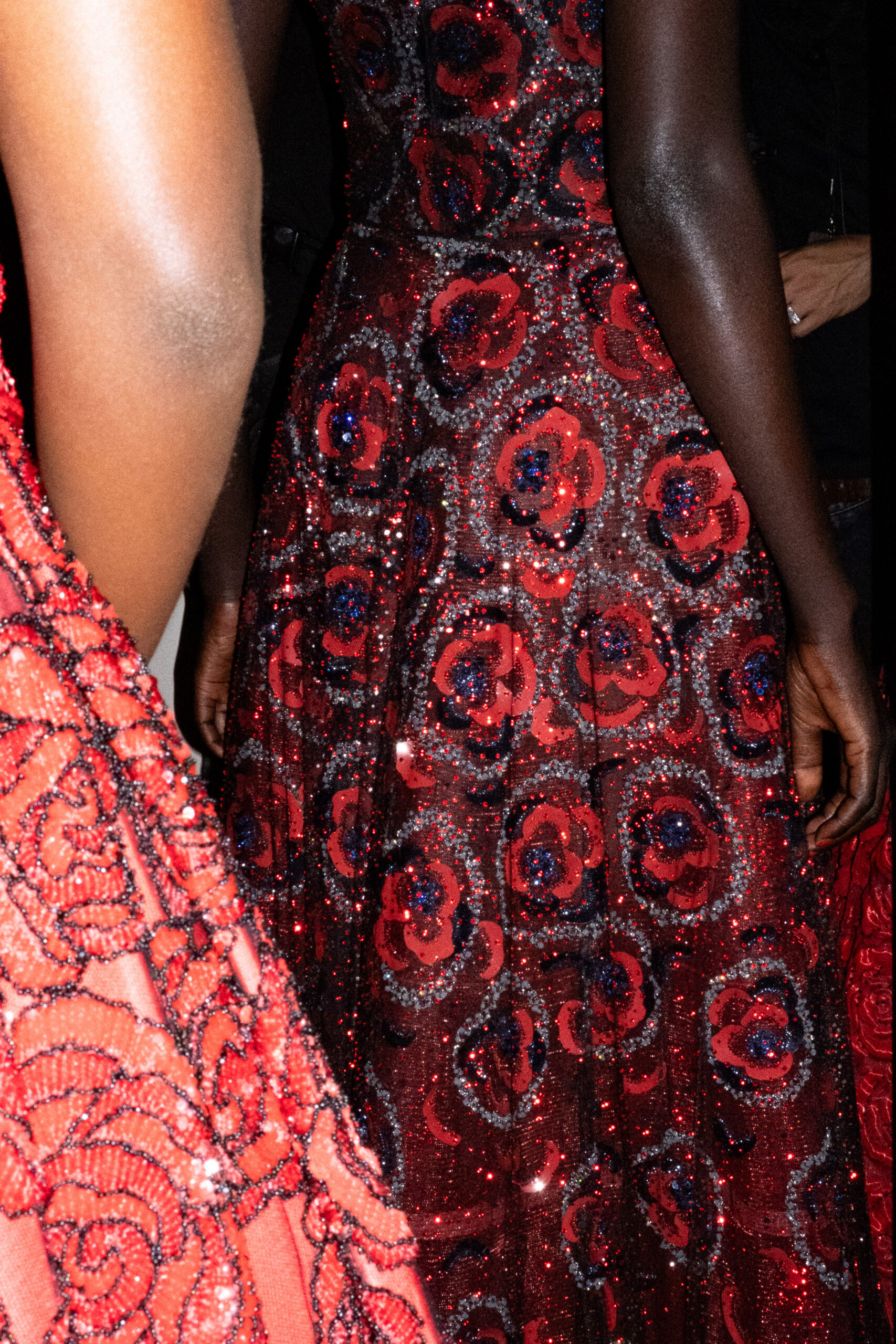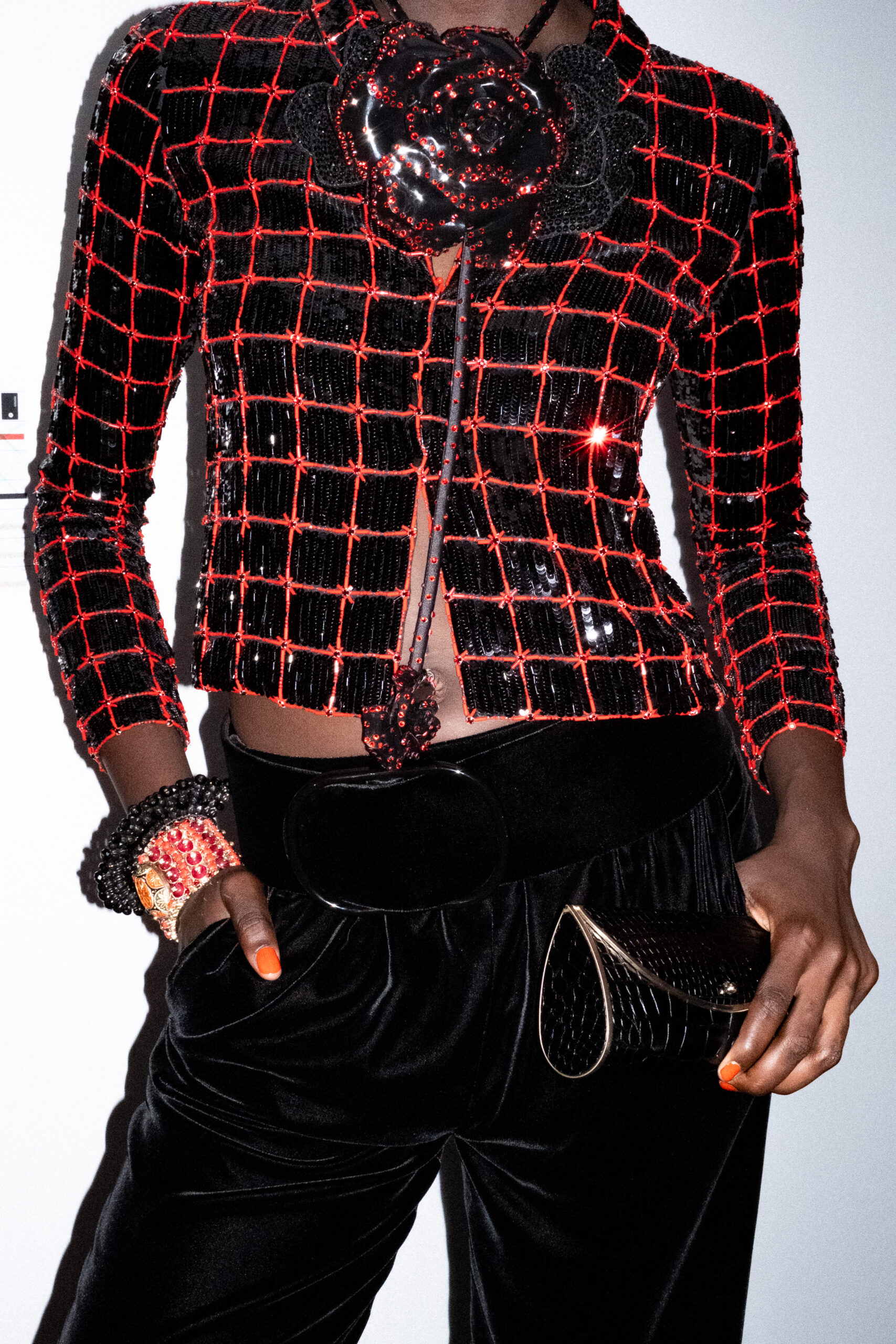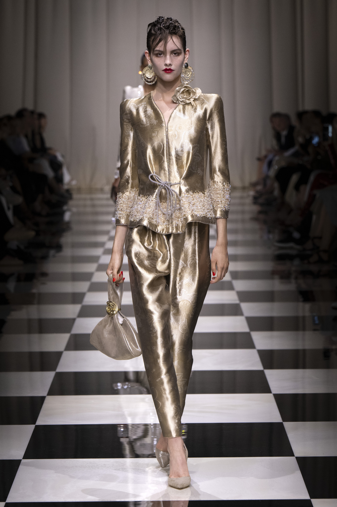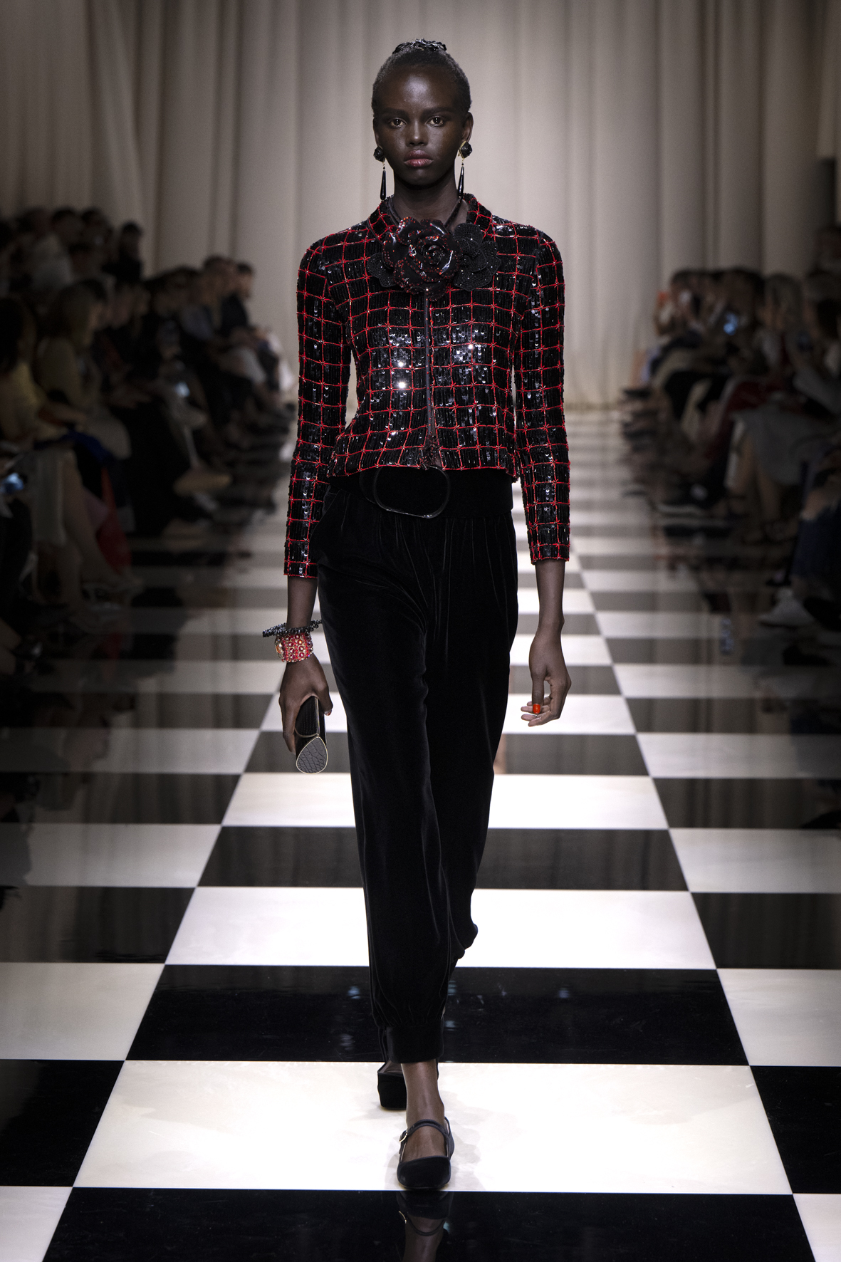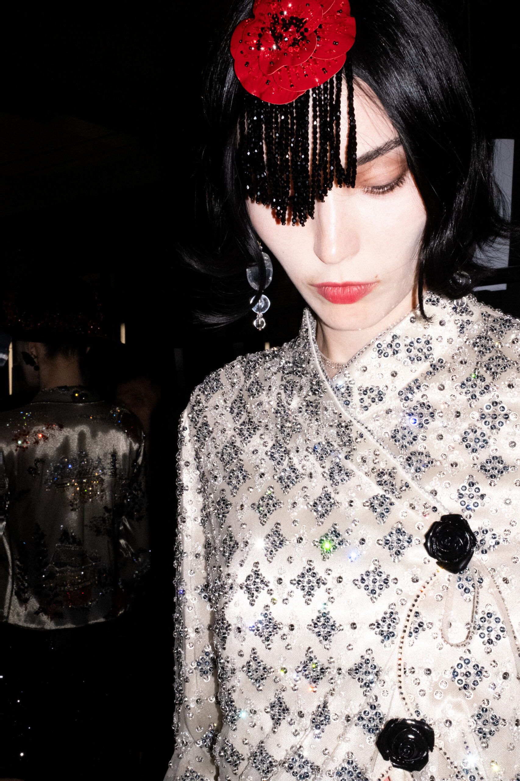 Une charnelle, séduisante et mystérieuse éclosion de roses rouges. Des roses laquées, brillantes, embossées d’un motif graphique noir aux accents dorés brillants. Un voyage de l’occident à l’orient à travers des silhouettes allongées, pour une collection revisitant, sans cliché romantique, la fleur la plus emblématique qui soit.