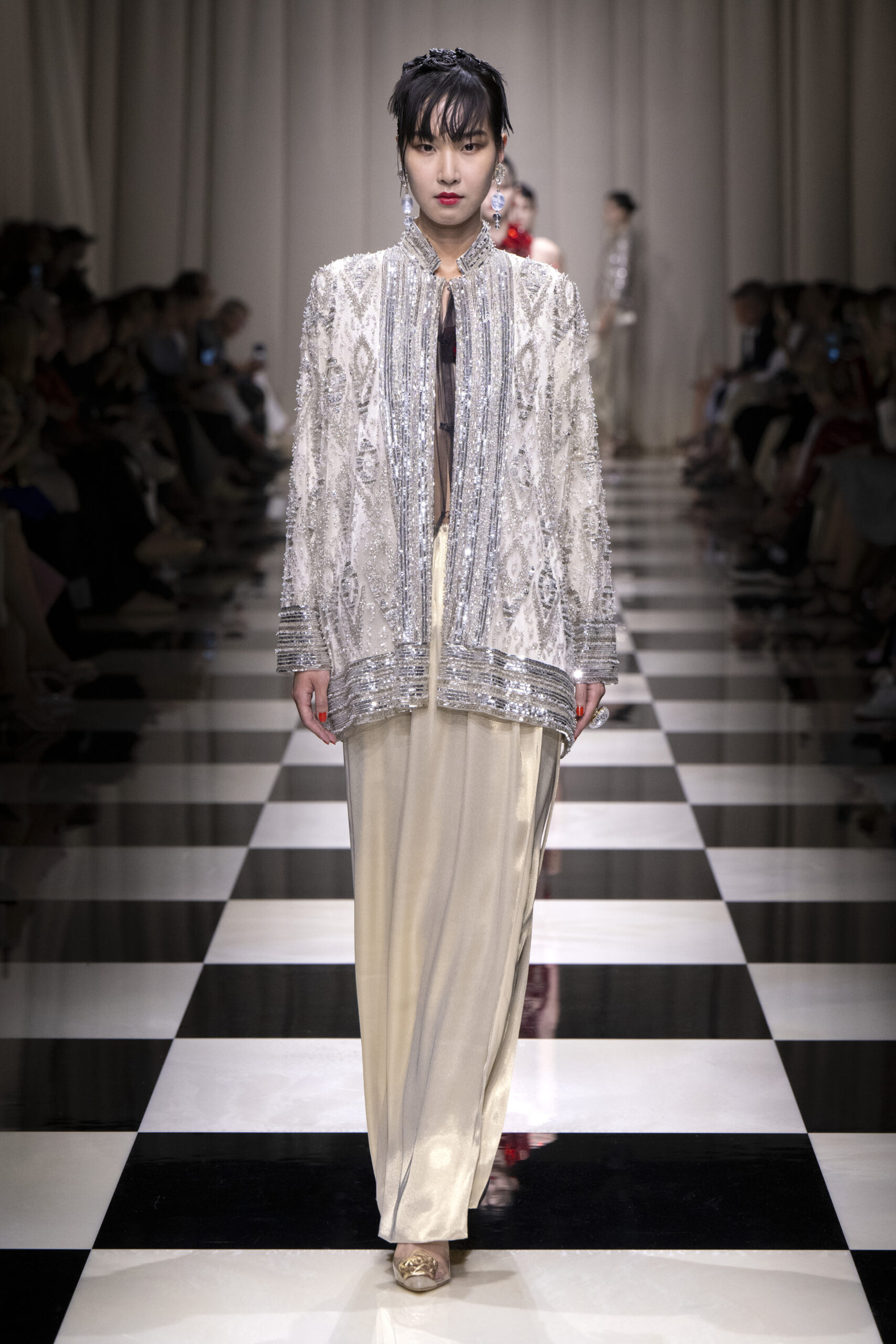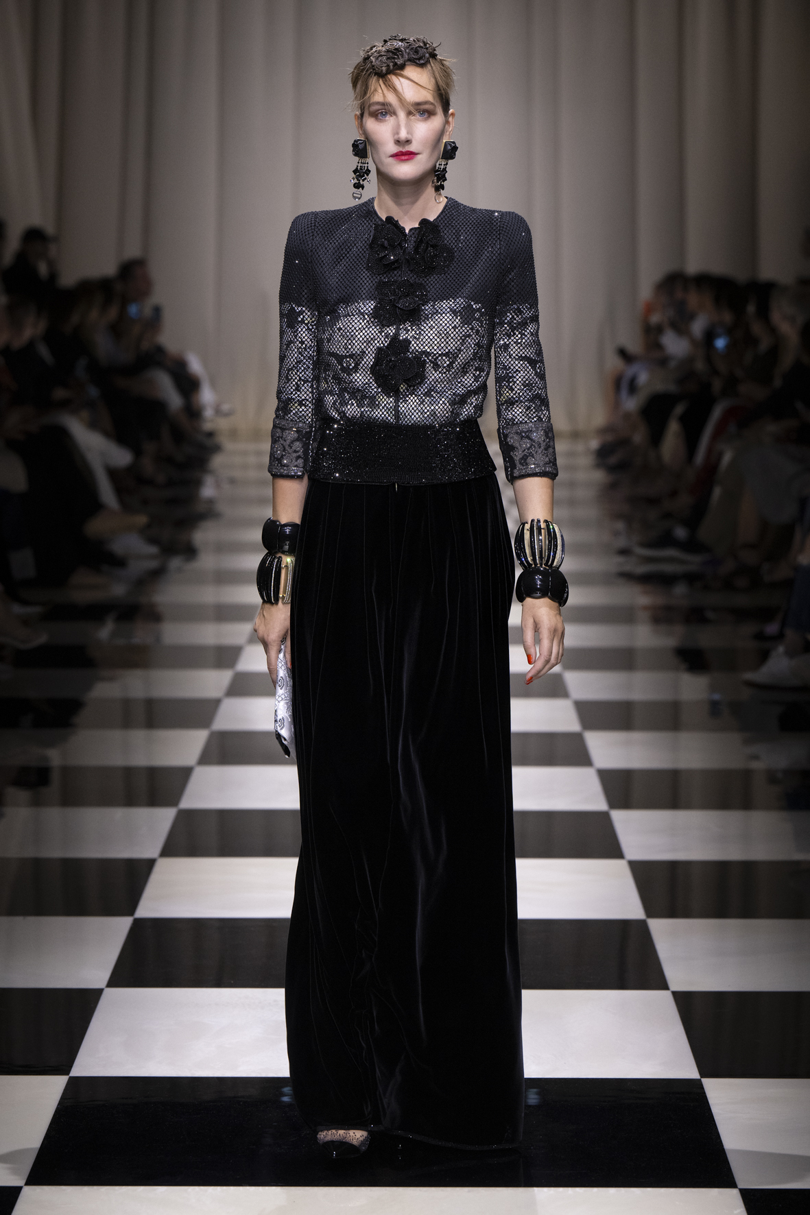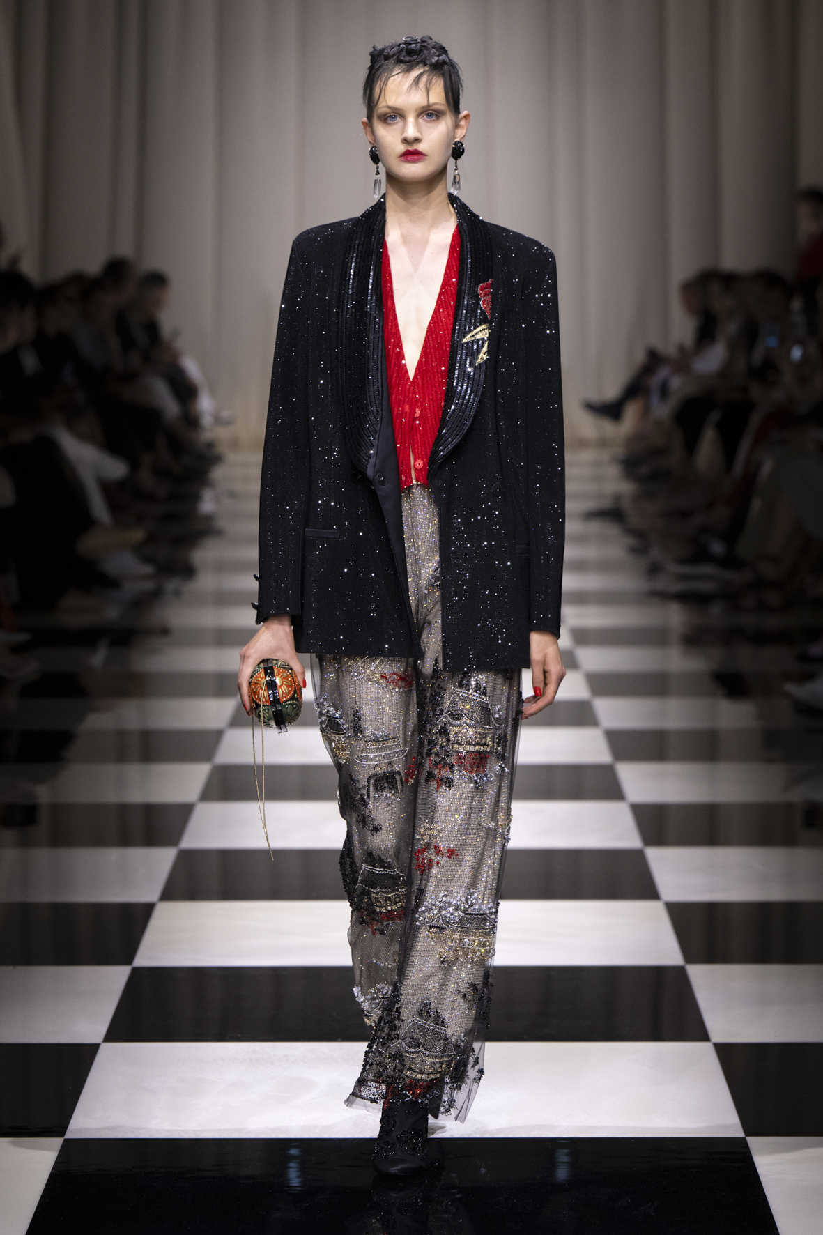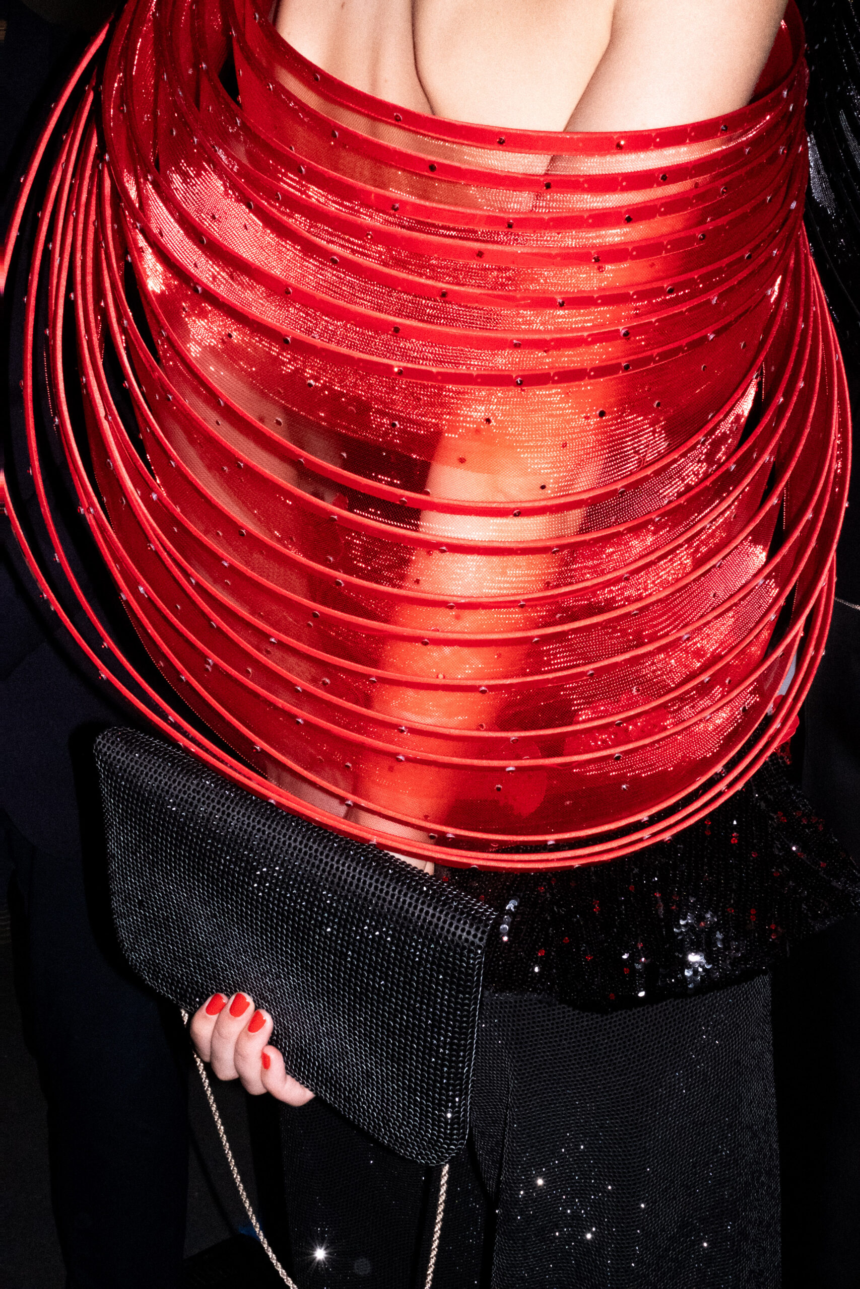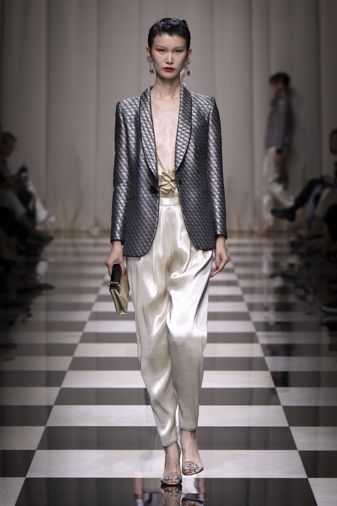Une charnelle, séduisante et mystérieuse éclosion de roses rouges. Des roses laquées, brillantes, embossées d’un motif graphique noir aux accents dorés brillants. Un voyage de l’occident à l’orient à travers des silhouettes allongées, pour une collection revisitant, sans cliché romantique, la fleur la plus emblématique qui soit.