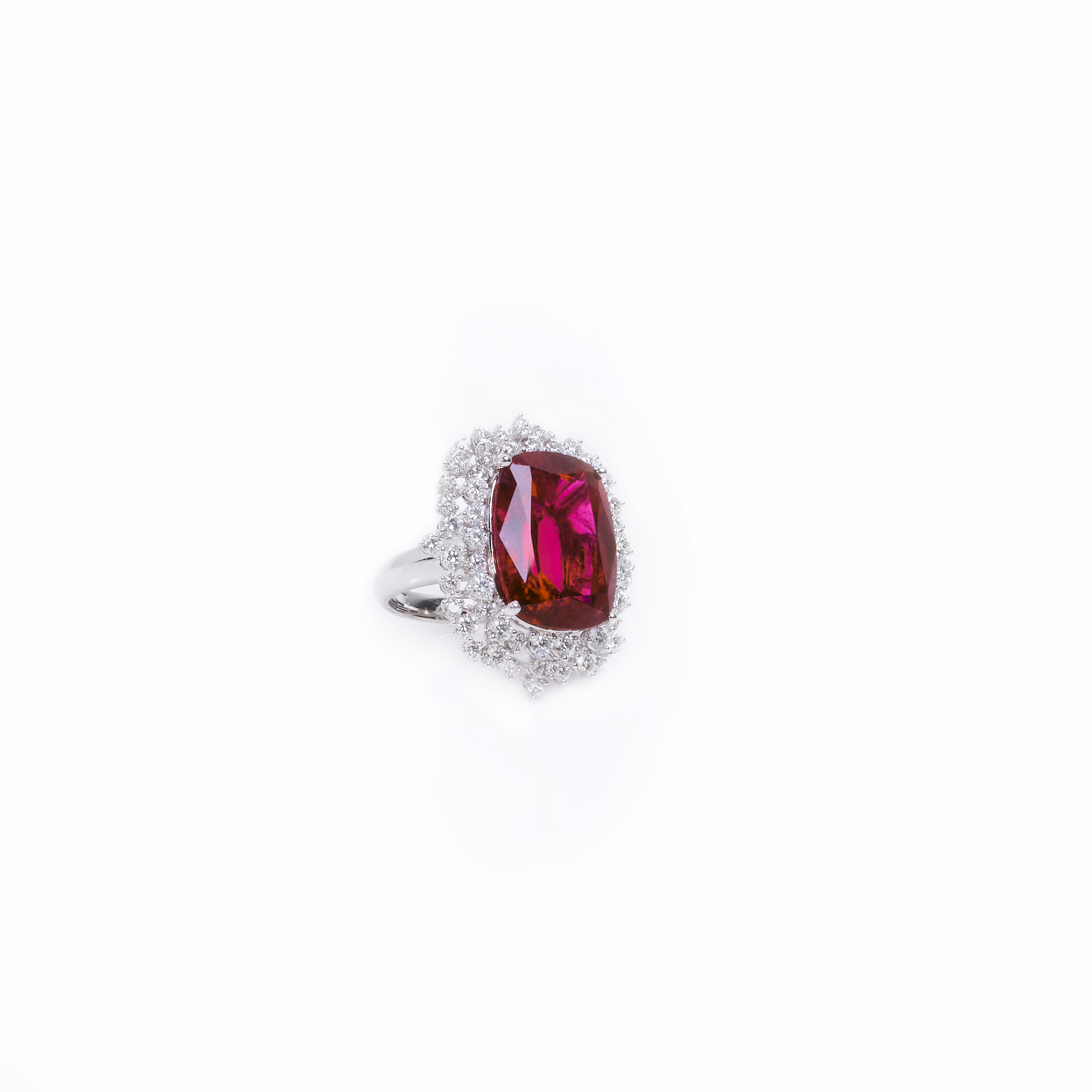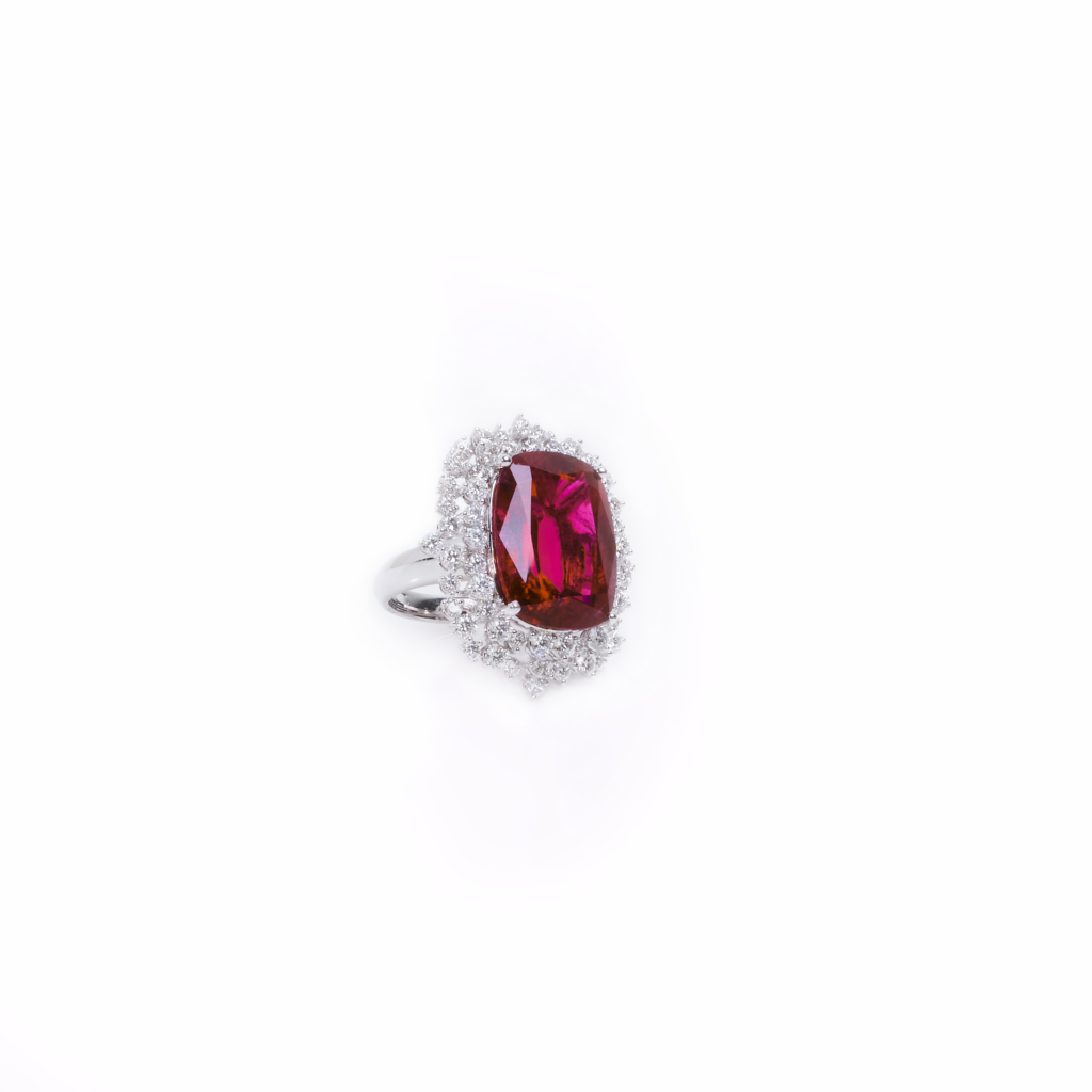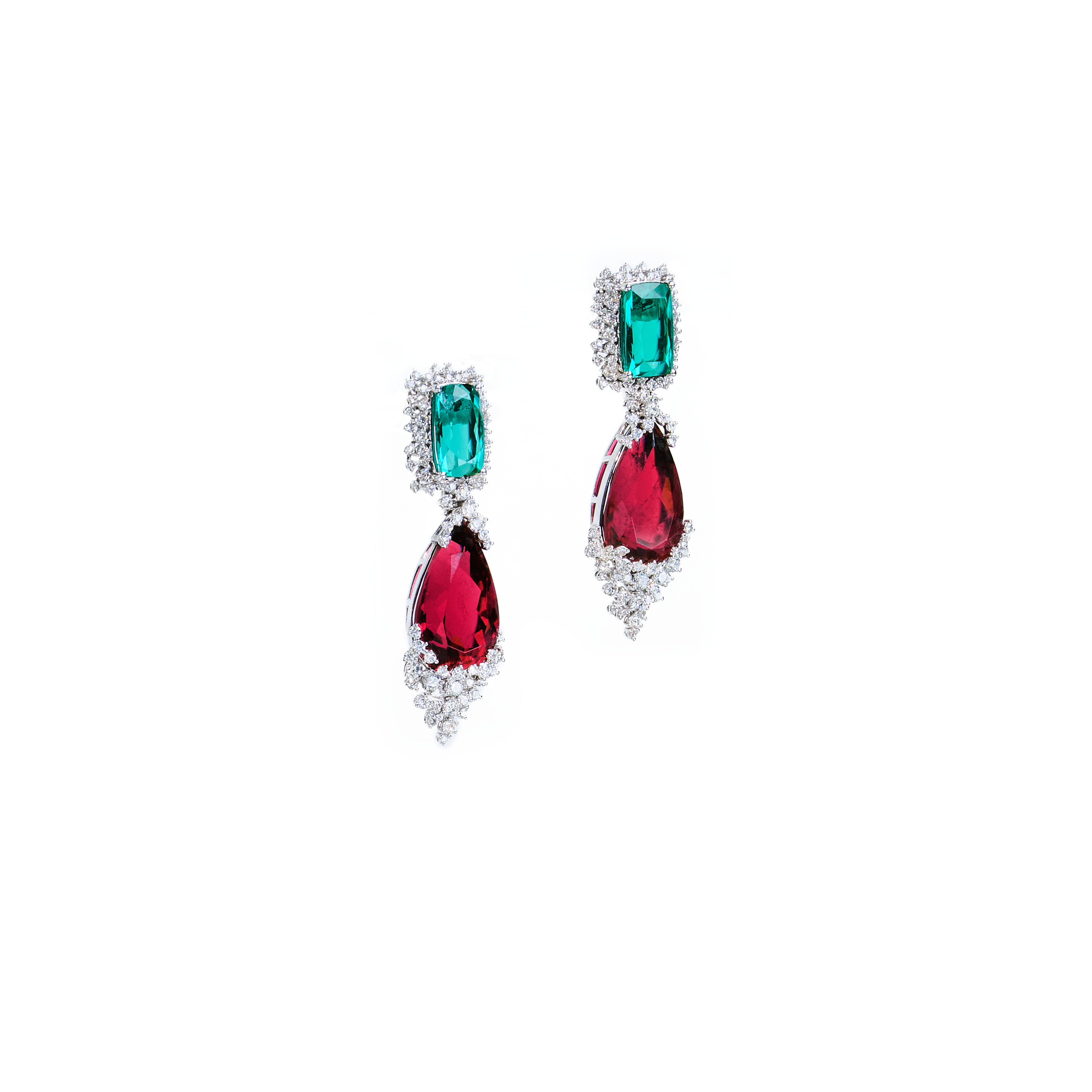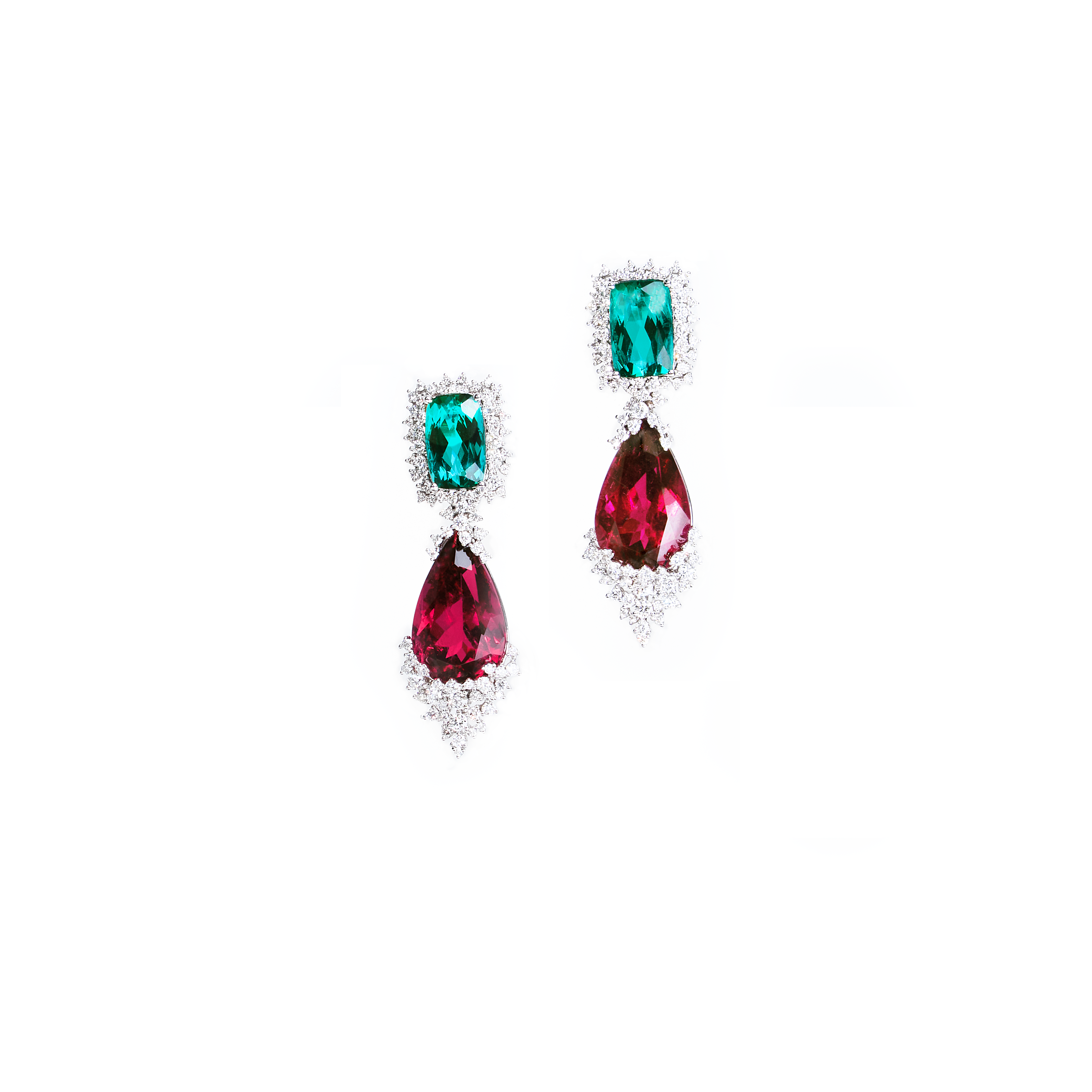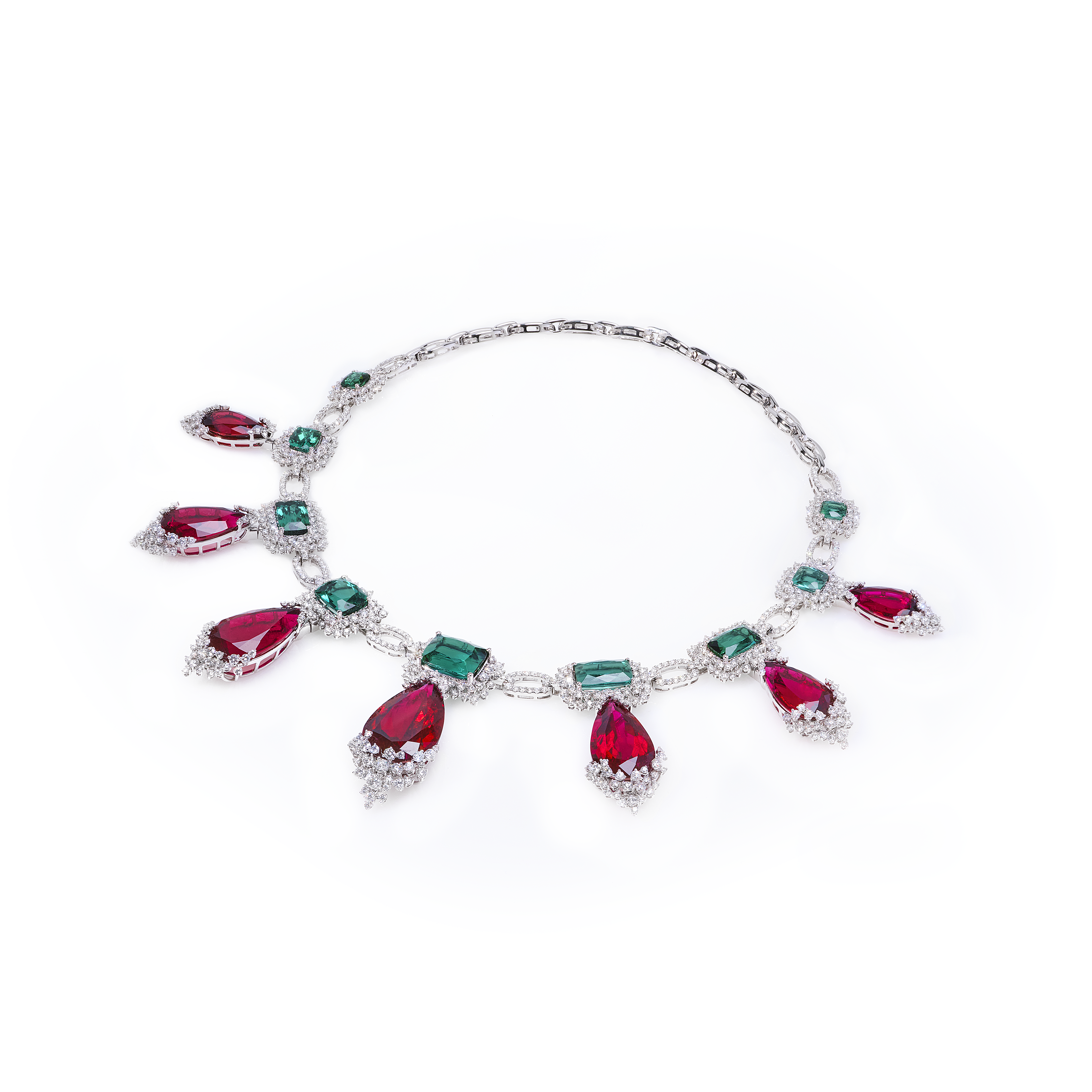 Les diamants sont stratégiquement placés à différents niveaux, symbolisant l’excitation et le frisson que l’on ressent lorsqu’on rencontre l’être aimé. L’ensemble du collier est composé de sept tourmalines rouges (89 carats), neuf tourmalines vertes taille coussin (39 carats) et 1008 diamants. Les boucles d’oreilles, quant à elles, comportent deux tourmalines rouges (19,61 carats), deux tourmalines vertes (6,64 carats) et 89 diamants (1,67 carats). Enfin, la bague est ornée d’une tourmaline rouge de 14,77 carats et de 2,74 carats de diamants.