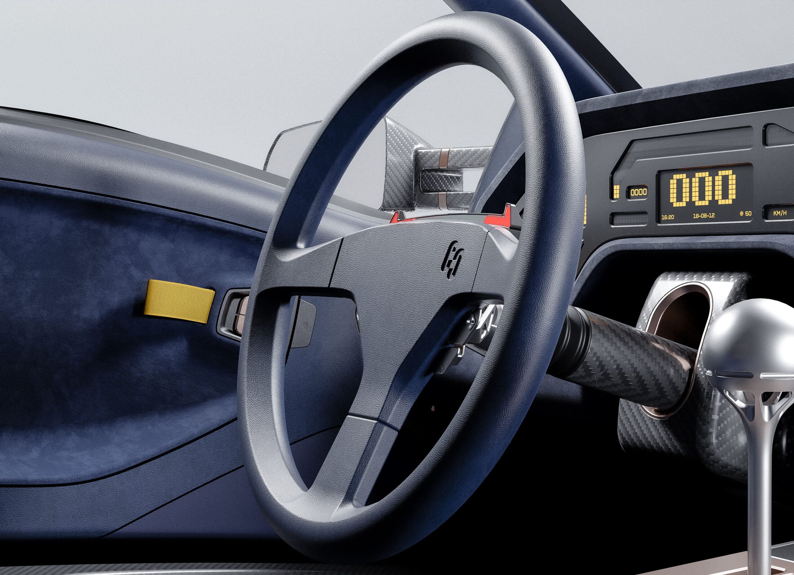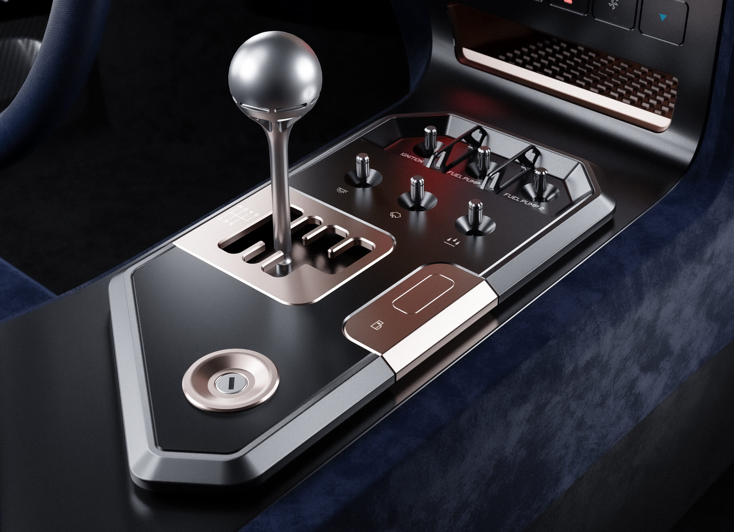 Toujours en Alcantara, le tunnel central reliant le tableau de bord et les revêtements intérieurs des portes sont teints en bleu. Le tableau de bord transparent, orné de fibre de carbone et d’Alcantara, offre une perspective large et linéaire, parfaite pour compléter l’élégance de l’ensemble.