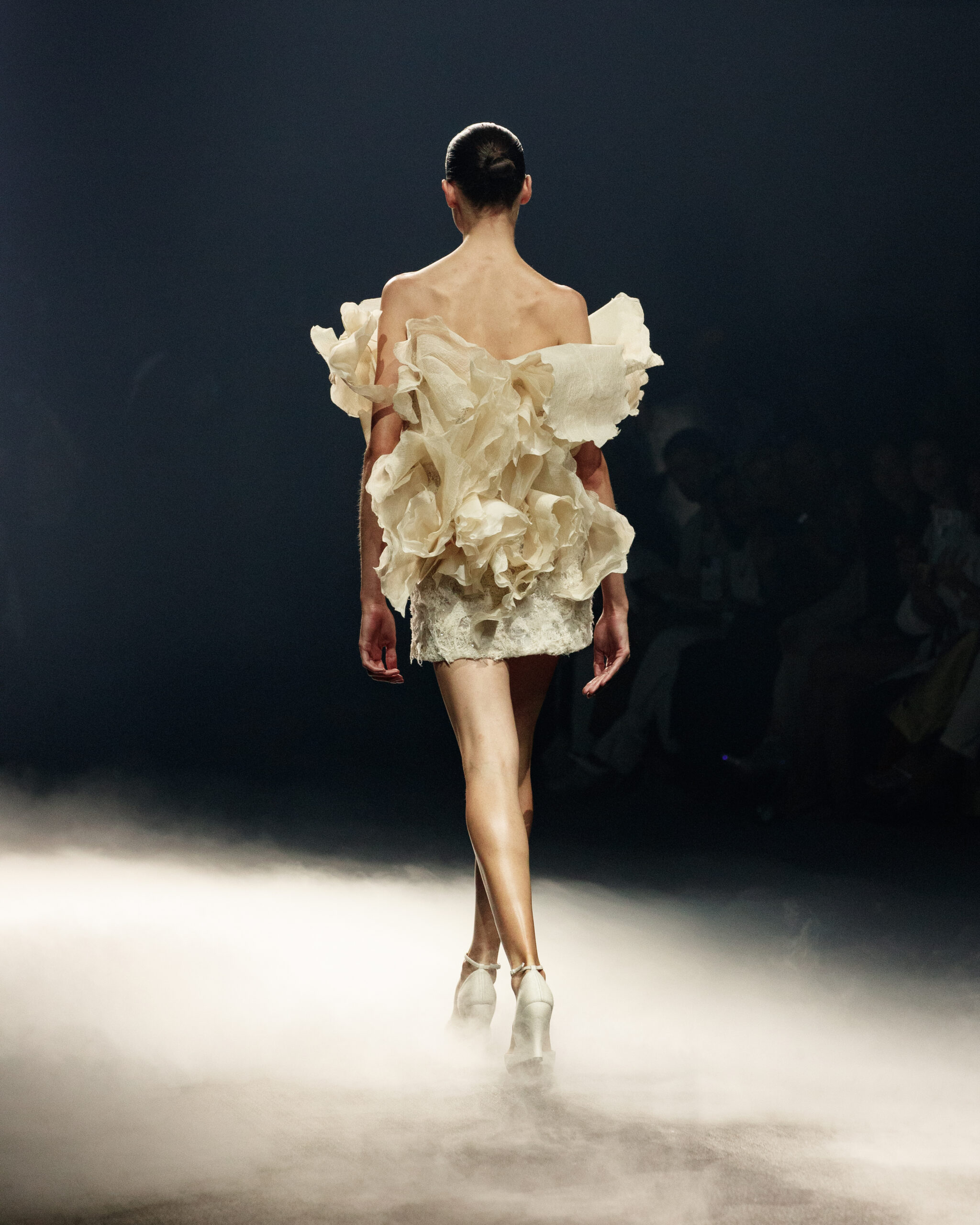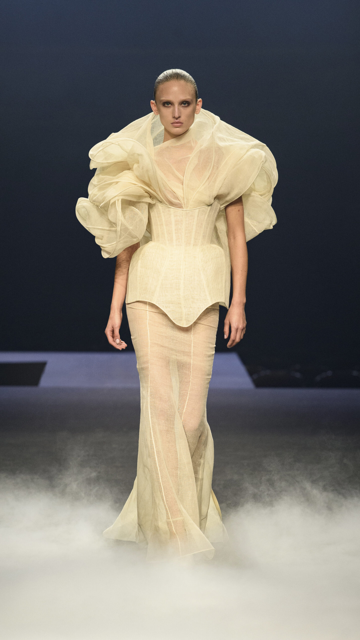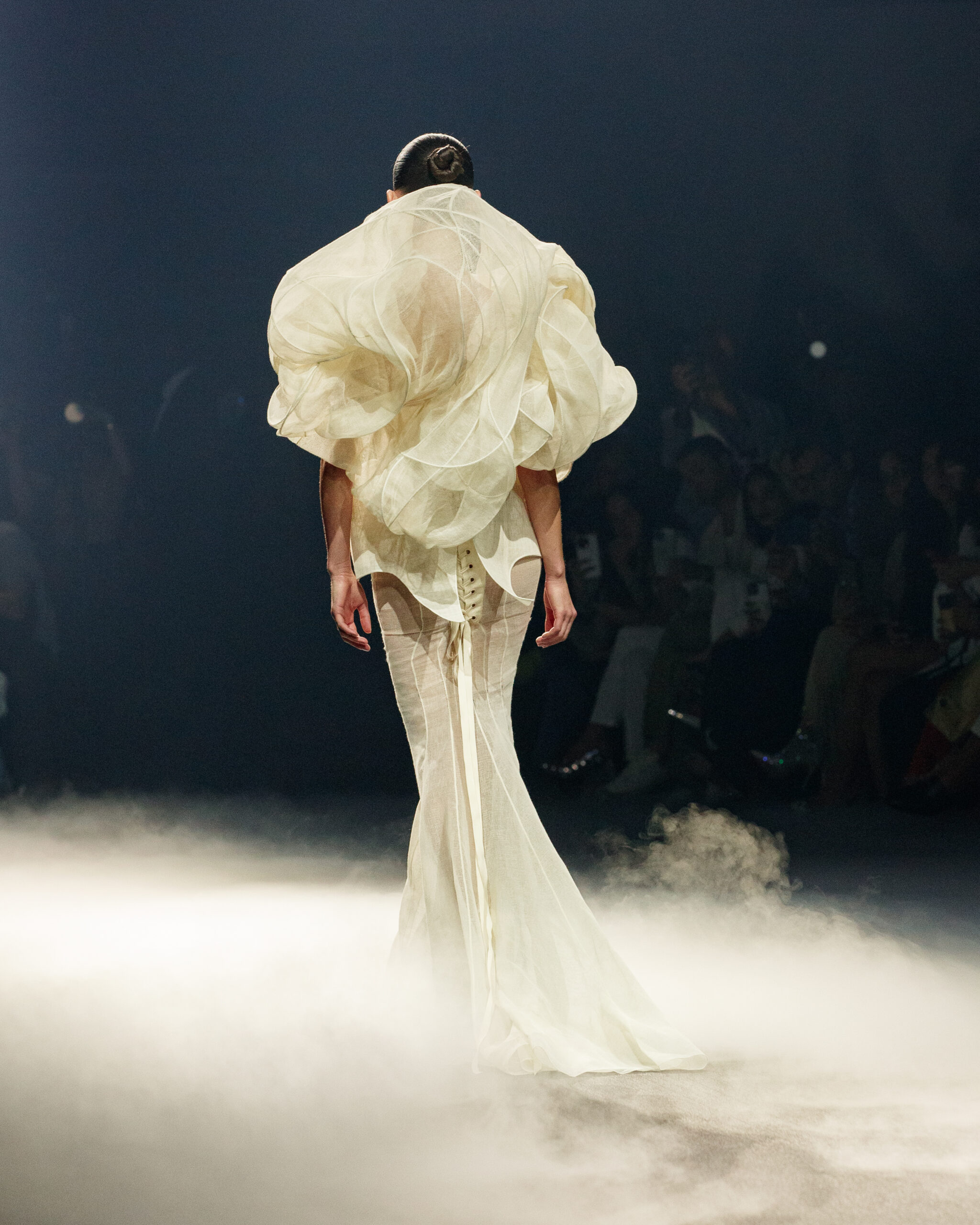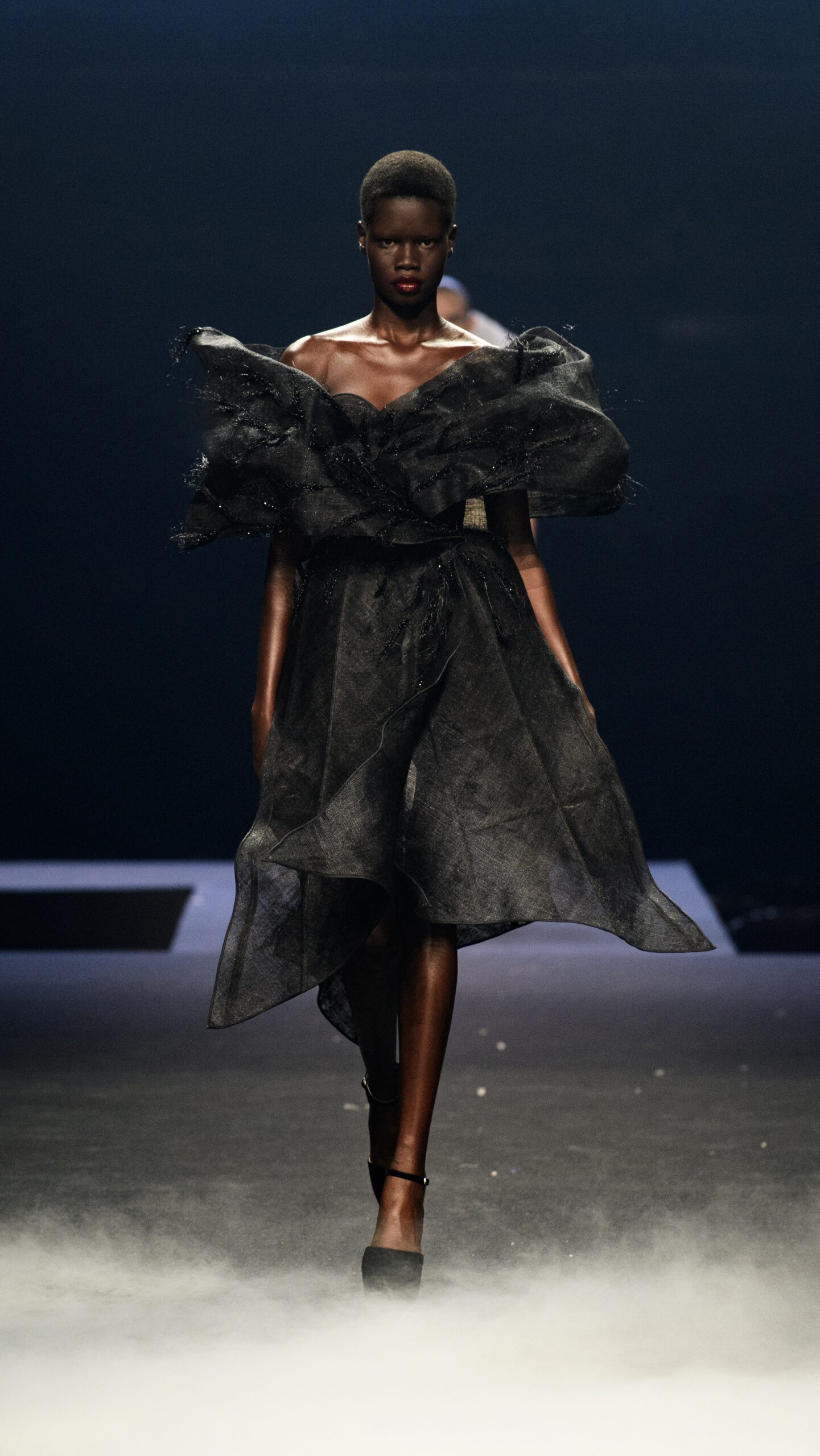 Passion, obsession, and mystery permeate dramatic silhouettes, embodying the visceral quest for the ultimate expression of an art. Just as extraction transforms the soul of a plant into scent, Ashi uses meticulous craftsmanship to reconstruct immaterial notions of memory, yearning, and fragrance into couture.