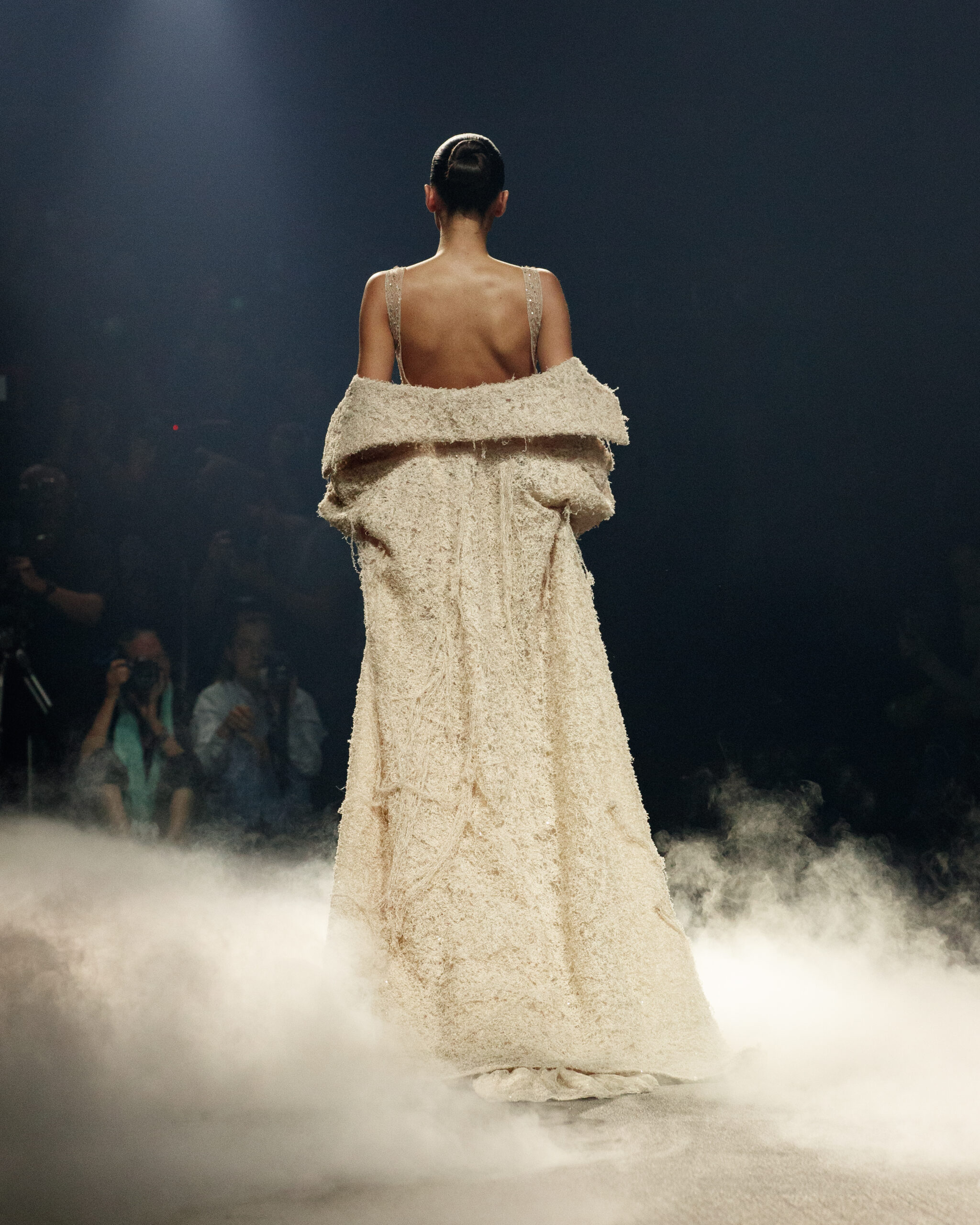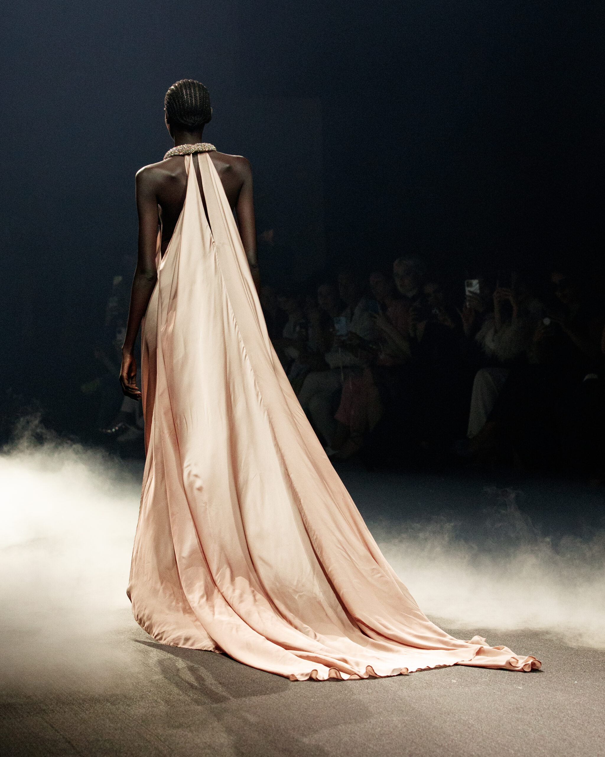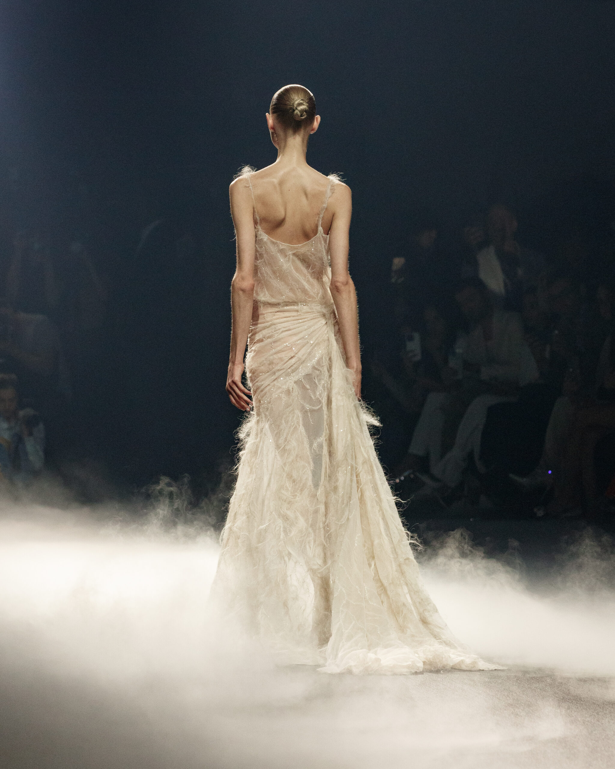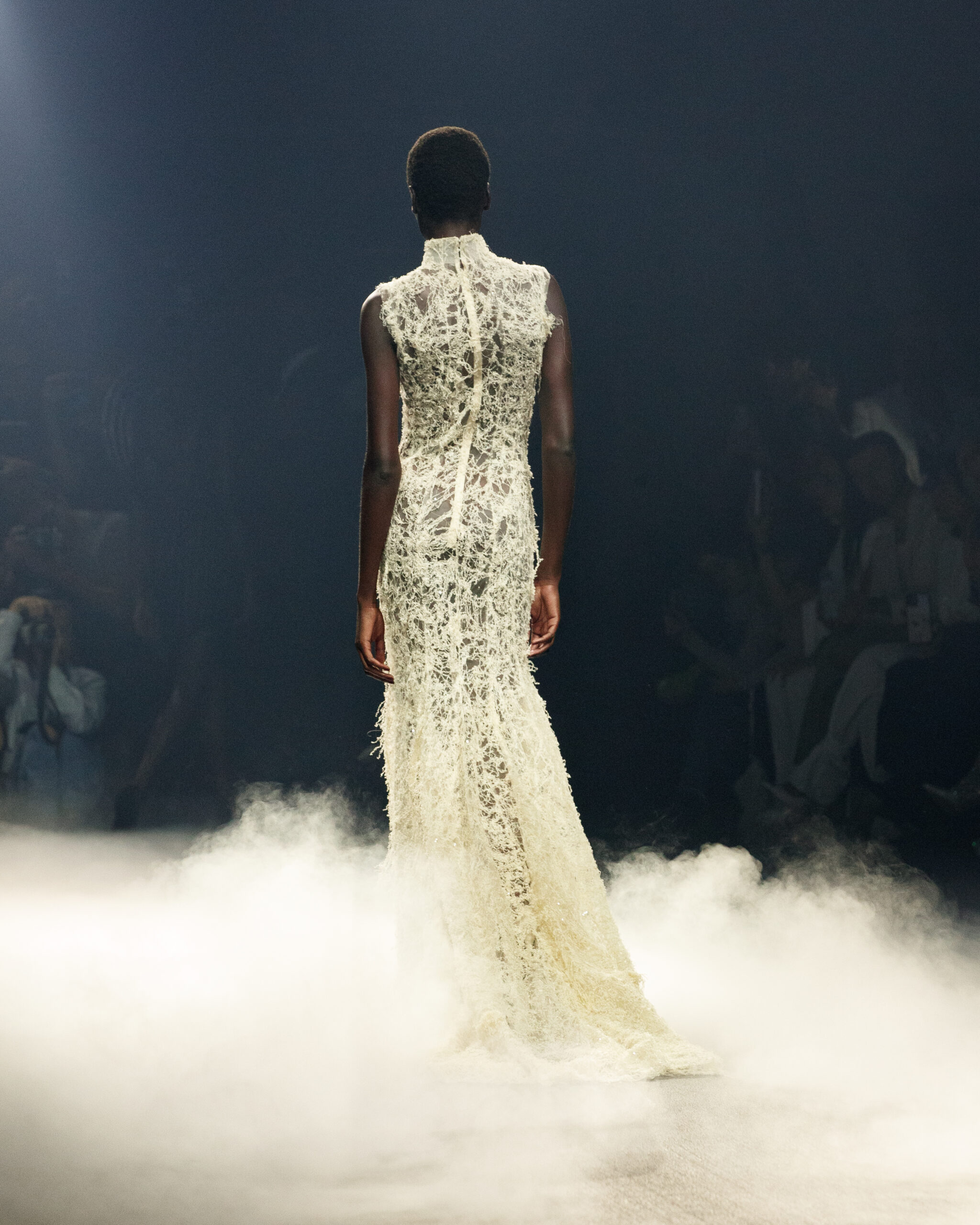The couturier approaches dressing as “undressing” — the better to extract the essence of couture — progressing organically from coarse, unembellished materials to studies in architecture, transparency, and the balance between opulence and restraint. A corset dress seems to shrug off a dark outer layer, meter upon meter of ecru organza envelop curves with the suggestiveness of a silken sheet, and diaphanous billows of fabric mimic a fragrance trail, sensuously enveloping the head while leaving the shoulders and bust exposed. An S-curved silhouette seems to contour the body like a modern perfume bottle, with strategically placed cut-outs that celebrate the female form. Vintage flacons inform origami-like folds on an evening gown crafted from 150 meters of fabric or stand in as a shoe heel molded from an ombré resin that makes the bottle appear half-full. What looks like velvet is in reality a delicate mesh made from grass, a time-honored material used for perfume extraction to this day. Embroidery, beading, and coppery threads – a nod to the equipment used in perfumery – give evening looks an evanescent shimmer. A bare back heightens the contradiction between secrets and disclosure.