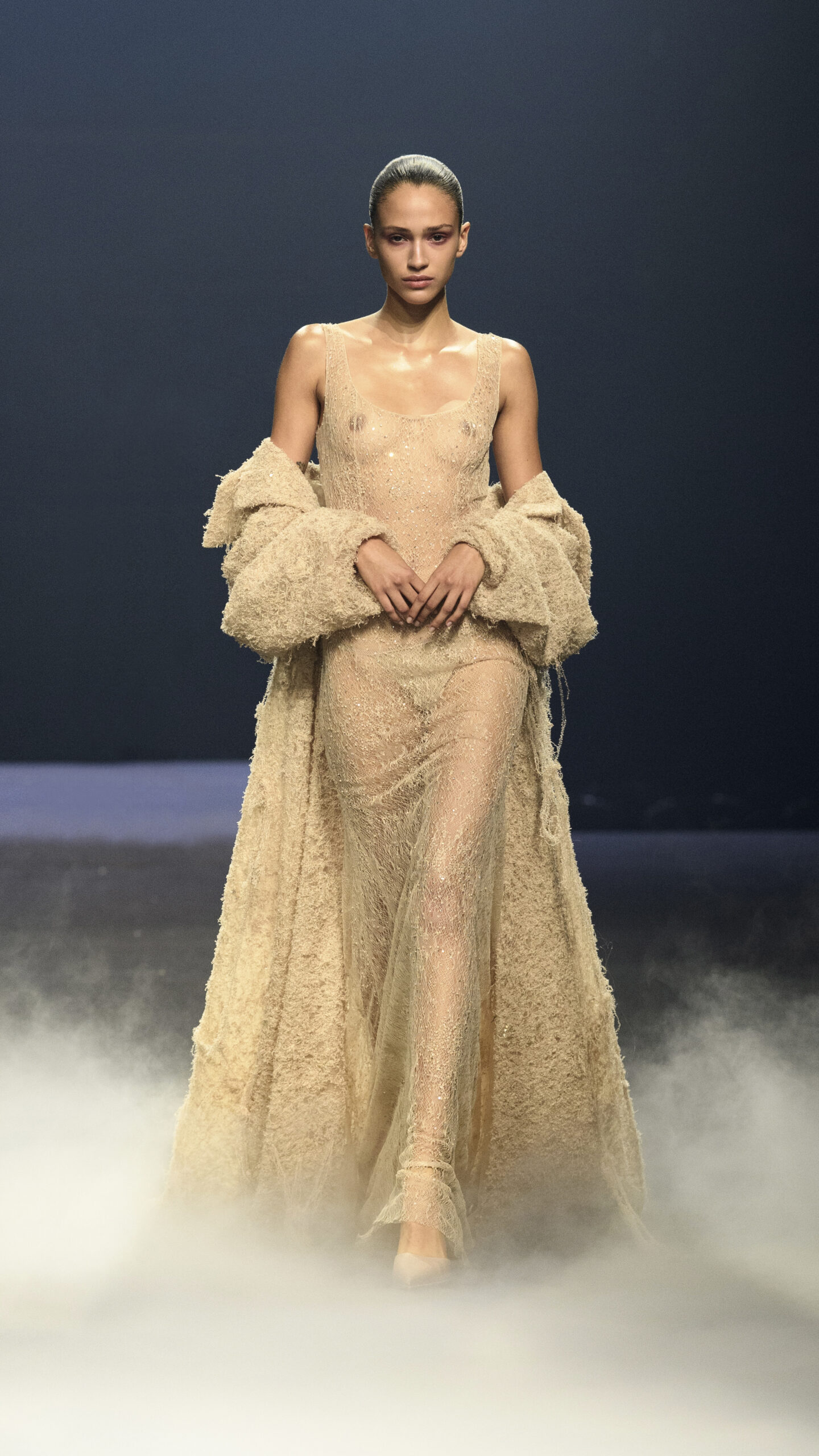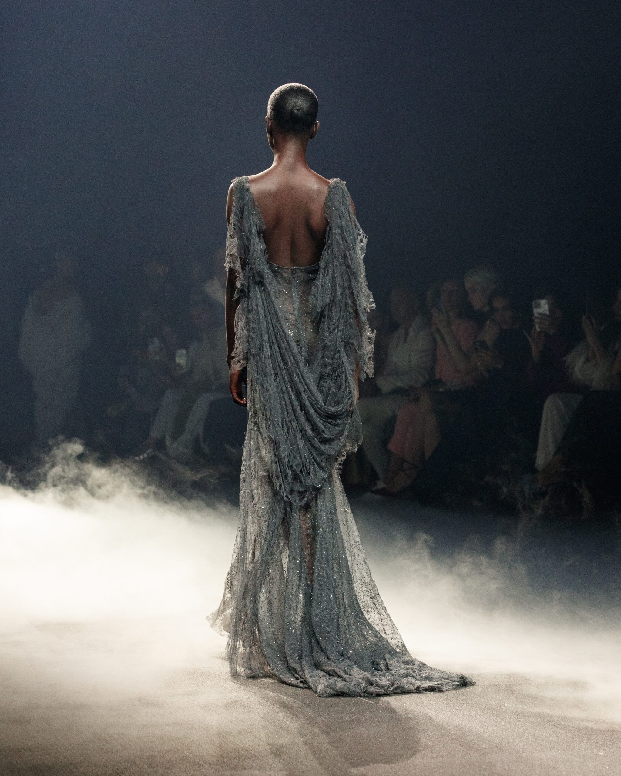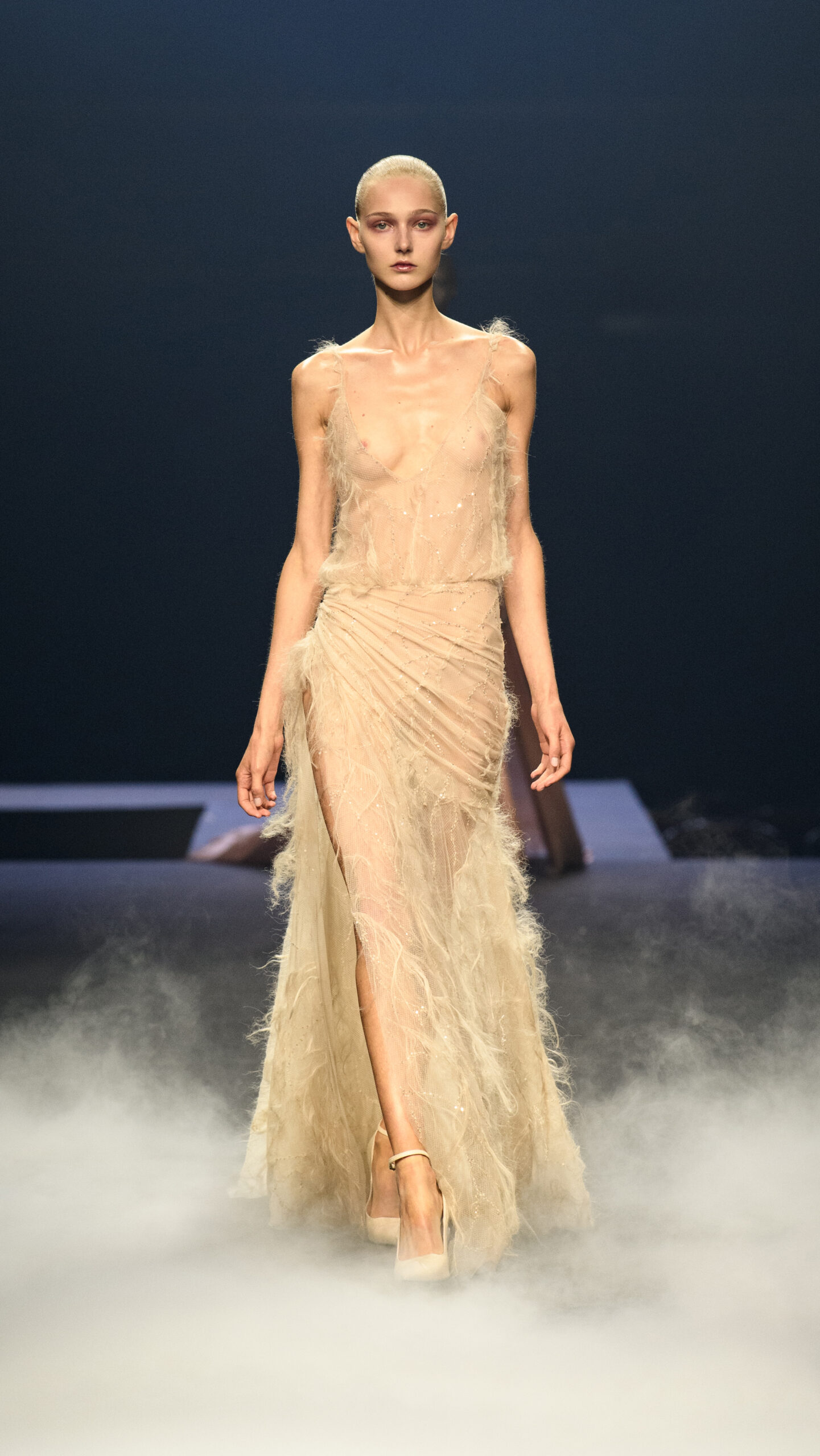 The couturier approaches dressing as “undressing” — the better to extract the essence of couture — progressing organically from coarse, unembellished materials to studies in architecture, transparency, and the balance between opulence and restraint. A corset dress seems to shrug off a dark outer layer, meter upon meter of ecru organza envelop curves with the suggestiveness of a silken sheet, and diaphanous billows of fabric mimic a fragrance trail, sensuously enveloping the head while leaving the shoulders and bust exposed. An S-curved silhouette seems to contour the body like a modern perfume bottle, with strategically placed cut-outs that celebrate the female form. Vintage flacons inform origami-like folds on an evening gown crafted from 150 meters of fabric or stand in as a shoe heel molded from an ombré resin that makes the bottle appear half-full. What looks like velvet is in reality a delicate mesh made from grass, a time-honored material used for perfume extraction to this day. Embroidery, beading, and coppery threads – a nod to the equipment used in perfumery – give evening looks an evanescent shimmer. A bare back heightens the contradiction between secrets and disclosure.