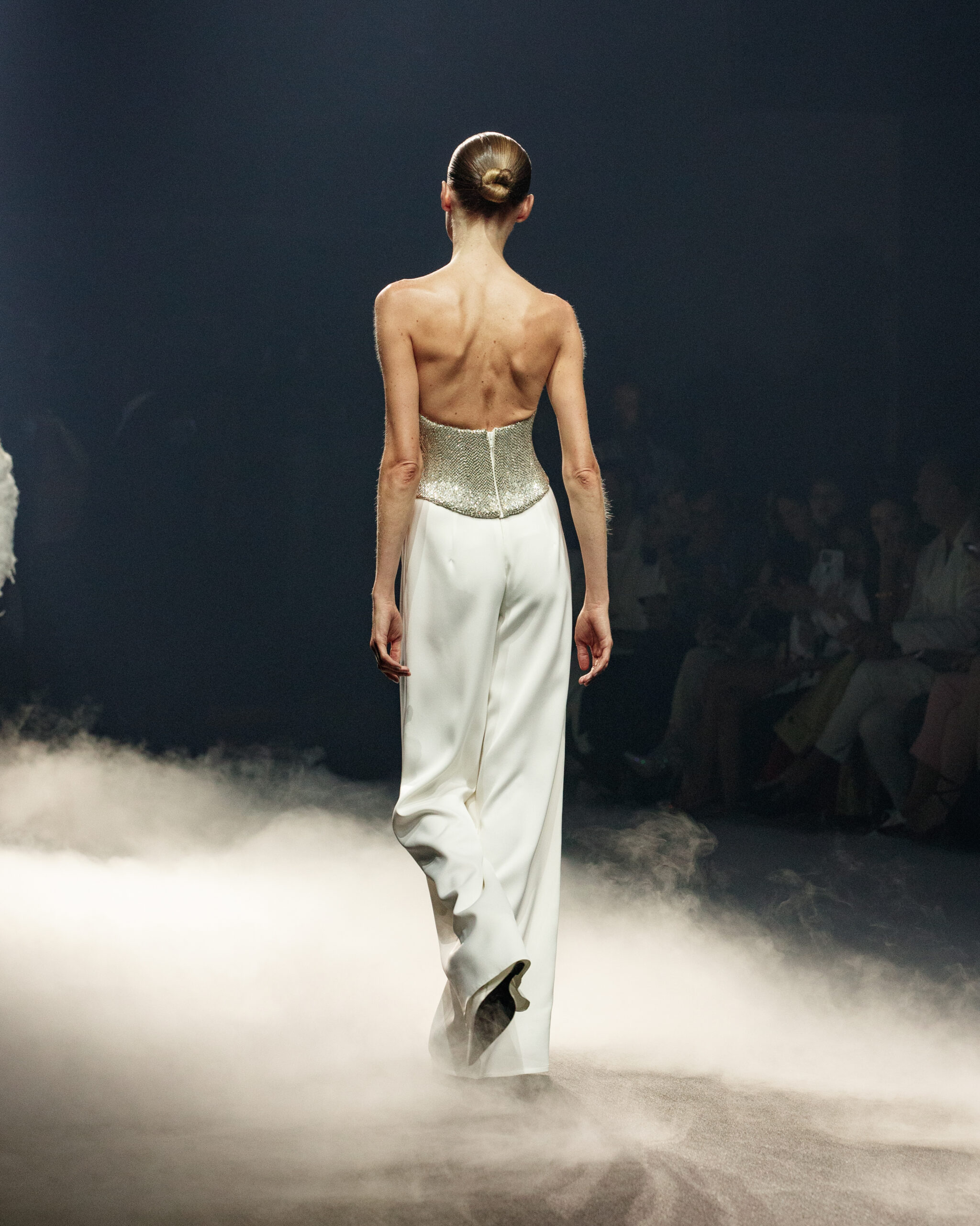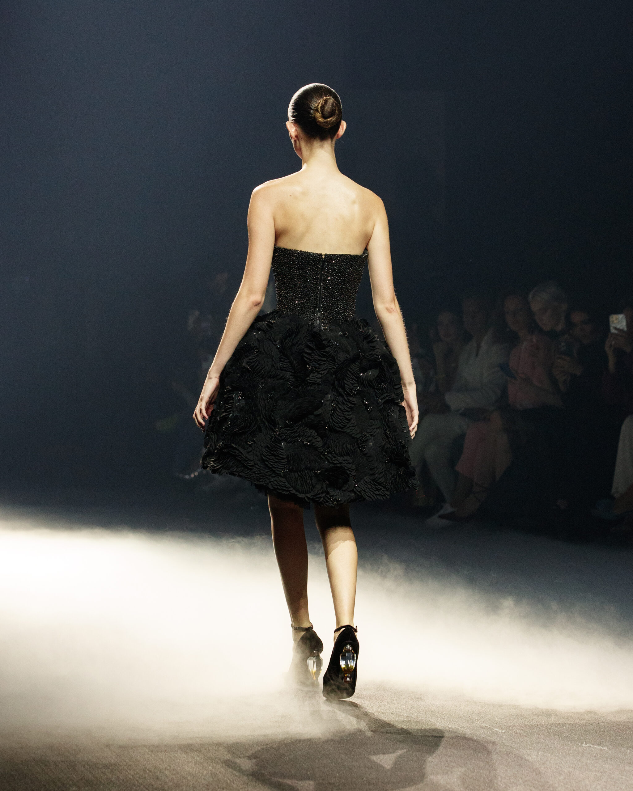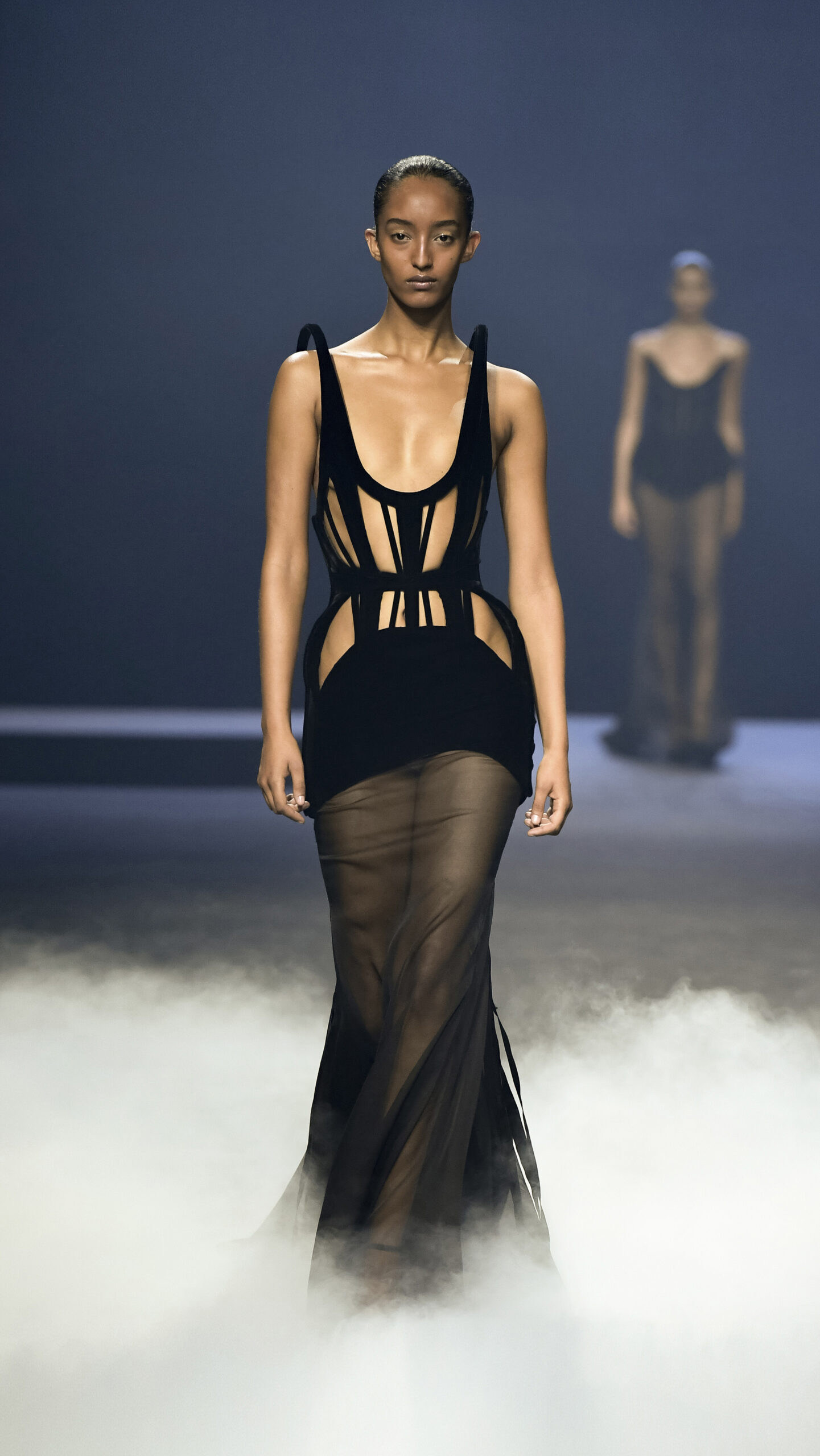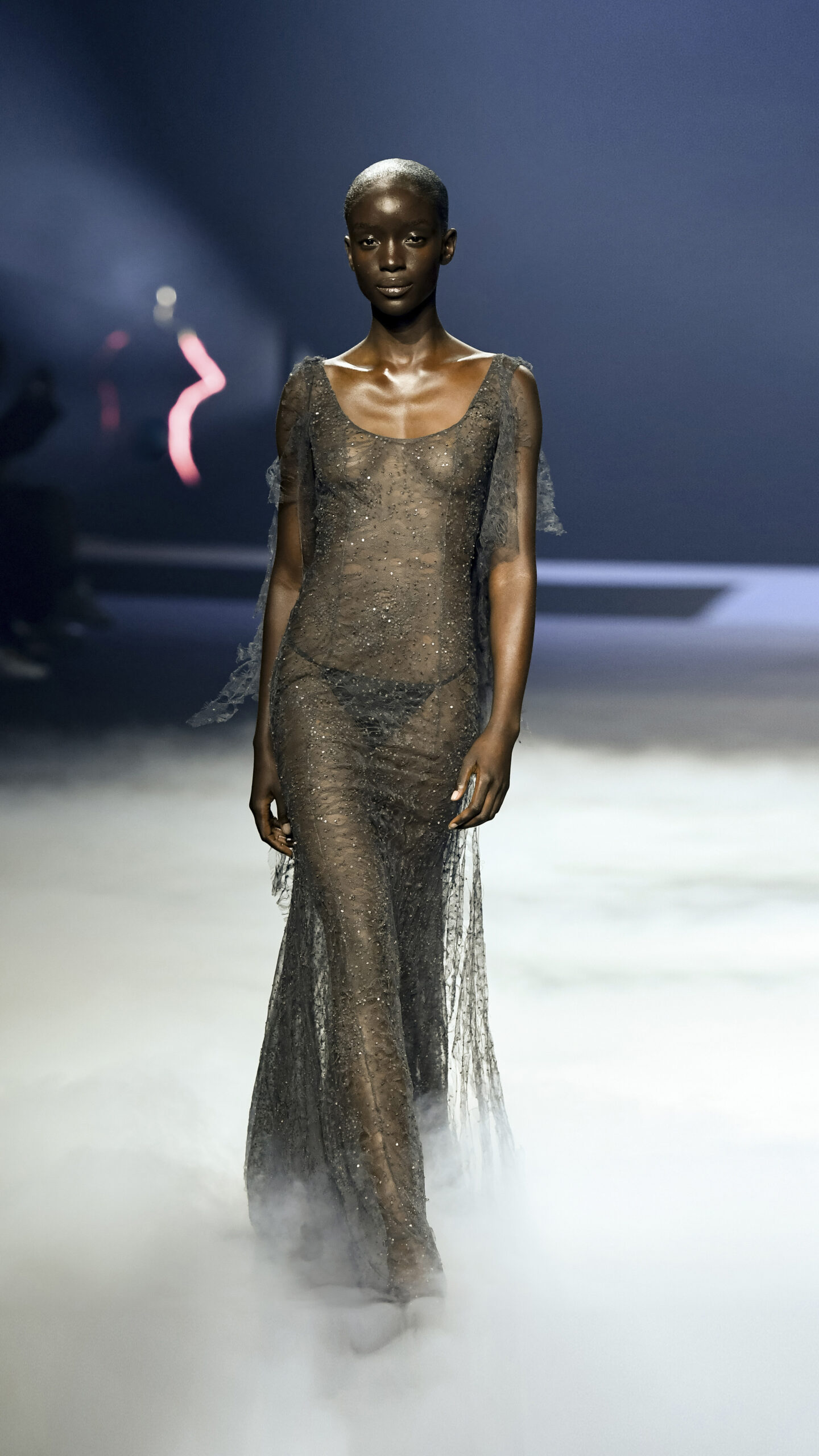 The couturier approaches dressing as “undressing” — the better to extract the essence of couture — progressing organically from coarse, unembellished materials to studies in architecture, transparency, and the balance between opulence and restraint. A corset dress seems to shrug off a dark outer layer, meter upon meter of ecru organza envelop curves with the suggestiveness of a silken sheet, and diaphanous billows of fabric mimic a fragrance trail, sensuously enveloping the head while leaving the shoulders and bust exposed. An S-curved silhouette seems to contour the body like a modern perfume bottle, with strategically placed cut-outs that celebrate the female form. Vintage flacons inform origami-like folds on an evening gown crafted from 150 meters of fabric or stand in as a shoe heel molded from an ombré resin that makes the bottle appear half-full. What looks like velvet is in reality a delicate mesh made from grass, a time-honored material used for perfume extraction to this day. Embroidery, beading, and coppery threads – a nod to the equipment used in perfumery – give evening looks an evanescent shimmer. A bare back heightens the contradiction between secrets and disclosure.