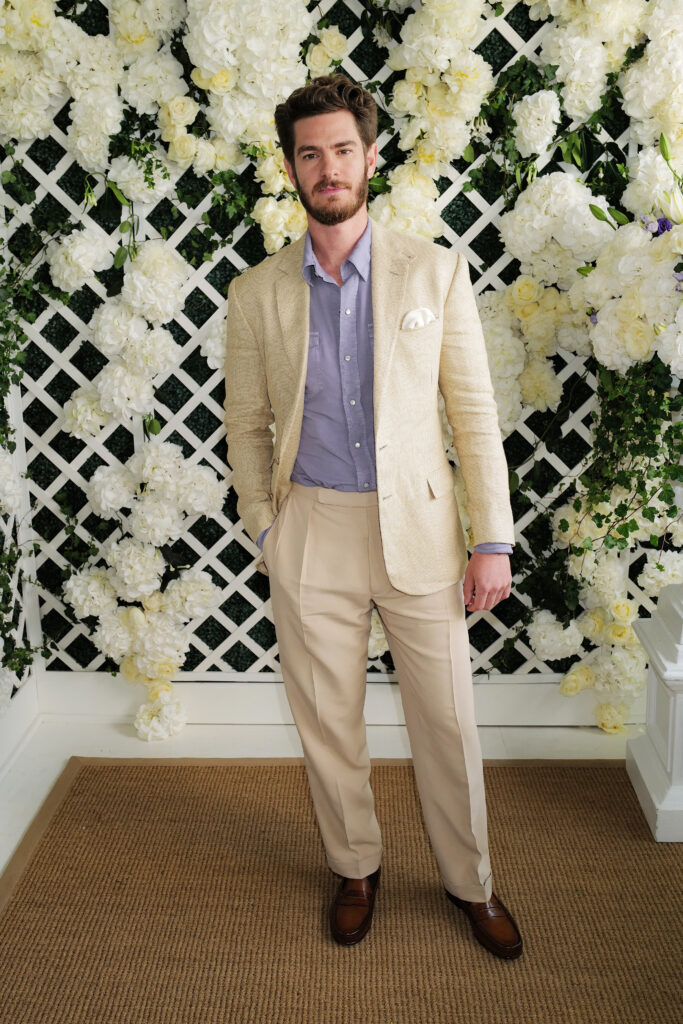 Andrew Garfield is wearing a Ralph Lauren Purple Label Lilac Shirt, Check Linen Jacket and Pleated Trousers