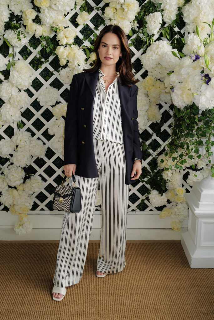 Lily James is wearing a Polo Ralph Lauren Silk Top and Trousers