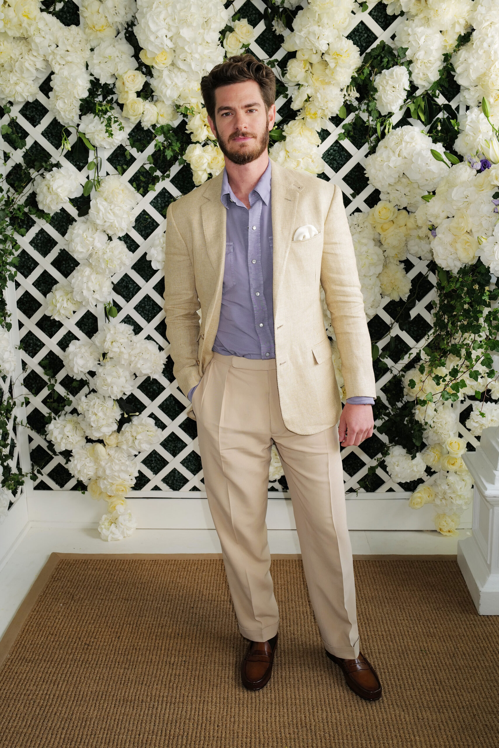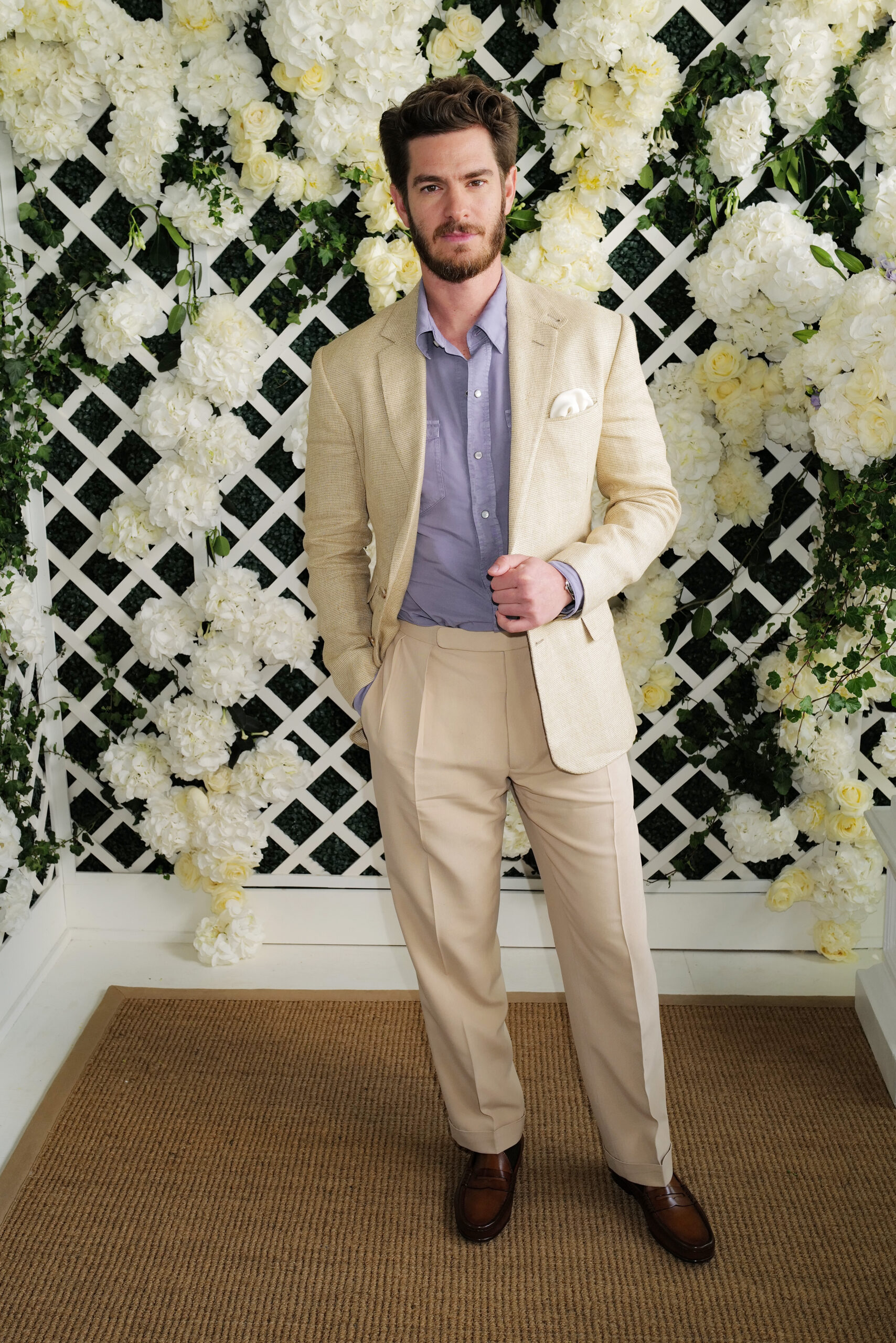 Andrew Garfield is wearing a Ralph Lauren Purple Label Lilac Shirt, Check Linen Jacket and Pleated Trousers