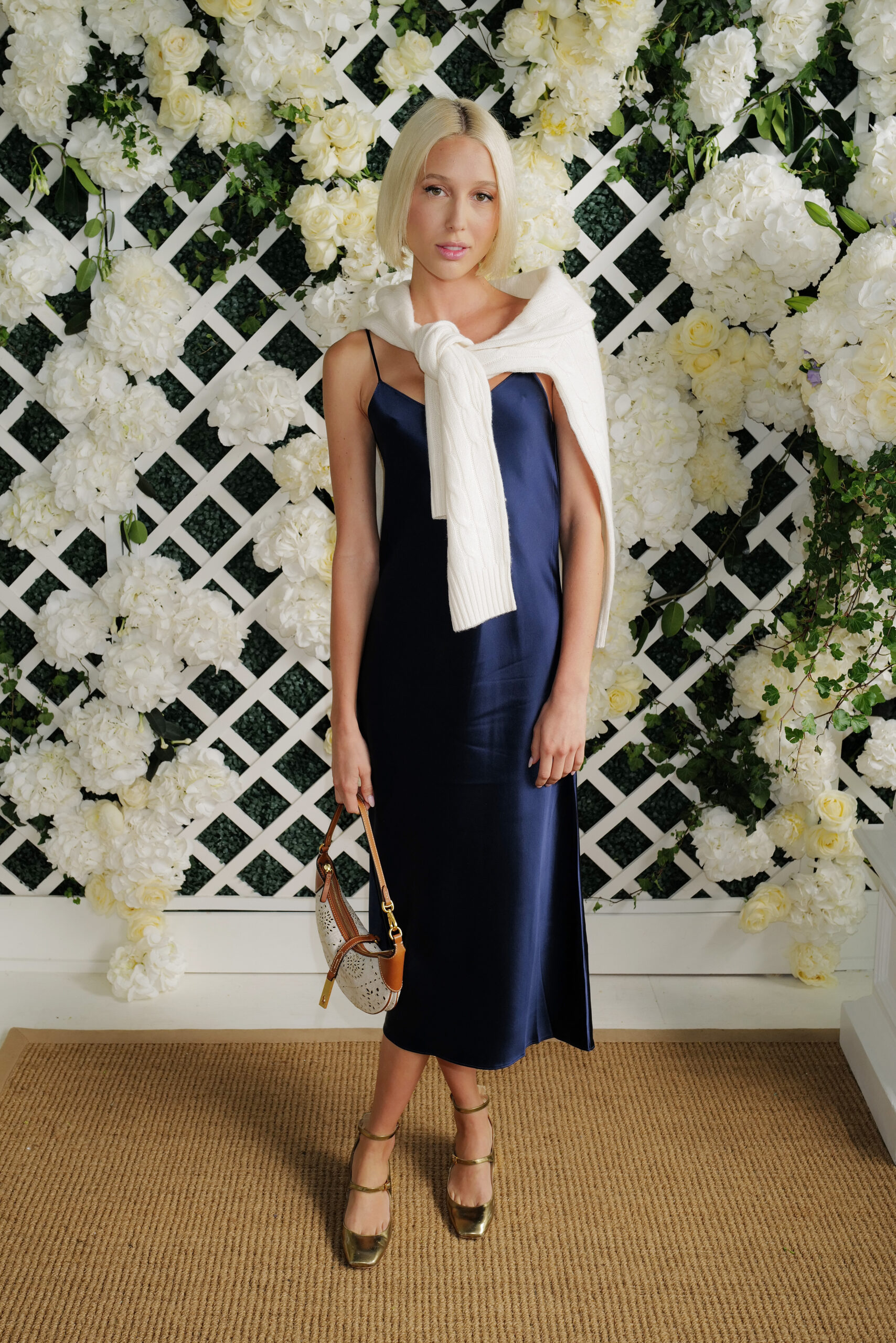 Krystal Jung is wearing a Ralph Lauren Collection Day Dress, Sandals and Welington Bag