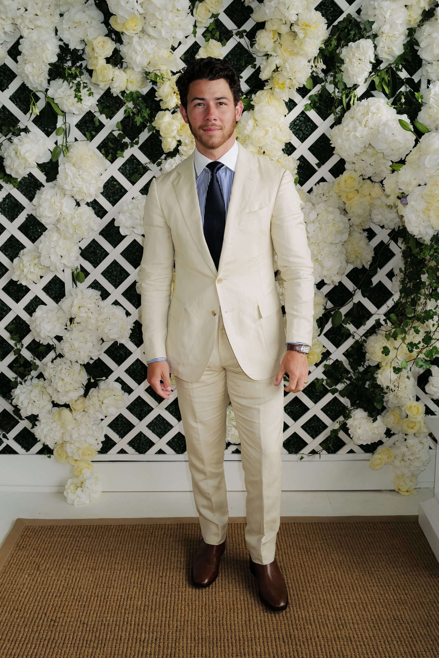 Nick Jonas is wearing a Ralph Lauren Purple Label Cream Linen Suit